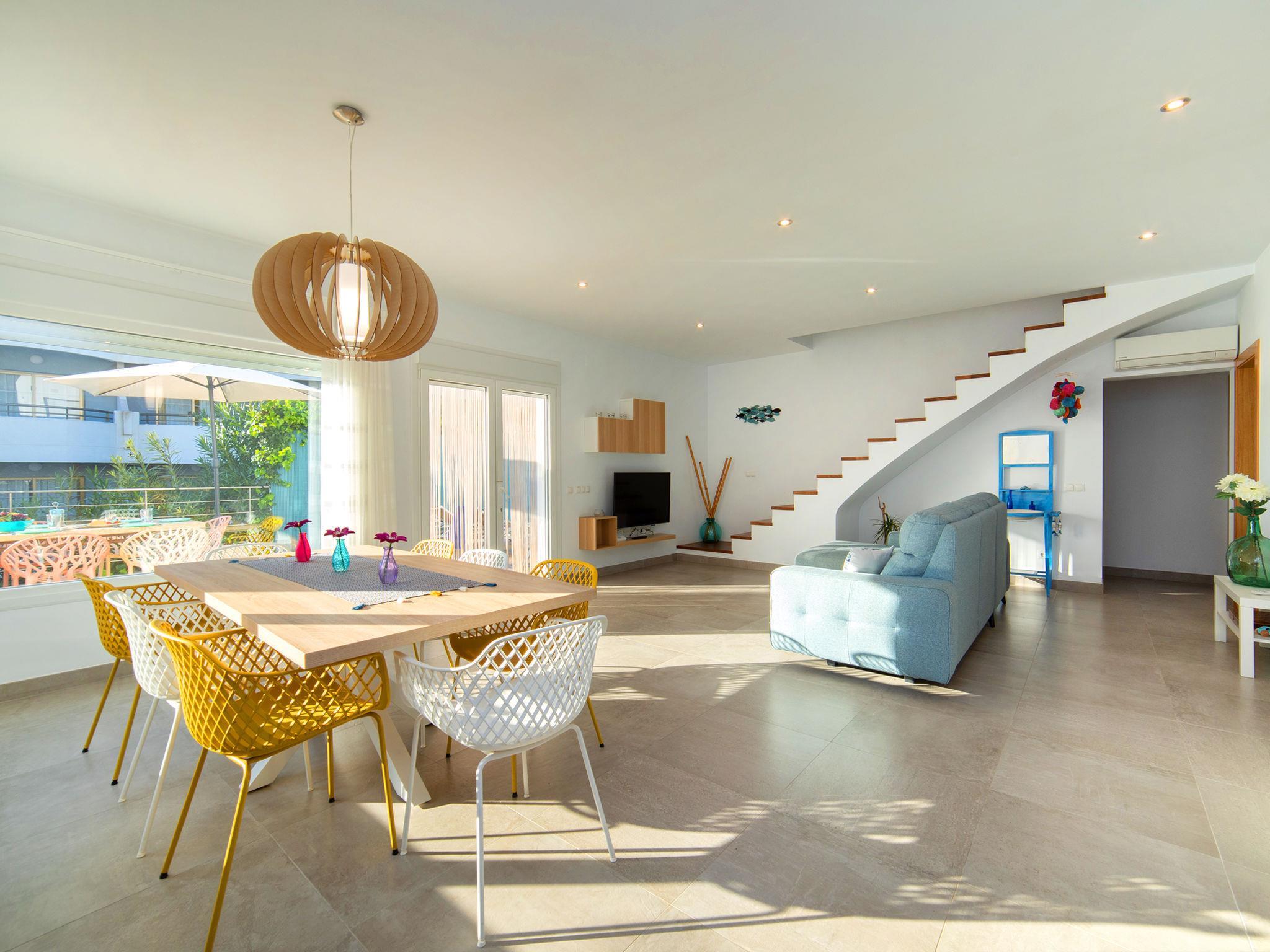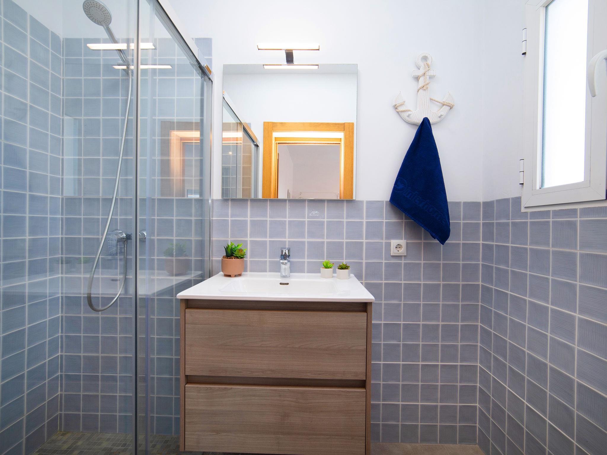 "La Cala", 5-room house 140 m2 on 2 levels. Comfortable and beautiful furnishings: living/dining room 40 m2 with satellite TV, digital TV, air conditioning and forced-air heating. Exit to the terrace. 1 room with 1 french bed (180 cm, length 200 cm), shower/WC, air conditioning and forced-air heating. 2 rooms, each room with 2 beds (90 cm, length 200 cm), air conditioning and forced-air heating. Kitchen (oven, dishwasher, 3 ceramic glass hob hotplates, toaster, kettle, microwave, freezer, electric coffee machine, Capsules for coffee machine (Nespresso) extra). Shower/WC. Upper floor: 1 room with 1 french bed (150 cm, length 190 cm), shower/WC. Exit to the terrace. Terrace furniture, barbecue, deck chairs (4). Partial view of the sea. Facilities: washing machine, iron, children's high chair, baby cot for up to 2 year olds, hair dryer. Internet (WiFi, free). Parking at the house. 1 small pet/ dog allowed. AT-504609-A // Reg. Nr.: ESFCTU00000302900022829700000000000000000AT-504609-A6