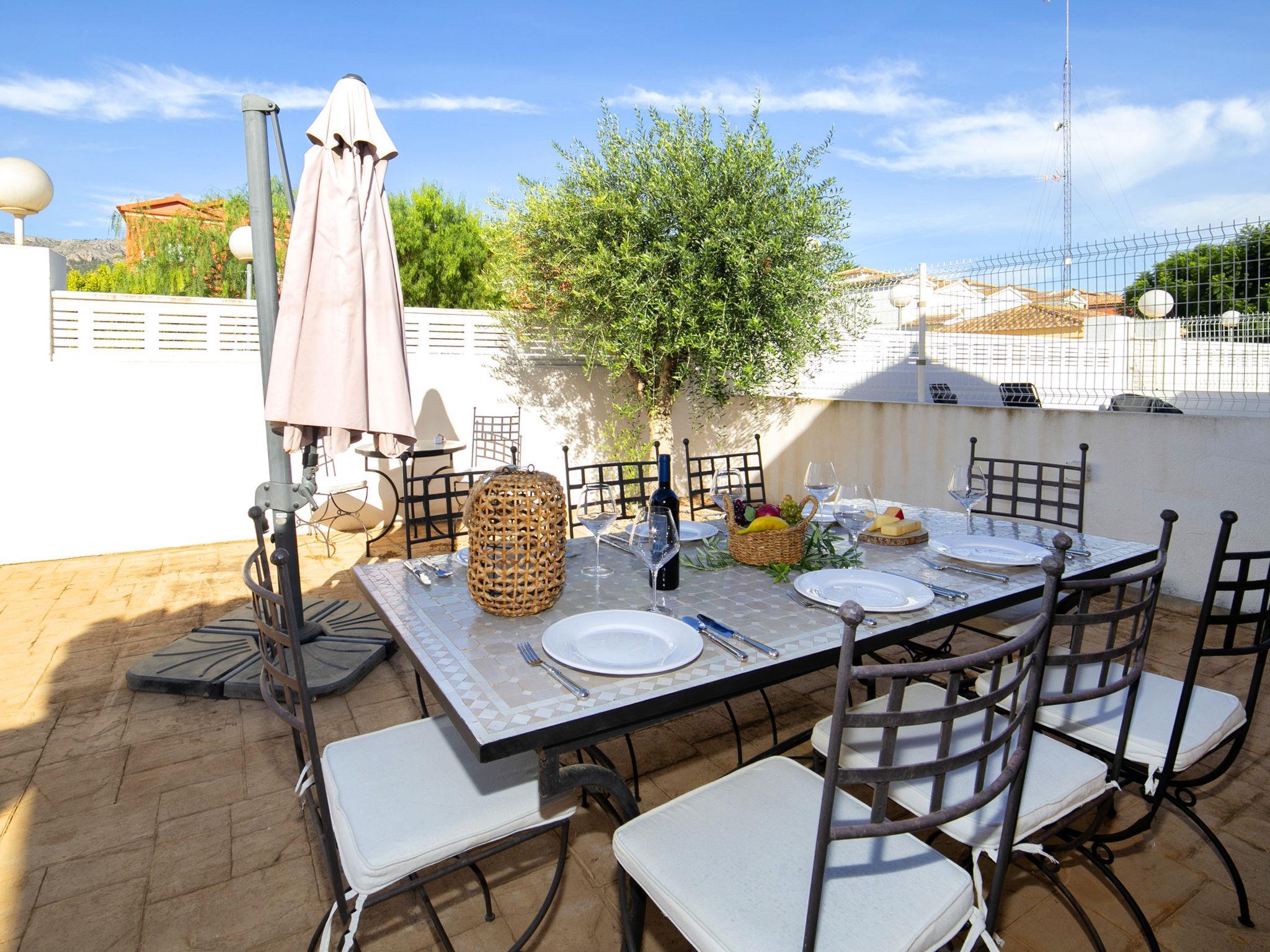Pla Roig,Urb. Jazmines 1 km from Calpe: Large, cosy terraced house, 3 storeys. 1.6 km from the centre of Calpe, in a quiet position residential area (villas), 1 km from the sea, 1.3 km from the beach. For shared use: well-kept garden, swimming pool (12 x 9 m, depth 117 - 177 cm, seasonal availability: 01.Jan. - 31.Dec.). Outdoor shower. Private: terrace, garden furniture. Supermarket 800 m, restaurant 1.1 km, bar 1.1 km, bus stop "Parada Bus" 450 m, sandy beach 1.3 km. Sports harbour 1.5 km, marina 3.5 km, golf course (18 hole) 12.2 km, sailing school 3.5 km, tennis 1.5 km. Nearby attractions: Aqualandia,Mundomar 22.3 km, Terra Mítica,Terra Natura 29.3 km, Benidorm Palace en Benidorm 21 km, Peñon de Ifach 2.5 km. The owner does not accept any youth groups.