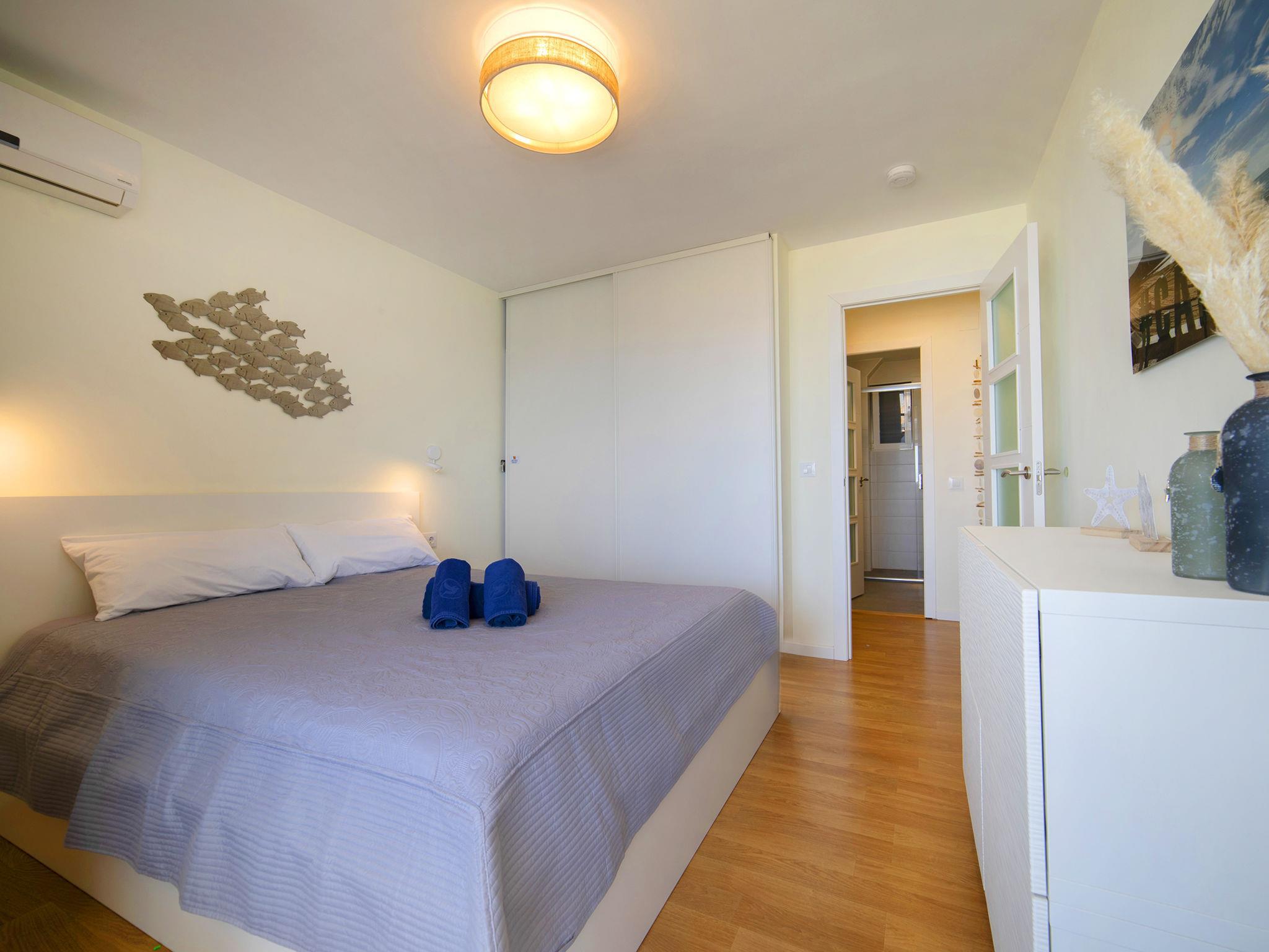 "Sirena", 3-room apartment 71 m2 on 9th floor. Spacious and bright, comfortable and beautiful furnishings: living/dining room with satellite TV, digital TV, air conditioning and forced-air heating. Exit to the terrace. 1 room with 1 french bed (1 x 160 cm, length 200 cm), air conditioning and forced-air heating. Exit to the terrace. 1 room with 1 french bed (1 x 140 cm, length 200 cm). Open kitchen (oven, dishwasher, 3 induction hot plates, toaster, kettle, microwave, electric coffee machine). Shower/WC. Large terrace. Terrace furniture. Beautiful view of the sea and the port. Facilities: washing machine, iron, children's high chair, baby cot for up to 2 year olds, hair dryer. Internet (WiFi, free). Please note: non-smoking house. CV-VUT0517219-A // Reg. Nr.: ESFCTU0000030290002579520000000000000CV-VUT0517219-A8