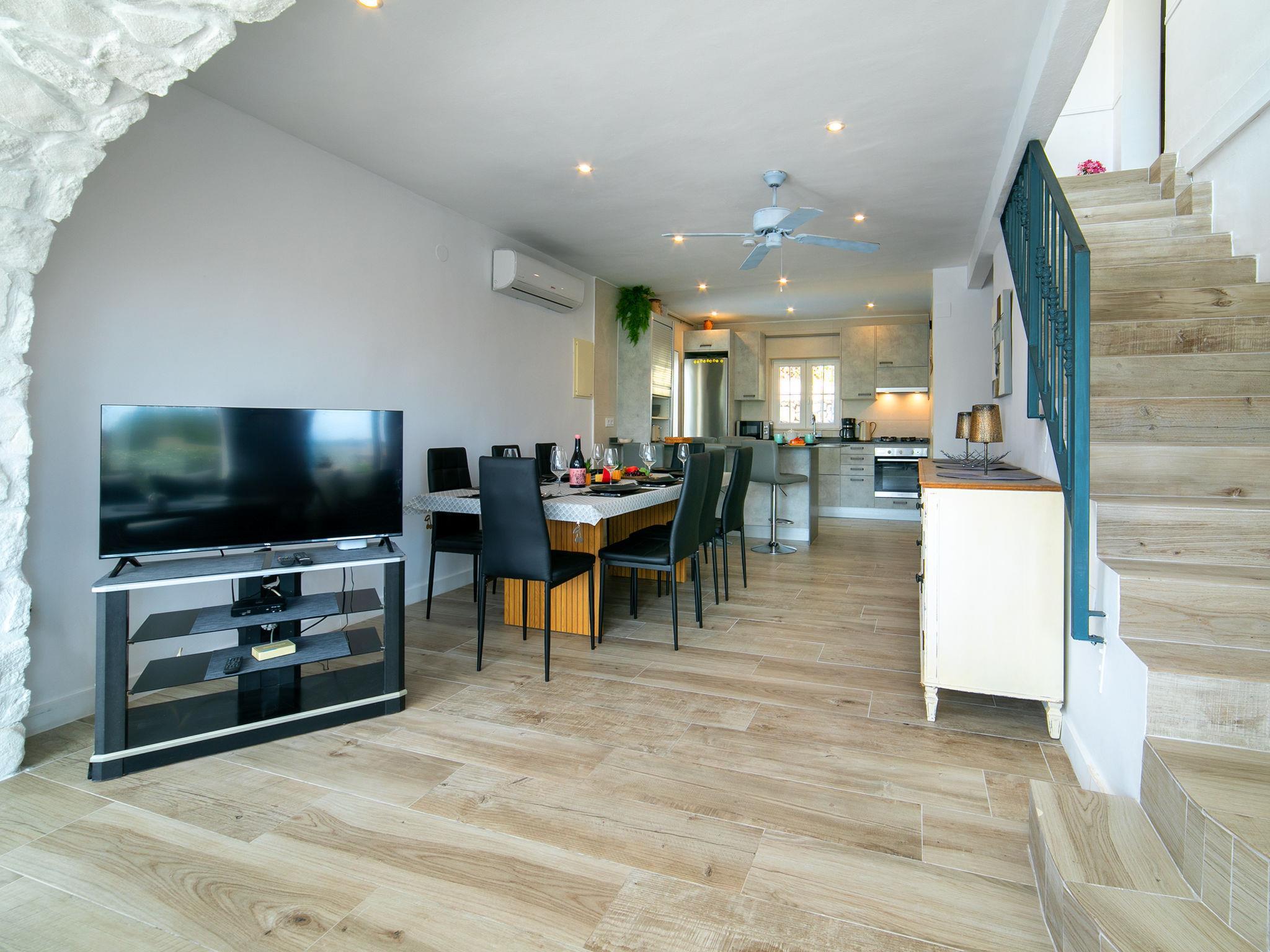 "Hagios", 6-room house 165 m2 on 2 levels. Spacious and bright, comfortable and beautiful furnishings: open living/dining room with satellite TV, air conditioning, fan and forced-air heating. Exit to the terrace, to the swimming pool. 1 room with 1 french bed (1 x 160 cm, length 200 cm), air conditioning and forced-air heating. 1 room with 1 double bed (2 x 80 cm, length 200 cm), air conditioning and forced-air heating. Open kitchen (dishwasher, 4 gas rings, toaster, kettle, microwave, electric coffee machine). Shower/WC. Upper floor: living room. Exit to the terrace. 2 rooms, each room with 1 french bed (1 x 160 cm, length 200 cm), air conditioning, fan and forced-air heating. Bath/WC, shower/WC. Terrace furniture, barbecue, deck chairs. View of the resort and the town. Facilities: washing machine, iron, children's high chair, baby cot for up to 2 year olds, hair dryer. Internet (WiFi, free). Parking (2 cars). Please note: non-smoking house. CV-VUT0478360-A // Reg. Nr.: ESFCTU0000030290002756110000000000000000VUT0478360-A3