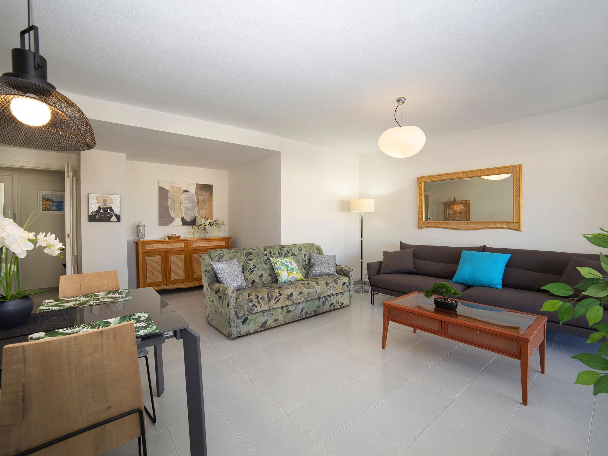 "Esmeralda", 4-room apartment 163 m2 on 6th floor. Spacious and bright, beautiful and cosy furnishings: living/dining room with satellite TV, digital TV, air conditioning and forced-air heating. Exit to the terrace. 2 rooms, each room with 1 double bed (135 cm, length 190 cm), fan. 1 room with 1 french bed (1 x 150 cm, length 190 cm), air conditioning, fan and forced-air heating. Kitchen (oven, dishwasher, 4 ceramic glass hob hotplates, toaster, kettle, microwave). Exit to the veranda. Shower, shower/WC. Boiler (100 litres). 2 large terraces. Terrace furniture. Side view of the sea, the swimming pool and the resort. Facilities: washing machine, iron, children's high chair, baby cot for up to 2 year olds, hair dryer. Internet (WiFi, free). Please note: suitable for families. Non-smoking house. AT-503392-A // Reg. Nr.: ESFCTU00000302900045256200000000000000000AT-503392-A2