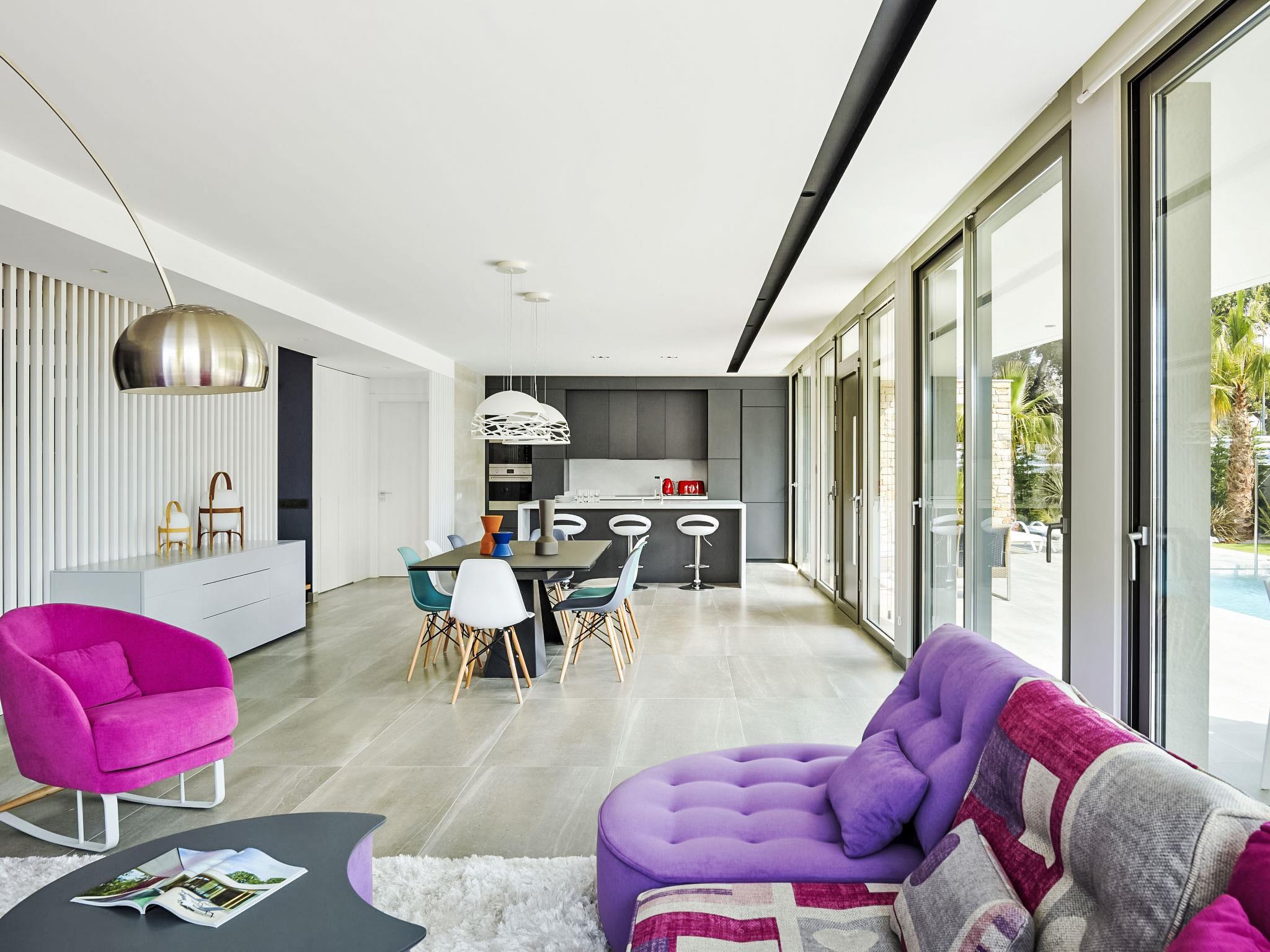 Cambrils: Very modern, beautiful villa "Ardiaca", 3 storeys, built in 2018. In a quiet, sunny position residential area (villas), 200 m from the sea, 200 m from the beach. For shared use: table tennis. Private: large, well-kept garden with lawn 250 m2 trees, swimming pool angular (36 m2, seasonal availability: 01.Jan. - 31.Dec.). Outdoor shower, terrace, garden furniture, barbecue, pool maintenance by the owner/gardener. Public parking on the road. Grocery 600 m, supermarket 2.3 km, restaurant, bar 500 m, bakery 600 m, pedestrian zone 200 m, bicycle rental 4 km, bus stop "N-340 benzinera La Dorada" 900 m, railway station "Cambrils" 3 km. Sports harbour 3 km, golf course (18 hole) 12 km, surf school, sailing school 600 m, riding stable 9 km. Nearby attractions: Port Aventura / Ferrari Land 16 km, Aquopolis 20 km, Aquum Spa 20 km, Jumpland 5 km. Hiking paths: La Mussara 45 km. Please note: suitable for families. The owner does not accept any groups. The owner does not accept any youth groups. Neighbourhood highly sensitive to noise. Quietness and good behaviour expected.
