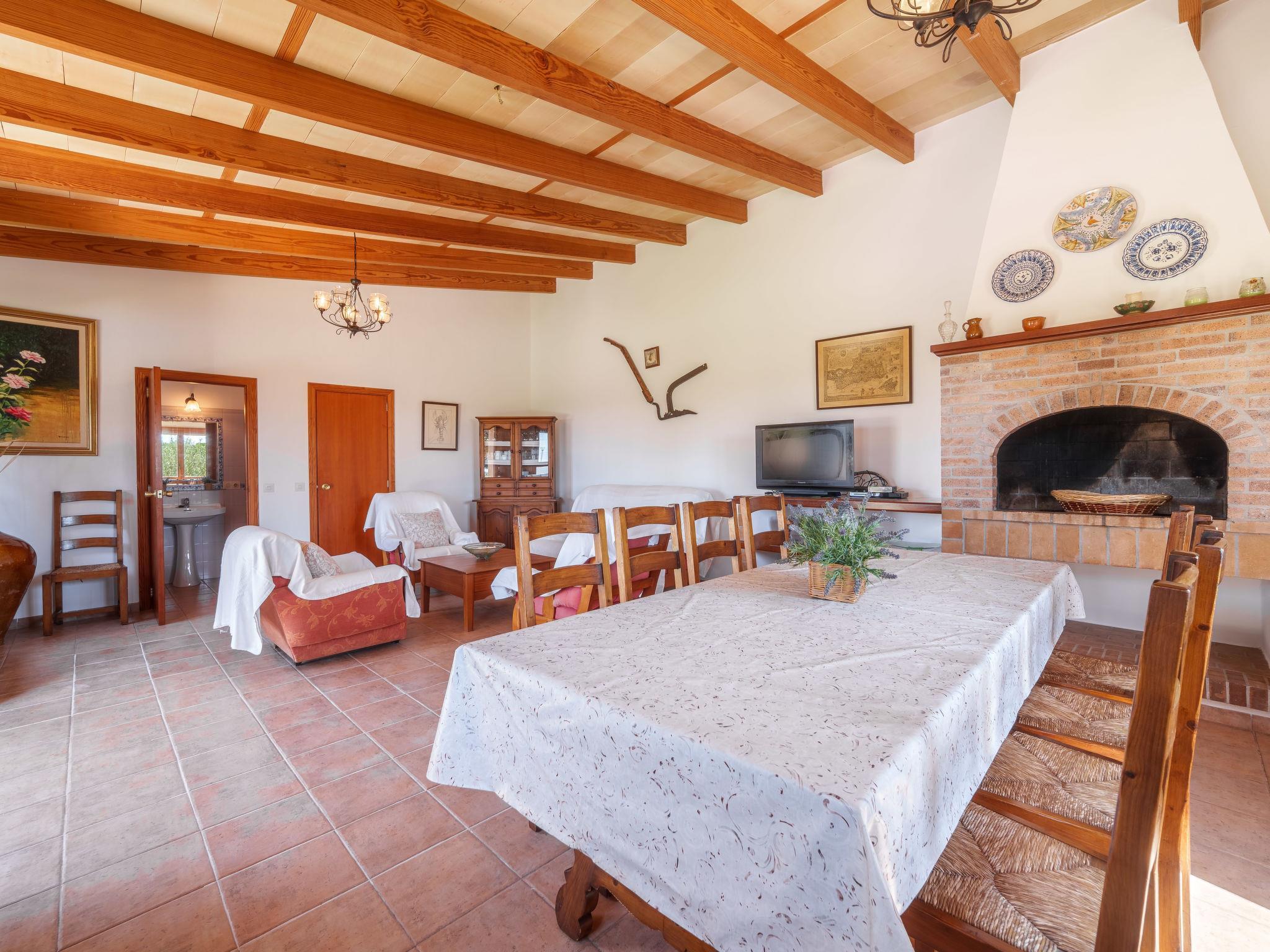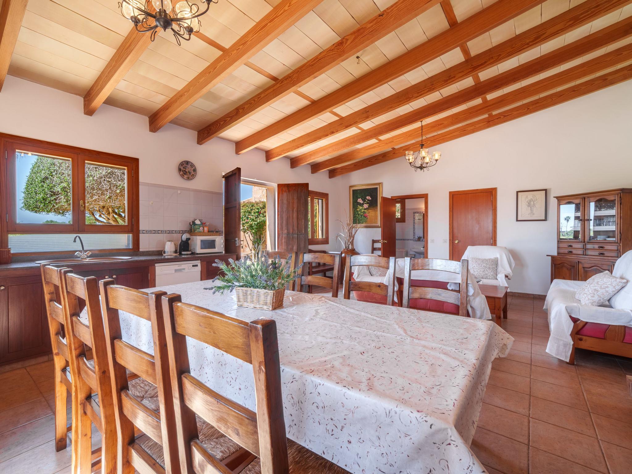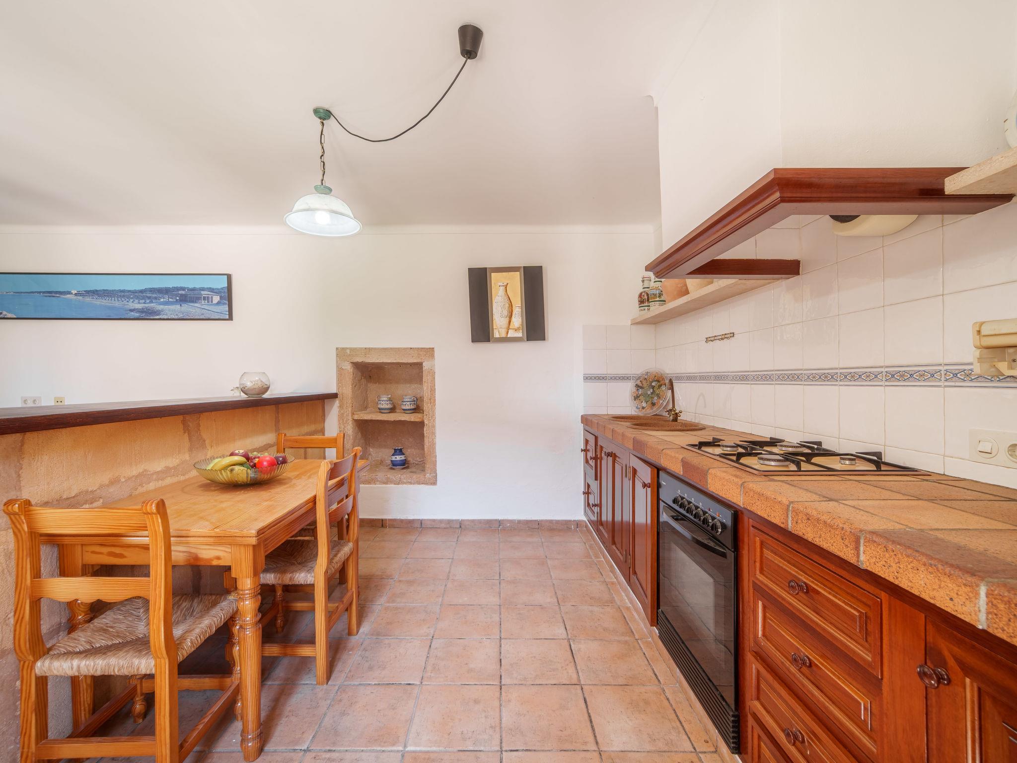 "Es Palmer des Trenc", 5-room farmhouse. Object suitable for 8 adults. Spacious and bright, simple and rustic furnishings: 1 double bedroom with 1 french bed (1 x 150 cm, length 200 cm), air conditioning and forced-air heating. Living room with kitchen corner, bar and satellite TV. Kitchen-/living room (4 hot plates, oven, dishwasher, toaster, kettle, microwave, electric coffee machine) with dining table and satellite TV. Bathroom, bath/WC. Air-conditioning, forced-air heating. Heating not available in all rooms. Upper floor: 2 double bedrooms, each room with 2 beds (90 cm, length 200 cm), air conditioning and forced-air heating. 1 double bedroom with 1 french bed (1 x 180 cm, length 200 cm), air conditioning and forced-air heating. Bath/WC. Air-conditioning, forced-air heating. Natural stone floors. Comfortable furnishings in the country house style. Patio, lawn. Terrace furniture, barbecue, deck chairs (8), sitting area. Panoramic view of the mountains. Facilities: washing machine, iron, children's high chair, baby cot for up to 2 year olds, hair dryer. Internet (WiFi, free). Parking at the house. Suitable for families. ETV/404 // Reg. Nr.: ESFCTU000007008000353907000000000000000000000ETV/4040
