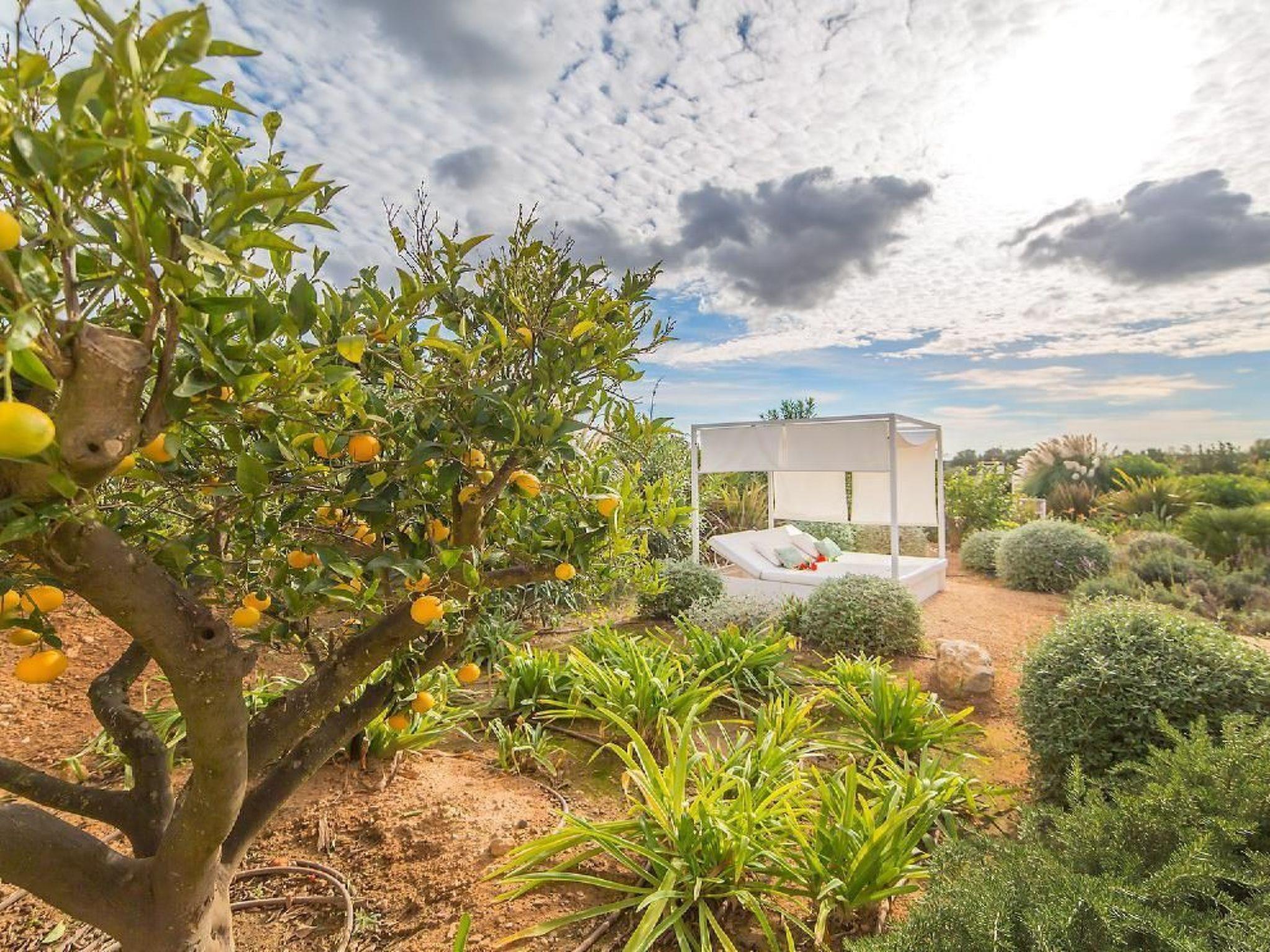 You can also reach the spacious covered terrace from the living/dining area. From here you can enjoy the view over the pool, the beautiful outdoor area and the vast countryside. There is also an outdoor barbecue with seating and a chill-out lounge with white curtains. There is another sofa on the terrace.