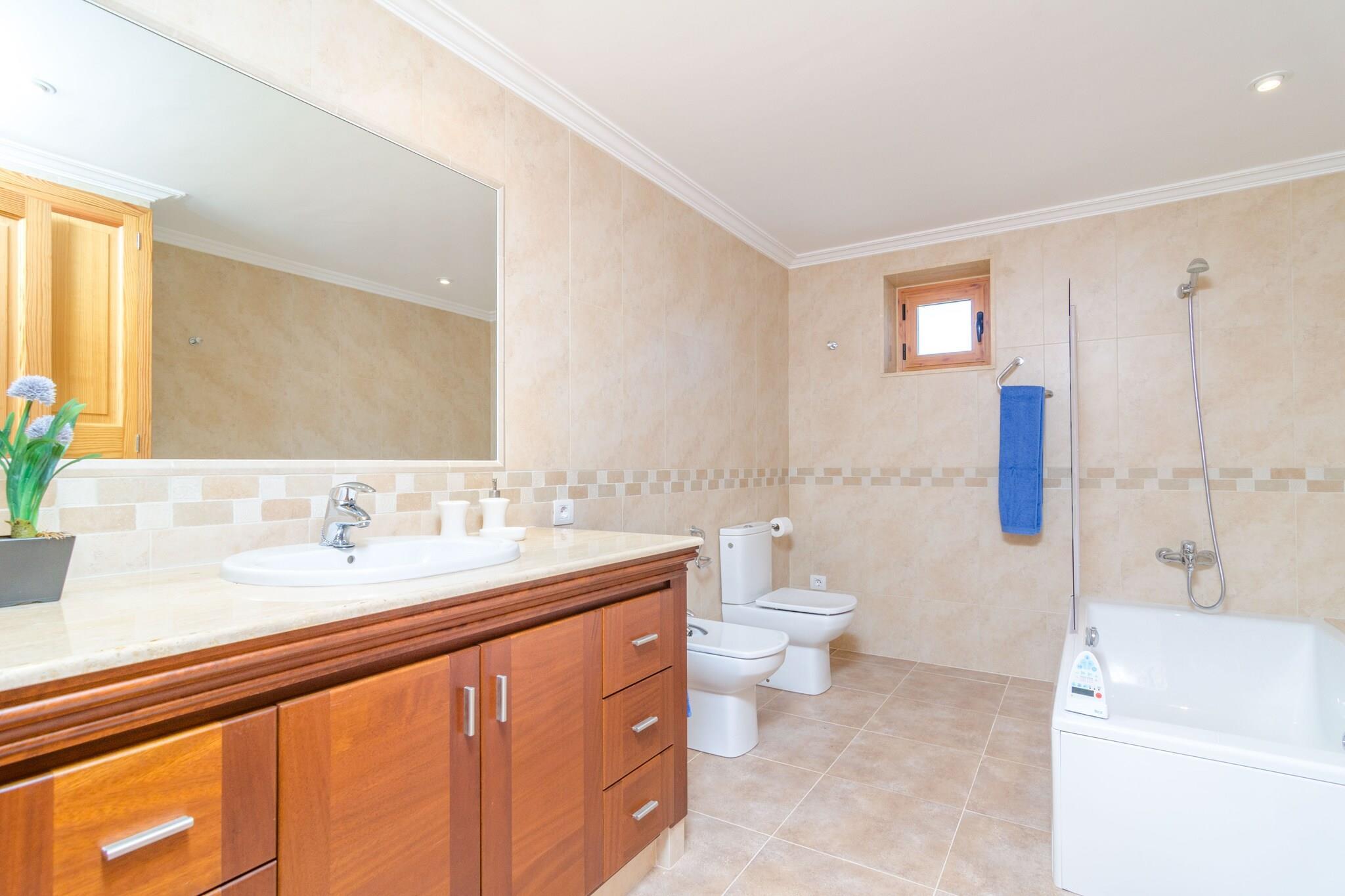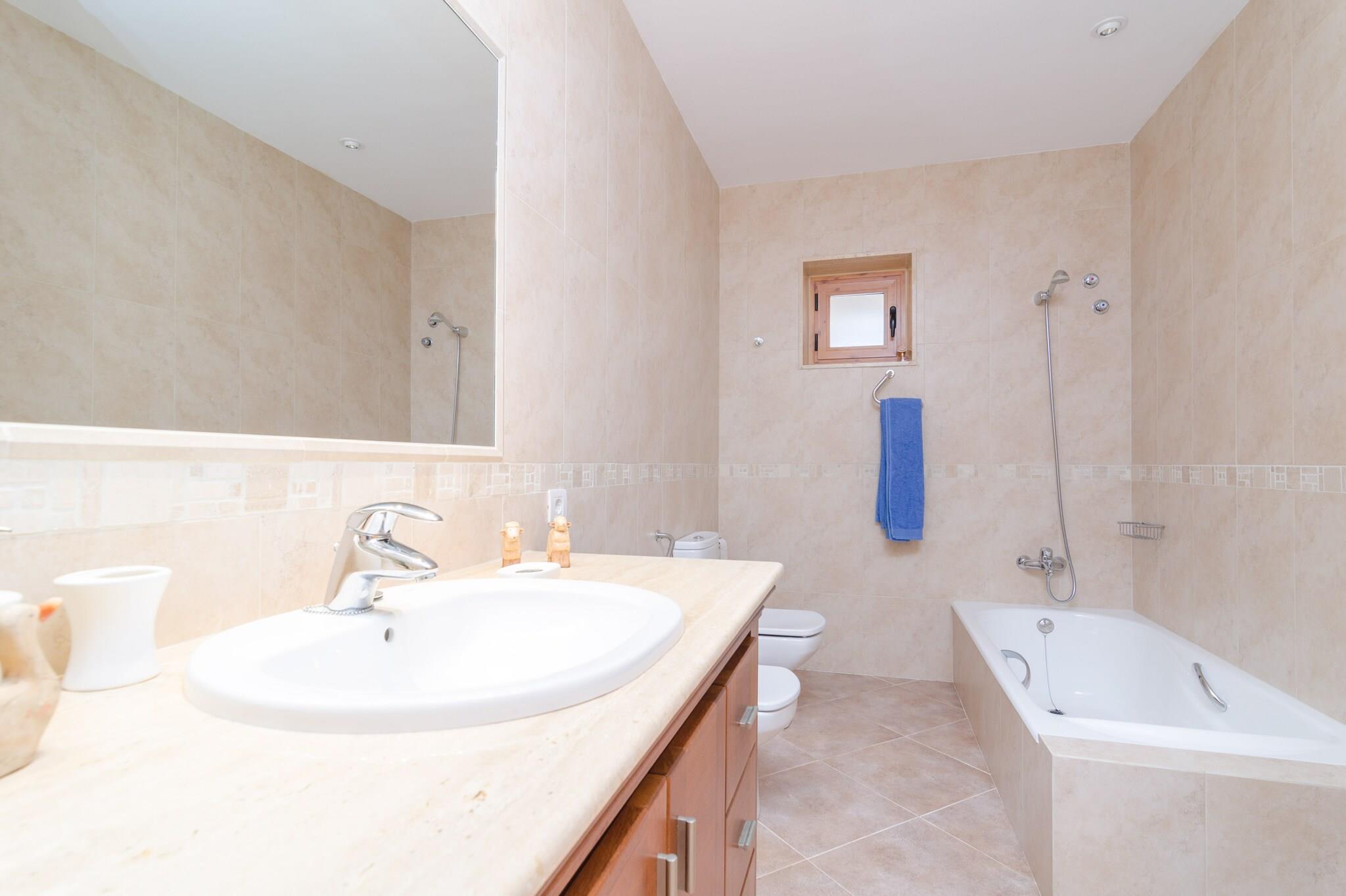 Dit ongelooflijke landhuis, volledig privé, heeft een groot zoutzwembad van 11,5 x 6 meter en 0,80 tot 1,70 meter diep, omgeven door een prachtig grasveld waar u heerlijk in de zon kunt liggen (acht ligstoelen) en een buitendouche. Naast het zwembad is een fantastische veranda met keuken ideaal voor het bereiden van een voortreffelijk diner. Ook staan ??tot uw beschikking een elektrische bakplaat om te koken en een gasfornuis. Het terrein is omheind en er zijn geen directe buren. Het huis, met grote en ruime ruimtes en een mediterrane stijl, heeft twee verdiepingen. Op de begane grond een comfortabele woonkamer met satelliettelevisie en een aparte eetkamer met een stoere tafel voor 10 personen. Een heerlijke gaskeuken, van alle gemakken voorzien, en een bijzettafeltje om te aperitieven. Twee slaapkamers, één met een tweepersoonsbed en toegang naar buiten, en een tweede met twee eenpersoonsbedden, evenals twee badkamers met bad of douche en toilet. Op de eerste verdieping een tweede woonkamer en drie slaapkamers, één met een tweepersoonsbed en de andere twee met elk twee eenpersoonsbedden, waarvan één met toegang tot een groot gemeubileerd terras. Daarnaast twee badkamers, één met douche en de andere met een hydromassagebad. De slaapkamers zijn voorzien van kledingkasten. Als u met de jongste leden van het gezin reist, bieden wij op aanvraag twee kinderbedjes en twee kinderstoelen aan. Om de zomerse hitte tegen te gaan, beschikt het huis over 4 ventilatoren. Het heeft een wasruimte met wasmachine, strijkijzer en strijkplank. Het huis ligt op slechts 6 km van Campos, een gebied dat bekend staat om zijn grote toeristische, gastronomische en culturele aanbod, waar u kunt genieten van een grote verscheidenheid aan restaurants, winkels en supermarkten. Ook vlakbij ligt de stad Colonia de Sant Jordi, ideaal om te dineren met verse zeevruchten en vis, vergezeld van een goede wijn van het eiland. Misschien een korte excursie naar het eiland Cabrera? Op dit kleine eiland leeft alleen de lokale fauna en flora. Vergeet niet een bezoek te brengen aan het paradijselijke en uitgestrekte strand van Es Trenc of Cala Pi. Voor eventuele extra kosten kunt u contact opnemen met de adverteerder. Wij accepteren geen huisdieren. Het vieren van evenementen is niet toegestaan. Er is buiten parkeergelegenheid voor 5 auto's. Afstanden Strand: 17 km - Es Trenc Luchthaven: 38,3 km - Son Sant Joan Golfbaan: 24,7 km - Vall D'or Golf Stad: 6 km - Velden Treinstation: 25,7 km - Manacor Bushalte: 6,6 km - Carrer de la Rambla, Campos Veerboot: 46,1 km - Haven van Palma Ziekenhuis: 26 km - Manacor-ziekenhuis Toeristenvergunning: ETV/5330Bij de ingang dient u de Ecotasa (toeristenbelasting van de Balearen) contant te betalen. Het bedrag varieert tussen EURO 0,55 / per nacht per persoon in het laagseizoen en EURO 2,2 / per nacht per persoon in het hoogseizoen. Vanaf de negende dag wordt het met de helft verminderd. Personen onder de 16 jaar uitgesloten. Bij de ingang dient u de borg rechtstreeks aan de eigenaar te betalen.