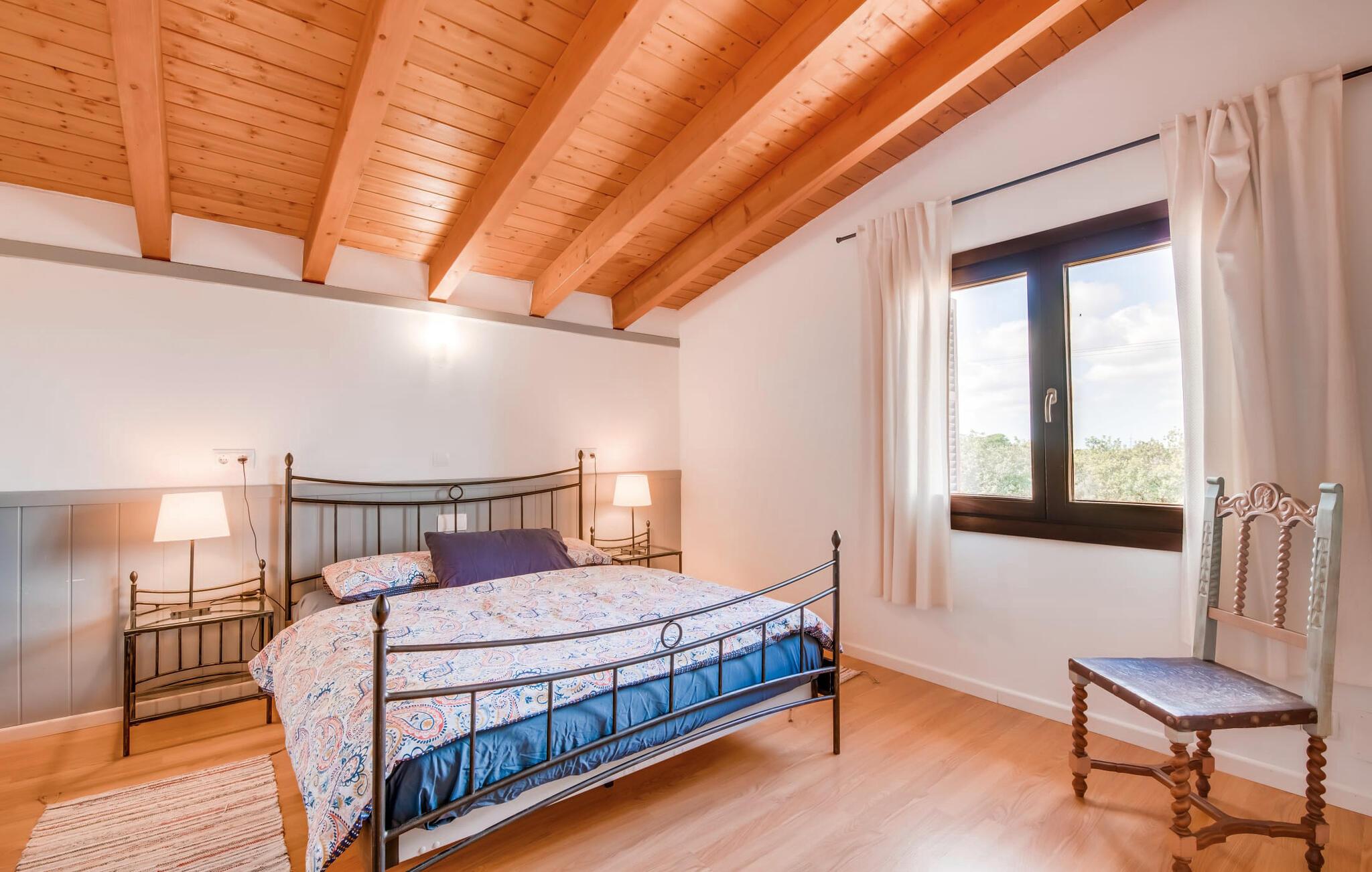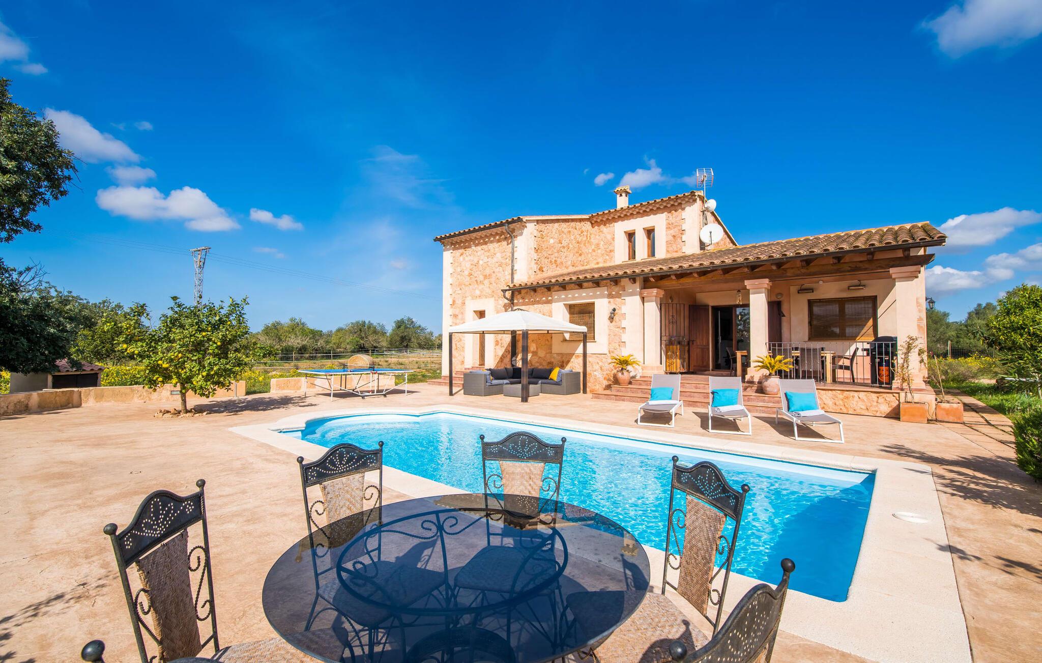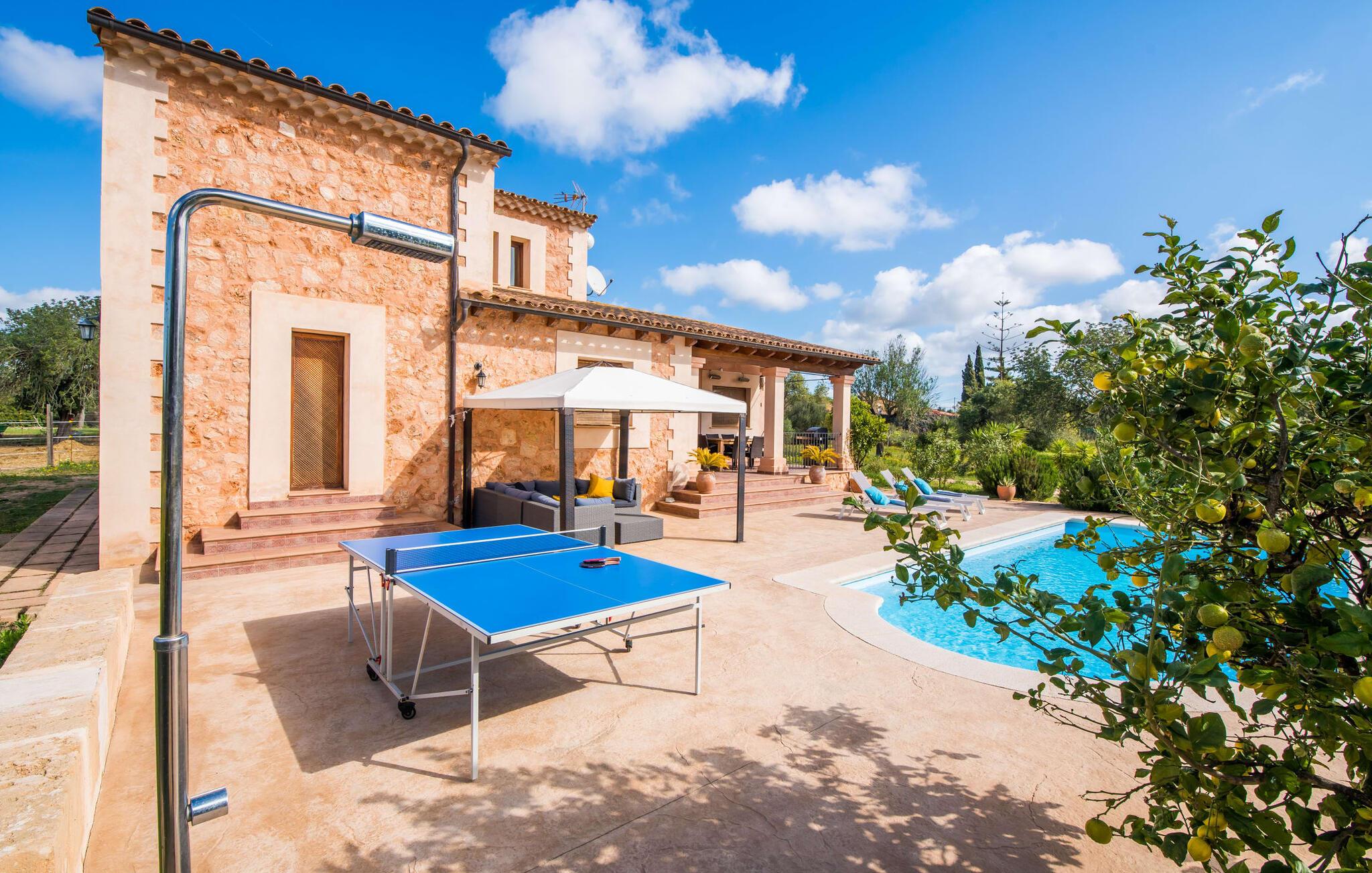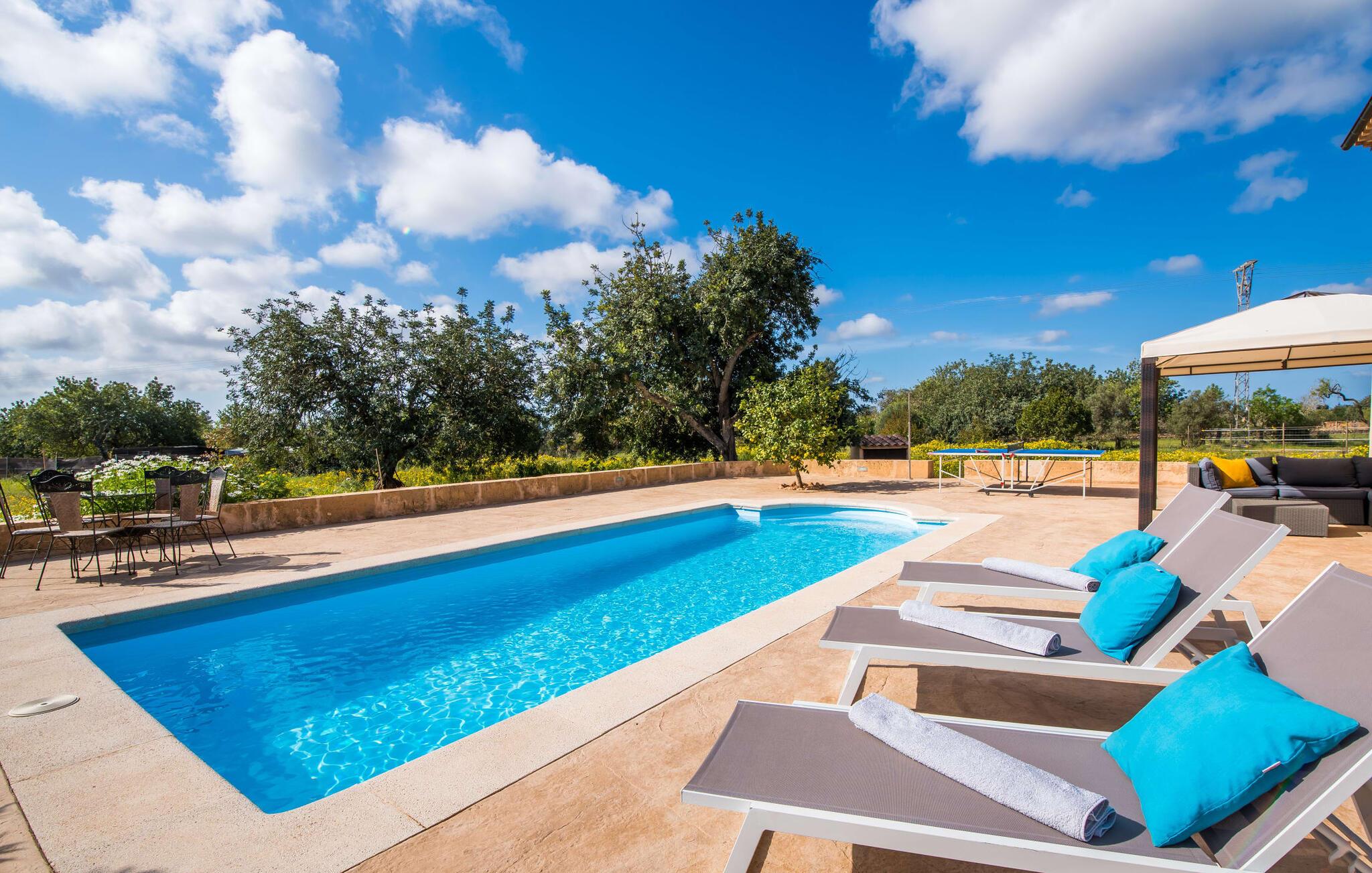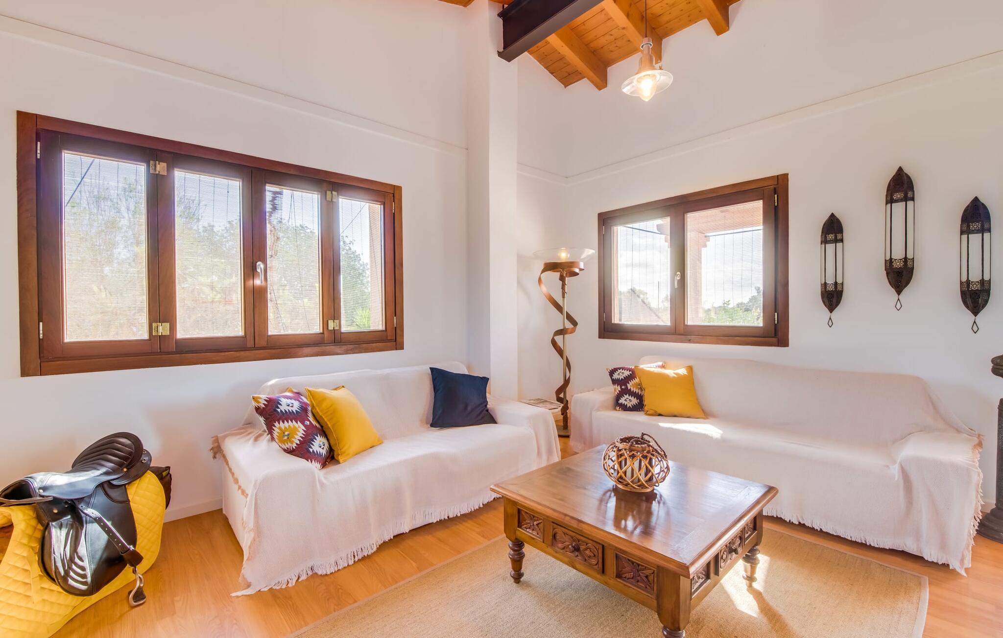 Masser af plads, fred og ro, natur, masser af muligheder for aktive familier og meget mere: Det er, hvad fincaen "Can Alba de Llucmajor" byder på for op til seks personer, et smukt feriehus på det sydlige Mallorca. Fincaen med pool er beliggende på en stor, grøn ejendom i en rolig beliggenhed uden direkte naboer. jeres finca har et meget velholdt, rummeligt og delvist overdækket terrasseområde: Her kan I enten nyde frisk grillet mad sammen ved spisebordet, sætte jer i den behagelige udendørs sofa med en god bog, nyde det lange og rigelige solskin på sol liggestole ved poolen takket være den sydvendte orientering eller spil et spil bordtennis ved husets bord. Fincaen byder velkommen i en klassisk middelhavsstil med et moderne islæt, venligt og lyst Mange vinduer, trælofter og en smagfuld indretning præger den meget velholdte, hyggelige atmosfære. Indretningen lader heller ikke tilbage at ønske: I stueetagen er der ikke kun en rummelig, åben stue og spisestue med pejs, som skaber en hyggelig atmosfære, men også et stort køkken med endnu et spisebord, hvor I kan sidde hyggeligt sammen. og få en vidunderlig morgenmad. De tre dobbeltværelser i huset lover afslappende nætter, et i stueetagen og to på øverste etage. Et moderne badeværelse nedenunder og ovenpå afrunder boligkomforten på jeres drømmefinca på Mallorca. Mallorcas landliv parret med masser af komfort inde og ude: Dette er fincaen "Can Alba de Llucmajor" i den solrige sydlige del af øen. På trods af den rolige beliggenhed på en kæmpe ejendom, ligger jeres feriehus kun 4 km fra Llucmajor. Den charmerende landsby med mange butikker, restauranter og caféer kan nemt nås via landevejen, som kan høres akustisk afhængig af vindretningen. Strande som S'Arenal eller Racó de S'Arena ligger henholdsvis kun 16 og 18 km væk. Bemærk venligst, at denne ejendom ikke accepterer ungdomsgrupper eller polterabender. En ungdomsgruppe på denne ejendom består af personer på 28 år eller derunder. Book ikke denne ejendom, hvis I er en ungdomsgruppe eller en polterabendgruppe, da jeres reservation vil blive afvist, når den er booket, hvilket også kan være tilfældet ved ankomst til ejendommen eller under jeres ophold, og I vil ikke modtage en refusion.