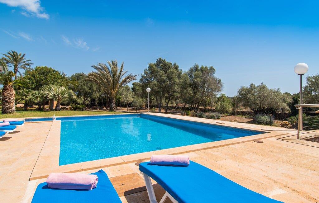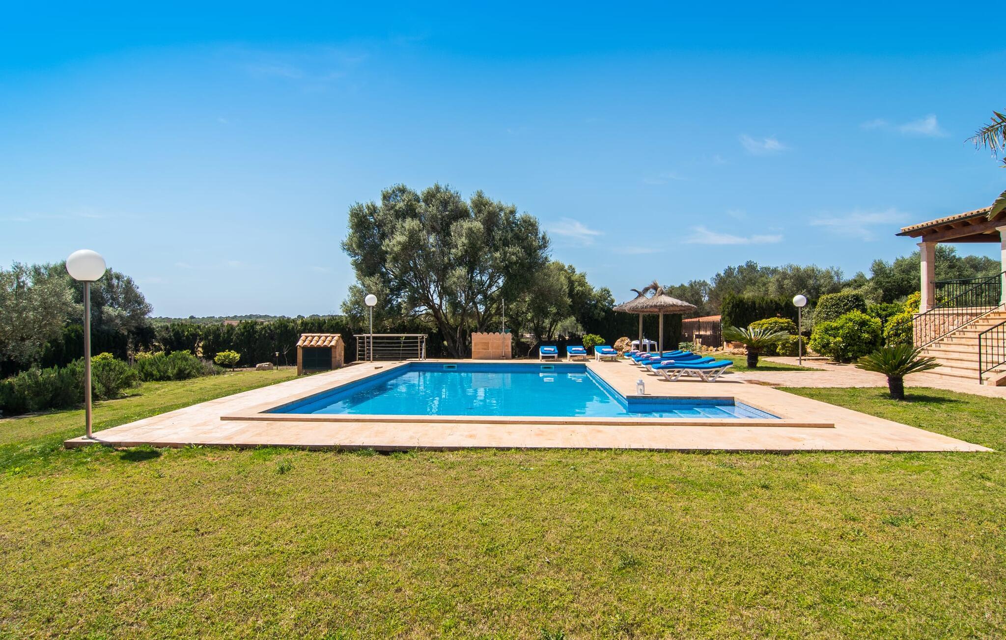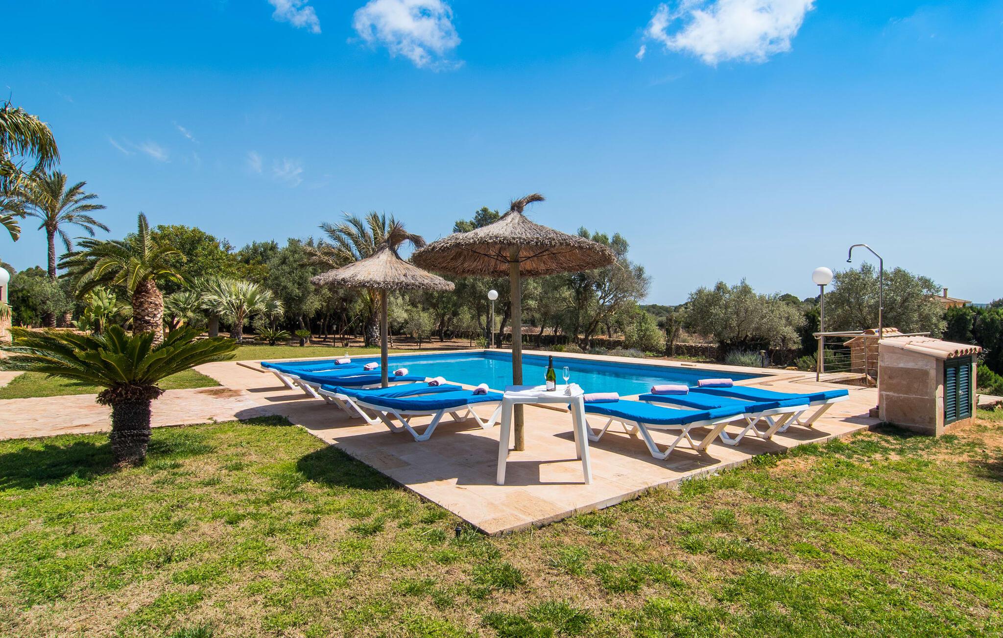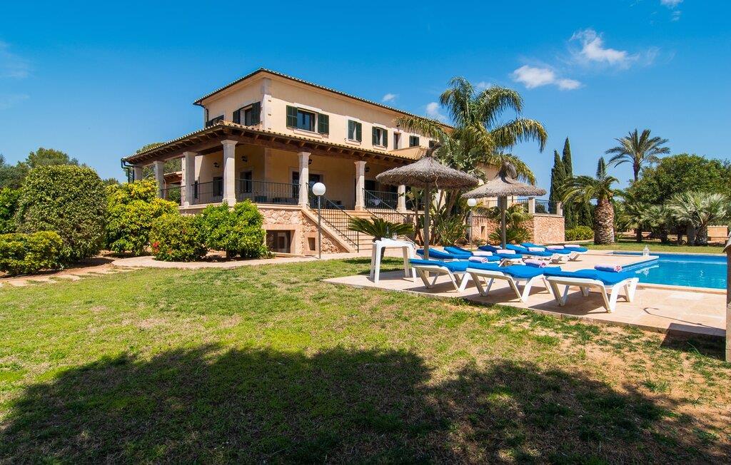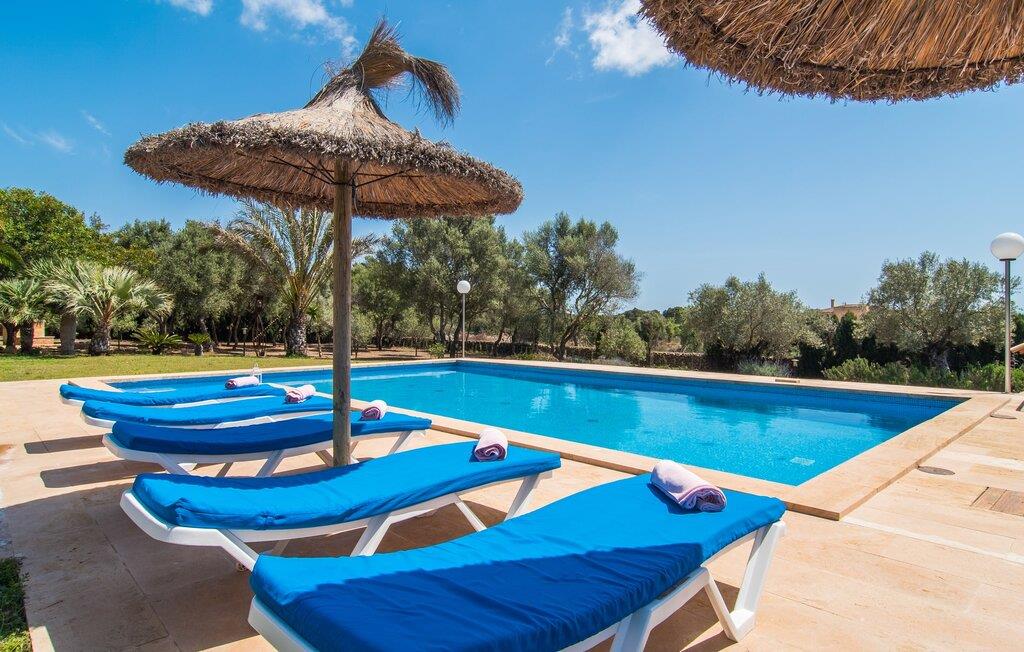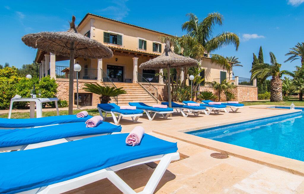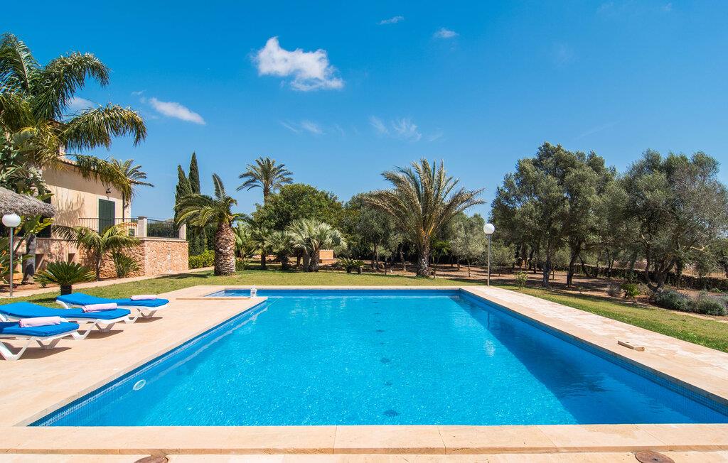 Villaen “Can Bou” byder sine gæster velkommen midt i den fantastiske mallorcanske natur, nær Colonia de Sant Jordi, og er særligt bemærkelsesværdig ved første øjekast på grund af sin høje beliggenhed i kombination med et usædvanligt smukt udendørsområde. Frodige palmer og andre middelhavsplanter, velholdte græsplæner og terrasser samt maleriske stier præger haven. Der er endda en lille, dekorativ dam. Udendørsområdets gennemarbejdede design tilbyder en række muligheder for et behageligt ophold. Den store pool med en imponerende længde på 11 meter er særligt attraktiv. Poolområdet er flisebelagt med blå mosaiksten og er let tilgængeligt via trapper. Komfortable liggestole venter gæster til omfattende solbadning. Verandagyngen pryder kun billederne og fås ikke længere. Ikke desto mindre har I fra dette sted i umiddelbar nærhed af poolen et godt udsyn og kan holde øje med børnene, der plasker rundt i vandet. Her kan I slappe af og nyde en kølig drink eller bare lade verden gå forbi. De rummelige, delvist overdækkede terrasser på huset er kun 10 trin adskilt fra dette niveau. I kan enten trække jer tilbage et stykke tid på forskellige siddemuligheder eller måske mødes i en venlig atmosfære, for eksempel for at nyde et måltid sammen. Den høje beliggenhed gør dette område til et eksklusivt udsigtspunkt, hvorfra I kan nyde en forfriskende morgenmad eller en kulinarisk grill på en helt speciel og unik måde. Lad jeres dag begynde og slutte her, som I vil, ledsaget af en betagende udsigt over haven. Og særligt praktisk: jeres lejebil står altid i skyggen i garagen. Et lysfyldt interiør med rummelige værelser, smagfuld indretning og materialer af høj kvalitet skaber en usædvanlig æstetisk stemning, der straks giver jer lyst til at blive hængende. En åben stue/alrum udgør kernen i huset og byder på indendørs ophold på højt niveau. Lyse møbler og materialer er blevet dygtigt kombineret med kontrasterende farver for at skabe en diskret, men alligevel imponerende helhed. Stenvæggen i stuen er et absolut blikfang, der dygtigt tiltrækker jeres opmærksomhed. Det store fjernsyn med satellitforbindelse og musikanlægget er også ideelt installeret her. Det betyder, at I kan slappe af her på den super komfortable sofa under de bedste forhold, og når I har lyst. Hele gruppen kan nyde sofistikeret indendørs spisning sammen ved det elegante spisebord, som giver frit udsyn til terrassen og videre. Et stilfuldt køkken byder på alt, hvad I har brug for hver dag, med eksklusiv indretning og udstyr. Disse omfatter blandt andet en kedel og en filterkaffemaskine, som I kan tilberede jeres første aromakop om morgenen med, lige som I har lyst. Der er masser af opbevarings- og arbejdsplads, samt et attraktivt farveskema og et lille område til endnu et spisebord. Moderne, individuelt designede værelser tilbyder en indbydende ramme for afslappende nætter. Der er i alt to senge, der måler 1,50 x 2,00 m og fire senge, der måler 1,00 x 2,00 m. Der er også plads til to små gæster. For jeres komfort er myggenet tilgængelige i huset og kan bruges om nødvendigt. De tre badeværelser, hvoraf to er en-suite, imponerer med deres meget moderne design. Et strygejern og tre hårtørrere er også tilgængelige i huset og skal ikke medbringes hjemmefra. Villa "Can Bou" er et ideelt udgangspunkt for ø-udforskning af alle slags og i alle retninger. Forskellige attraktive strande kan hurtigt nås med jeres lejebil. En række forskellige vandsportsmuligheder kan bookes gennem lokale udbydere. Landskabet omkring Colonia de Sant Jordi er præget af talrige saltpander. Fyrtårnet ved Cap des Ses Salines er et godt udgangspunkt for vandreture. I Ses Salines finder I et farverigt ugentligt marked hver torsdag og flere gode restauranter med en imødekommende atmosfære. Et lille insidertip ville være at prøve restauranten "Espinaret", som ligger meget tæt på villaen. Den betagende villa "Can Bou" ligger i en attraktiv landlig beliggenhed, kun 4 km nordøst for kystbyen Colonia de Sant Jordi. Denne tidligere fiskerby har to smukke sandstrande, den nordlige er den berømte naturlige strand Es Trenc. En tur til det smukke havneområde der bør bestemt ikke mangle i jeres ferieplanlægning. I kan gå fra hotelområdet til havnen via gangbroer og stier, der strækker sig langs klippekysten.