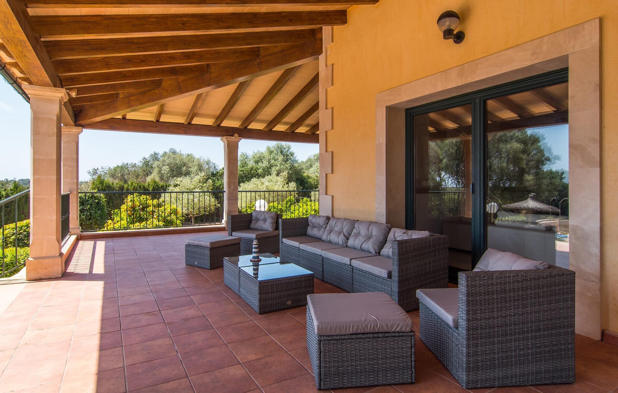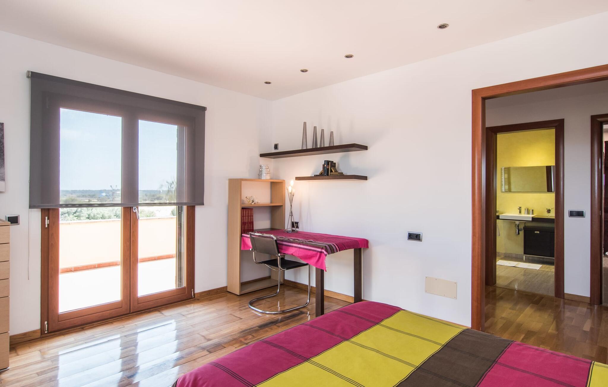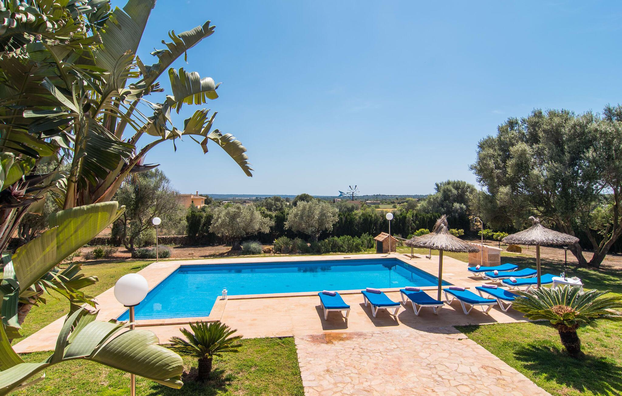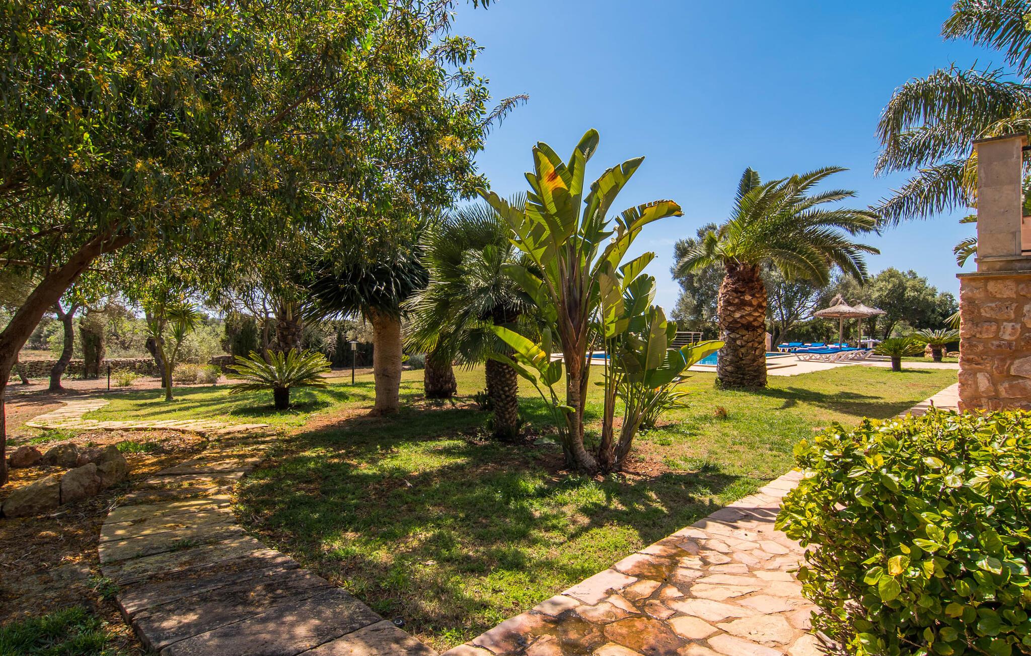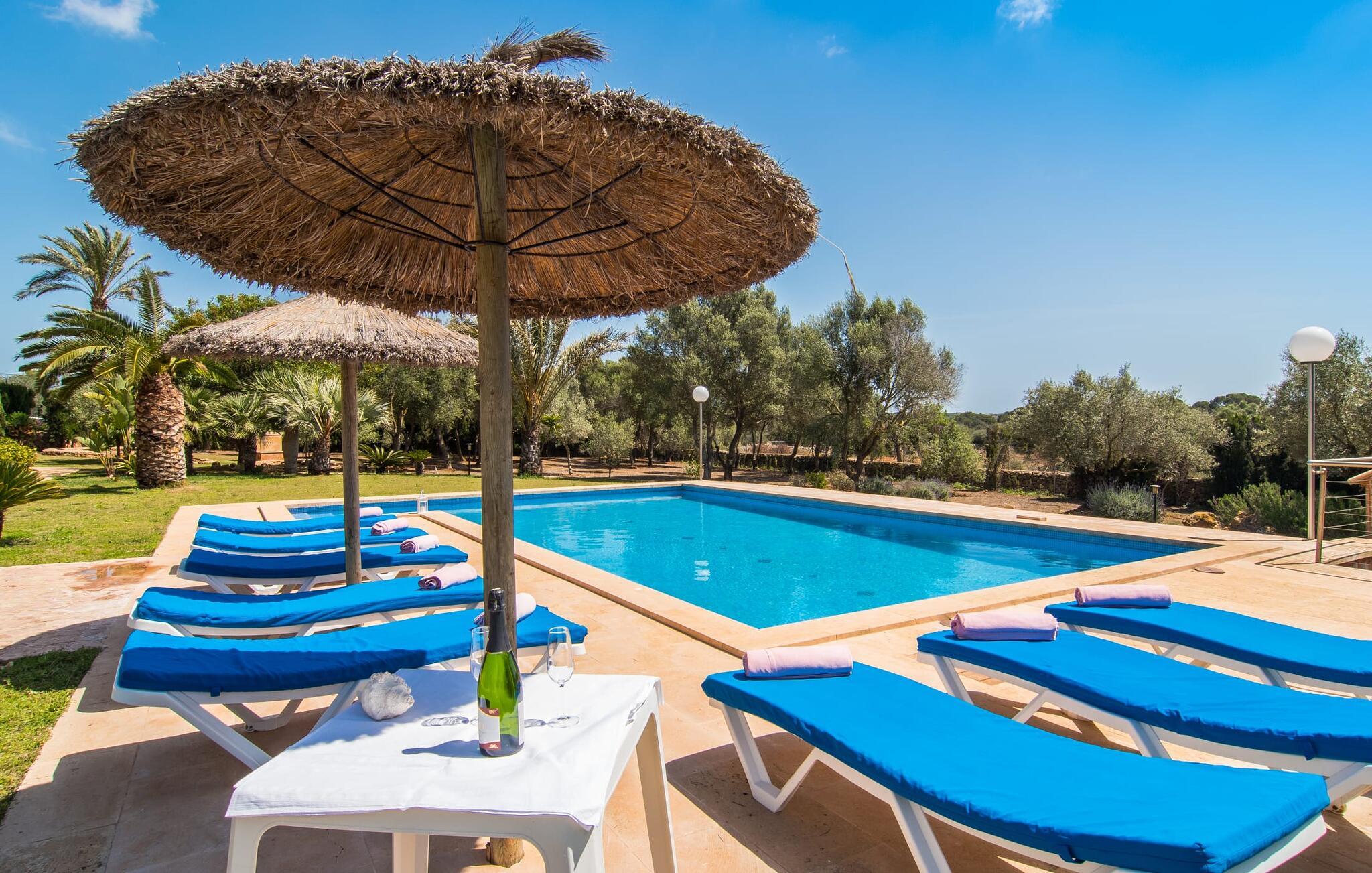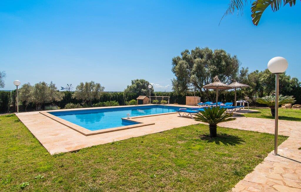Villaen “Can Bou” byder sine gæster velkommen midt i den fantastiske mallorcanske natur, nær Colonia de Sant Jordi, og er særligt bemærkelsesværdig ved første øjekast på grund af sin høje beliggenhed i kombination med et usædvanligt smukt udendørsområde. Frodige palmer og andre middelhavsplanter, velholdte græsplæner og terrasser samt maleriske stier præger haven. Der er endda en lille, dekorativ dam. Udendørsområdets gennemarbejdede design tilbyder en række muligheder for et behageligt ophold. Den store pool med en imponerende længde på 11 meter er særligt attraktiv. Poolområdet er flisebelagt med blå mosaiksten og er let tilgængeligt via trapper. Komfortable liggestole venter gæster til omfattende solbadning. Verandagyngen pryder kun billederne og fås ikke længere. Ikke desto mindre har I fra dette sted i umiddelbar nærhed af poolen et godt udsyn og kan holde øje med børnene, der plasker rundt i vandet. Her kan I slappe af og nyde en kølig drink eller bare lade verden gå forbi. De rummelige, delvist overdækkede terrasser på huset er kun 10 trin adskilt fra dette niveau. I kan enten trække jer tilbage et stykke tid på forskellige siddemuligheder eller måske mødes i en venlig atmosfære, for eksempel for at nyde et måltid sammen. Den høje beliggenhed gør dette område til et eksklusivt udsigtspunkt, hvorfra I kan nyde en forfriskende morgenmad eller en kulinarisk grill på en helt speciel og unik måde. Lad jeres dag begynde og slutte her, som I vil, ledsaget af en betagende udsigt over haven. Og særligt praktisk: jeres lejebil står altid i skyggen i garagen. Et lysfyldt interiør med rummelige værelser, smagfuld indretning og materialer af høj kvalitet skaber en usædvanlig æstetisk stemning, der straks giver jer lyst til at blive hængende. En åben stue/alrum udgør kernen i huset og byder på indendørs ophold på højt niveau. Lyse møbler og materialer er blevet dygtigt kombineret med kontrasterende farver for at skabe en diskret, men alligevel imponerende helhed. Stenvæggen i stuen er et absolut blikfang, der dygtigt tiltrækker jeres opmærksomhed. Det store fjernsyn med satellitforbindelse og musikanlægget er også ideelt installeret her. Det betyder, at I kan slappe af her på den super komfortable sofa under de bedste forhold, og når I har lyst. Hele gruppen kan nyde sofistikeret indendørs spisning sammen ved det elegante spisebord, som giver frit udsyn til terrassen og videre. Et stilfuldt køkken byder på alt, hvad I har brug for hver dag, med eksklusiv indretning og udstyr. Disse omfatter blandt andet en kedel og en filterkaffemaskine, som I kan tilberede jeres første aromakop om morgenen med, lige som I har lyst. Der er masser af opbevarings- og arbejdsplads, samt et attraktivt farveskema og et lille område til endnu et spisebord. Moderne, individuelt designede værelser tilbyder en indbydende ramme for afslappende nætter. Der er i alt to senge, der måler 1,50 x 2,00 m og fire senge, der måler 1,00 x 2,00 m. Der er også plads til to små gæster. For jeres komfort er myggenet tilgængelige i huset og kan bruges om nødvendigt. De tre badeværelser, hvoraf to er en-suite, imponerer med deres meget moderne design. Et strygejern og tre hårtørrere er også tilgængelige i huset og skal ikke medbringes hjemmefra. Villa "Can Bou" er et ideelt udgangspunkt for ø-udforskning af alle slags og i alle retninger. Forskellige attraktive strande kan hurtigt nås med jeres lejebil. En række forskellige vandsportsmuligheder kan bookes gennem lokale udbydere. Landskabet omkring Colonia de Sant Jordi er præget af talrige saltpander. Fyrtårnet ved Cap des Ses Salines er et godt udgangspunkt for vandreture. I Ses Salines finder I et farverigt ugentligt marked hver torsdag og flere gode restauranter med en imødekommende atmosfære. Et lille insidertip ville være at prøve restauranten "Espinaret", som ligger meget tæt på villaen. Den betagende villa "Can Bou" ligger i en attraktiv landlig beliggenhed, kun 4 km nordøst for kystbyen Colonia de Sant Jordi. Denne tidligere fiskerby har to smukke sandstrande, den nordlige er den berømte naturlige strand Es Trenc. En tur til det smukke havneområde der bør bestemt ikke mangle i jeres ferieplanlægning. I kan gå fra hotelområdet til havnen via gangbroer og stier, der strækker sig langs klippekysten.
