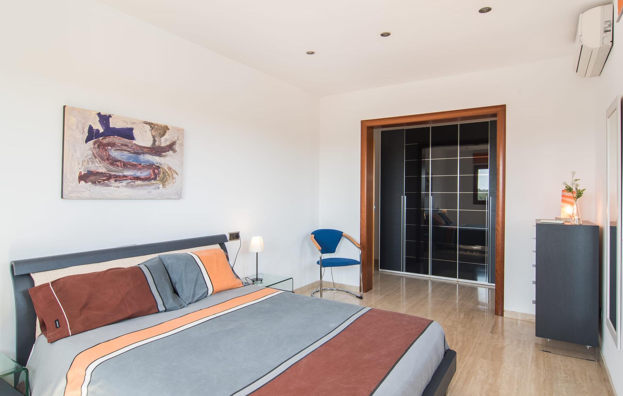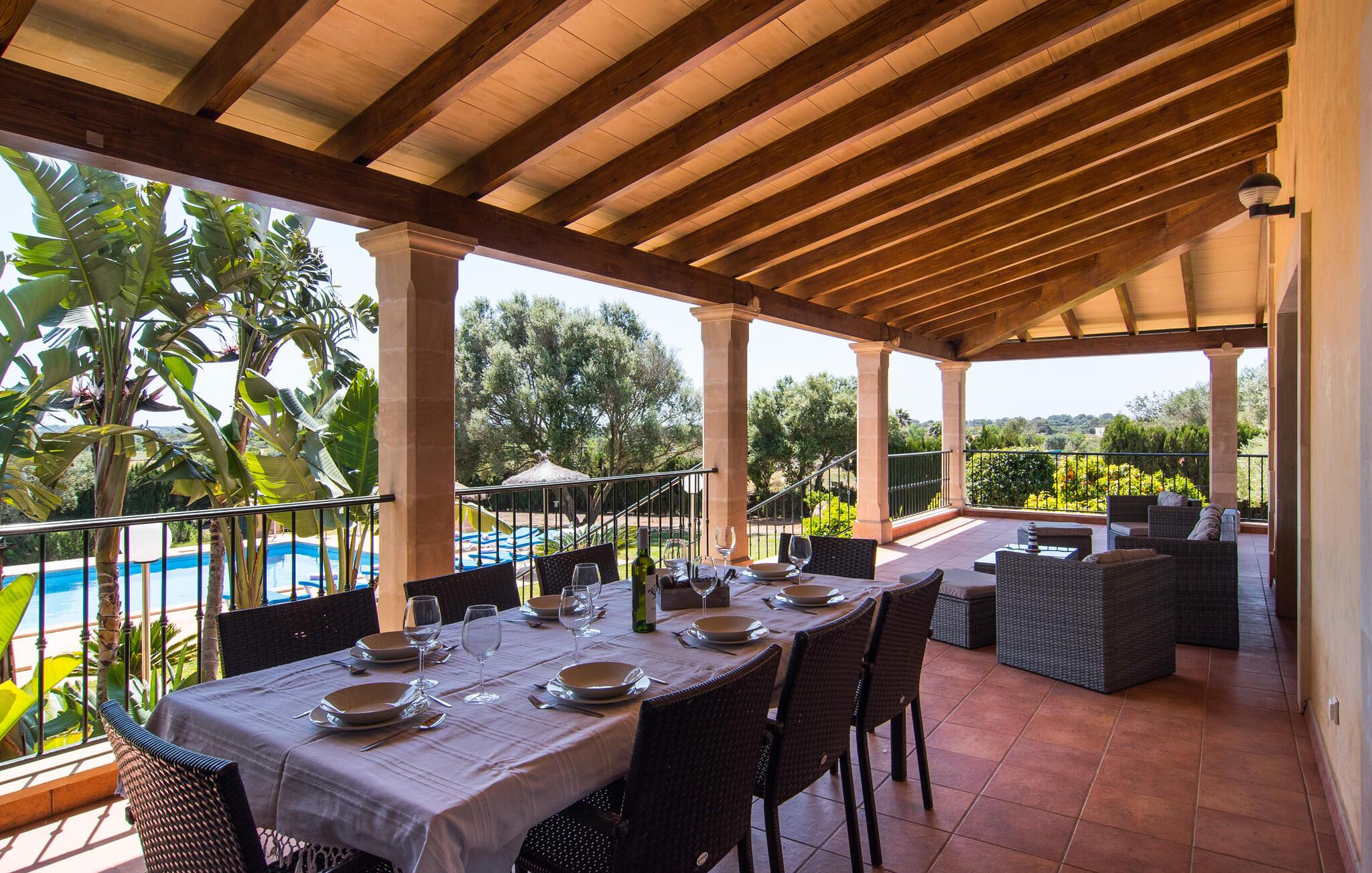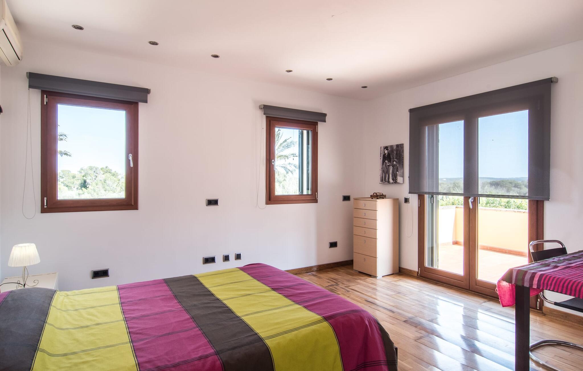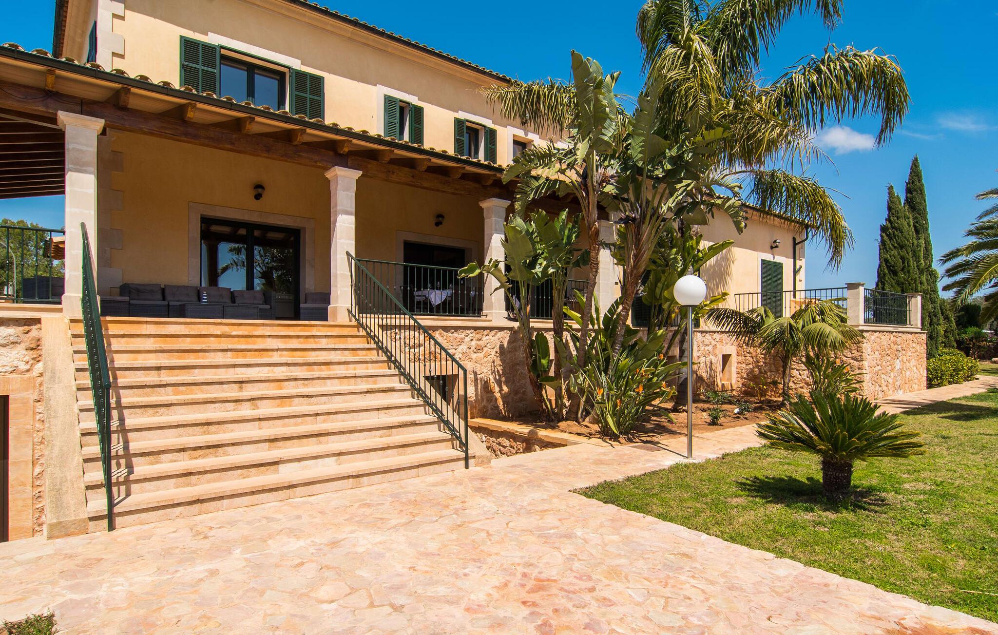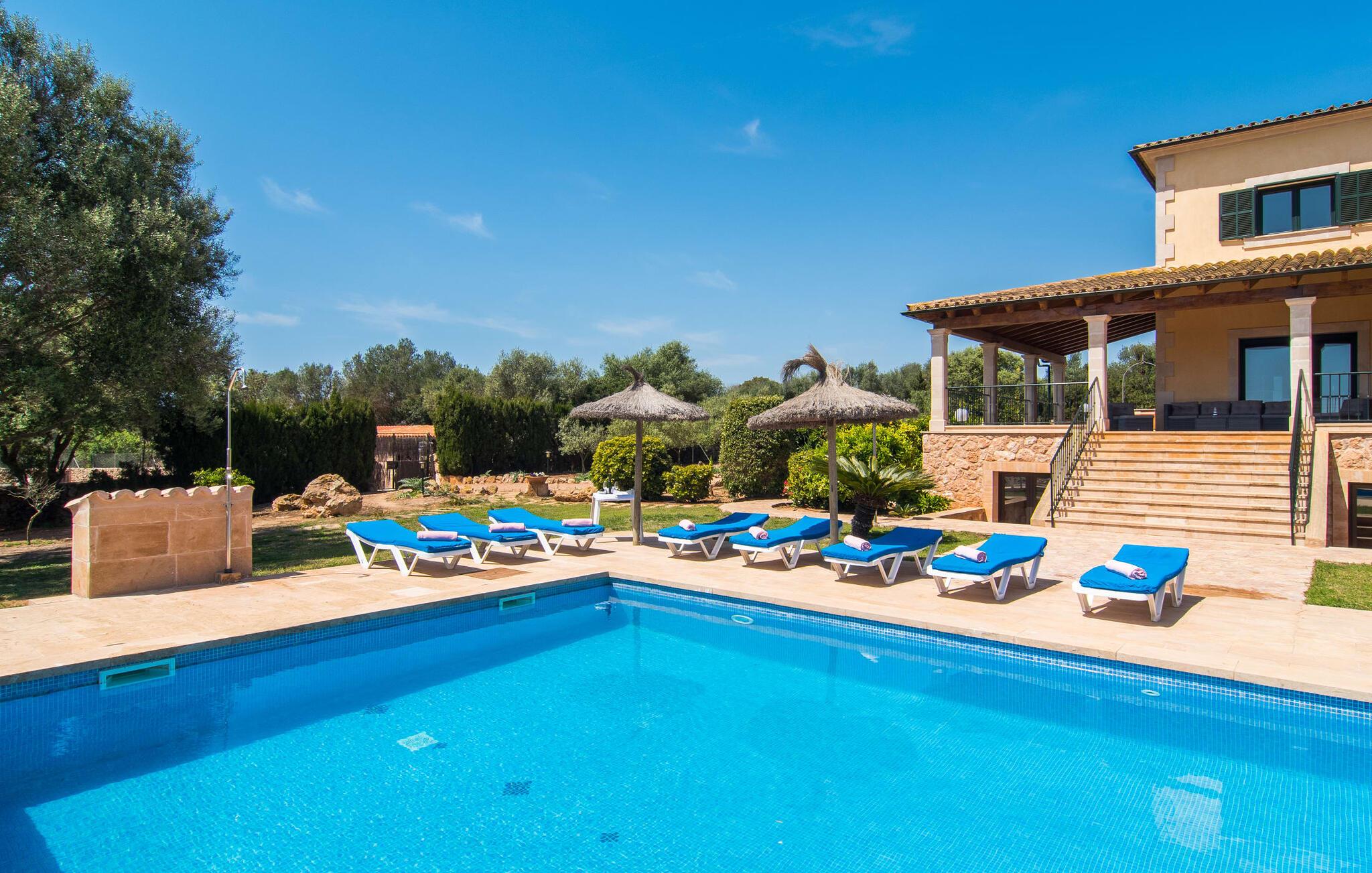 Villaen “Can Bou” byder sine gæster velkommen midt i den fantastiske mallorcanske natur, nær Colonia de Sant Jordi, og er særligt bemærkelsesværdig ved første øjekast på grund af sin høje beliggenhed i kombination med et usædvanligt smukt udendørsområde. Frodige palmer og andre middelhavsplanter, velholdte græsplæner og terrasser samt maleriske stier præger haven. Der er endda en lille, dekorativ dam. Udendørsområdets gennemarbejdede design tilbyder en række muligheder for et behageligt ophold. Den store pool med en imponerende længde på 11 meter er særligt attraktiv. Poolområdet er flisebelagt med blå mosaiksten og er let tilgængeligt via trapper. Komfortable liggestole venter gæster til omfattende solbadning. Verandagyngen pryder kun billederne og fås ikke længere. Ikke desto mindre har I fra dette sted i umiddelbar nærhed af poolen et godt udsyn og kan holde øje med børnene, der plasker rundt i vandet. Her kan I slappe af og nyde en kølig drink eller bare lade verden gå forbi. De rummelige, delvist overdækkede terrasser på huset er kun 10 trin adskilt fra dette niveau. I kan enten trække jer tilbage et stykke tid på forskellige siddemuligheder eller måske mødes i en venlig atmosfære, for eksempel for at nyde et måltid sammen. Den høje beliggenhed gør dette område til et eksklusivt udsigtspunkt, hvorfra I kan nyde en forfriskende morgenmad eller en kulinarisk grill på en helt speciel og unik måde. Lad jeres dag begynde og slutte her, som I vil, ledsaget af en betagende udsigt over haven. Og særligt praktisk: jeres lejebil står altid i skyggen i garagen. Et lysfyldt interiør med rummelige værelser, smagfuld indretning og materialer af høj kvalitet skaber en usædvanlig æstetisk stemning, der straks giver jer lyst til at blive hængende. En åben stue/alrum udgør kernen i huset og byder på indendørs ophold på højt niveau. Lyse møbler og materialer er blevet dygtigt kombineret med kontrasterende farver for at skabe en diskret, men alligevel imponerende helhed. Stenvæggen i stuen er et absolut blikfang, der dygtigt tiltrækker jeres opmærksomhed. Det store fjernsyn med satellitforbindelse og musikanlægget er også ideelt installeret her. Det betyder, at I kan slappe af her på den super komfortable sofa under de bedste forhold, og når I har lyst. Hele gruppen kan nyde sofistikeret indendørs spisning sammen ved det elegante spisebord, som giver frit udsyn til terrassen og videre. Et stilfuldt køkken byder på alt, hvad I har brug for hver dag, med eksklusiv indretning og udstyr. Disse omfatter blandt andet en kedel og en filterkaffemaskine, som I kan tilberede jeres første aromakop om morgenen med, lige som I har lyst. Der er masser af opbevarings- og arbejdsplads, samt et attraktivt farveskema og et lille område til endnu et spisebord. Moderne, individuelt designede værelser tilbyder en indbydende ramme for afslappende nætter. Der er i alt to senge, der måler 1,50 x 2,00 m og fire senge, der måler 1,00 x 2,00 m. Der er også plads til to små gæster. For jeres komfort er myggenet tilgængelige i huset og kan bruges om nødvendigt. De tre badeværelser, hvoraf to er en-suite, imponerer med deres meget moderne design. Et strygejern og tre hårtørrere er også tilgængelige i huset og skal ikke medbringes hjemmefra. Villa "Can Bou" er et ideelt udgangspunkt for ø-udforskning af alle slags og i alle retninger. Forskellige attraktive strande kan hurtigt nås med jeres lejebil. En række forskellige vandsportsmuligheder kan bookes gennem lokale udbydere. Landskabet omkring Colonia de Sant Jordi er præget af talrige saltpander. Fyrtårnet ved Cap des Ses Salines er et godt udgangspunkt for vandreture. I Ses Salines finder I et farverigt ugentligt marked hver torsdag og flere gode restauranter med en imødekommende atmosfære. Et lille insidertip ville være at prøve restauranten "Espinaret", som ligger meget tæt på villaen. Den betagende villa "Can Bou" ligger i en attraktiv landlig beliggenhed, kun 4 km nordøst for kystbyen Colonia de Sant Jordi. Denne tidligere fiskerby har to smukke sandstrande, den nordlige er den berømte naturlige strand Es Trenc. En tur til det smukke havneområde der bør bestemt ikke mangle i jeres ferieplanlægning. I kan gå fra hotelområdet til havnen via gangbroer og stier, der strækker sig langs klippekysten.