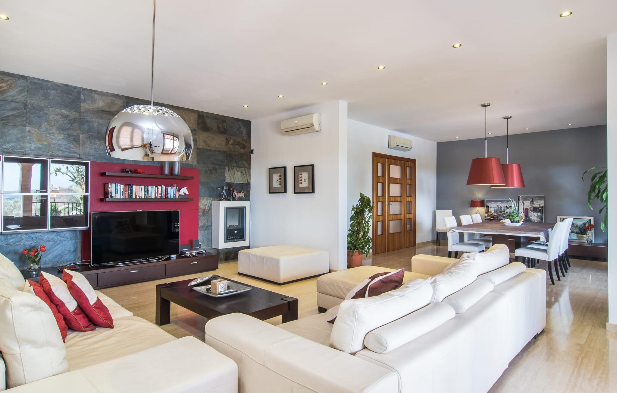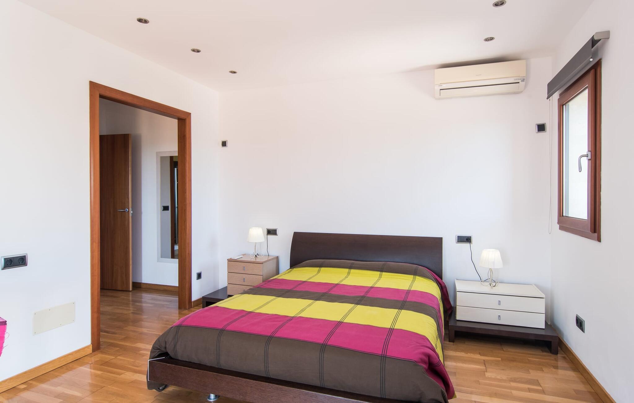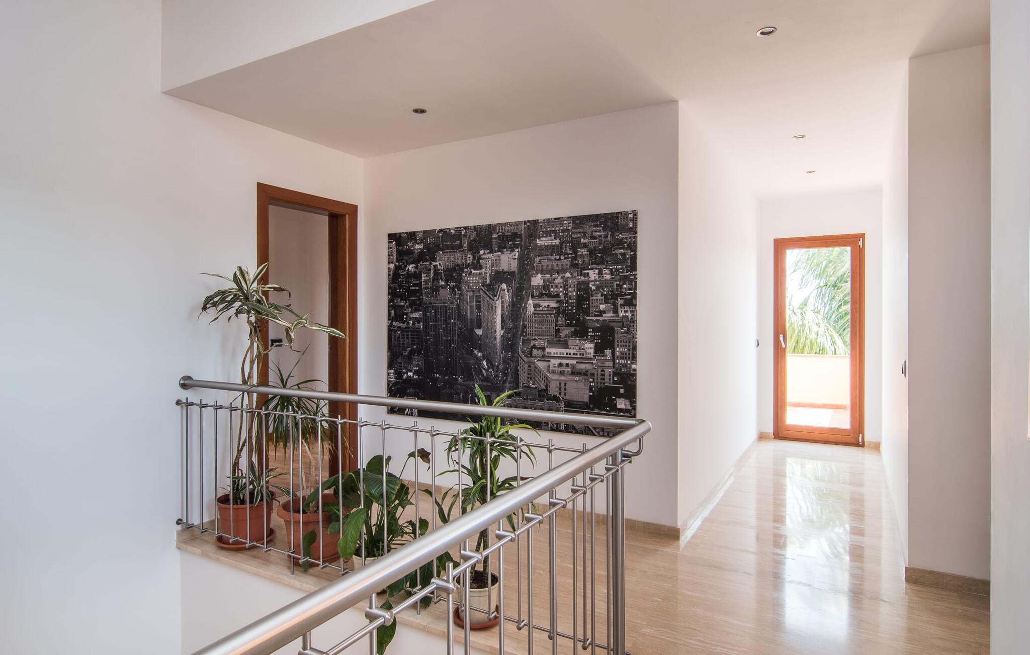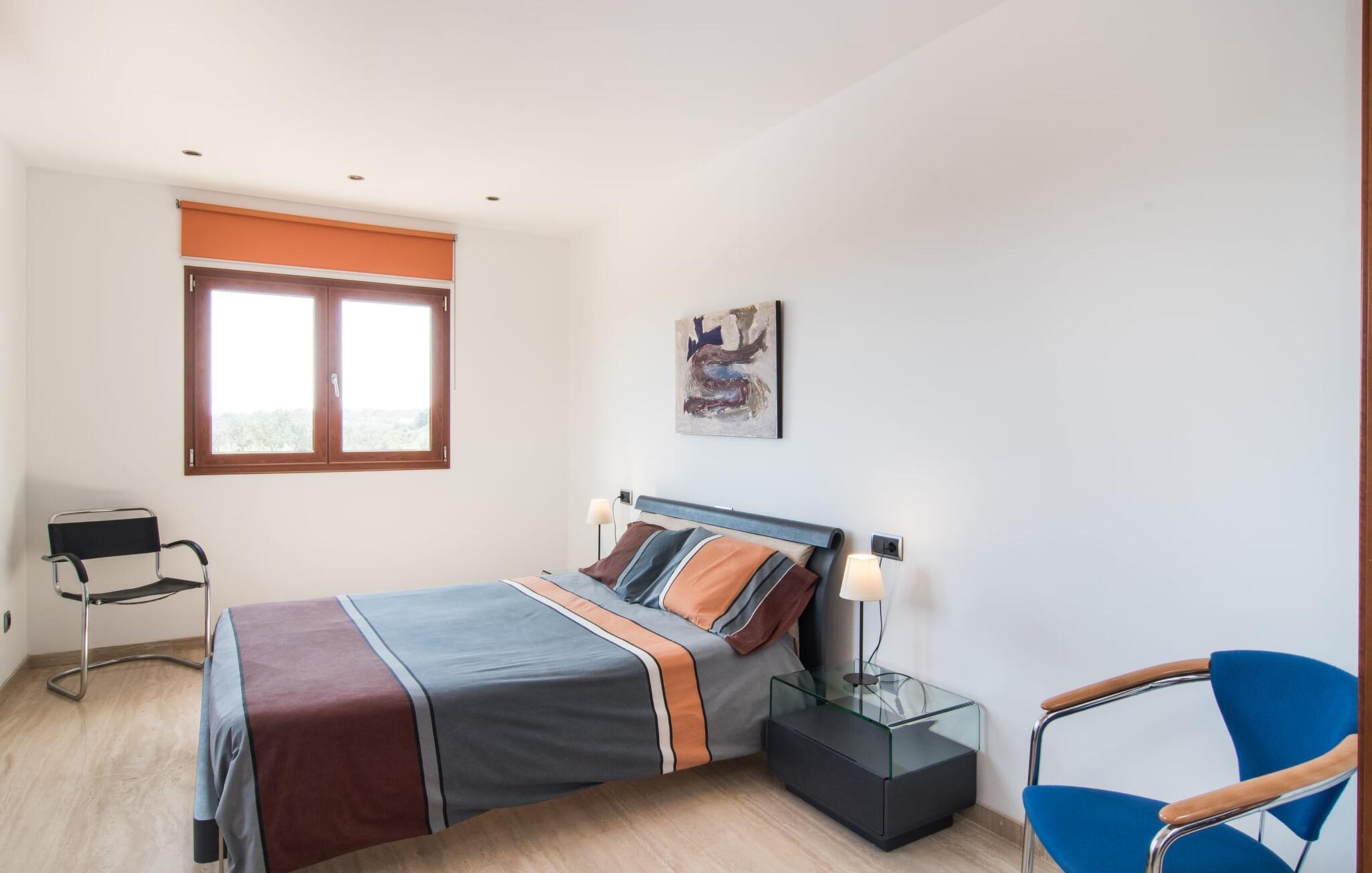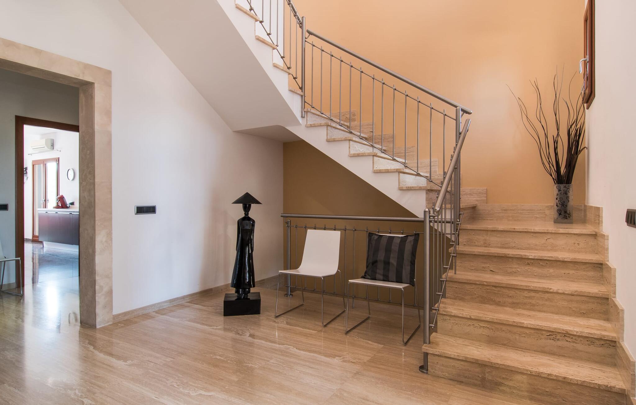 Villaen “Can Bou” byder sine gæster velkommen midt i den fantastiske mallorcanske natur, nær Colonia de Sant Jordi, og er særligt bemærkelsesværdig ved første øjekast på grund af sin høje beliggenhed i kombination med et usædvanligt smukt udendørsområde. Frodige palmer og andre middelhavsplanter, velholdte græsplæner og terrasser samt maleriske stier præger haven. Der er endda en lille, dekorativ dam. Udendørsområdets gennemarbejdede design tilbyder en række muligheder for et behageligt ophold. Den store pool med en imponerende længde på 11 meter er særligt attraktiv. Poolområdet er flisebelagt med blå mosaiksten og er let tilgængeligt via trapper. Komfortable liggestole venter gæster til omfattende solbadning. Verandagyngen pryder kun billederne og fås ikke længere. Ikke desto mindre har I fra dette sted i umiddelbar nærhed af poolen et godt udsyn og kan holde øje med børnene, der plasker rundt i vandet. Her kan I slappe af og nyde en kølig drink eller bare lade verden gå forbi. De rummelige, delvist overdækkede terrasser på huset er kun 10 trin adskilt fra dette niveau. I kan enten trække jer tilbage et stykke tid på forskellige siddemuligheder eller måske mødes i en venlig atmosfære, for eksempel for at nyde et måltid sammen. Den høje beliggenhed gør dette område til et eksklusivt udsigtspunkt, hvorfra I kan nyde en forfriskende morgenmad eller en kulinarisk grill på en helt speciel og unik måde. Lad jeres dag begynde og slutte her, som I vil, ledsaget af en betagende udsigt over haven. Og særligt praktisk: jeres lejebil står altid i skyggen i garagen. Et lysfyldt interiør med rummelige værelser, smagfuld indretning og materialer af høj kvalitet skaber en usædvanlig æstetisk stemning, der straks giver jer lyst til at blive hængende. En åben stue/alrum udgør kernen i huset og byder på indendørs ophold på højt niveau. Lyse møbler og materialer er blevet dygtigt kombineret med kontrasterende farver for at skabe en diskret, men alligevel imponerende helhed. Stenvæggen i stuen er et absolut blikfang, der dygtigt tiltrækker jeres opmærksomhed. Det store fjernsyn med satellitforbindelse og musikanlægget er også ideelt installeret her. Det betyder, at I kan slappe af her på den super komfortable sofa under de bedste forhold, og når I har lyst. Hele gruppen kan nyde sofistikeret indendørs spisning sammen ved det elegante spisebord, som giver frit udsyn til terrassen og videre. Et stilfuldt køkken byder på alt, hvad I har brug for hver dag, med eksklusiv indretning og udstyr. Disse omfatter blandt andet en kedel og en filterkaffemaskine, som I kan tilberede jeres første aromakop om morgenen med, lige som I har lyst. Der er masser af opbevarings- og arbejdsplads, samt et attraktivt farveskema og et lille område til endnu et spisebord. Moderne, individuelt designede værelser tilbyder en indbydende ramme for afslappende nætter. Der er i alt to senge, der måler 1,50 x 2,00 m og fire senge, der måler 1,00 x 2,00 m. Der er også plads til to små gæster. For jeres komfort er myggenet tilgængelige i huset og kan bruges om nødvendigt. De tre badeværelser, hvoraf to er en-suite, imponerer med deres meget moderne design. Et strygejern og tre hårtørrere er også tilgængelige i huset og skal ikke medbringes hjemmefra. Villa "Can Bou" er et ideelt udgangspunkt for ø-udforskning af alle slags og i alle retninger. Forskellige attraktive strande kan hurtigt nås med jeres lejebil. En række forskellige vandsportsmuligheder kan bookes gennem lokale udbydere. Landskabet omkring Colonia de Sant Jordi er præget af talrige saltpander. Fyrtårnet ved Cap des Ses Salines er et godt udgangspunkt for vandreture. I Ses Salines finder I et farverigt ugentligt marked hver torsdag og flere gode restauranter med en imødekommende atmosfære. Et lille insidertip ville være at prøve restauranten "Espinaret", som ligger meget tæt på villaen. Den betagende villa "Can Bou" ligger i en attraktiv landlig beliggenhed, kun 4 km nordøst for kystbyen Colonia de Sant Jordi. Denne tidligere fiskerby har to smukke sandstrande, den nordlige er den berømte naturlige strand Es Trenc. En tur til det smukke havneområde der bør bestemt ikke mangle i jeres ferieplanlægning. I kan gå fra hotelområdet til havnen via gangbroer og stier, der strækker sig langs klippekysten.