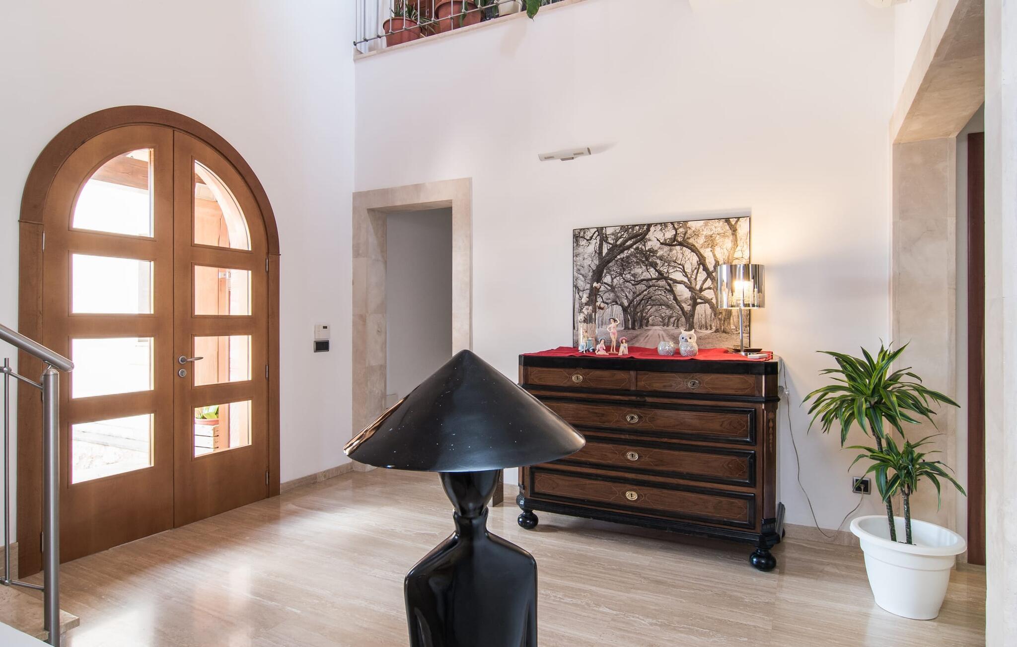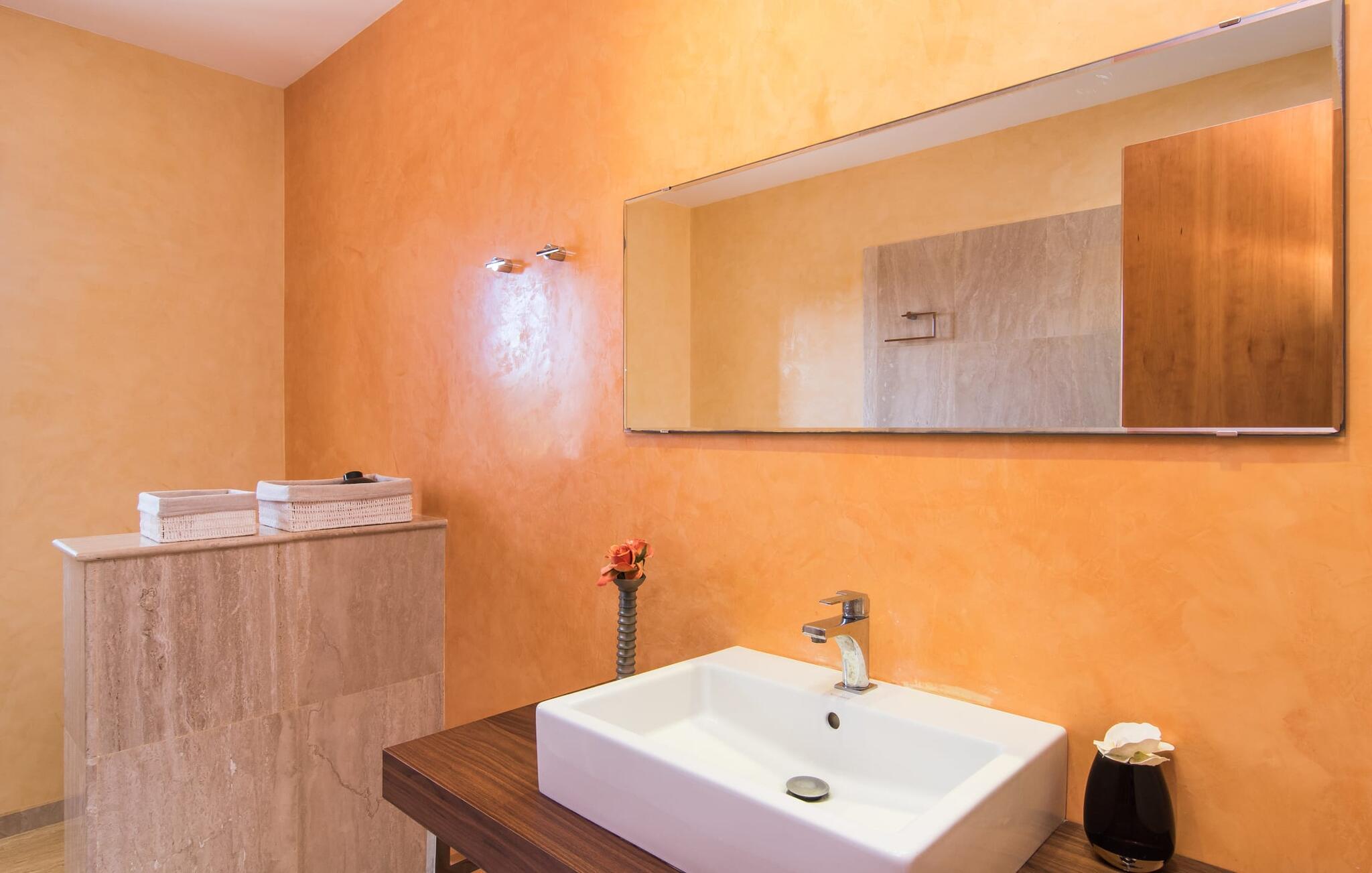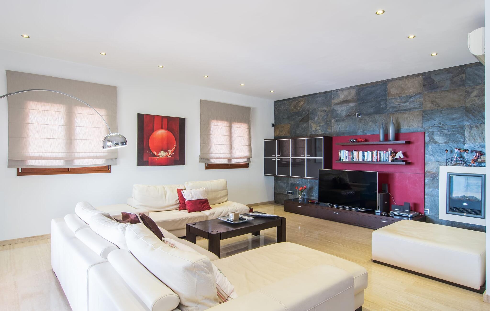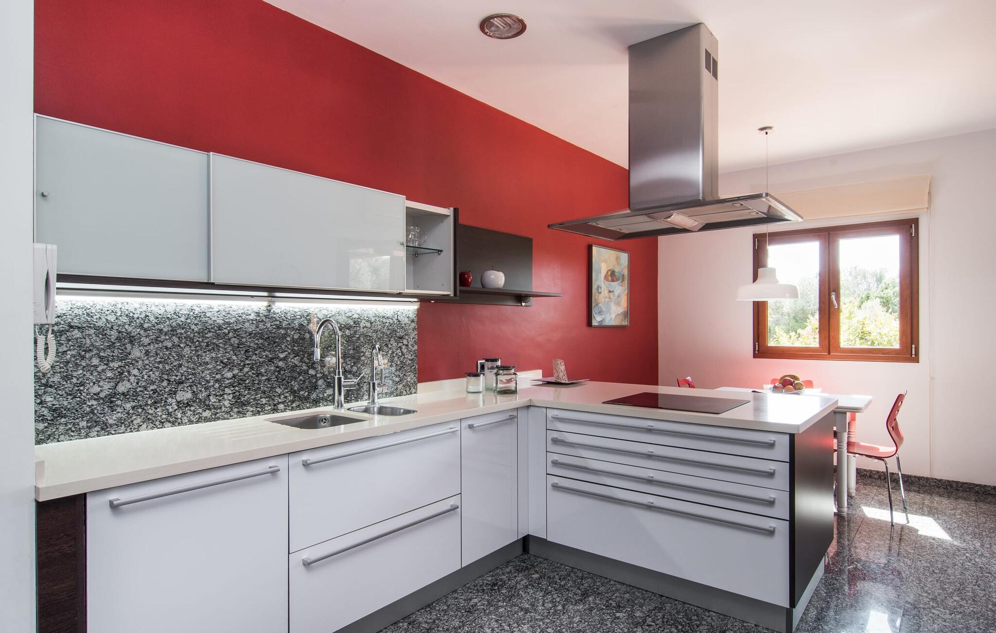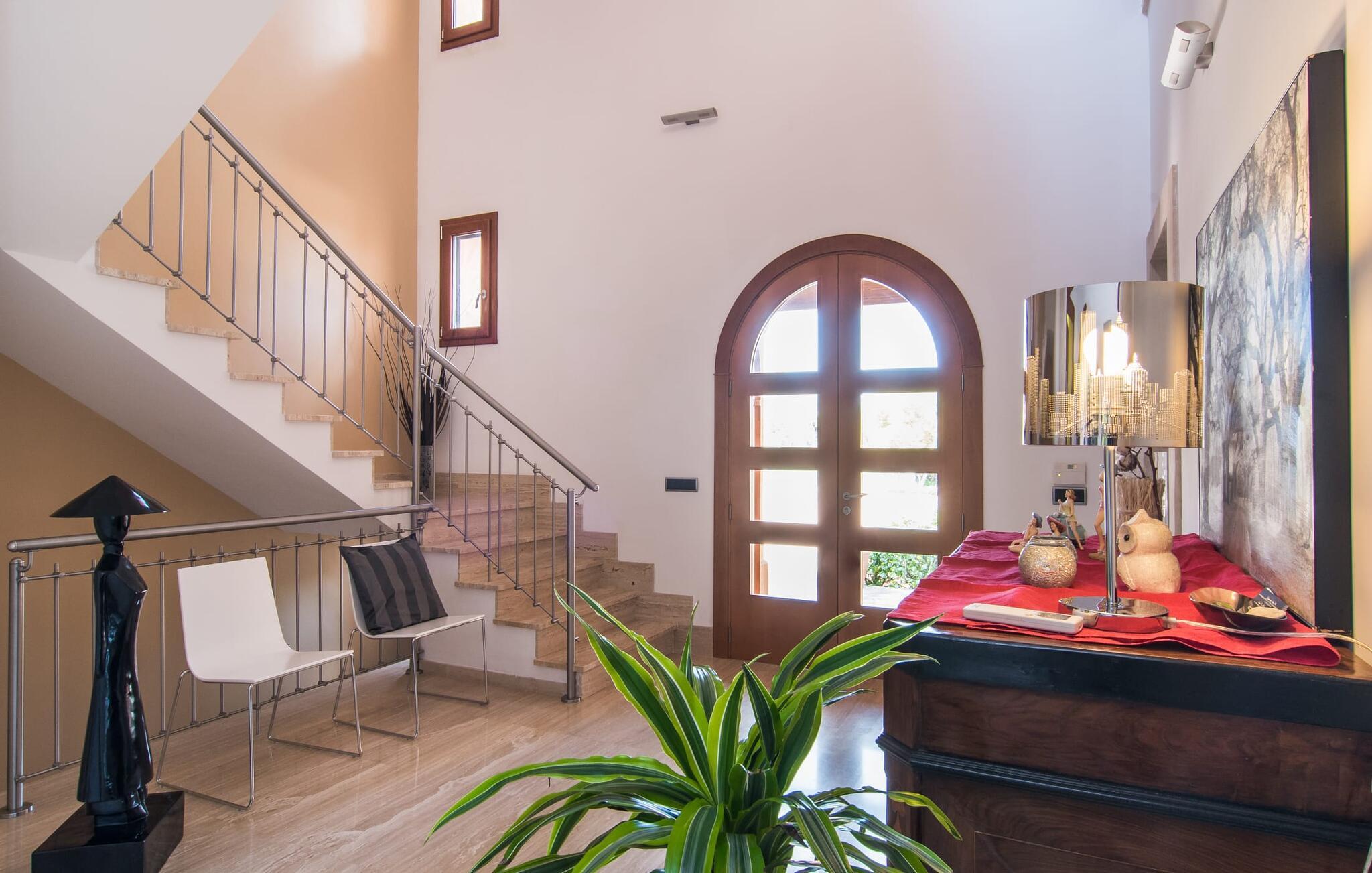 Villaen “Can Bou” byder sine gæster velkommen midt i den fantastiske mallorcanske natur, nær Colonia de Sant Jordi, og er særligt bemærkelsesværdig ved første øjekast på grund af sin høje beliggenhed i kombination med et usædvanligt smukt udendørsområde. Frodige palmer og andre middelhavsplanter, velholdte græsplæner og terrasser samt maleriske stier præger haven. Der er endda en lille, dekorativ dam. Udendørsområdets gennemarbejdede design tilbyder en række muligheder for et behageligt ophold. Den store pool med en imponerende længde på 11 meter er særligt attraktiv. Poolområdet er flisebelagt med blå mosaiksten og er let tilgængeligt via trapper. Komfortable liggestole venter gæster til omfattende solbadning. Verandagyngen pryder kun billederne og fås ikke længere. Ikke desto mindre har I fra dette sted i umiddelbar nærhed af poolen et godt udsyn og kan holde øje med børnene, der plasker rundt i vandet. Her kan I slappe af og nyde en kølig drink eller bare lade verden gå forbi. De rummelige, delvist overdækkede terrasser på huset er kun 10 trin adskilt fra dette niveau. I kan enten trække jer tilbage et stykke tid på forskellige siddemuligheder eller måske mødes i en venlig atmosfære, for eksempel for at nyde et måltid sammen. Den høje beliggenhed gør dette område til et eksklusivt udsigtspunkt, hvorfra I kan nyde en forfriskende morgenmad eller en kulinarisk grill på en helt speciel og unik måde. Lad jeres dag begynde og slutte her, som I vil, ledsaget af en betagende udsigt over haven. Og særligt praktisk: jeres lejebil står altid i skyggen i garagen. Et lysfyldt interiør med rummelige værelser, smagfuld indretning og materialer af høj kvalitet skaber en usædvanlig æstetisk stemning, der straks giver jer lyst til at blive hængende. En åben stue/alrum udgør kernen i huset og byder på indendørs ophold på højt niveau. Lyse møbler og materialer er blevet dygtigt kombineret med kontrasterende farver for at skabe en diskret, men alligevel imponerende helhed. Stenvæggen i stuen er et absolut blikfang, der dygtigt tiltrækker jeres opmærksomhed. Det store fjernsyn med satellitforbindelse og musikanlægget er også ideelt installeret her. Det betyder, at I kan slappe af her på den super komfortable sofa under de bedste forhold, og når I har lyst. Hele gruppen kan nyde sofistikeret indendørs spisning sammen ved det elegante spisebord, som giver frit udsyn til terrassen og videre. Et stilfuldt køkken byder på alt, hvad I har brug for hver dag, med eksklusiv indretning og udstyr. Disse omfatter blandt andet en kedel og en filterkaffemaskine, som I kan tilberede jeres første aromakop om morgenen med, lige som I har lyst. Der er masser af opbevarings- og arbejdsplads, samt et attraktivt farveskema og et lille område til endnu et spisebord. Moderne, individuelt designede værelser tilbyder en indbydende ramme for afslappende nætter. Der er i alt to senge, der måler 1,50 x 2,00 m og fire senge, der måler 1,00 x 2,00 m. Der er også plads til to små gæster. For jeres komfort er myggenet tilgængelige i huset og kan bruges om nødvendigt. De tre badeværelser, hvoraf to er en-suite, imponerer med deres meget moderne design. Et strygejern og tre hårtørrere er også tilgængelige i huset og skal ikke medbringes hjemmefra. Villa "Can Bou" er et ideelt udgangspunkt for ø-udforskning af alle slags og i alle retninger. Forskellige attraktive strande kan hurtigt nås med jeres lejebil. En række forskellige vandsportsmuligheder kan bookes gennem lokale udbydere. Landskabet omkring Colonia de Sant Jordi er præget af talrige saltpander. Fyrtårnet ved Cap des Ses Salines er et godt udgangspunkt for vandreture. I Ses Salines finder I et farverigt ugentligt marked hver torsdag og flere gode restauranter med en imødekommende atmosfære. Et lille insidertip ville være at prøve restauranten "Espinaret", som ligger meget tæt på villaen. Den betagende villa "Can Bou" ligger i en attraktiv landlig beliggenhed, kun 4 km nordøst for kystbyen Colonia de Sant Jordi. Denne tidligere fiskerby har to smukke sandstrande, den nordlige er den berømte naturlige strand Es Trenc. En tur til det smukke havneområde der bør bestemt ikke mangle i jeres ferieplanlægning. I kan gå fra hotelområdet til havnen via gangbroer og stier, der strækker sig langs klippekysten.