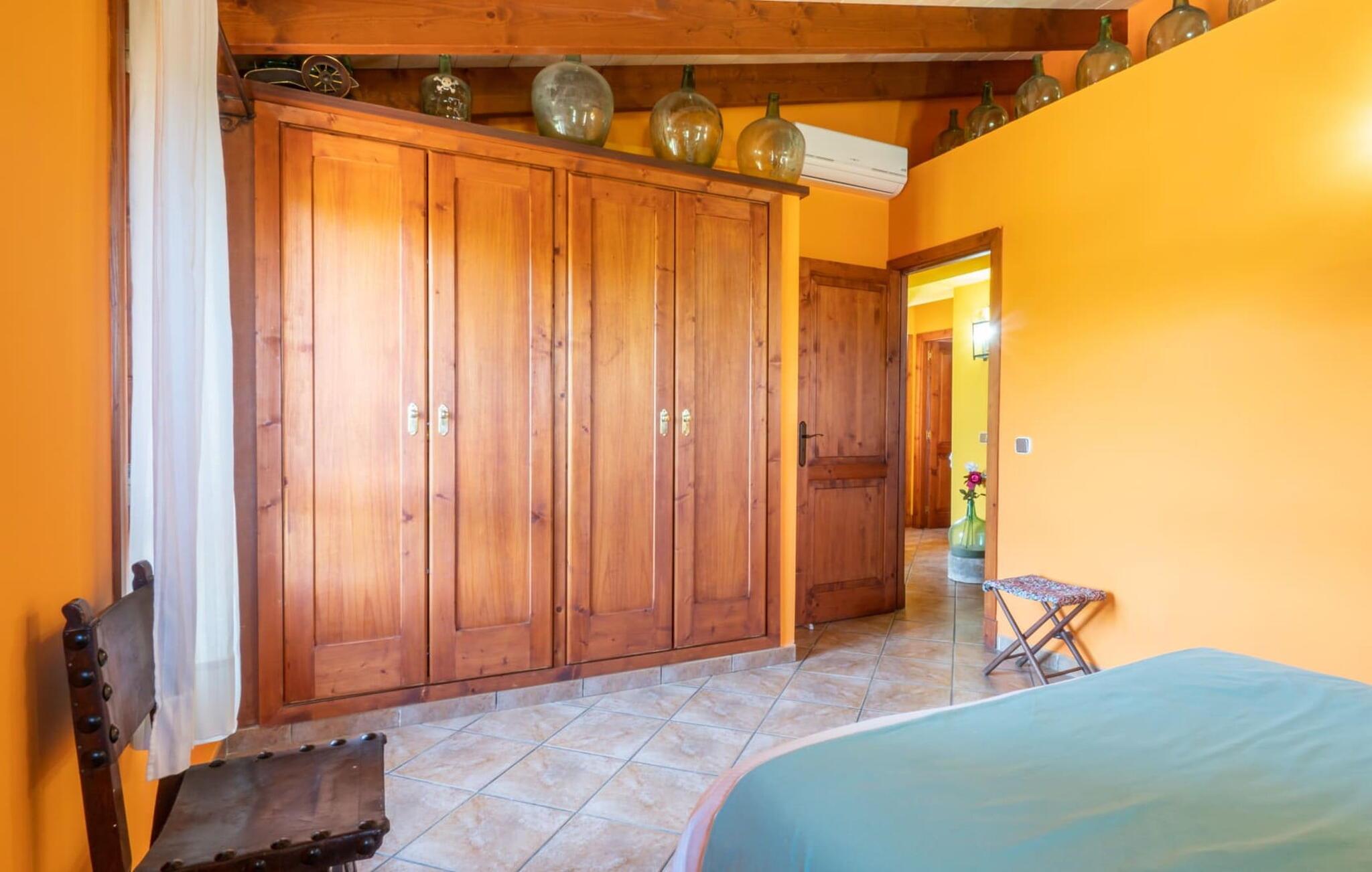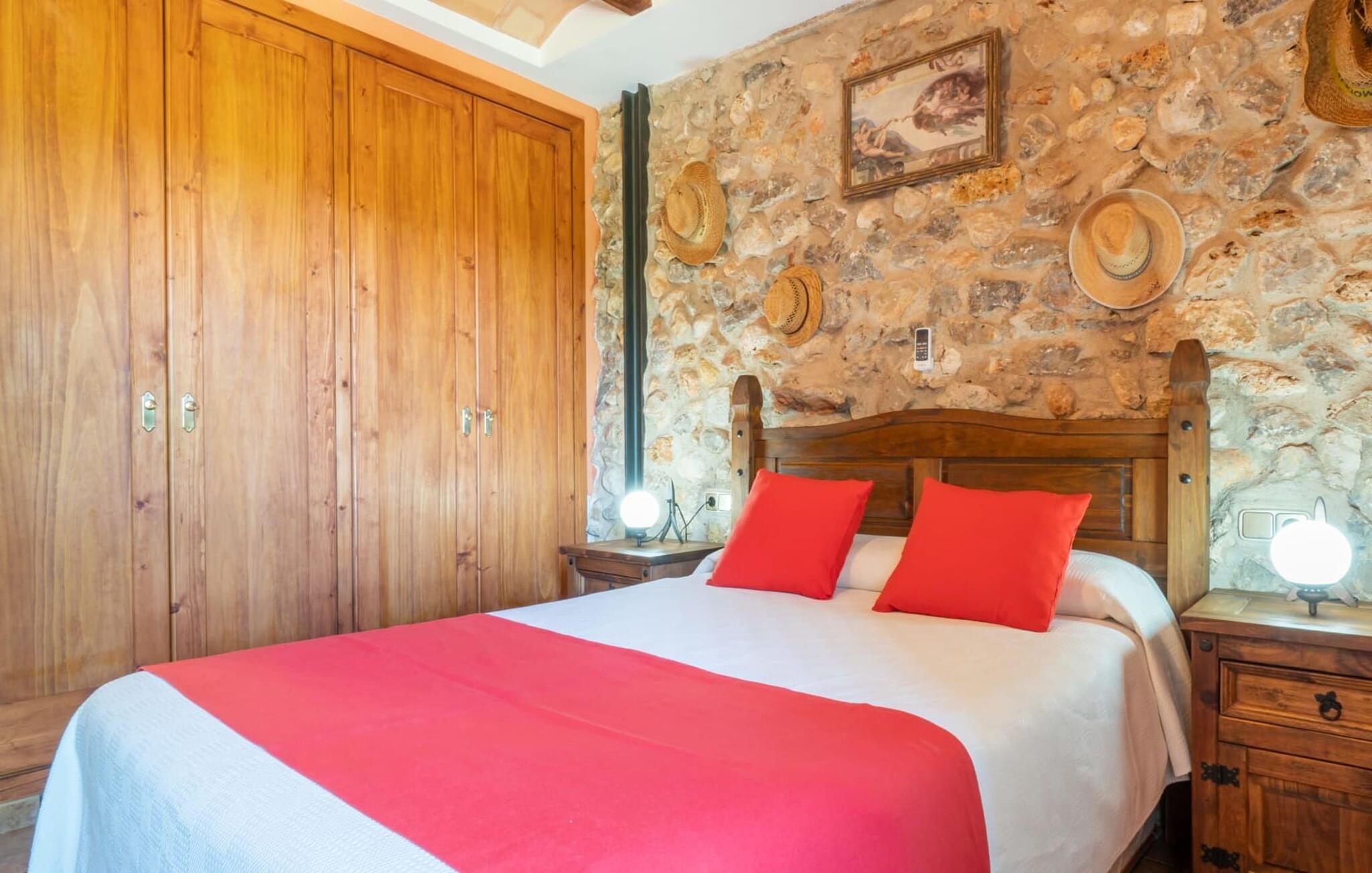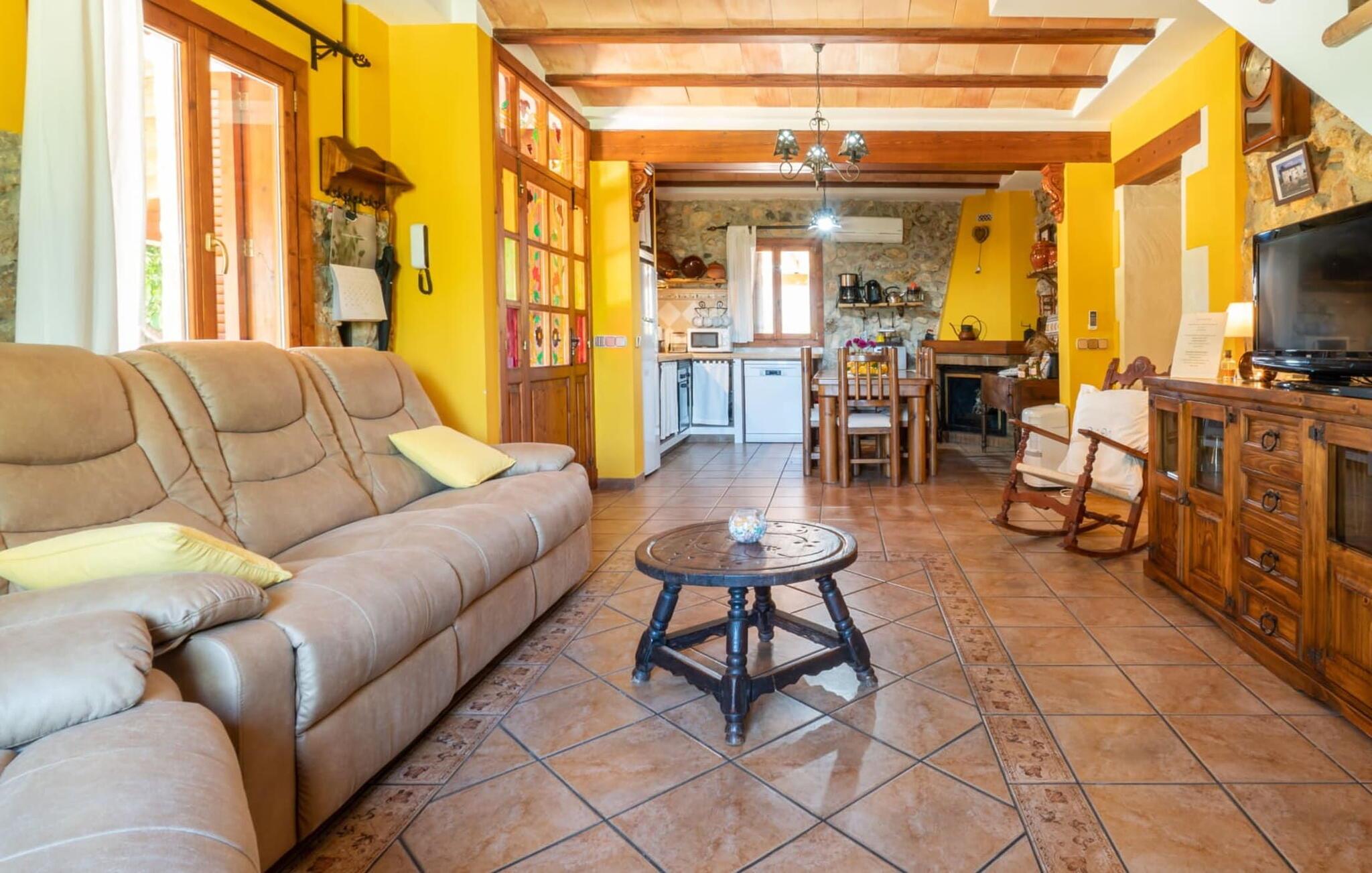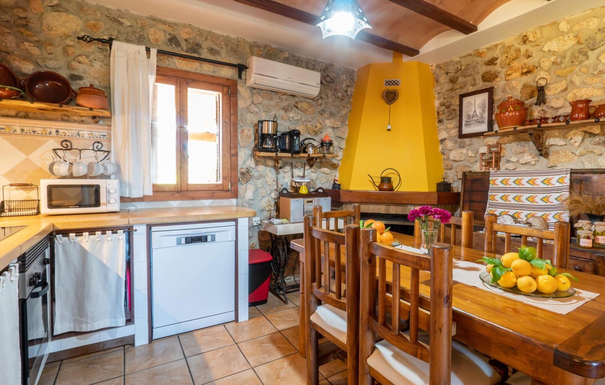Ejendommen kan trædes ind gennem store døre fra forskellige sider. I alt har det tre soveværelser med dobbeltsenge og tre badeværelser. Derudover står det fuldt udstyrede køkken til jeres rådighed. Takket være dens rustikke charme, vil I ikke være i stand til at modstå at prøve opskrifter, suse rundt i køkkenet og fylde hele huset med de mest appetitlige dufte! Der er også en vaskemaskine og en opvaskemaskine til rådighed, så I nemt kan holde orden. Andre nøglefunktioner inkluderer et meget rummeligt opholdsområde, et fjernsyn, gratis WiFi til jeres bærbare computer (eller smartphone eller tablet), en cd/dvd-afspiller og en hyggelig pejs. Selve stuen imponerer med sine behagelige, venlige farver og træmøbler af høj kvalitet - her kan I slappe af i sofaen eller i gyngestolen og nyde jeres fritid i fulde drag. Trappen er forsynet med et sikkerhedsgitter.
