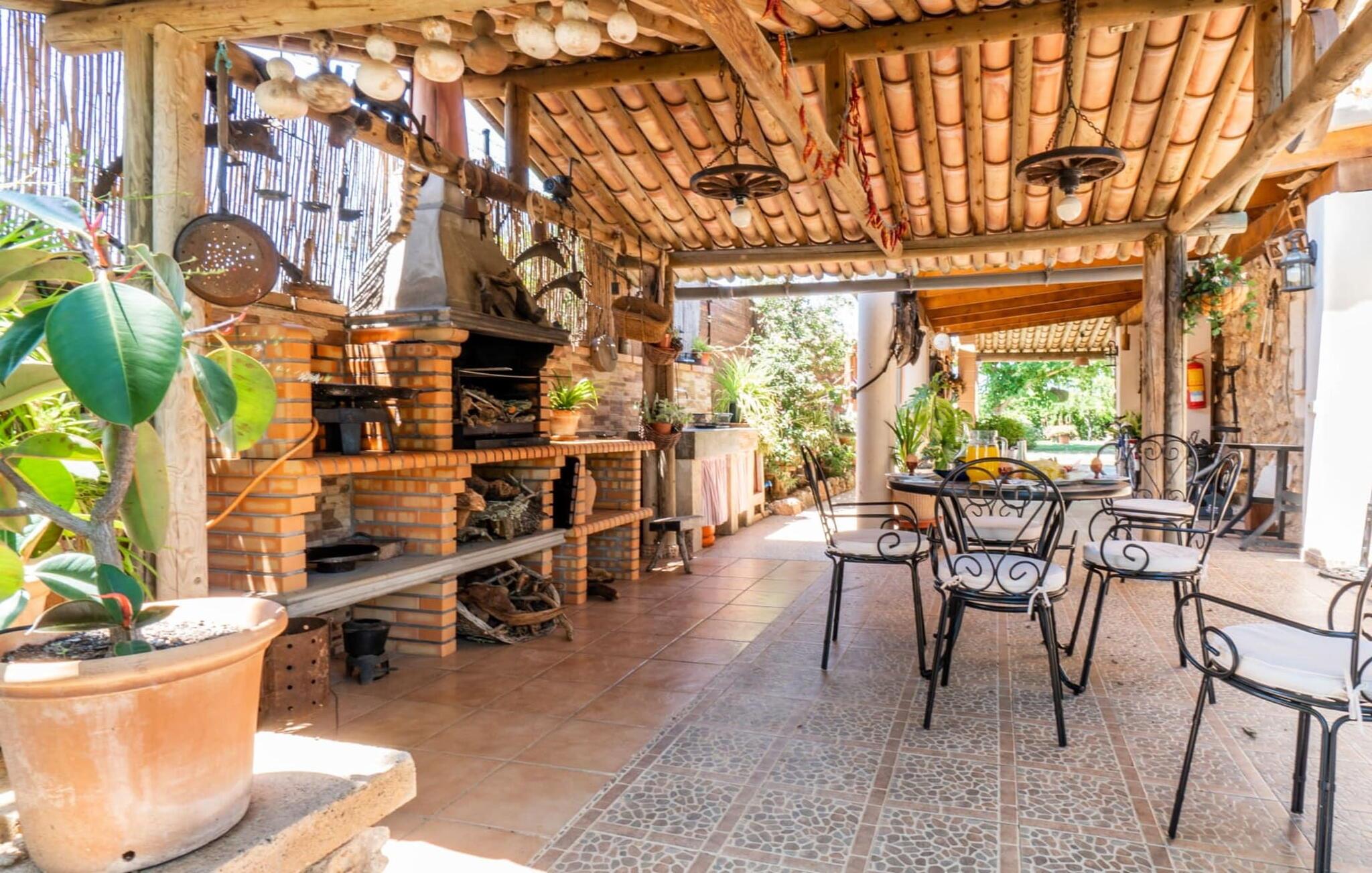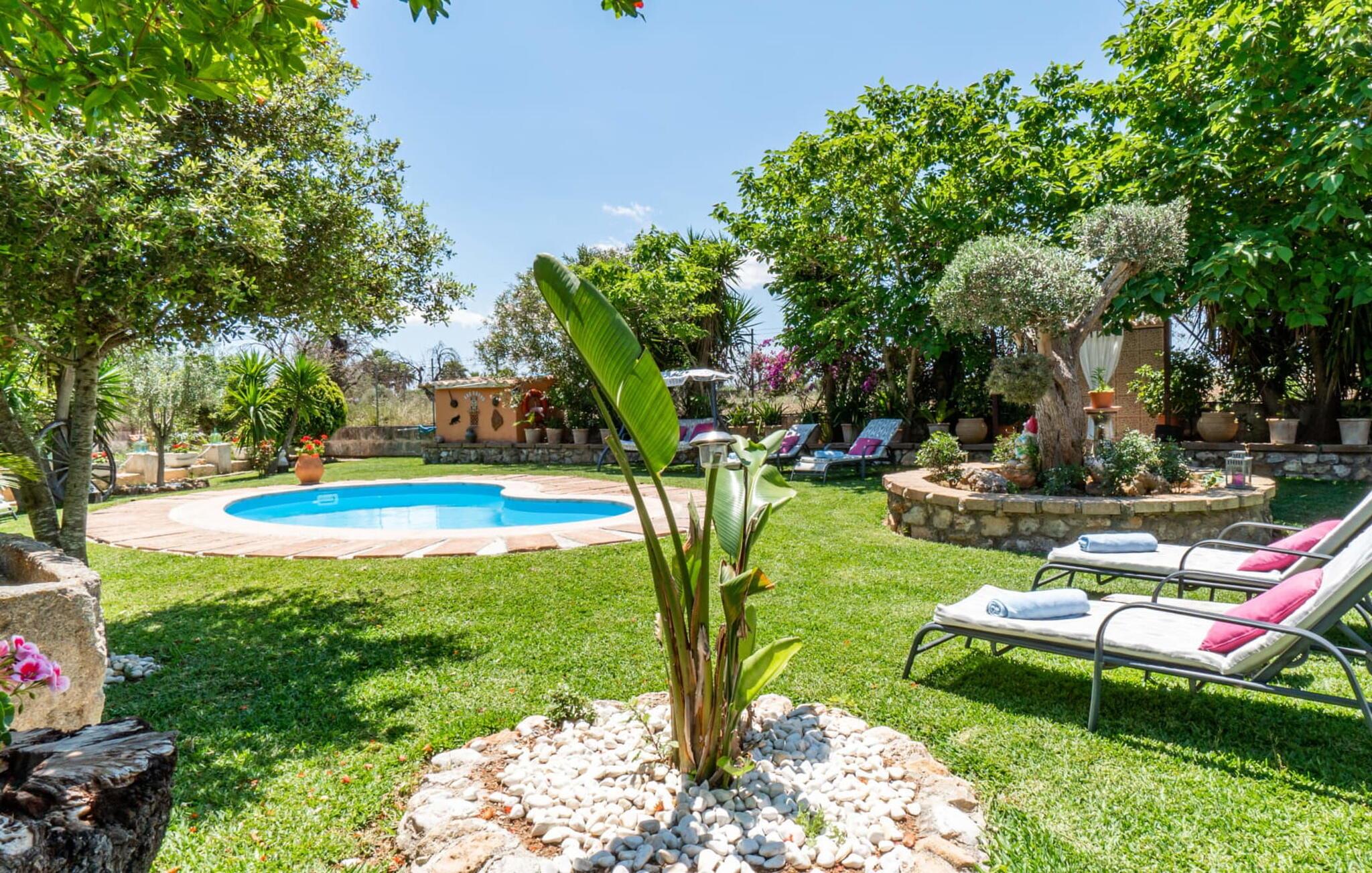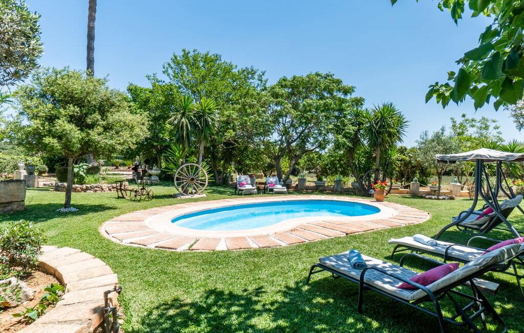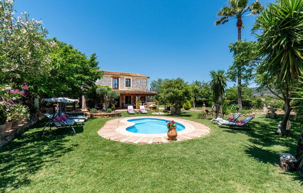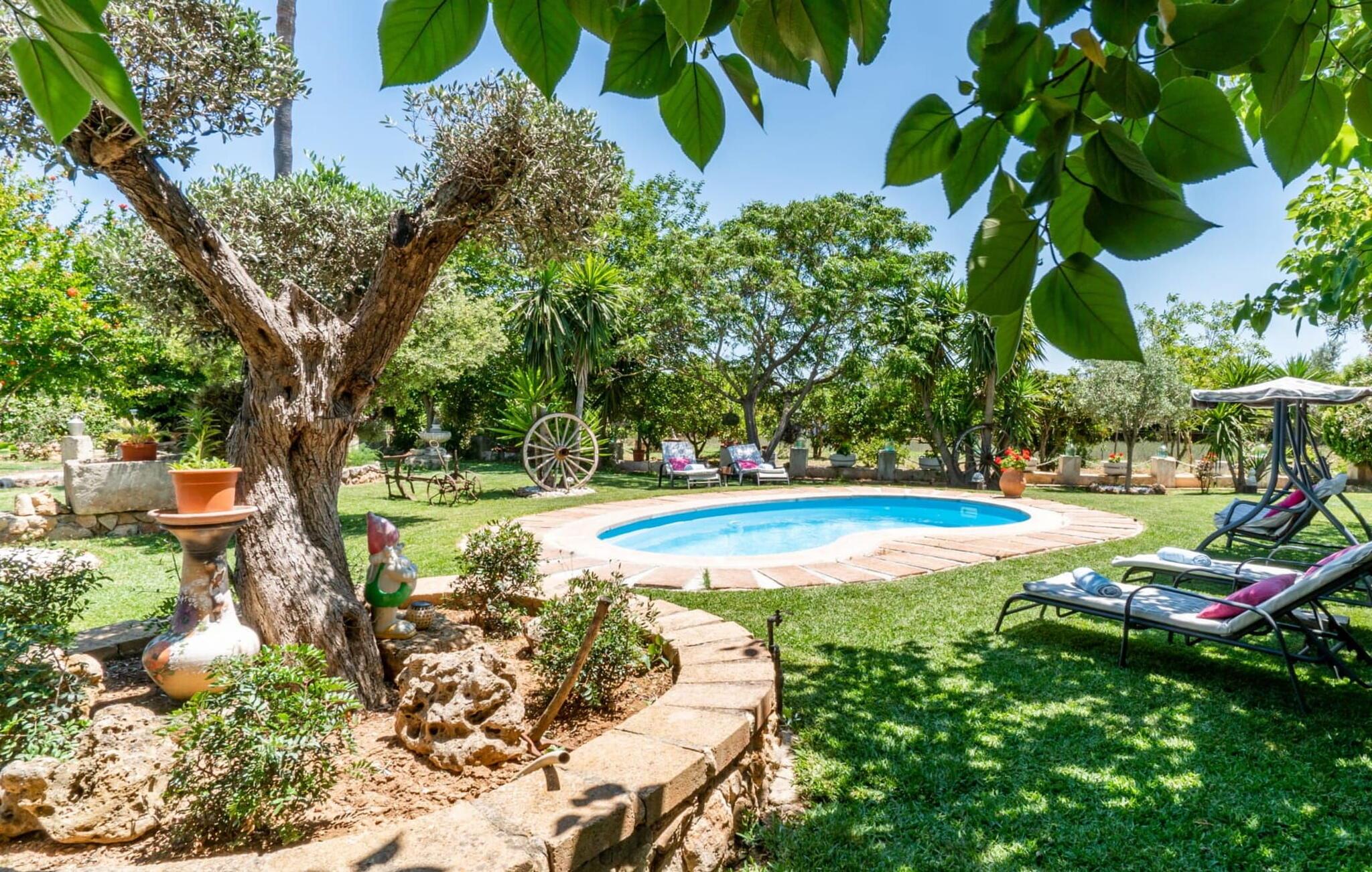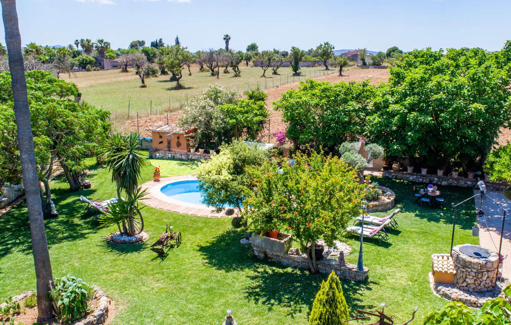 “Can Diego” ligger i vidunderlige landlige omgivelser, omgivet af frodig vegetation med en vidunderlig udsigt over Tramuntana-bjergene i den nordlige del af øen. For dens fod ligger den lille by Inca. Ejendommen er omgivet af en smuk, nærmest oaseagtig have med mange gamle træer. Lavendel vokser i det ene hjørne, et højt gammelt palmetræ i et andet; En guddommelig blanding af blomstrende planter og grønt rundt omkring, I vil helt sikkert nyde at udforske denne have! Hvis I leder efter steder at slappe af, har I et valg: det helt rigtige loungemøbel beskyttet af flere parasoller eller en rustik gyngestol. Terrasserne er delvist overdækkede og tilbyder derfor (udover træernes naturlige halvskygge) kølende skygge selv på de varme sommerdage. Denne unikke terrassekonstruktion fører til en forhøjet altan med fantastisk udsigt over husets bagside. Den racerformede pool garanterer sjov for hele familien. Derudover har en af terrasserne en fast monteret stengrill til fantastiske udendørs grill. Frisk fisk og lækkert kød kan købes på Incaens ugentlige marked. Kyllingerne, der bor på villaens ejendom, samt urte- og køkkenhaven fuldender den harmoniske, landlige karakter.