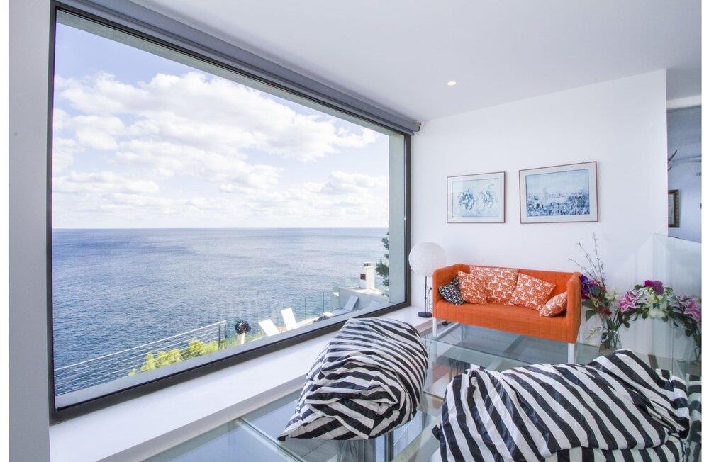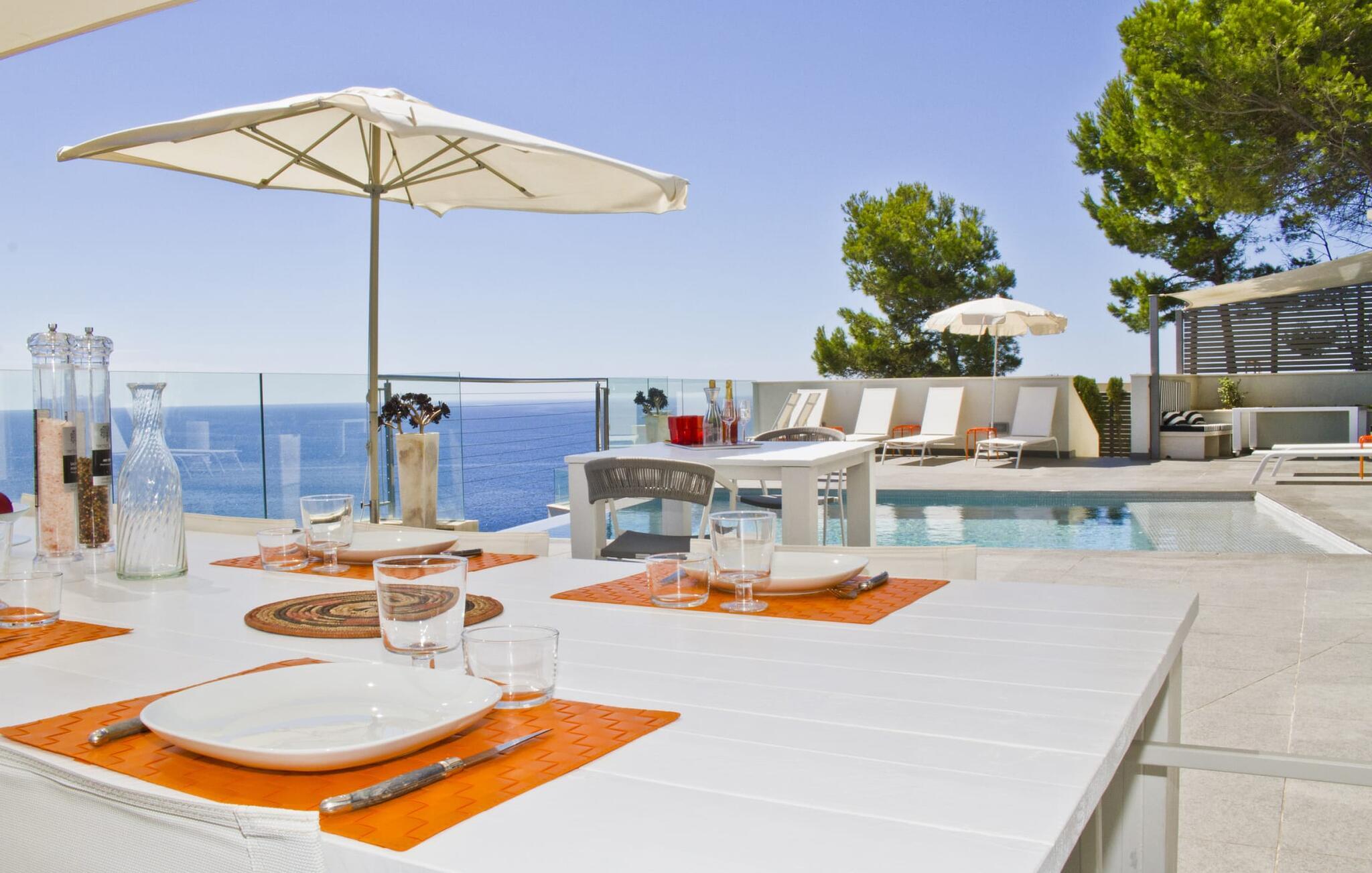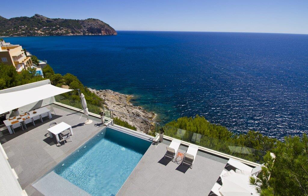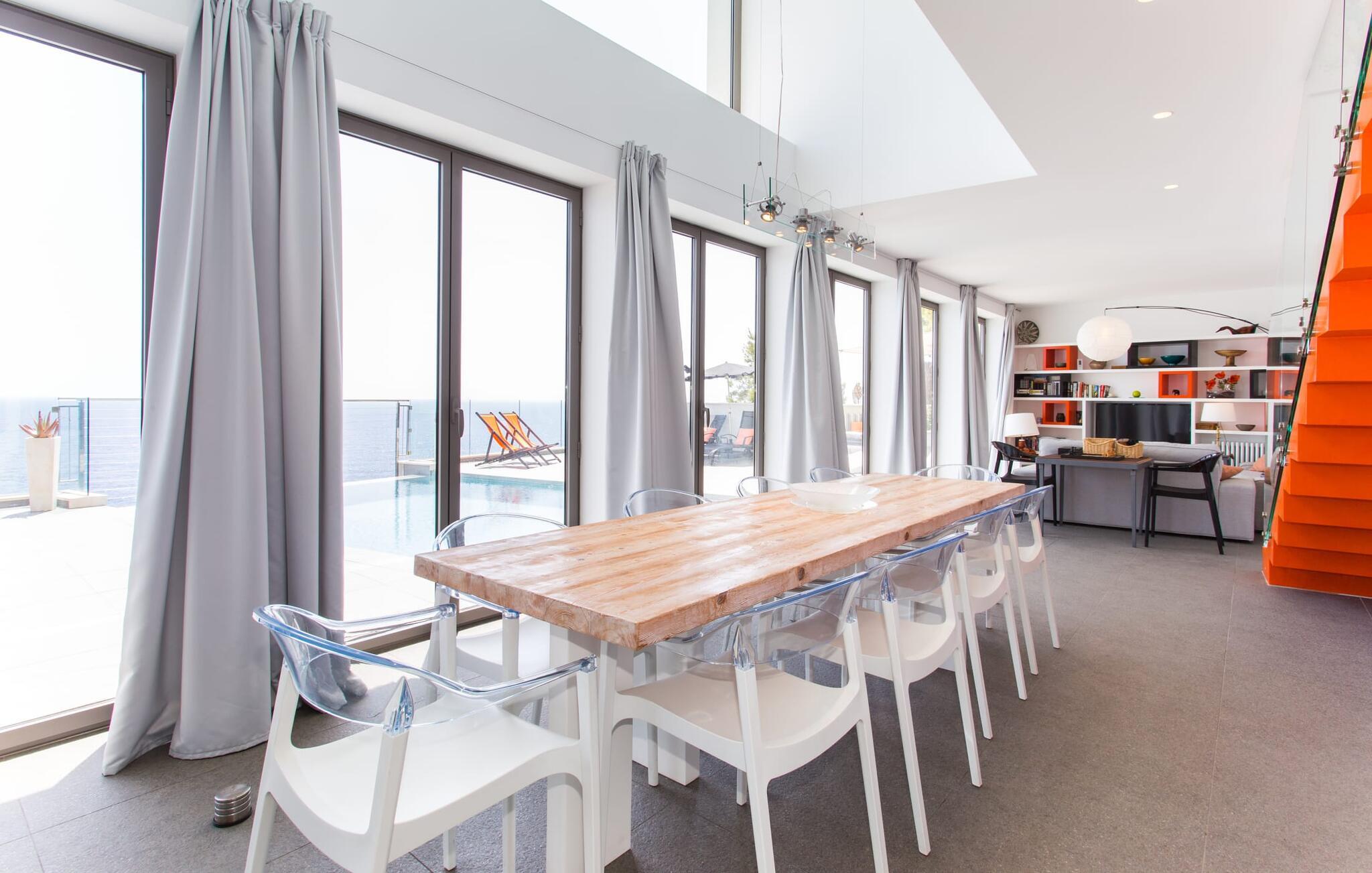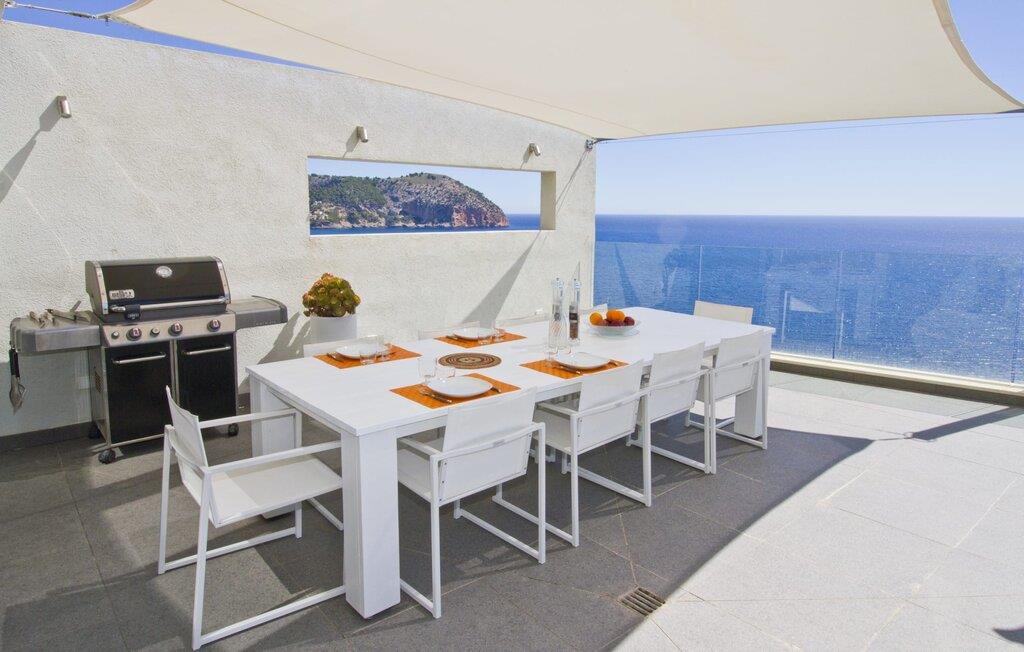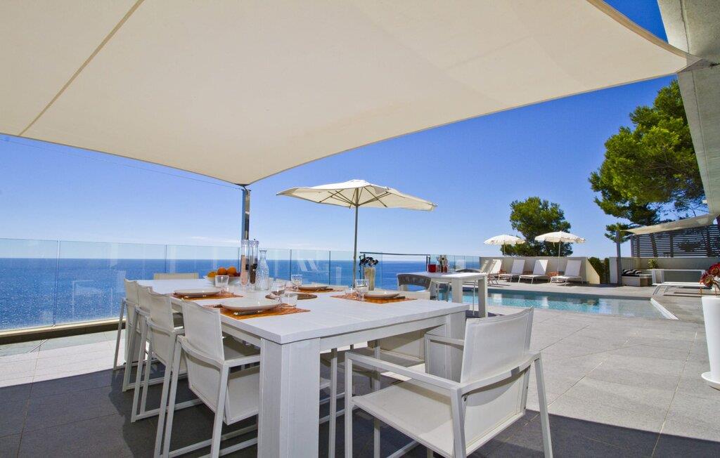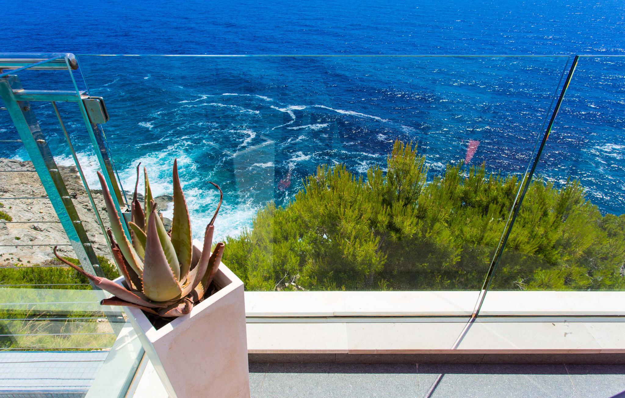 Villa "Can Ema" er en betagende luksusejendom på et klippefyldt plateau på Mallorcas østkyst. Denne arkitektonisk betagende villa vender mod sydøst og sikrer smukt solopgangslys og rigeligt solskin hele dagen. Den ekspansive terrasse med havudsigt har en infinity-pool, udendørs spiseplads og gasgrill, alt sammen bekvemt ved siden af det primære opholdsrum. Et skyggefuldt loungeområde er det perfekte sted at slappe af. Et andet højdepunkt er tagterrassen med liggestole, betagende havudsigt og spabad. Adgang til villaen er fra oven via en elevator, der transporterer gæster fra parkeringspladsen til den primære åben planløsning. Køkkenet er problemfrit integreret i spise- og opholdsområderne og byder på udsigt og nem adgang til poolterrassen gennem store glasskydedøre. Villaen har to dobbeltværelser med en-suite badeværelser og små terrasser med havudsigt, samt ekstra opholdsrum i kælderen med panoramavinduer og yderligere to soveværelser med dobbeltsenge. Alle soveområder har aircondition, og villaen er udstyret med varme, hvilket sikrer komfort hele året rundt for et behageligt ophold i Villa "Can Ema". Den absolut luksuriøse villa “Can Ema” ligger i udkanten af den rolige kystby Canyamel i en førsteklasses beliggenhed direkte ved havet og byder på en betagende 180 graders udsigt. Canyamel tilbyder flere meget gode restauranter og barer samt supermarkeder til daglige indkøb. Desuden kan I på få minutters kørsel nå middelalderbyen Artà og den travle havn Cala Ratjada.