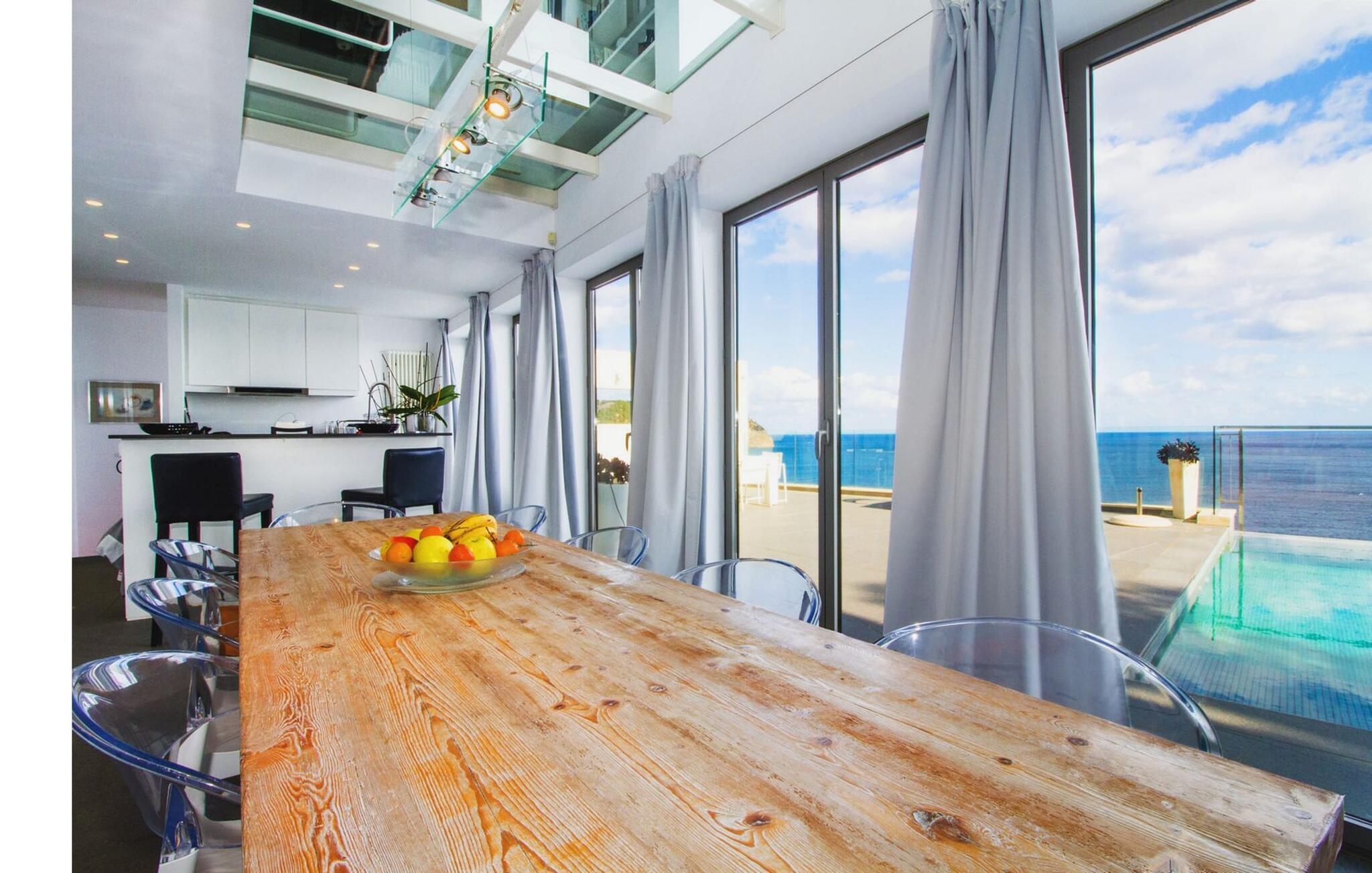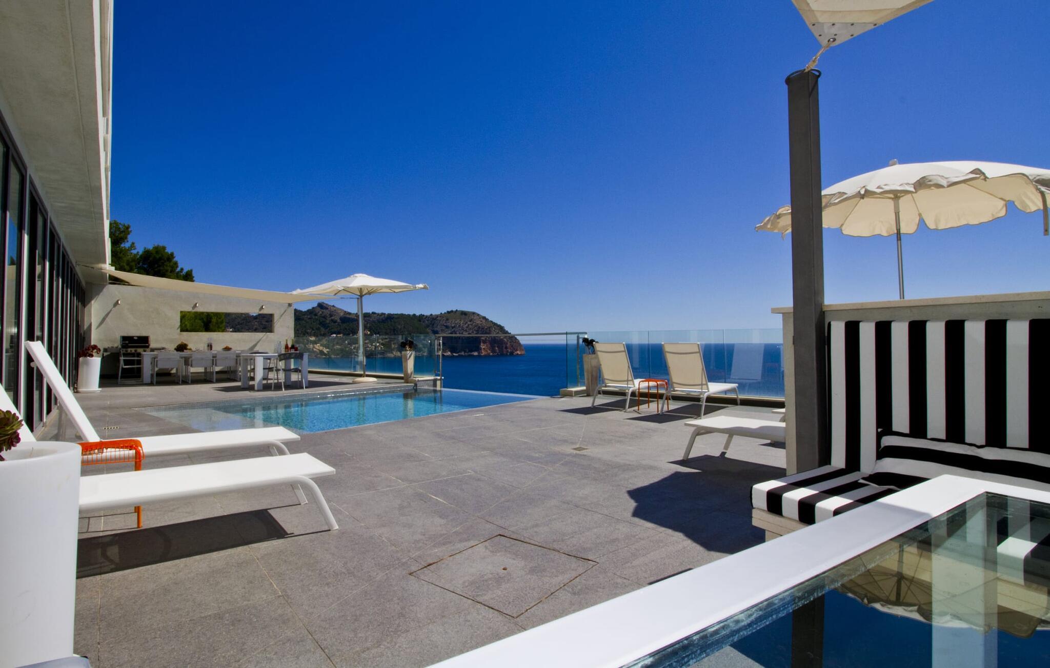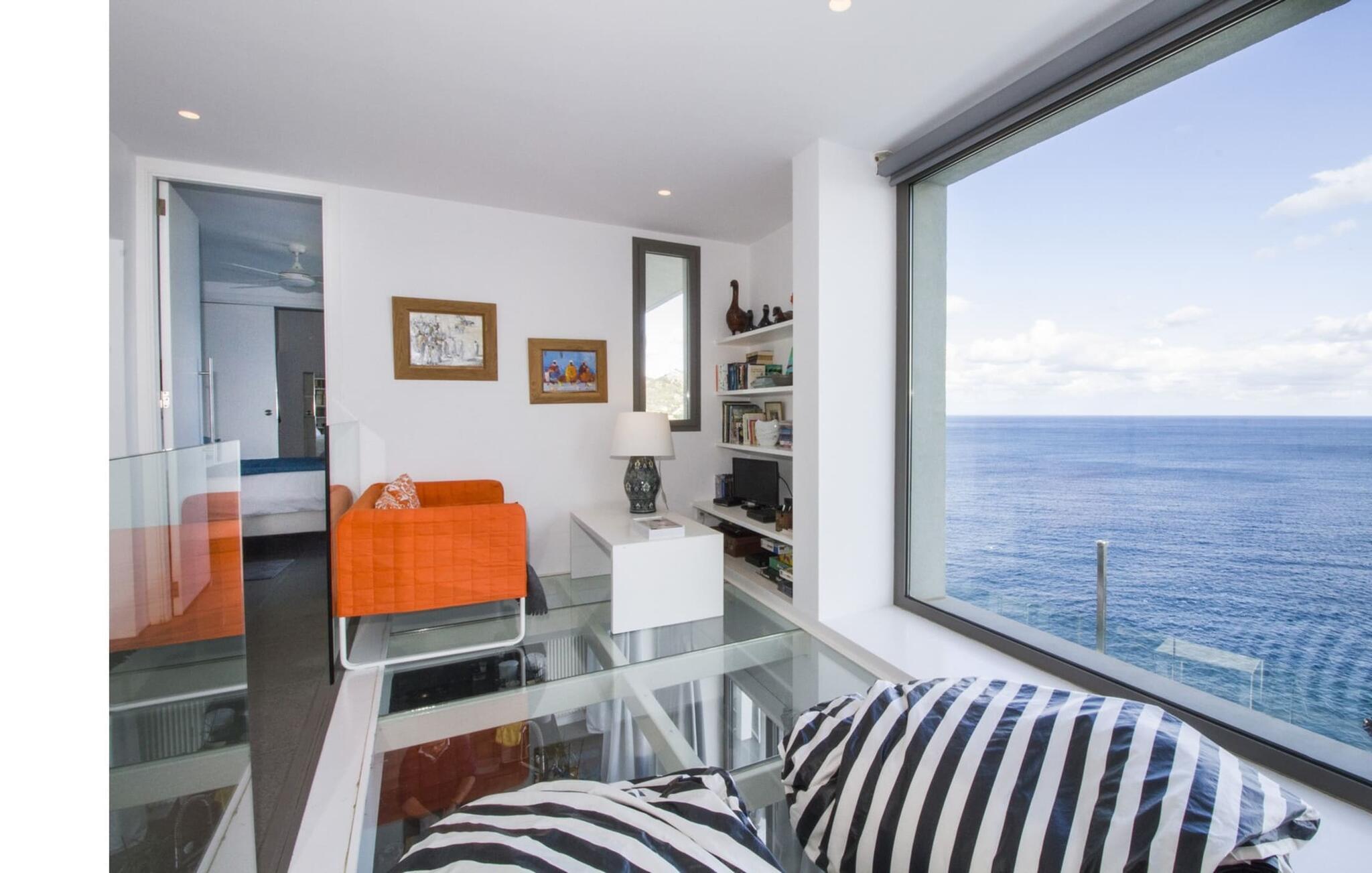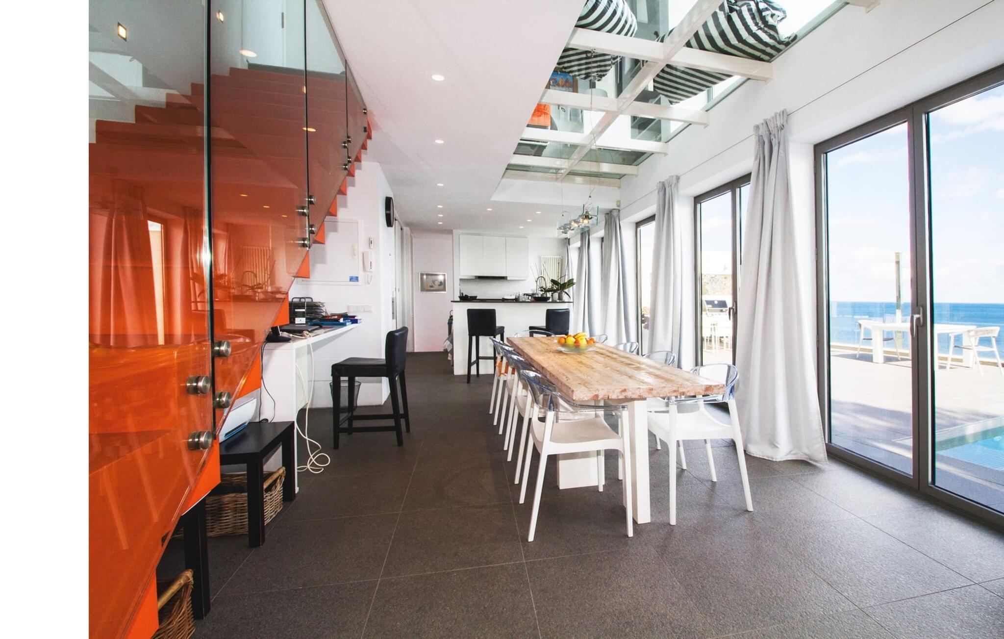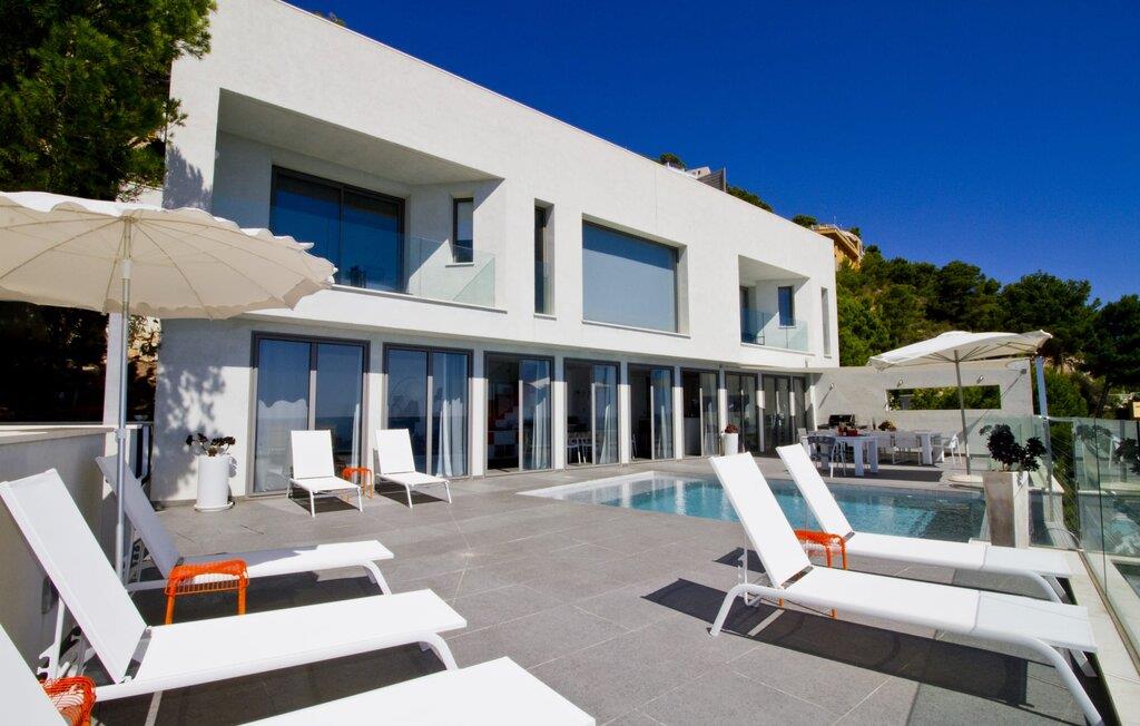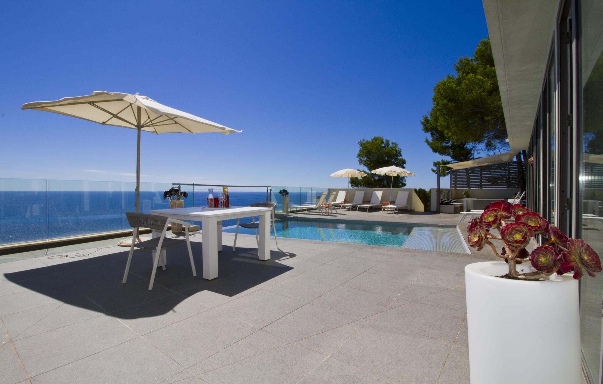 Villa "Can Ema" er en betagende luksusejendom på et klippefyldt plateau på Mallorcas østkyst. Denne arkitektonisk betagende villa vender mod sydøst og sikrer smukt solopgangslys og rigeligt solskin hele dagen. Den ekspansive terrasse med havudsigt har en infinity-pool, udendørs spiseplads og gasgrill, alt sammen bekvemt ved siden af det primære opholdsrum. Et skyggefuldt loungeområde er det perfekte sted at slappe af. Et andet højdepunkt er tagterrassen med liggestole, betagende havudsigt og spabad. Adgang til villaen er fra oven via en elevator, der transporterer gæster fra parkeringspladsen til den primære åben planløsning. Køkkenet er problemfrit integreret i spise- og opholdsområderne og byder på udsigt og nem adgang til poolterrassen gennem store glasskydedøre. Villaen har to dobbeltværelser med en-suite badeværelser og små terrasser med havudsigt, samt ekstra opholdsrum i kælderen med panoramavinduer og yderligere to soveværelser med dobbeltsenge. Alle soveområder har aircondition, og villaen er udstyret med varme, hvilket sikrer komfort hele året rundt for et behageligt ophold i Villa "Can Ema". Den absolut luksuriøse villa “Can Ema” ligger i udkanten af den rolige kystby Canyamel i en førsteklasses beliggenhed direkte ved havet og byder på en betagende 180 graders udsigt. Canyamel tilbyder flere meget gode restauranter og barer samt supermarkeder til daglige indkøb. Desuden kan I på få minutters kørsel nå middelalderbyen Artà og den travle havn Cala Ratjada.
