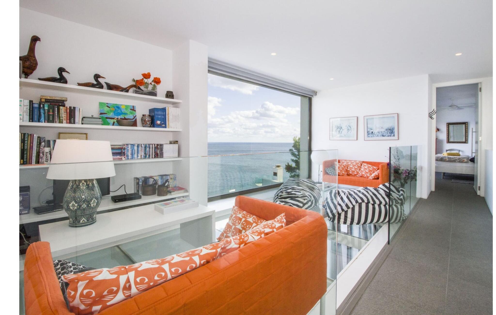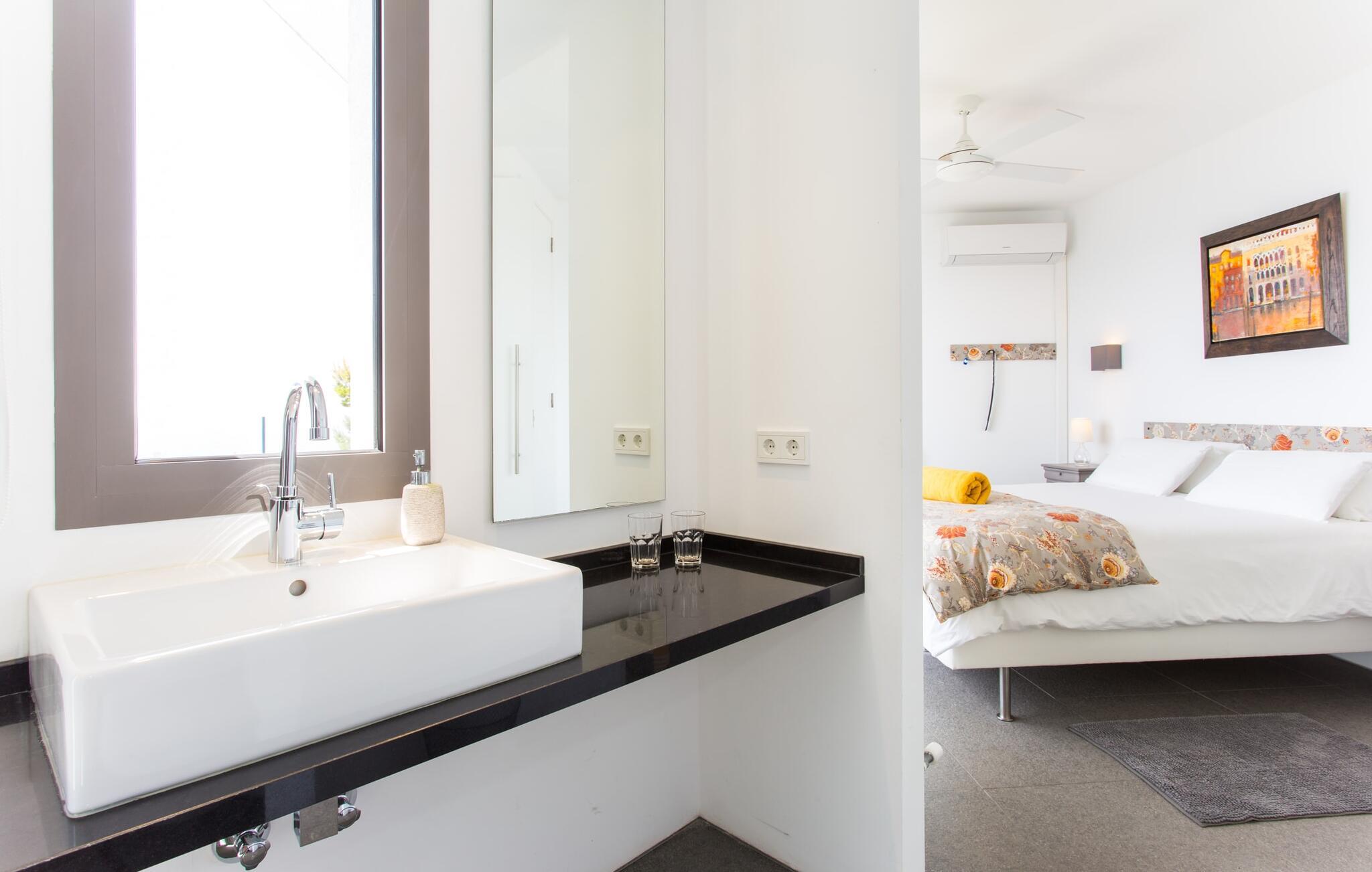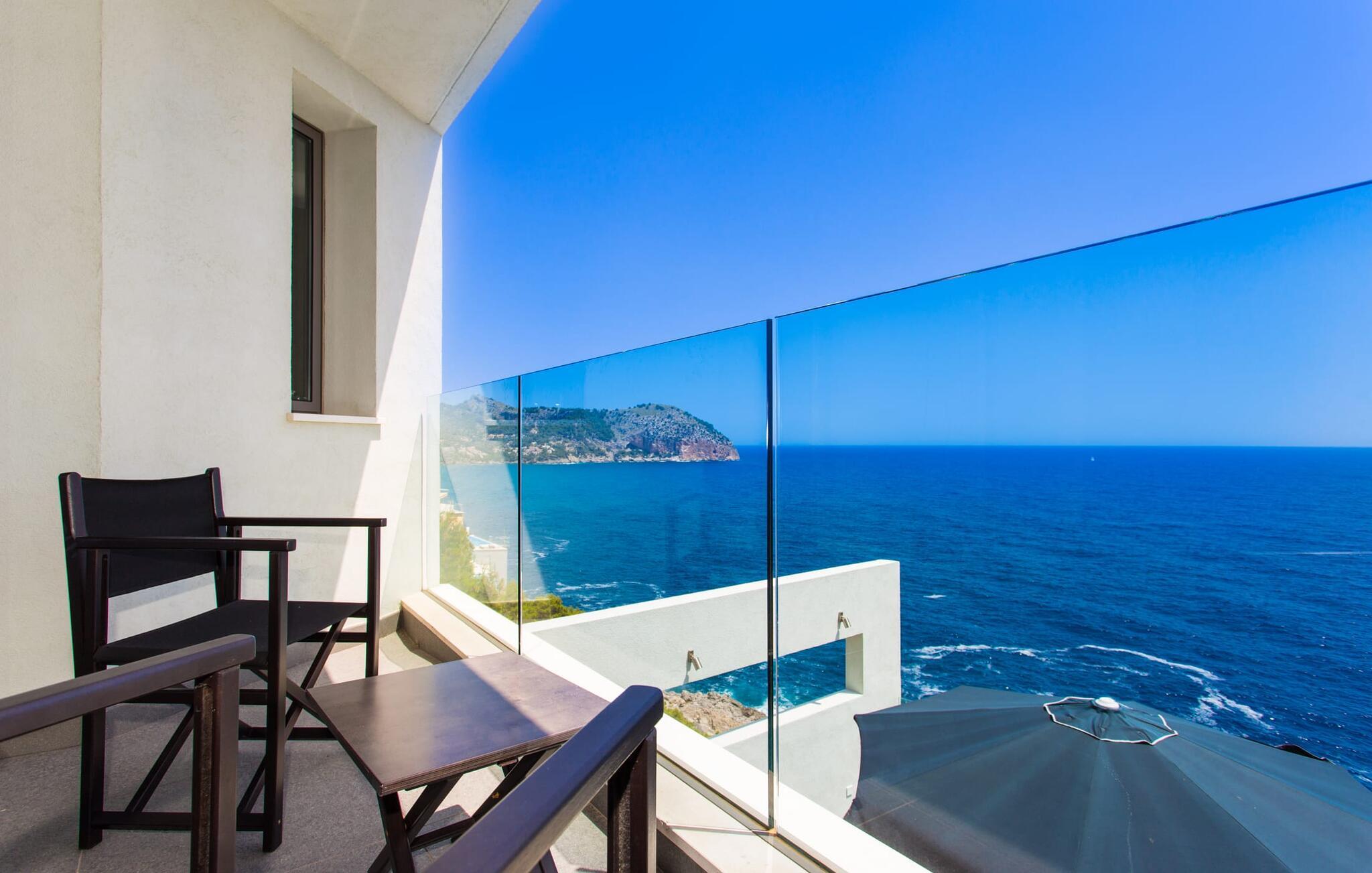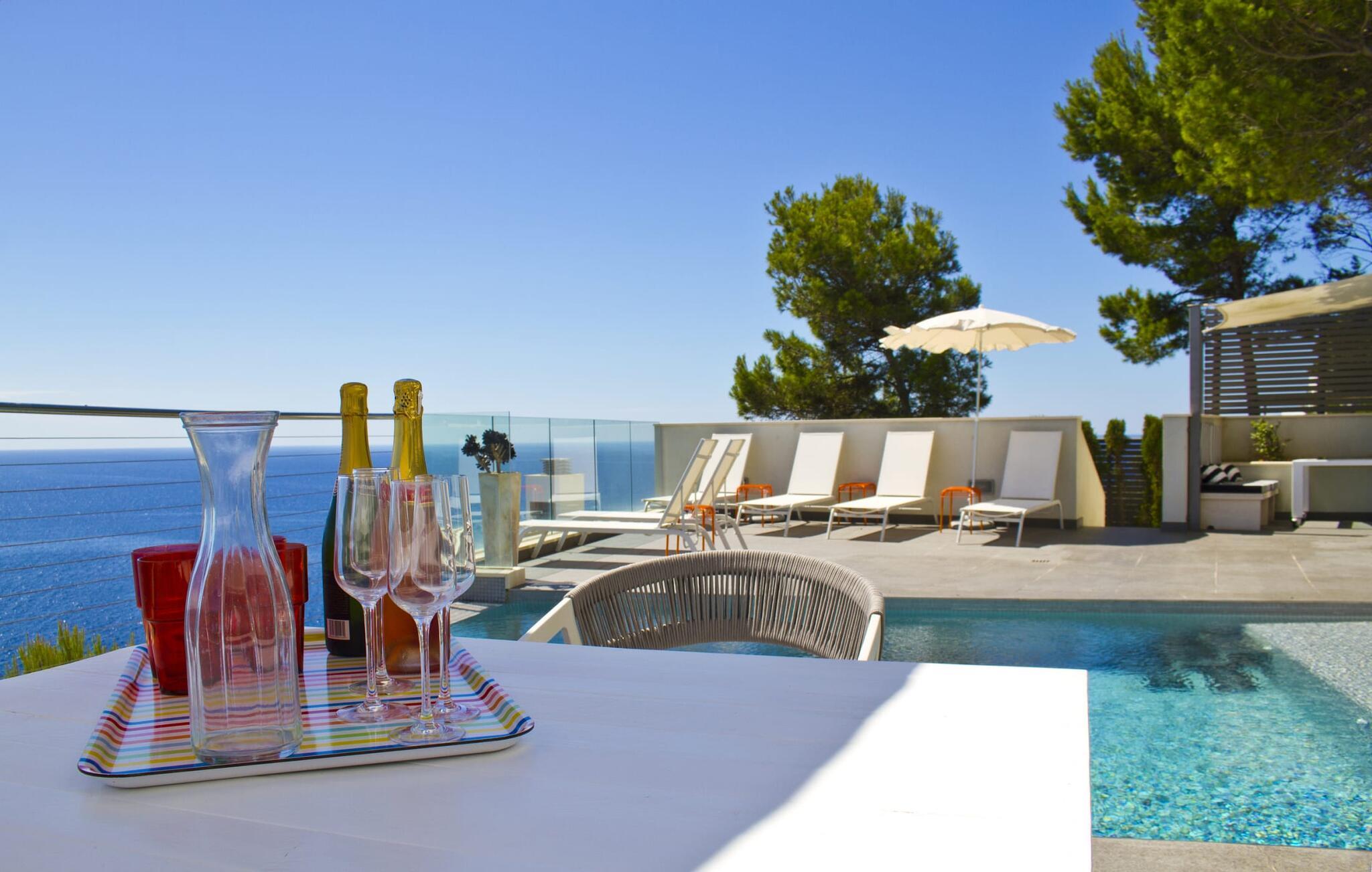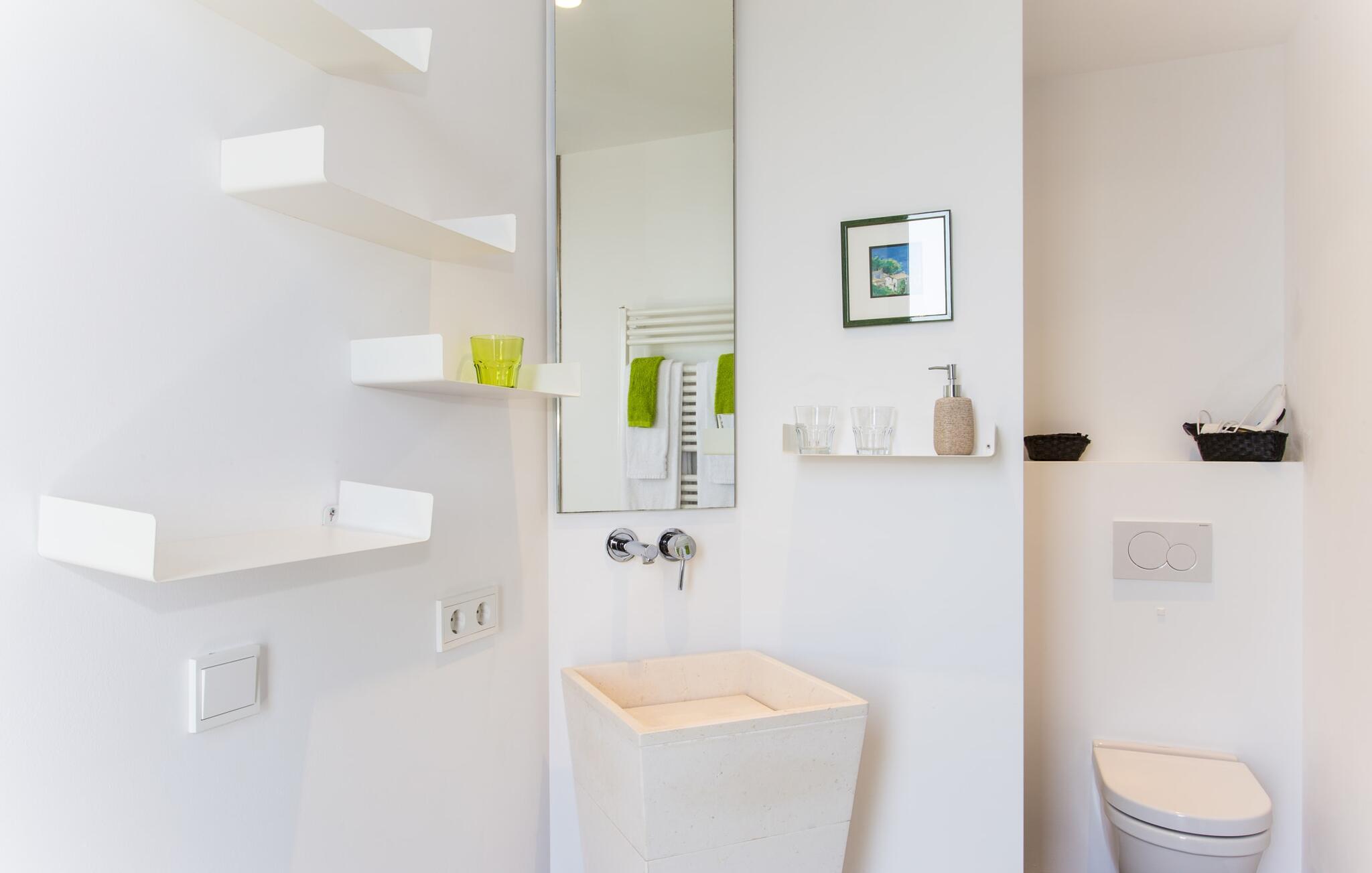 Villa "Can Ema" er en betagende luksusejendom på et klippefyldt plateau på Mallorcas østkyst. Denne arkitektonisk betagende villa vender mod sydøst og sikrer smukt solopgangslys og rigeligt solskin hele dagen. Den ekspansive terrasse med havudsigt har en infinity-pool, udendørs spiseplads og gasgrill, alt sammen bekvemt ved siden af det primære opholdsrum. Et skyggefuldt loungeområde er det perfekte sted at slappe af. Et andet højdepunkt er tagterrassen med liggestole, betagende havudsigt og spabad. Adgang til villaen er fra oven via en elevator, der transporterer gæster fra parkeringspladsen til den primære åben planløsning. Køkkenet er problemfrit integreret i spise- og opholdsområderne og byder på udsigt og nem adgang til poolterrassen gennem store glasskydedøre. Villaen har to dobbeltværelser med en-suite badeværelser og små terrasser med havudsigt, samt ekstra opholdsrum i kælderen med panoramavinduer og yderligere to soveværelser med dobbeltsenge. Alle soveområder har aircondition, og villaen er udstyret med varme, hvilket sikrer komfort hele året rundt for et behageligt ophold i Villa "Can Ema". Den absolut luksuriøse villa “Can Ema” ligger i udkanten af den rolige kystby Canyamel i en førsteklasses beliggenhed direkte ved havet og byder på en betagende 180 graders udsigt. Canyamel tilbyder flere meget gode restauranter og barer samt supermarkeder til daglige indkøb. Desuden kan I på få minutters kørsel nå middelalderbyen Artà og den travle havn Cala Ratjada.