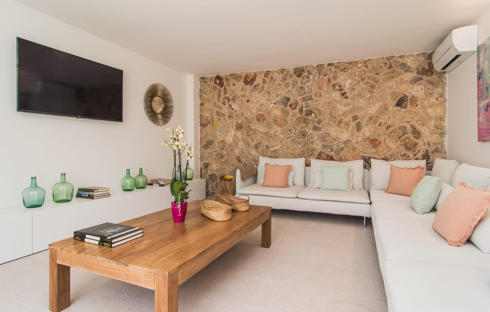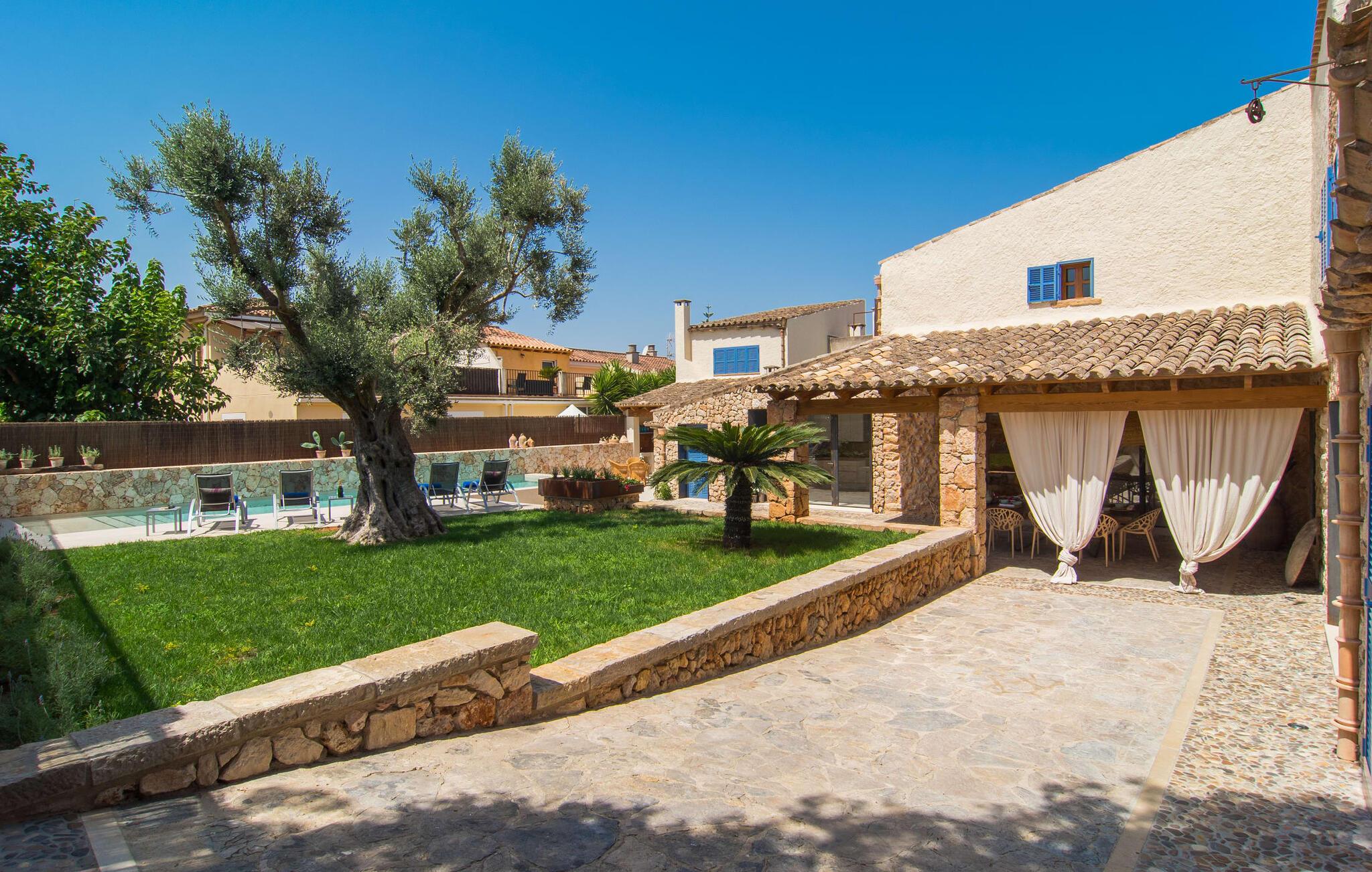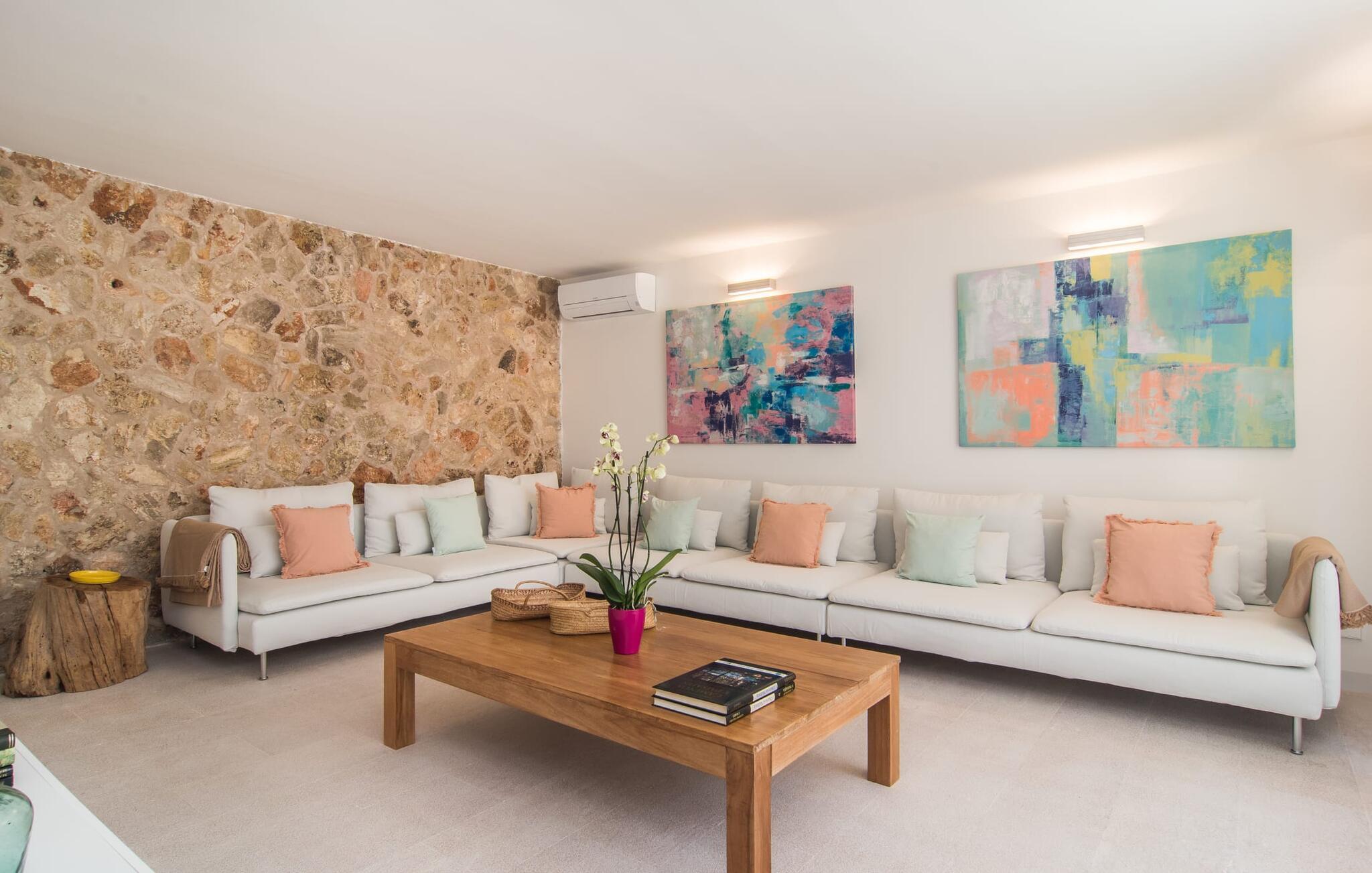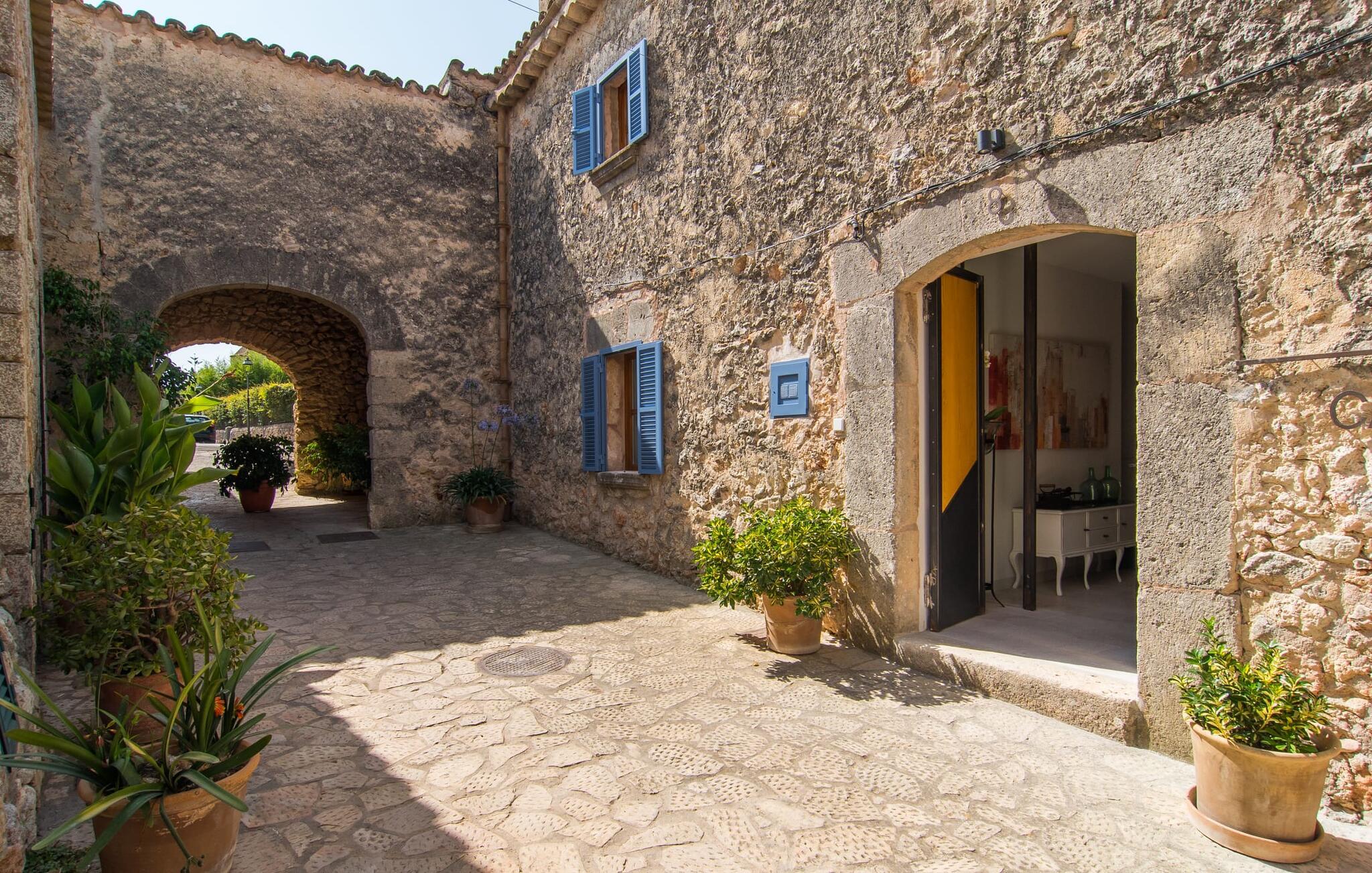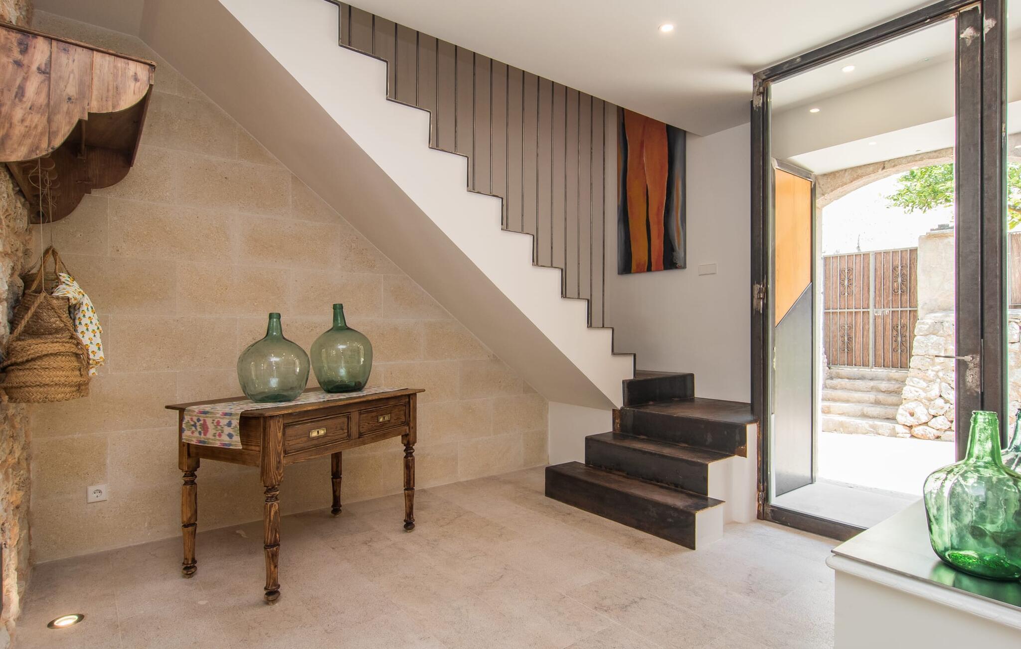 At bo i en typisk mallorcansk landsby, være i stand til at gøre hverdagens ferieærinder inden for gåafstand og stadig nyde et meget privat, ekstremt hyggeligt rum - rækkehuset "Can Font de Costitx" opfylder disse og andre ønsker med lethed. På udendørsområdet scorer den for eksempel point med en særligt smagfuldt indrettet have, som byder på en fantastisk, meget indbydende alsidighed i en overskuelig størrelse. Den pool, der umiddelbart fanger øjet, er selvfølgelig nem at nå via en bred trappe og lover en fornøjelig forfriskning på varme ø-dage. Lige ved siden af det rustikke, knudrede oliventræ venter komfortable liggestole på at blive brugt flittigt - glem ikke jeres yndlingsdrink! I kan sidde i det overdækkede udekøkken eller åbent under middelhavshimlen i siddeområderne omkring huset og nyde en solid grill her og der om aftenen for at afslutte dagen. Her er også en pizzaovn! Fælles måltider kan fejres ved et langbord lige om hjørnet – her sidder man omgivet af natursten, gulv til loft vinduer og selvfølgelig frit udsyn til haven. Det absolut bedste sted for socialt samvær på ethvert tidspunkt af dagen! Men indersiden af huset har også nogle af de smukkeste steder. Den traditionelle bygning blev omhyggeligt renoveret og med stor sans for æstetik blev vægge i natursten delvist bevaret og kombineret med moderne, elegante møbler og subtile farver. Store vinduespartier slipper masser af lys ind og giver yderligere og meget værdifuldt lys til murværket. Alle former for kunst og unikke dekorative stykker tilføjer stilfulde accenter, der effektivt understreger den smagfulde stemning. Den ultramoderne indgangsdør er også et rigtigt blikfang, hvorigennem man kan se det rustikke murværk udenfor. En stor stue/spisestue, åben til det fuldt udstyrede køkken, byder på komfortable sofaer og et bord til indendørs spisning. Det usædvanlige er, at der er en separat tv-stue med en kæmpe sofa - så afslappede filmaftener kan planlægges på forhånd. Denne stue i stueetagen har også et soveværelse med dobbeltseng og et badeværelse. De fire ekstra soveværelser og et andet badeværelse er placeret ovenpå. Et varmt-koldt klimaanlæg gør det attraktivt og komfortabelt at bo i denne lejlighedsferiebolig på Mallorca året rundt. Det meget kærligt og æstetisk renoverede rækkehus "Can Font de Costitx" er beliggende i centrum af landsbyen Costitx, med fremragende infrastrukturelle forbindelser: I landsbyen finder I et supermarked, barer, restauranter og et bageri - alt i gåafstand pga. til sin placering på den lille gade, der kan nås på kortest mulig tid. Ejendommens centrale beliggenhed på øen gør den til det ideelle udgangspunkt for dagsture eller cykelture.