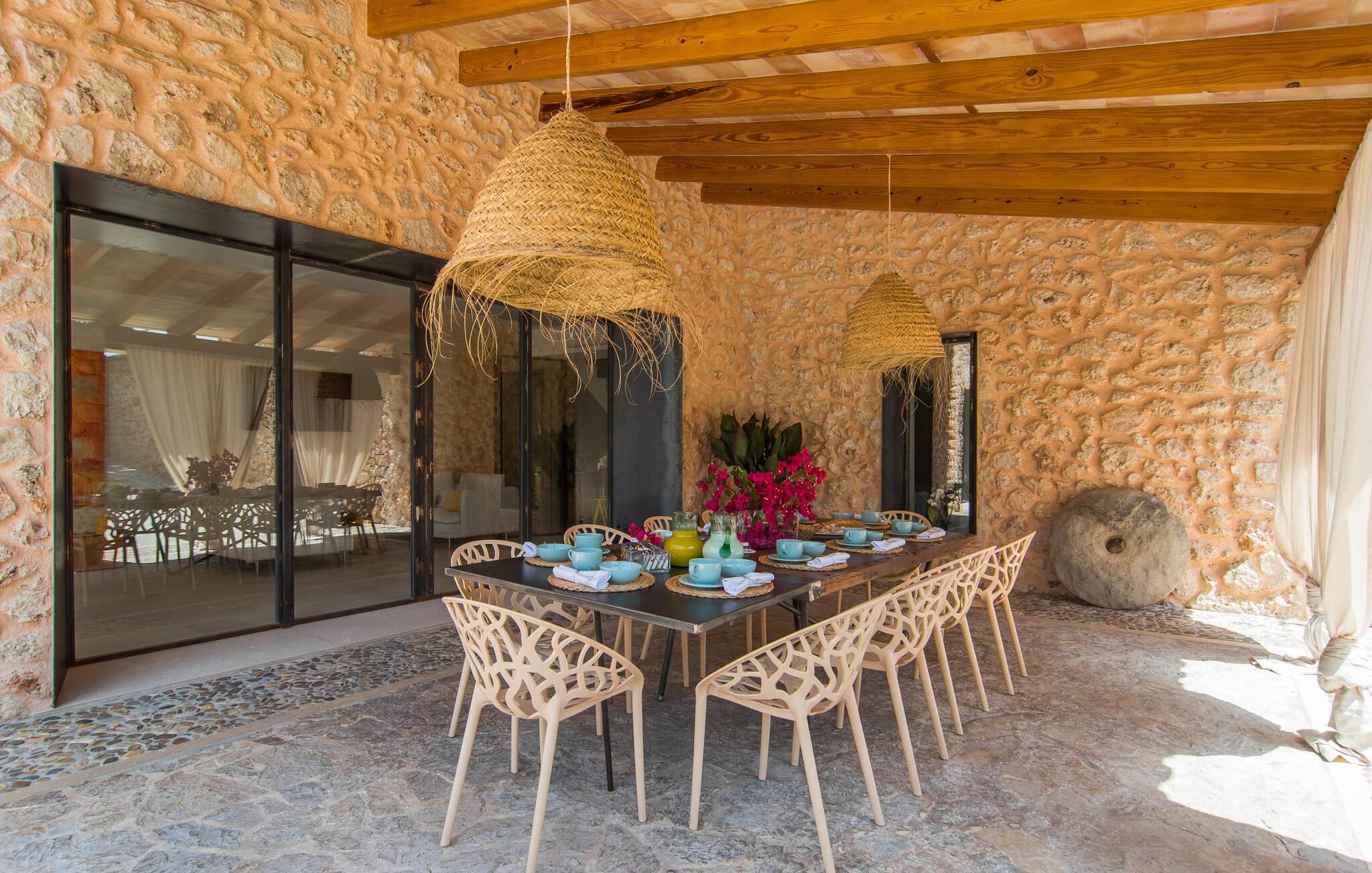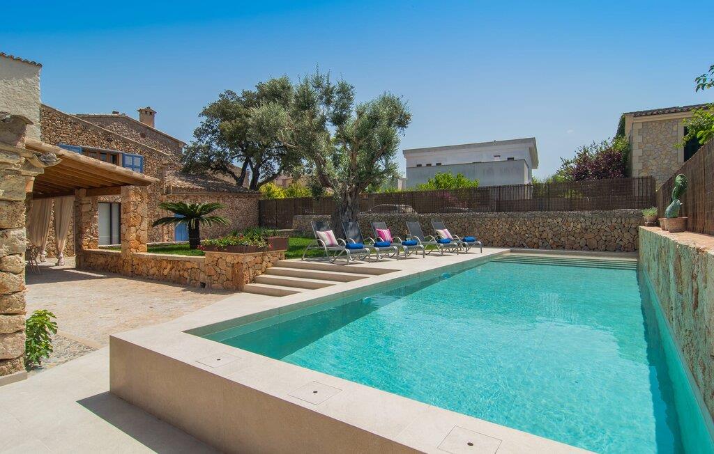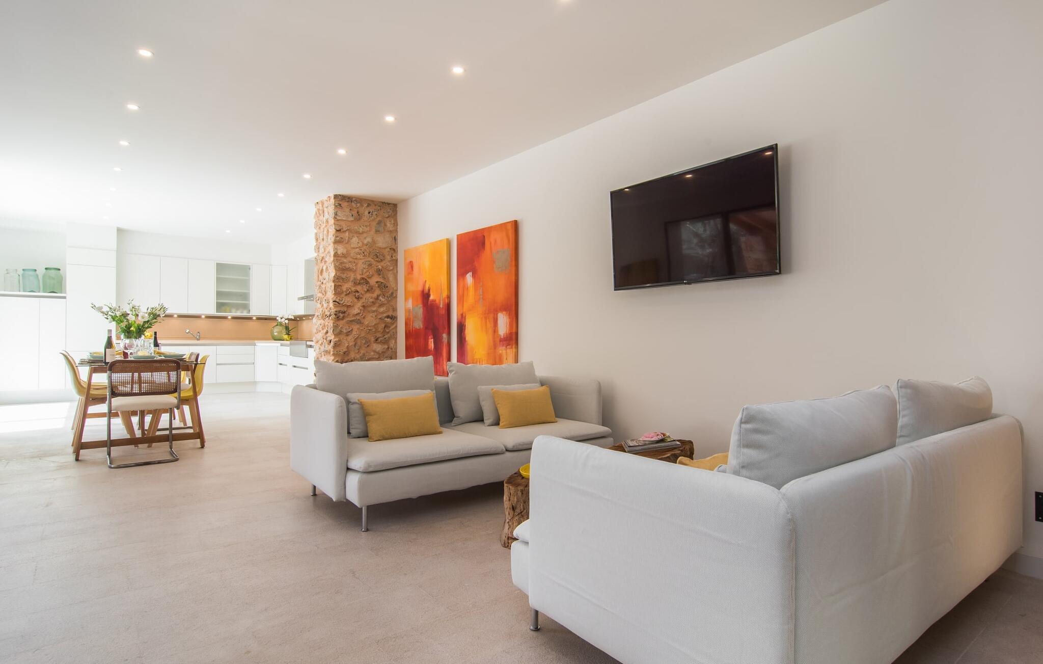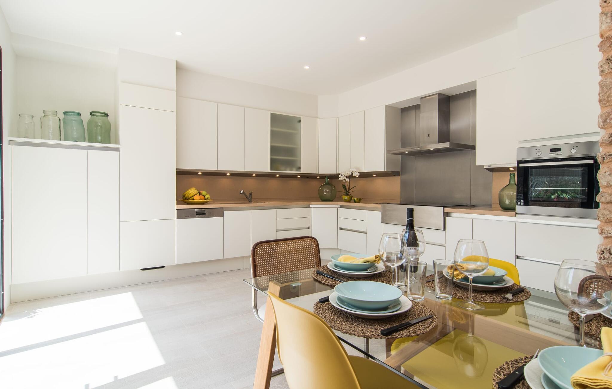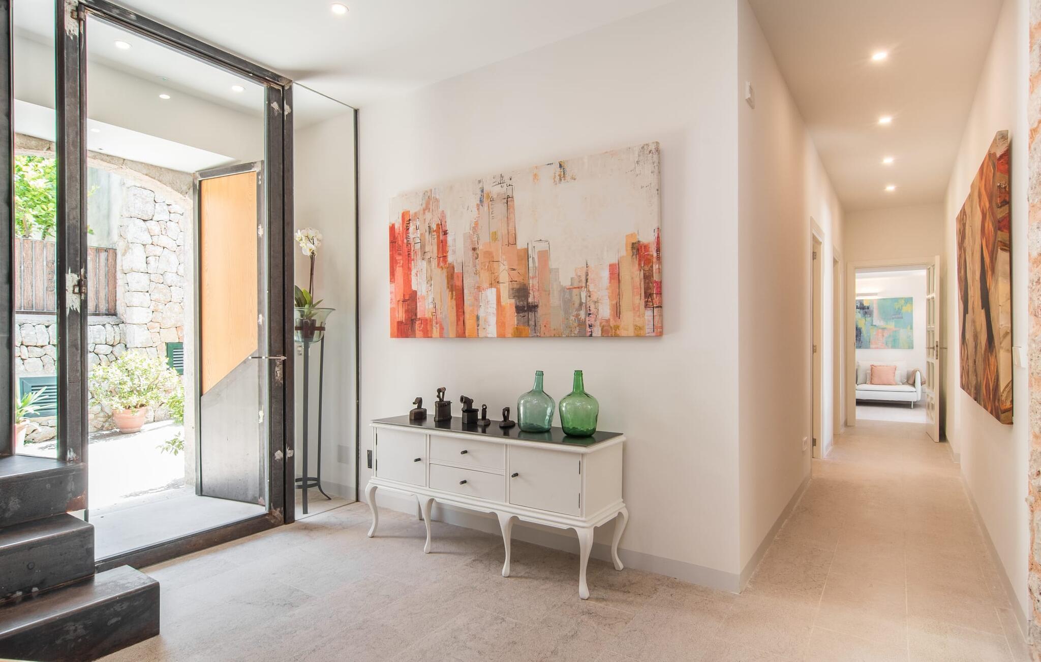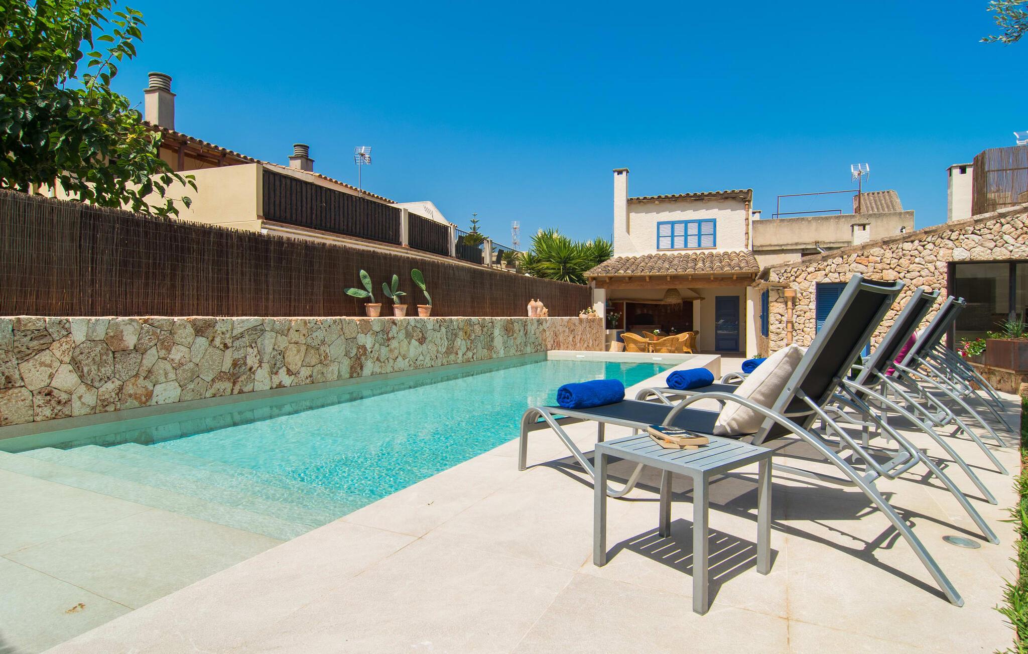 At bo i en typisk mallorcansk landsby, være i stand til at gøre hverdagens ferieærinder inden for gåafstand og stadig nyde et meget privat, ekstremt hyggeligt rum - rækkehuset "Can Font de Costitx" opfylder disse og andre ønsker med lethed. På udendørsområdet scorer den for eksempel point med en særligt smagfuldt indrettet have, som byder på en fantastisk, meget indbydende alsidighed i en overskuelig størrelse. Den pool, der umiddelbart fanger øjet, er selvfølgelig nem at nå via en bred trappe og lover en fornøjelig forfriskning på varme ø-dage. Lige ved siden af det rustikke, knudrede oliventræ venter komfortable liggestole på at blive brugt flittigt - glem ikke jeres yndlingsdrink! I kan sidde i det overdækkede udekøkken eller åbent under middelhavshimlen i siddeområderne omkring huset og nyde en solid grill her og der om aftenen for at afslutte dagen. Her er også en pizzaovn! Fælles måltider kan fejres ved et langbord lige om hjørnet – her sidder man omgivet af natursten, gulv til loft vinduer og selvfølgelig frit udsyn til haven. Det absolut bedste sted for socialt samvær på ethvert tidspunkt af dagen! Men indersiden af huset har også nogle af de smukkeste steder. Den traditionelle bygning blev omhyggeligt renoveret og med stor sans for æstetik blev vægge i natursten delvist bevaret og kombineret med moderne, elegante møbler og subtile farver. Store vinduespartier slipper masser af lys ind og giver yderligere og meget værdifuldt lys til murværket. Alle former for kunst og unikke dekorative stykker tilføjer stilfulde accenter, der effektivt understreger den smagfulde stemning. Den ultramoderne indgangsdør er også et rigtigt blikfang, hvorigennem man kan se det rustikke murværk udenfor. En stor stue/spisestue, åben til det fuldt udstyrede køkken, byder på komfortable sofaer og et bord til indendørs spisning. Det usædvanlige er, at der er en separat tv-stue med en kæmpe sofa - så afslappede filmaftener kan planlægges på forhånd. Denne stue i stueetagen har også et soveværelse med dobbeltseng og et badeværelse. De fire ekstra soveværelser og et andet badeværelse er placeret ovenpå. Et varmt-koldt klimaanlæg gør det attraktivt og komfortabelt at bo i denne lejlighedsferiebolig på Mallorca året rundt. Det meget kærligt og æstetisk renoverede rækkehus "Can Font de Costitx" er beliggende i centrum af landsbyen Costitx, med fremragende infrastrukturelle forbindelser: I landsbyen finder I et supermarked, barer, restauranter og et bageri - alt i gåafstand pga. til sin placering på den lille gade, der kan nås på kortest mulig tid. Ejendommens centrale beliggenhed på øen gør den til det ideelle udgangspunkt for dagsture eller cykelture.