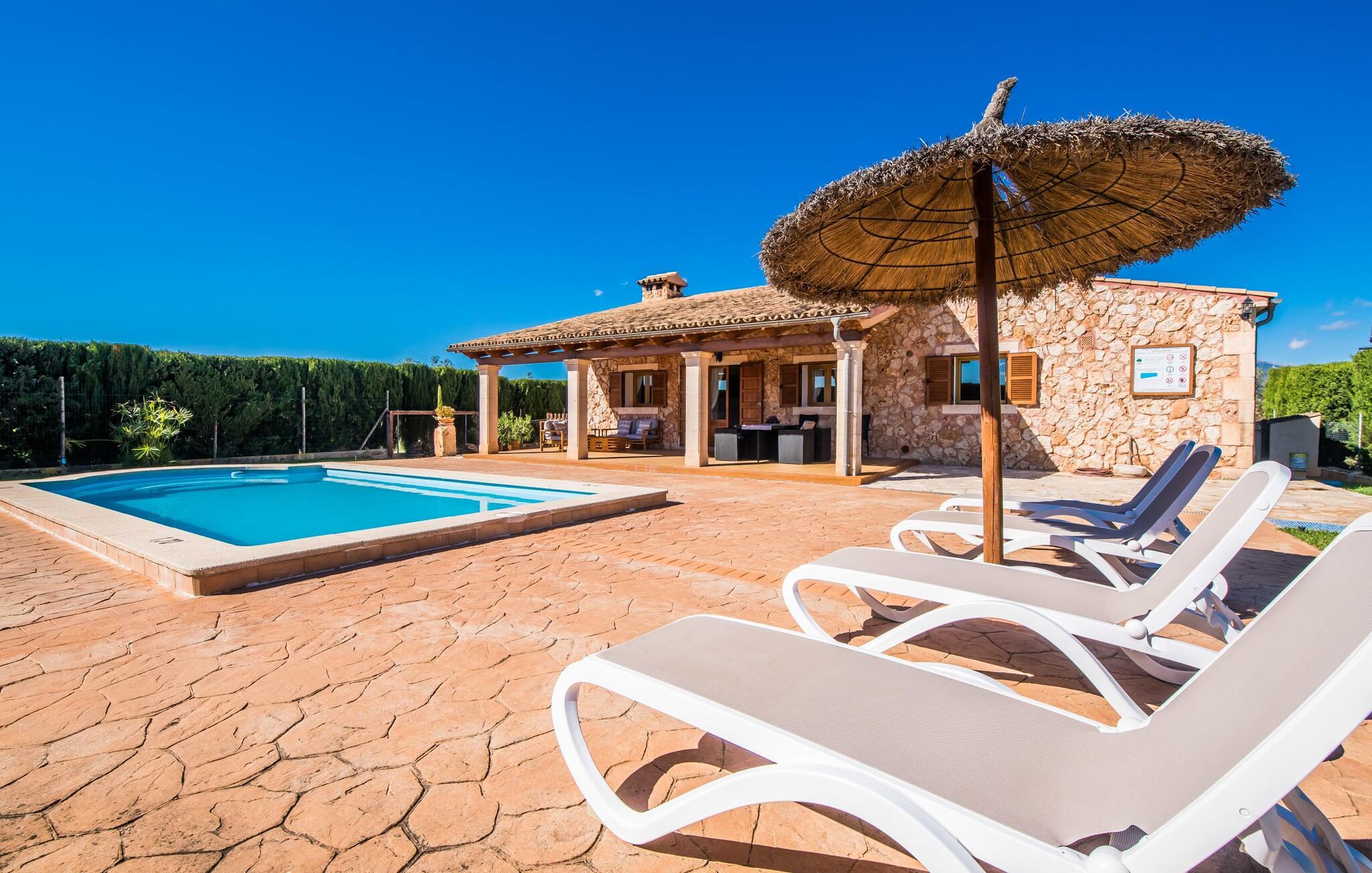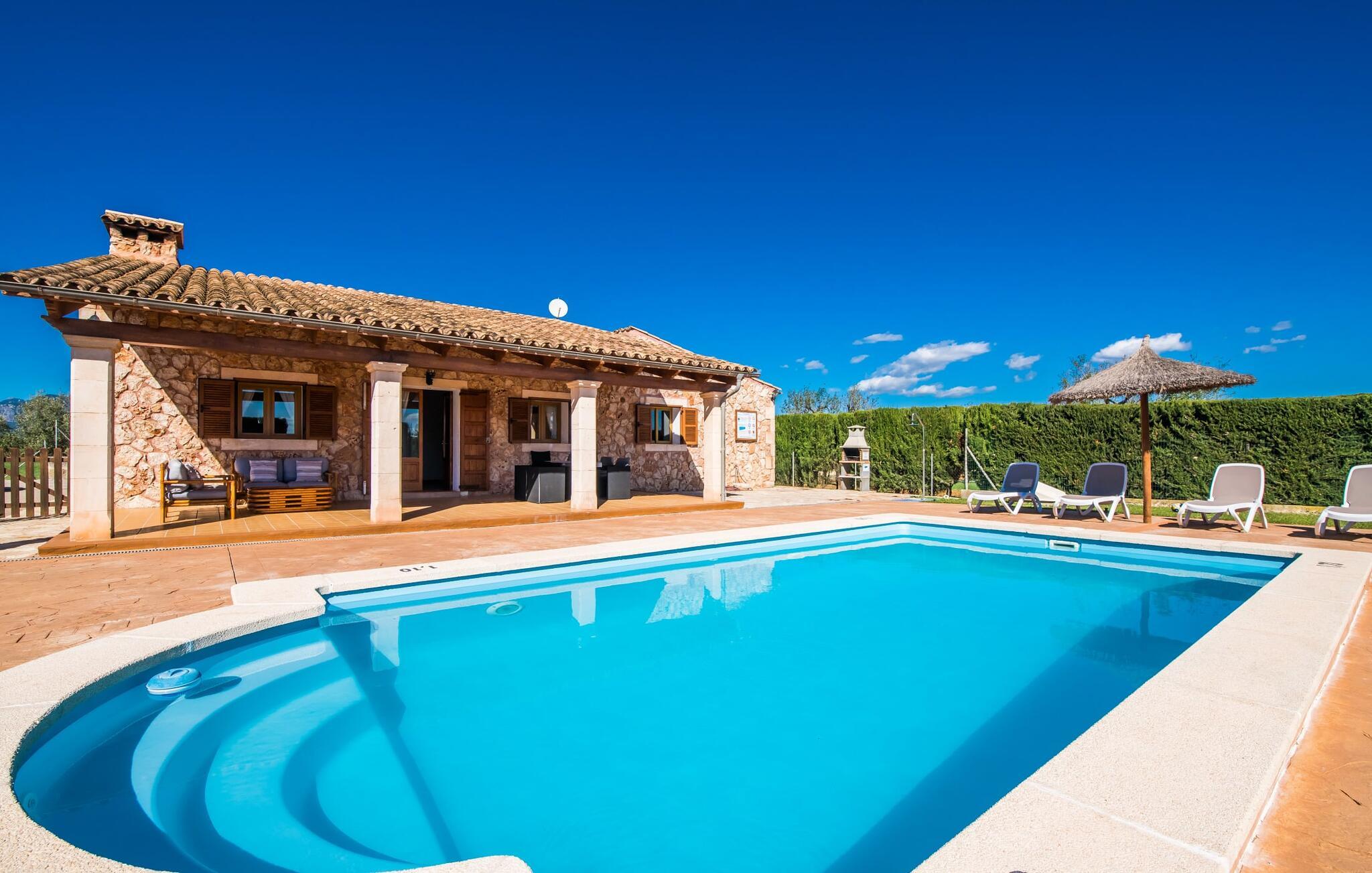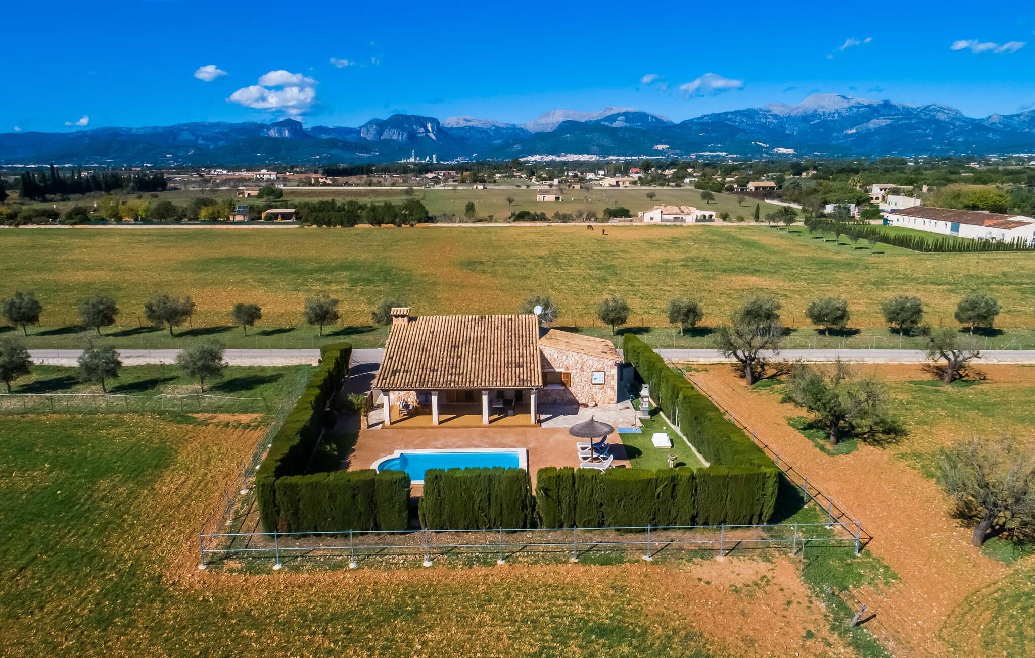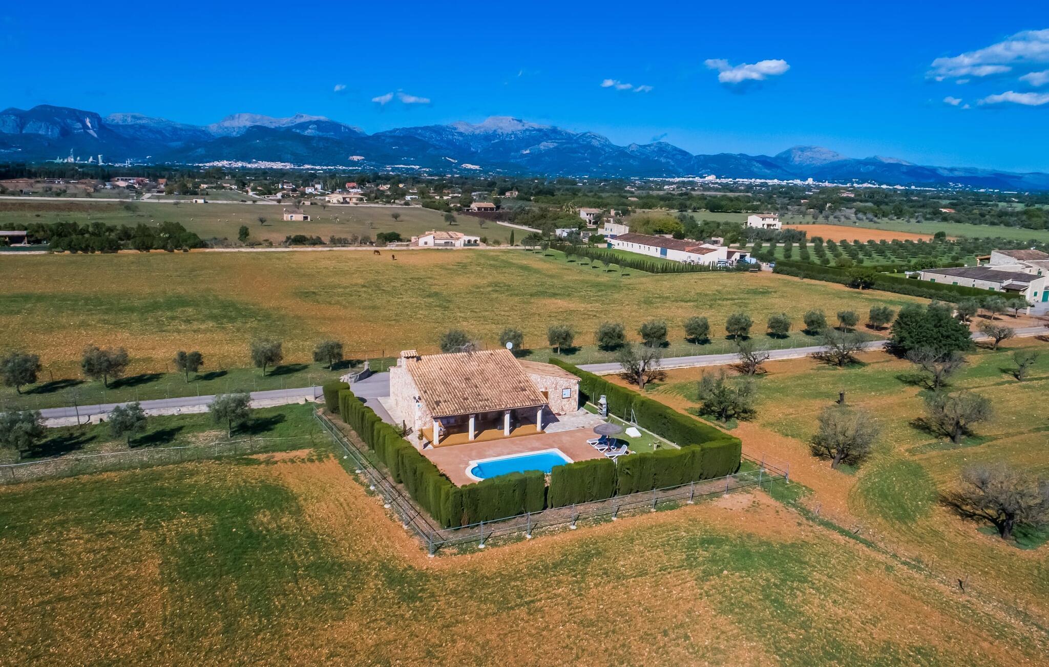 En fortryllende oase midt i naturen og i umiddelbar nærhed af landsbyen Sencelles - sådan præsenterer det indbydende naturstensferiehus sig. Det er også tæt på en anden af vores udbudte ejendomme, Villa "Can Grau". Et smukt, lukket område byder gæsterne velkommen på en venlig måde og giver straks udsigt til haven, som er præget af græsplæner og terrasser, og som i sin kerne rummer det udendørs områdes højdepunkt: swimmingpoolen. Den 8 x 4 m store pool er omgivet af en attraktiv loungeterrasse og er let tilgængelig via trapper. Der er også en praktisk udendørs bruser. På de fire tilgængelige liggestole kan I slappe af i middelhavslyset til jeres hjertes lyst og måske bare nyde fornøjelsen af at lave ingenting. De afkølede møbler på den smagfuldt designede terrasse inviterer jer til at slappe af, ideelt set med en lækker drink. Dette attraktive sted er ideelt til at fejre en kulinarisk grillfest om aftenen og nyde regionale delikatesser, som måske er friskkøbt samme dag. Selve huset er udstyret med to soveværelser med dobbeltsenge, et badeværelse, et fuldt udstyret køkken og en hyggelig stue/spisestue. Dette rum, der er åbent og centralt på samme tid, tilbyder forskellige måder at tilbringe tid her. På den ene side er der en behagelig sofa, som er et vidunderligt sted at hvile på ethvert tidspunkt af dagen. Hvis I ønsker det, kan I også blive underholdt med en film, da fladskærms-tv med satellitforbindelse er installeret på den modsatte væg. På kølige aftener fremkalder den dekorative pejs behagelig varme og en særlig hyggelig atmosfære, hvis det er nødvendigt. Det massive spisebord lige ved siden af er ideelt til indendørs spisning. Køkkenet, som også er placeret her og er løst adskilt af en disk, er udstyret med alt hvad I har brug for hver dag og er rummeligt og praktisk. En kedel og en filterkaffemaskine er kun inkluderet. To individuelt og æstetisk indrettede soveværelser danner grundlaget for en afslappende søvn. Der er to senge, der måler 0,90 x 2,00 m og en, der måler 1,50 x 2,00 m. Badeværelset er malet i lyse farver og har et moderne design med gode faciliteter. Et strygejern og en hårtørrer er til rådighed i huset, så I ikke behøver at bekymre jer om, at de optager bagageplads. Hvis I har lyst til at udforske byen og shoppe, kan I nå større byer som Inca på ingen tid. Dette er et godt sted at købe sko, da denne by har en lang tradition for læder og sko. For en afslappende dag på stranden, prøv den smukke bugt Alcúdia eller Playa del Muro, for blot at nævne to af mange eksempler. Den venlige naturstensvilla "Can Grau Petit" ligger mellem Inca og Sencelles midt på Mallorca. Herfra har I en vidunderlig udsigt over det brede omkringliggende landskab. I Sencelles og Inca kan I nemt gøre jeres daglige indkøb. Ejendommens bekvemme beliggenhed tillader ture til mange af øens strande (som Es Trenc, Son Serra de Marina og Arenal).