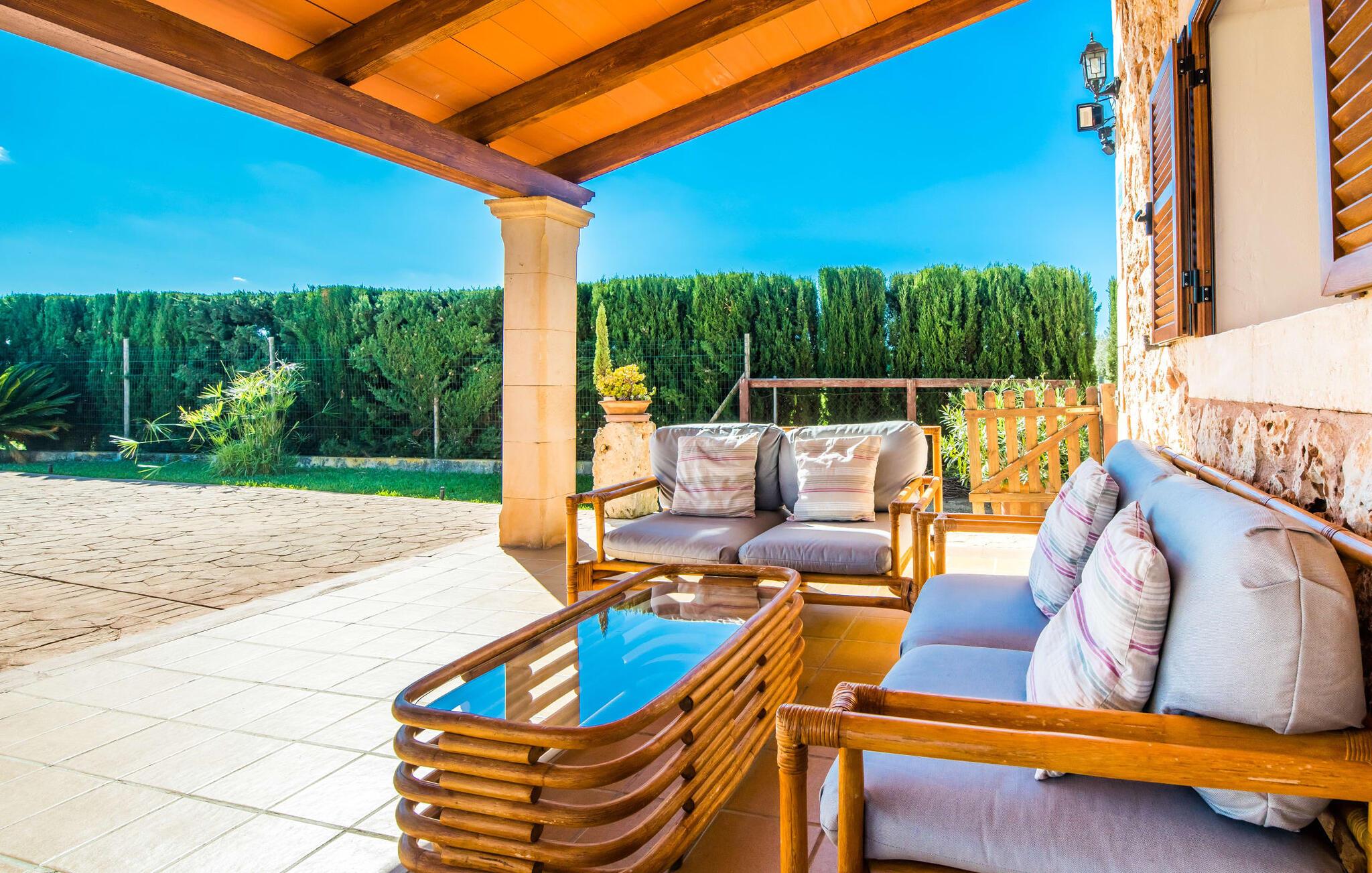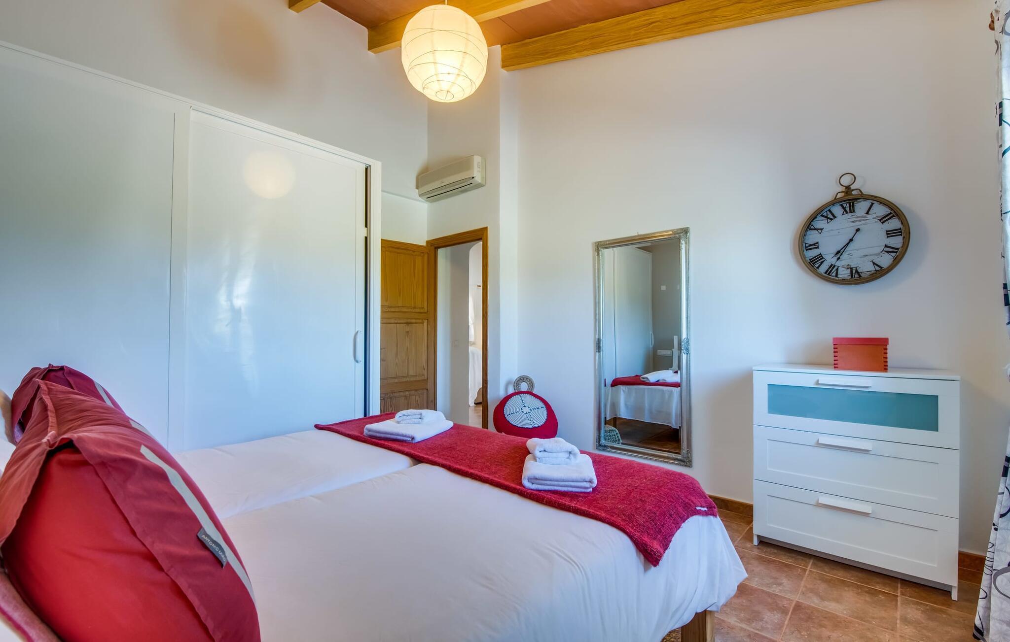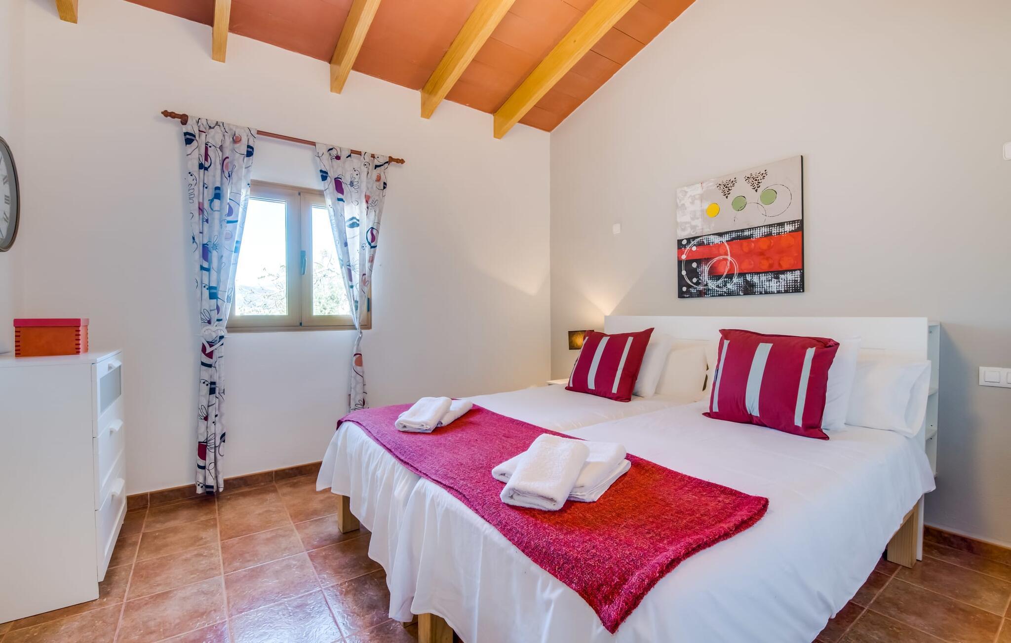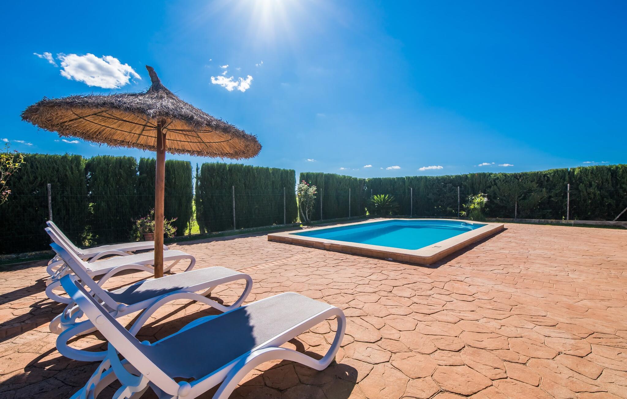 En fortryllende oase midt i naturen og i umiddelbar nærhed af landsbyen Sencelles - sådan præsenterer det indbydende naturstensferiehus sig. Det er også tæt på en anden af vores udbudte ejendomme, Villa "Can Grau". Et smukt, lukket område byder gæsterne velkommen på en venlig måde og giver straks udsigt til haven, som er præget af græsplæner og terrasser, og som i sin kerne rummer det udendørs områdes højdepunkt: swimmingpoolen. Den 8 x 4 m store pool er omgivet af en attraktiv loungeterrasse og er let tilgængelig via trapper. Der er også en praktisk udendørs bruser. På de fire tilgængelige liggestole kan I slappe af i middelhavslyset til jeres hjertes lyst og måske bare nyde fornøjelsen af at lave ingenting. De afkølede møbler på den smagfuldt designede terrasse inviterer jer til at slappe af, ideelt set med en lækker drink. Dette attraktive sted er ideelt til at fejre en kulinarisk grillfest om aftenen og nyde regionale delikatesser, som måske er friskkøbt samme dag. Selve huset er udstyret med to soveværelser med dobbeltsenge, et badeværelse, et fuldt udstyret køkken og en hyggelig stue/spisestue. Dette rum, der er åbent og centralt på samme tid, tilbyder forskellige måder at tilbringe tid her. På den ene side er der en behagelig sofa, som er et vidunderligt sted at hvile på ethvert tidspunkt af dagen. Hvis I ønsker det, kan I også blive underholdt med en film, da fladskærms-tv med satellitforbindelse er installeret på den modsatte væg. På kølige aftener fremkalder den dekorative pejs behagelig varme og en særlig hyggelig atmosfære, hvis det er nødvendigt. Det massive spisebord lige ved siden af er ideelt til indendørs spisning. Køkkenet, som også er placeret her og er løst adskilt af en disk, er udstyret med alt hvad I har brug for hver dag og er rummeligt og praktisk. En kedel og en filterkaffemaskine er kun inkluderet. To individuelt og æstetisk indrettede soveværelser danner grundlaget for en afslappende søvn. Der er to senge, der måler 0,90 x 2,00 m og en, der måler 1,50 x 2,00 m. Badeværelset er malet i lyse farver og har et moderne design med gode faciliteter. Et strygejern og en hårtørrer er til rådighed i huset, så I ikke behøver at bekymre jer om, at de optager bagageplads. Hvis I har lyst til at udforske byen og shoppe, kan I nå større byer som Inca på ingen tid. Dette er et godt sted at købe sko, da denne by har en lang tradition for læder og sko. For en afslappende dag på stranden, prøv den smukke bugt Alcúdia eller Playa del Muro, for blot at nævne to af mange eksempler. Den venlige naturstensvilla "Can Grau Petit" ligger mellem Inca og Sencelles midt på Mallorca. Herfra har I en vidunderlig udsigt over det brede omkringliggende landskab. I Sencelles og Inca kan I nemt gøre jeres daglige indkøb. Ejendommens bekvemme beliggenhed tillader ture til mange af øens strande (som Es Trenc, Son Serra de Marina og Arenal).