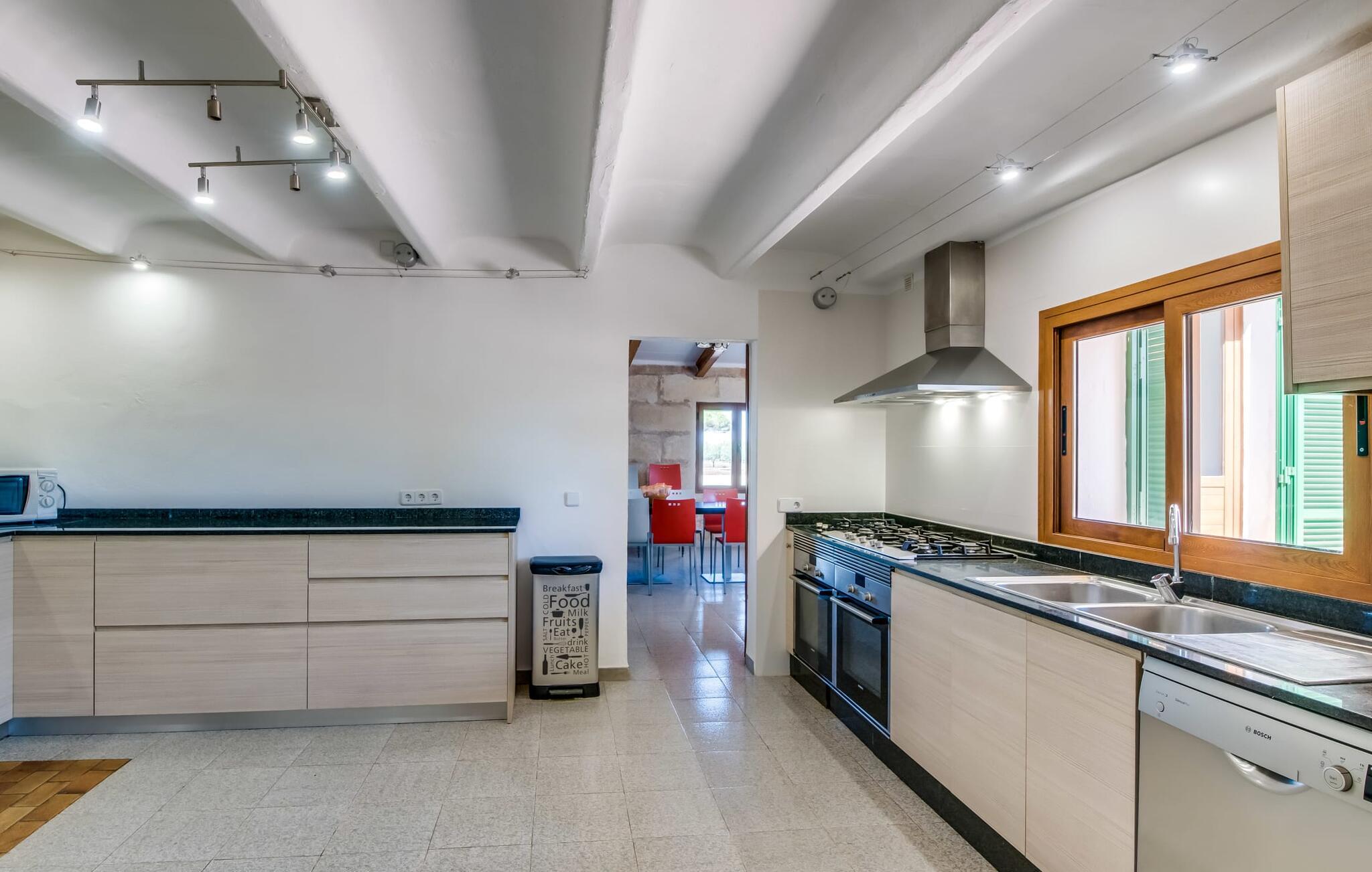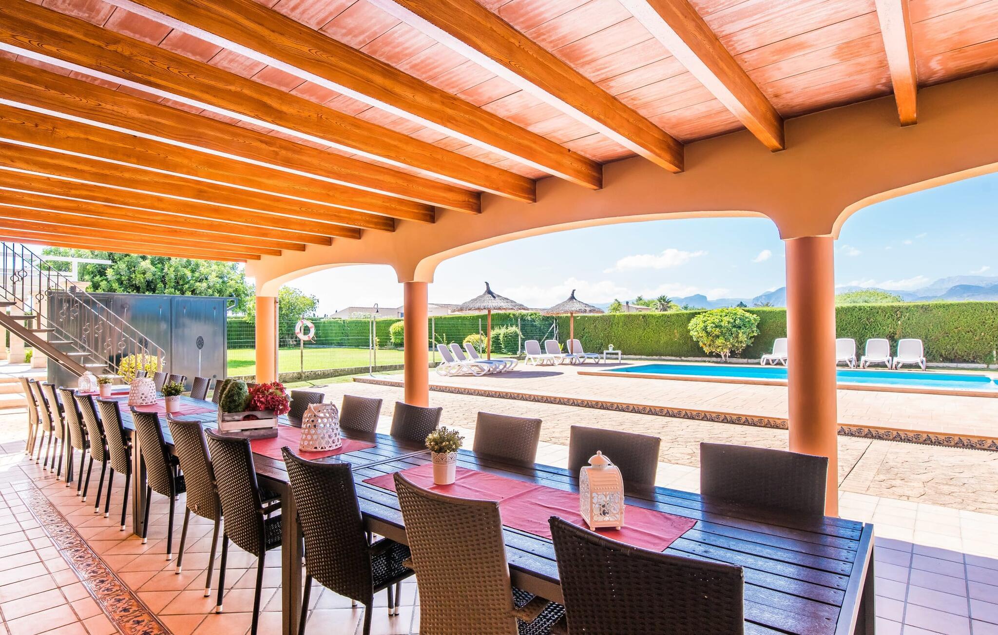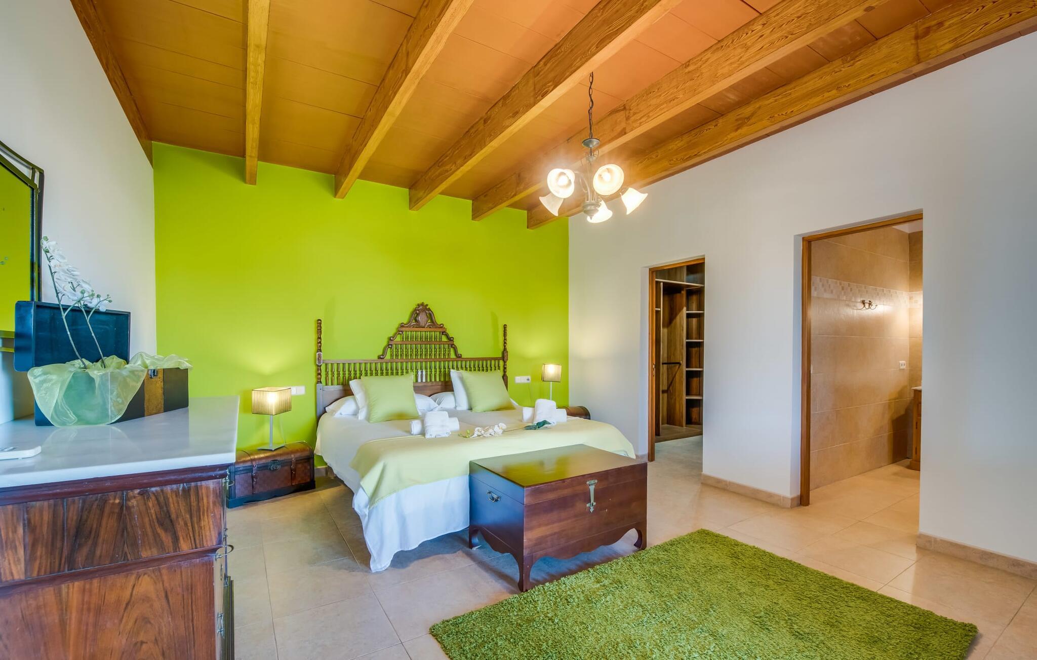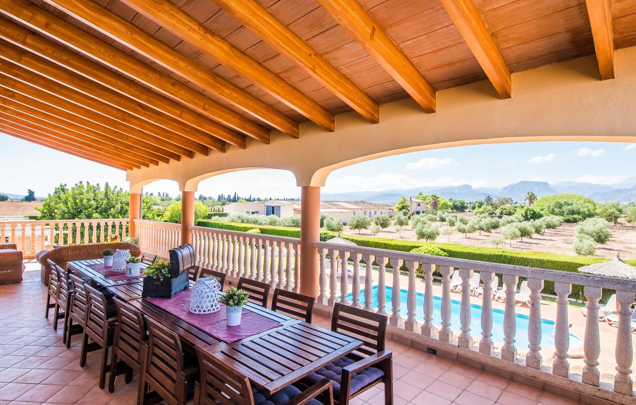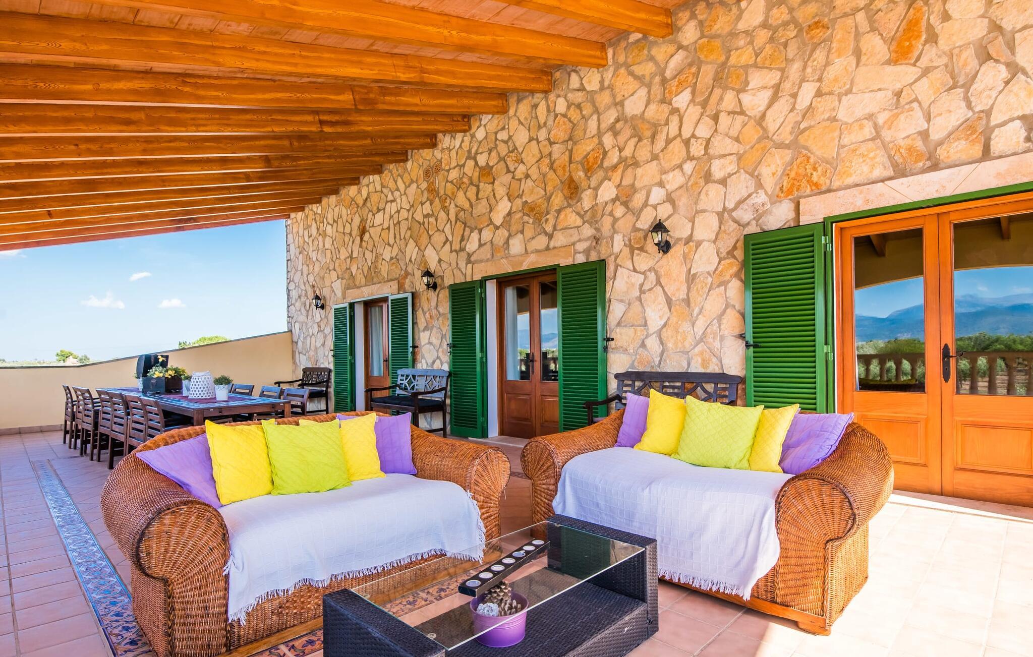 Villaen "Can Grau" er med sine 600 kvadratmeter boligareal en af de største og mest imponerende ejendomme i vores tilbud. På grund af sin størrelse og indretning med 16 dobbeltværelser og 15 badeværelser er villaen ideel til en stor familie eller store rejsegrupper. På grund af faciliteterne på anlægget kan enhver medrejsende altid nyde deres private rum fuldt ud. Når I booker for 24 personer (eller færre), får I en rabat. Rummelige terrasser, balkon og gårdhaver omgiver villaen "Can Grau", så I kan nyde den mallorcanske sol på ethvert tidspunkt af dagen og på en række yndlingssteder. I centrum af udendørsområdet ligger den skønne pool med nem trinadgang og en tilstødende skøn solterrasse. Lige ved siden af er der en særlig børnepool for små vandelskere. I denne del af ejendommen giver en kant af tætte planter følelsen af fuldstændig privatliv og afsondrethed. I kan slappe af af hjertens lyst på de komfortable liggestole og nyde udsigten til den dybblå himmel. I tilfælde af at solen skinner for kraftigt, er der i alt ti parasoller til jeres rådighed. Vil I forfriske jer endnu mere, kan I bruge udendørsbruseren. Forskellige siddegrupper inviterer jer til at blive hængende i den luftige skygge på den overdækkede terrasse. Enhver, der går til den øverste altan, kan nyde en vidunderlig udsigt over det omkringliggende landskab derfra. Der er siddepladser til mindst ti personer omkring den enorme balkon med udsigt til poolområdet, som også kan nås via en udvendig trappe. Dette er et vidunderligt sted at sidde sammen i en hyggelig atmosfære og måske nyde et middelhavsmåltid sammen eller fejre afslutningen på en vidunderlig feriedag i en festlig atmosfære. Hvis I har lyst til at være vært for et kulinarisk grillarrangement, kan I bruge den indbyggede grill, der er installeret nær den nederste terrasse. Når man træder ind i villaens indre, som også har ikke kun smukke, men også meget originale naturstensfacader, støder man på den nederste stue med en ekstremt stor komfortabel sofa og et rustikt spisebord til seks personer. Fjernsynet og pejsen er bekvemt installeret i dette rum. Det klassisk indrettede køkken er nemt at vedligeholde og er fuldt udstyret, herunder en kedel og en kaffemaskine. Et meget lignende layout kan findes på øverste etage (inklusive et andet køkken), i et praktisk og attraktivt design, med plads nok til at føle sig godt tilpas. Der er også en pejs på denne første sal, som giver jer mulighed for at hygge jer i en hjemlig atmosfære på køligere aftener. En kæmpe stue/spisestue giver alle gæster i huset mulighed for at spise sammen og nyde deres fritid indendørs. Seks af de ni individuelt designede og for det meste airconditionerede soveværelser (hvoraf det ene er et gennemgående soveværelse, der fører til et andet soveværelse) har deres eget badeværelse. Alle 11 badeværelser har et behageligt, lyst design, moderne indretning og nogle er udstyret med smukke, typiske mallorcanske grænser. En original og unik bonus er de to ekstra selvforplejningsrum i nabobygningerne, som blev nybygget i 2017. Den ene tilbyder overnatning for op til seks personer, med tre soveværelser med dobbeltsenge, to badeværelser med bruser, et køkken og en spisestue og stue. Den tredje stue har fire soveværelser med dobbeltsenge, to bruserum, et køkken, en spisestue og en stue. Det første og andet rum er til rådighed for grupper på op til 24 personer; Grupper på 32 personer eller mere kan bruge hele ejendommen. Vil I en tur ind til byen for at shoppe, kan I hurtigt nå en storby som Inca. Dette er et fantastisk sted at købe sko, da denne by har en lang tradition inden for alt hvad angår læderprodukter og sko. I vil måske besøge det ugentlige marked i Sineu, som finder sted hver onsdag. For en afslappende dag på stranden, prøv den smukke bugt Alcúdia eller Playa del Muro. Golfelskere vil få noget for pengene: Puntiro golfbane er omkring 25 minutter væk i bil. Den storslåede, kæmpe villa “Can Grau” ligger mellem Inca og Sencelles, midt på Mallorca. Herfra har I en fantastisk udsigt over det smukke omkringliggende landskab. I Sencelles og Inca kan I gøre jeres daglige indkøb perfekt. Ejendommens bekvemme beliggenhed giver mulighed for ture til mange af øens strande, herunder Es Trenc, Son Serra de Marina og Arenal.