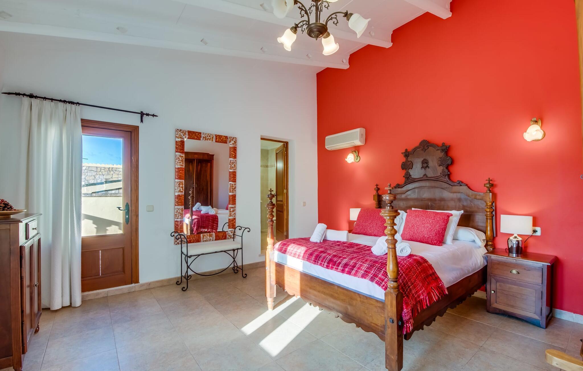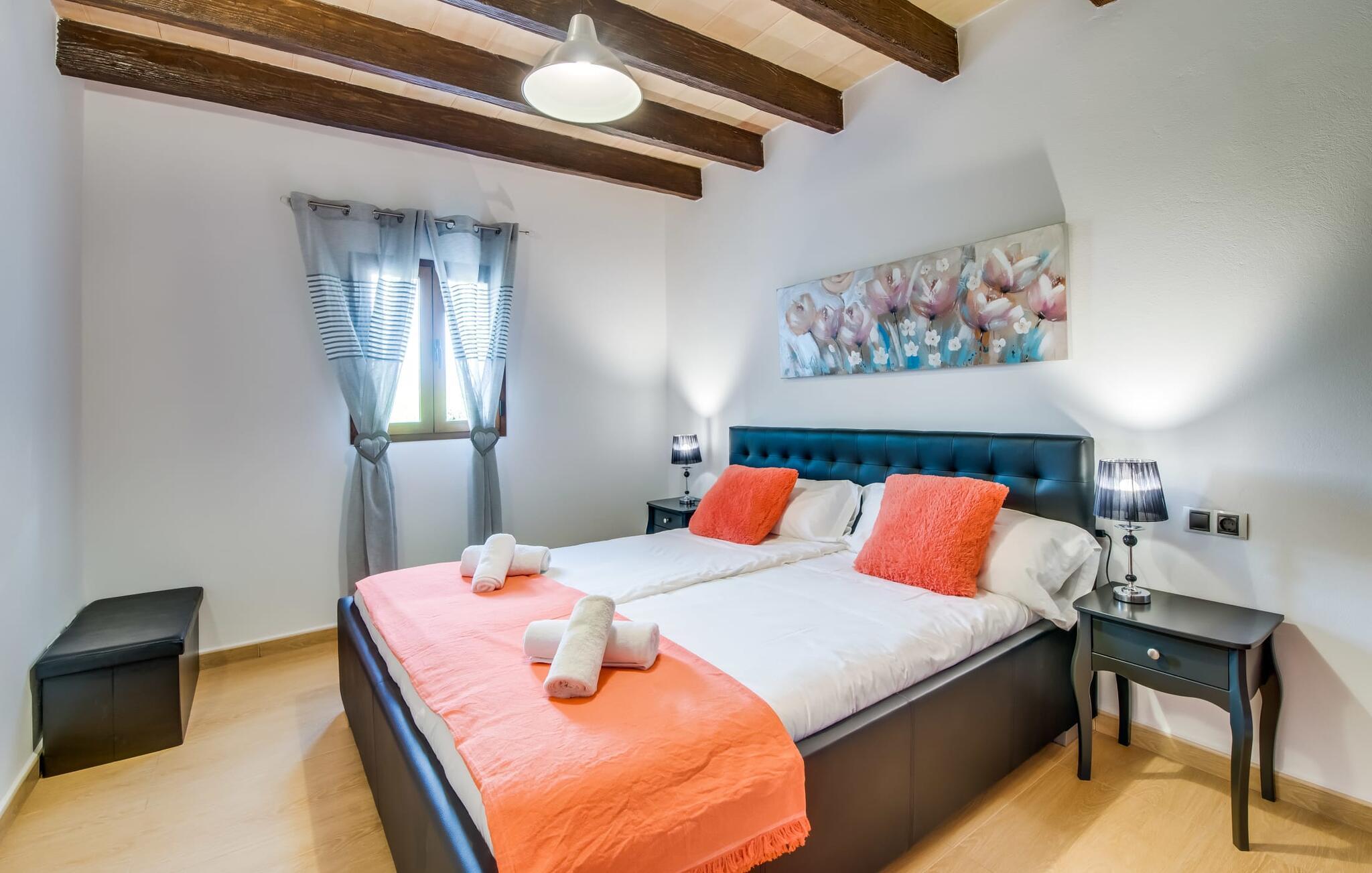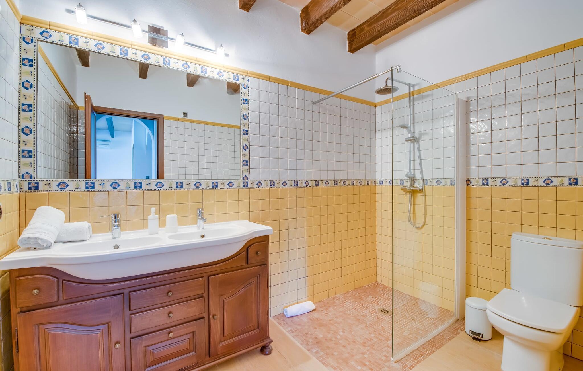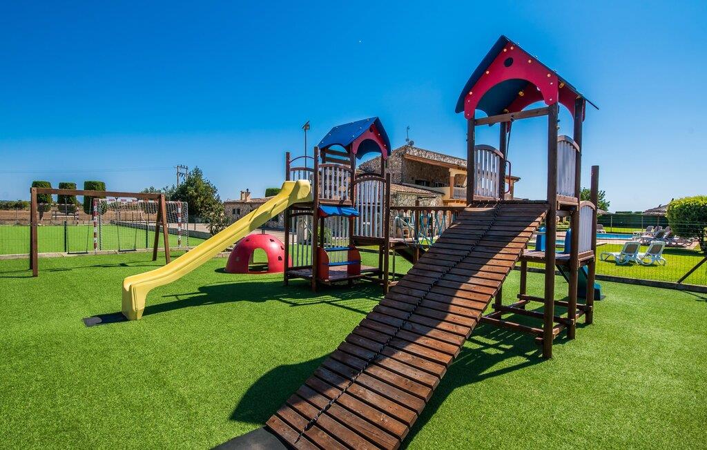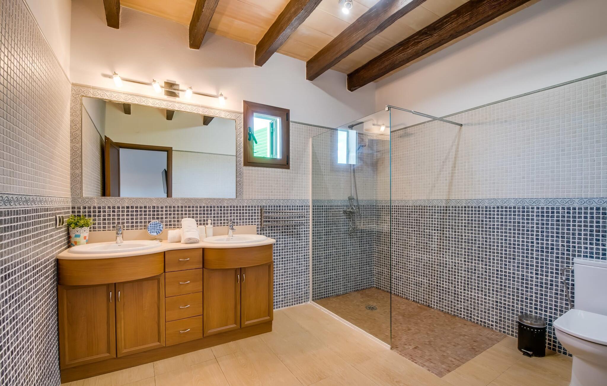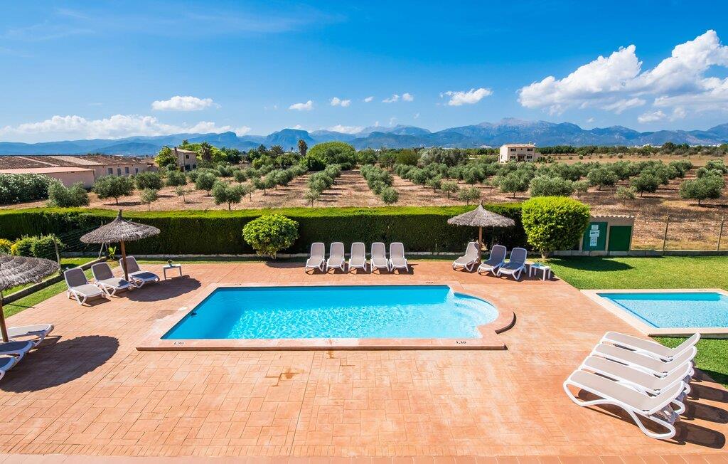 Villaen "Can Grau" er med sine 600 kvadratmeter boligareal en af de største og mest imponerende ejendomme i vores tilbud. På grund af sin størrelse og indretning med 16 dobbeltværelser og 15 badeværelser er villaen ideel til en stor familie eller store rejsegrupper. På grund af faciliteterne på anlægget kan enhver medrejsende altid nyde deres private rum fuldt ud. Når I booker for 24 personer (eller færre), får I en rabat. Rummelige terrasser, balkon og gårdhaver omgiver villaen "Can Grau", så I kan nyde den mallorcanske sol på ethvert tidspunkt af dagen og på en række yndlingssteder. I centrum af udendørsområdet ligger den skønne pool med nem trinadgang og en tilstødende skøn solterrasse. Lige ved siden af er der en særlig børnepool for små vandelskere. I denne del af ejendommen giver en kant af tætte planter følelsen af fuldstændig privatliv og afsondrethed. I kan slappe af af hjertens lyst på de komfortable liggestole og nyde udsigten til den dybblå himmel. I tilfælde af at solen skinner for kraftigt, er der i alt ti parasoller til jeres rådighed. Vil I forfriske jer endnu mere, kan I bruge udendørsbruseren. Forskellige siddegrupper inviterer jer til at blive hængende i den luftige skygge på den overdækkede terrasse. Enhver, der går til den øverste altan, kan nyde en vidunderlig udsigt over det omkringliggende landskab derfra. Der er siddepladser til mindst ti personer omkring den enorme balkon med udsigt til poolområdet, som også kan nås via en udvendig trappe. Dette er et vidunderligt sted at sidde sammen i en hyggelig atmosfære og måske nyde et middelhavsmåltid sammen eller fejre afslutningen på en vidunderlig feriedag i en festlig atmosfære. Hvis I har lyst til at være vært for et kulinarisk grillarrangement, kan I bruge den indbyggede grill, der er installeret nær den nederste terrasse. Når man træder ind i villaens indre, som også har ikke kun smukke, men også meget originale naturstensfacader, støder man på den nederste stue med en ekstremt stor komfortabel sofa og et rustikt spisebord til seks personer. Fjernsynet og pejsen er bekvemt installeret i dette rum. Det klassisk indrettede køkken er nemt at vedligeholde og er fuldt udstyret, herunder en kedel og en kaffemaskine. Et meget lignende layout kan findes på øverste etage (inklusive et andet køkken), i et praktisk og attraktivt design, med plads nok til at føle sig godt tilpas. Der er også en pejs på denne første sal, som giver jer mulighed for at hygge jer i en hjemlig atmosfære på køligere aftener. En kæmpe stue/spisestue giver alle gæster i huset mulighed for at spise sammen og nyde deres fritid indendørs. Seks af de ni individuelt designede og for det meste airconditionerede soveværelser (hvoraf det ene er et gennemgående soveværelse, der fører til et andet soveværelse) har deres eget badeværelse. Alle 11 badeværelser har et behageligt, lyst design, moderne indretning og nogle er udstyret med smukke, typiske mallorcanske grænser. En original og unik bonus er de to ekstra selvforplejningsrum i nabobygningerne, som blev nybygget i 2017. Den ene tilbyder overnatning for op til seks personer, med tre soveværelser med dobbeltsenge, to badeværelser med bruser, et køkken og en spisestue og stue. Den tredje stue har fire soveværelser med dobbeltsenge, to bruserum, et køkken, en spisestue og en stue. Det første og andet rum er til rådighed for grupper på op til 24 personer; Grupper på 32 personer eller mere kan bruge hele ejendommen. Vil I en tur ind til byen for at shoppe, kan I hurtigt nå en storby som Inca. Dette er et fantastisk sted at købe sko, da denne by har en lang tradition inden for alt hvad angår læderprodukter og sko. I vil måske besøge det ugentlige marked i Sineu, som finder sted hver onsdag. For en afslappende dag på stranden, prøv den smukke bugt Alcúdia eller Playa del Muro. Golfelskere vil få noget for pengene: Puntiro golfbane er omkring 25 minutter væk i bil. Den storslåede, kæmpe villa “Can Grau” ligger mellem Inca og Sencelles, midt på Mallorca. Herfra har I en fantastisk udsigt over det smukke omkringliggende landskab. I Sencelles og Inca kan I gøre jeres daglige indkøb perfekt. Ejendommens bekvemme beliggenhed giver mulighed for ture til mange af øens strande, herunder Es Trenc, Son Serra de Marina og Arenal.