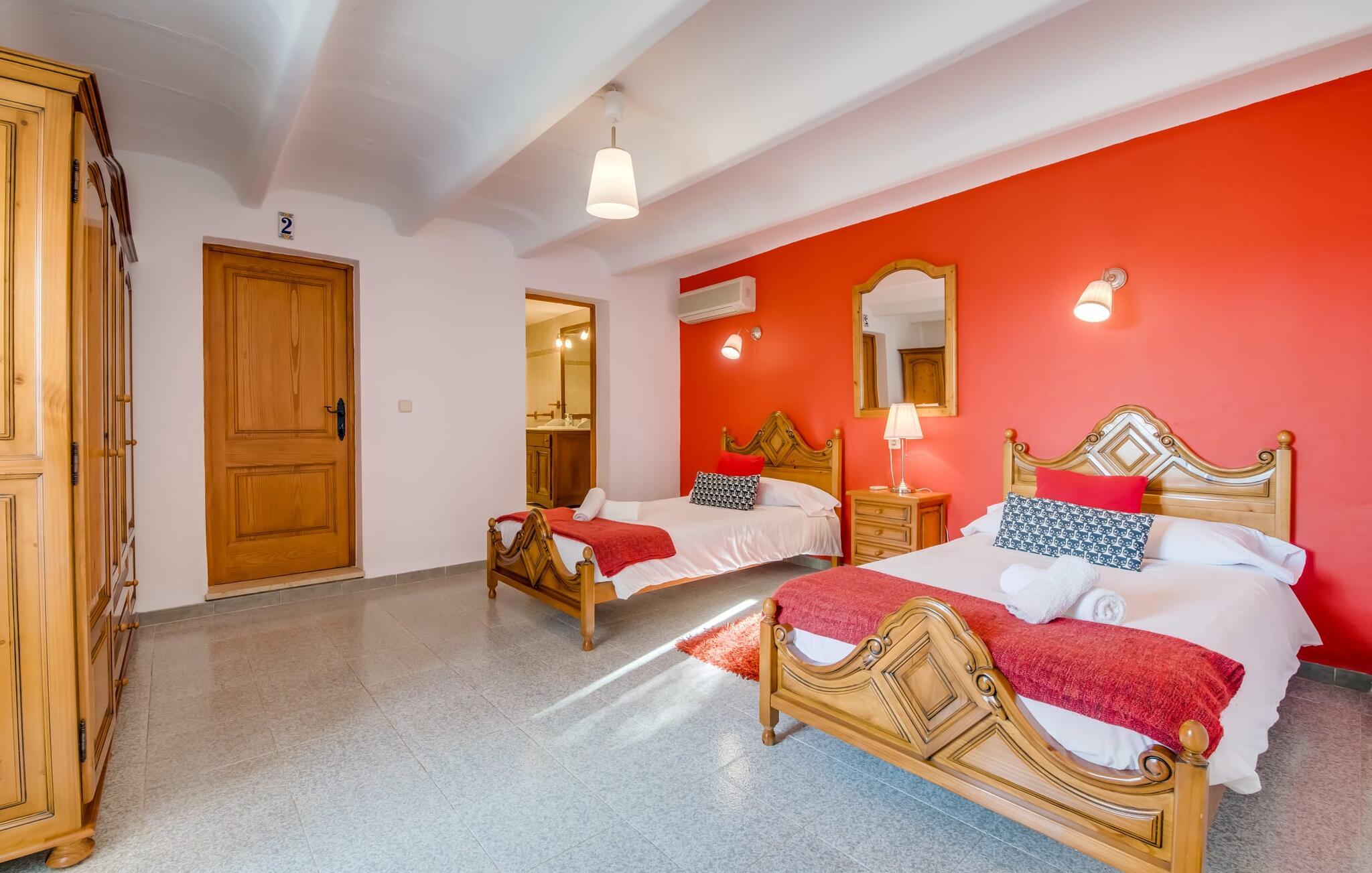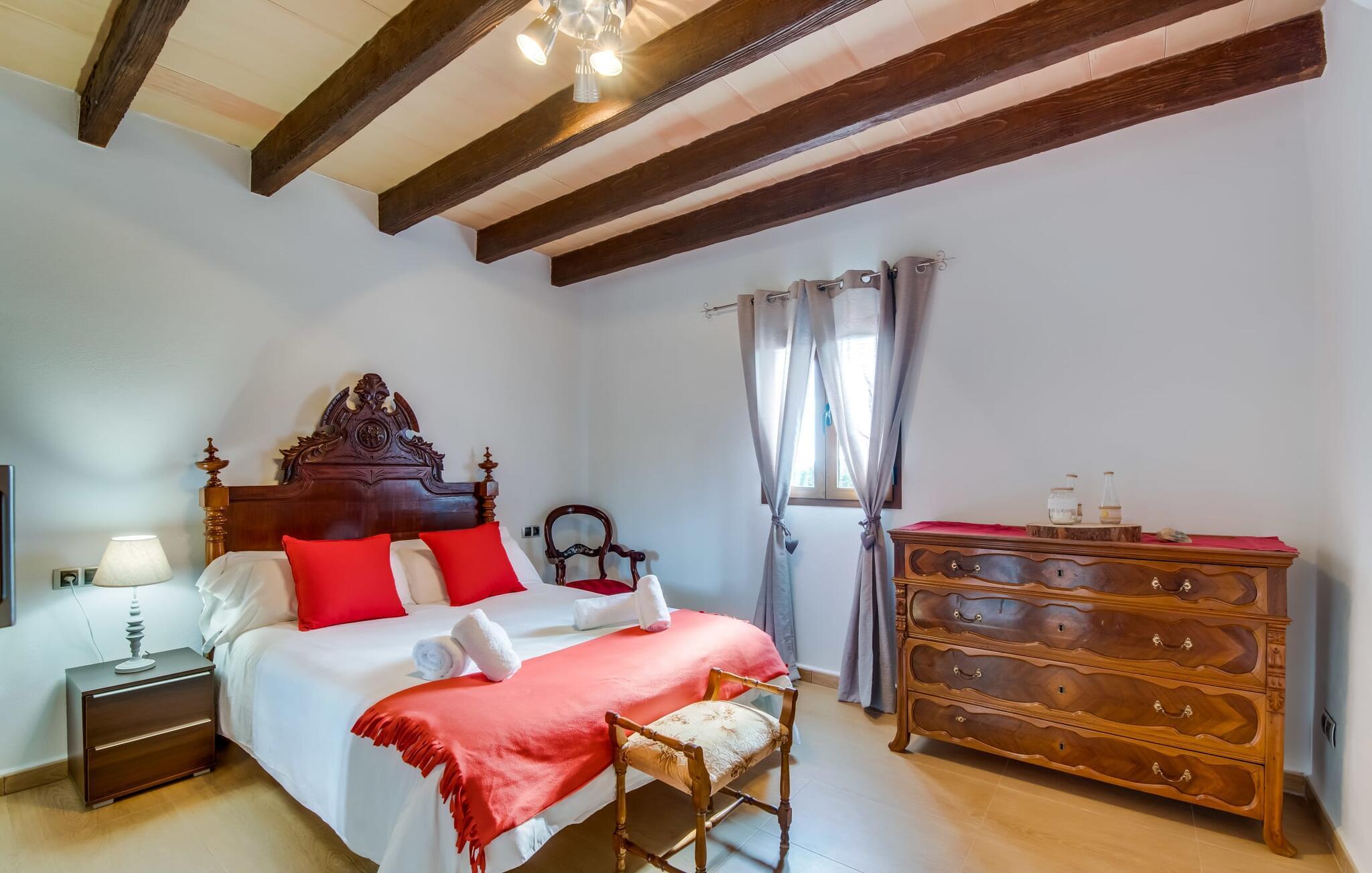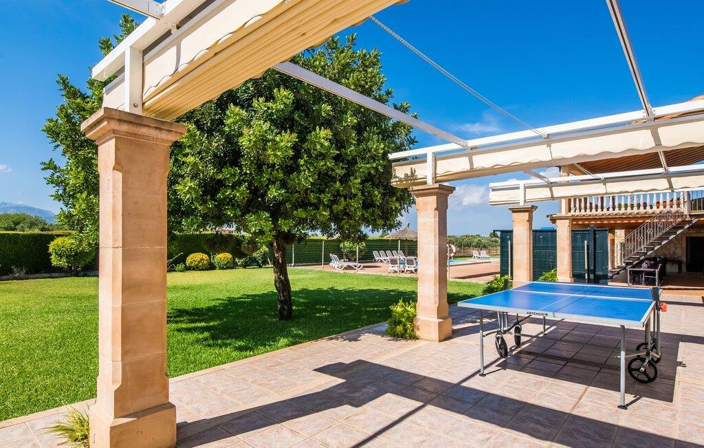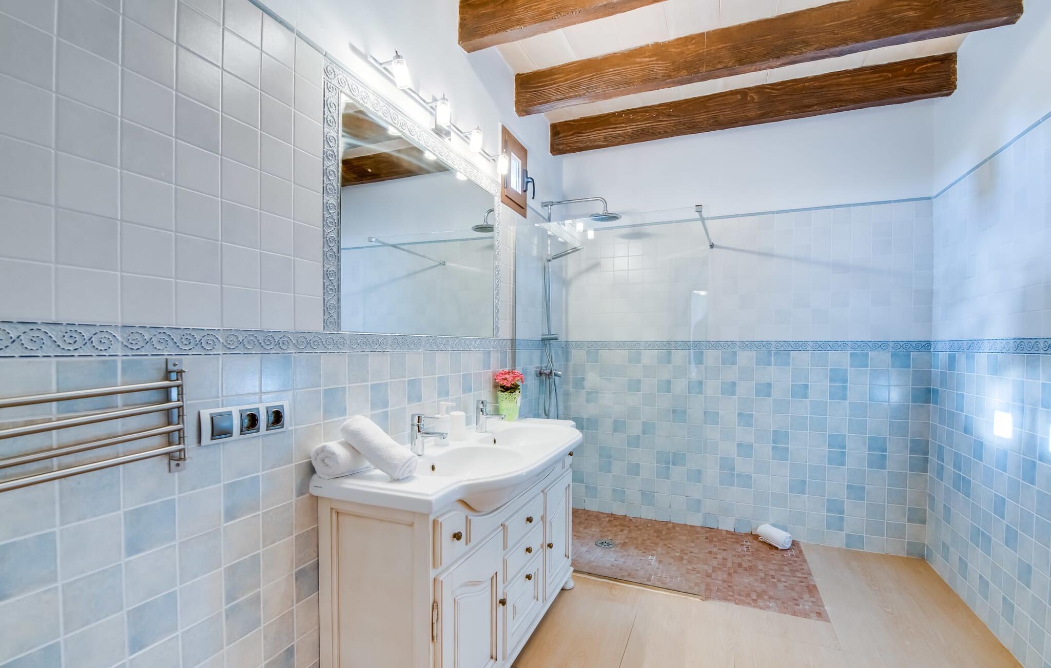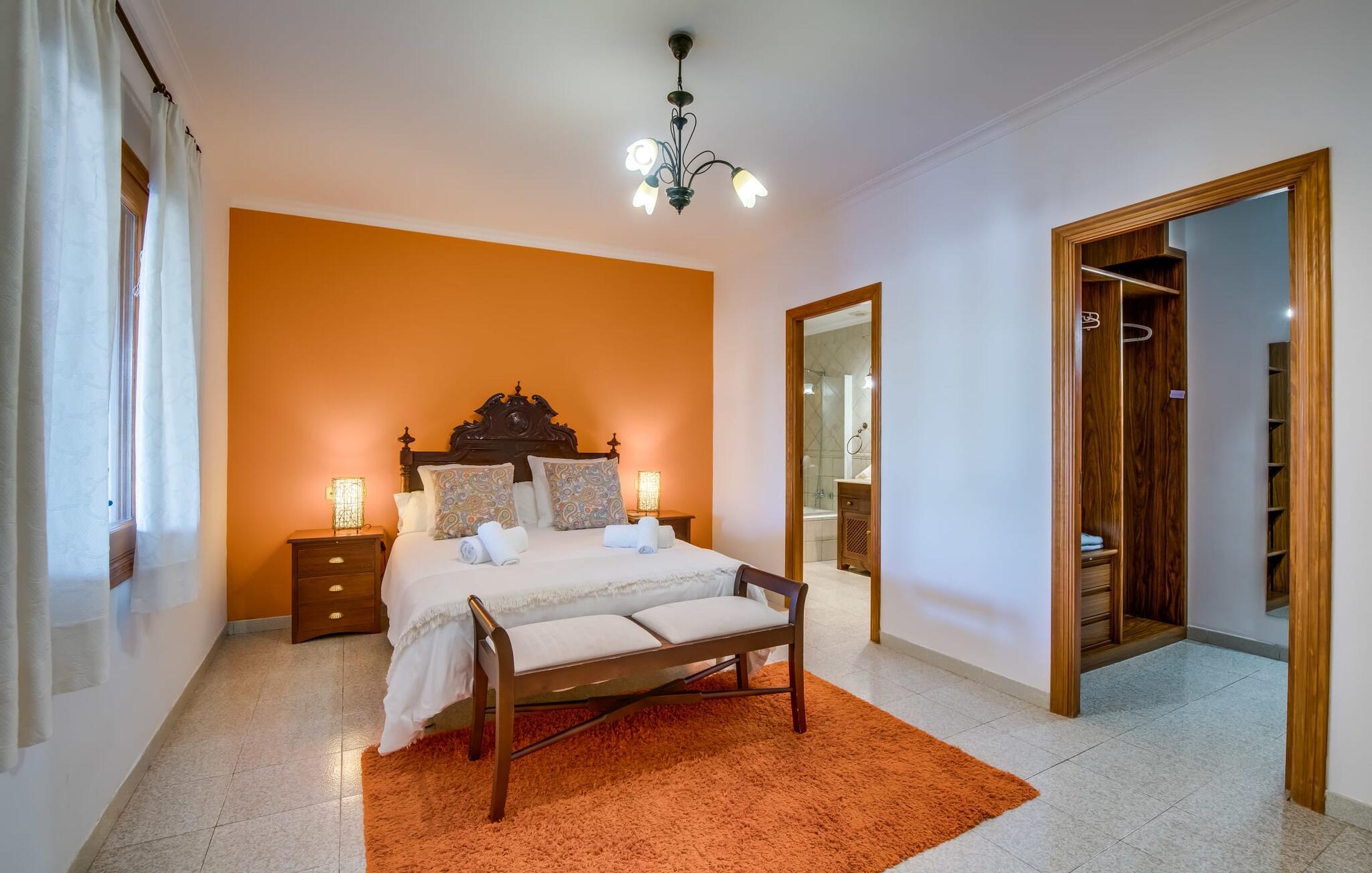 Villaen "Can Grau" er med sine 600 kvadratmeter boligareal en af de største og mest imponerende ejendomme i vores tilbud. På grund af sin størrelse og indretning med 16 dobbeltværelser og 15 badeværelser er villaen ideel til en stor familie eller store rejsegrupper. På grund af faciliteterne på anlægget kan enhver medrejsende altid nyde deres private rum fuldt ud. Når I booker for 24 personer (eller færre), får I en rabat. Rummelige terrasser, balkon og gårdhaver omgiver villaen "Can Grau", så I kan nyde den mallorcanske sol på ethvert tidspunkt af dagen og på en række yndlingssteder. I centrum af udendørsområdet ligger den skønne pool med nem trinadgang og en tilstødende skøn solterrasse. Lige ved siden af er der en særlig børnepool for små vandelskere. I denne del af ejendommen giver en kant af tætte planter følelsen af fuldstændig privatliv og afsondrethed. I kan slappe af af hjertens lyst på de komfortable liggestole og nyde udsigten til den dybblå himmel. I tilfælde af at solen skinner for kraftigt, er der i alt ti parasoller til jeres rådighed. Vil I forfriske jer endnu mere, kan I bruge udendørsbruseren. Forskellige siddegrupper inviterer jer til at blive hængende i den luftige skygge på den overdækkede terrasse. Enhver, der går til den øverste altan, kan nyde en vidunderlig udsigt over det omkringliggende landskab derfra. Der er siddepladser til mindst ti personer omkring den enorme balkon med udsigt til poolområdet, som også kan nås via en udvendig trappe. Dette er et vidunderligt sted at sidde sammen i en hyggelig atmosfære og måske nyde et middelhavsmåltid sammen eller fejre afslutningen på en vidunderlig feriedag i en festlig atmosfære. Hvis I har lyst til at være vært for et kulinarisk grillarrangement, kan I bruge den indbyggede grill, der er installeret nær den nederste terrasse. Når man træder ind i villaens indre, som også har ikke kun smukke, men også meget originale naturstensfacader, støder man på den nederste stue med en ekstremt stor komfortabel sofa og et rustikt spisebord til seks personer. Fjernsynet og pejsen er bekvemt installeret i dette rum. Det klassisk indrettede køkken er nemt at vedligeholde og er fuldt udstyret, herunder en kedel og en kaffemaskine. Et meget lignende layout kan findes på øverste etage (inklusive et andet køkken), i et praktisk og attraktivt design, med plads nok til at føle sig godt tilpas. Der er også en pejs på denne første sal, som giver jer mulighed for at hygge jer i en hjemlig atmosfære på køligere aftener. En kæmpe stue/spisestue giver alle gæster i huset mulighed for at spise sammen og nyde deres fritid indendørs. Seks af de ni individuelt designede og for det meste airconditionerede soveværelser (hvoraf det ene er et gennemgående soveværelse, der fører til et andet soveværelse) har deres eget badeværelse. Alle 11 badeværelser har et behageligt, lyst design, moderne indretning og nogle er udstyret med smukke, typiske mallorcanske grænser. En original og unik bonus er de to ekstra selvforplejningsrum i nabobygningerne, som blev nybygget i 2017. Den ene tilbyder overnatning for op til seks personer, med tre soveværelser med dobbeltsenge, to badeværelser med bruser, et køkken og en spisestue og stue. Den tredje stue har fire soveværelser med dobbeltsenge, to bruserum, et køkken, en spisestue og en stue. Det første og andet rum er til rådighed for grupper på op til 24 personer; Grupper på 32 personer eller mere kan bruge hele ejendommen. Vil I en tur ind til byen for at shoppe, kan I hurtigt nå en storby som Inca. Dette er et fantastisk sted at købe sko, da denne by har en lang tradition inden for alt hvad angår læderprodukter og sko. I vil måske besøge det ugentlige marked i Sineu, som finder sted hver onsdag. For en afslappende dag på stranden, prøv den smukke bugt Alcúdia eller Playa del Muro. Golfelskere vil få noget for pengene: Puntiro golfbane er omkring 25 minutter væk i bil. Den storslåede, kæmpe villa “Can Grau” ligger mellem Inca og Sencelles, midt på Mallorca. Herfra har I en fantastisk udsigt over det smukke omkringliggende landskab. I Sencelles og Inca kan I gøre jeres daglige indkøb perfekt. Ejendommens bekvemme beliggenhed giver mulighed for ture til mange af øens strande, herunder Es Trenc, Son Serra de Marina og Arenal.