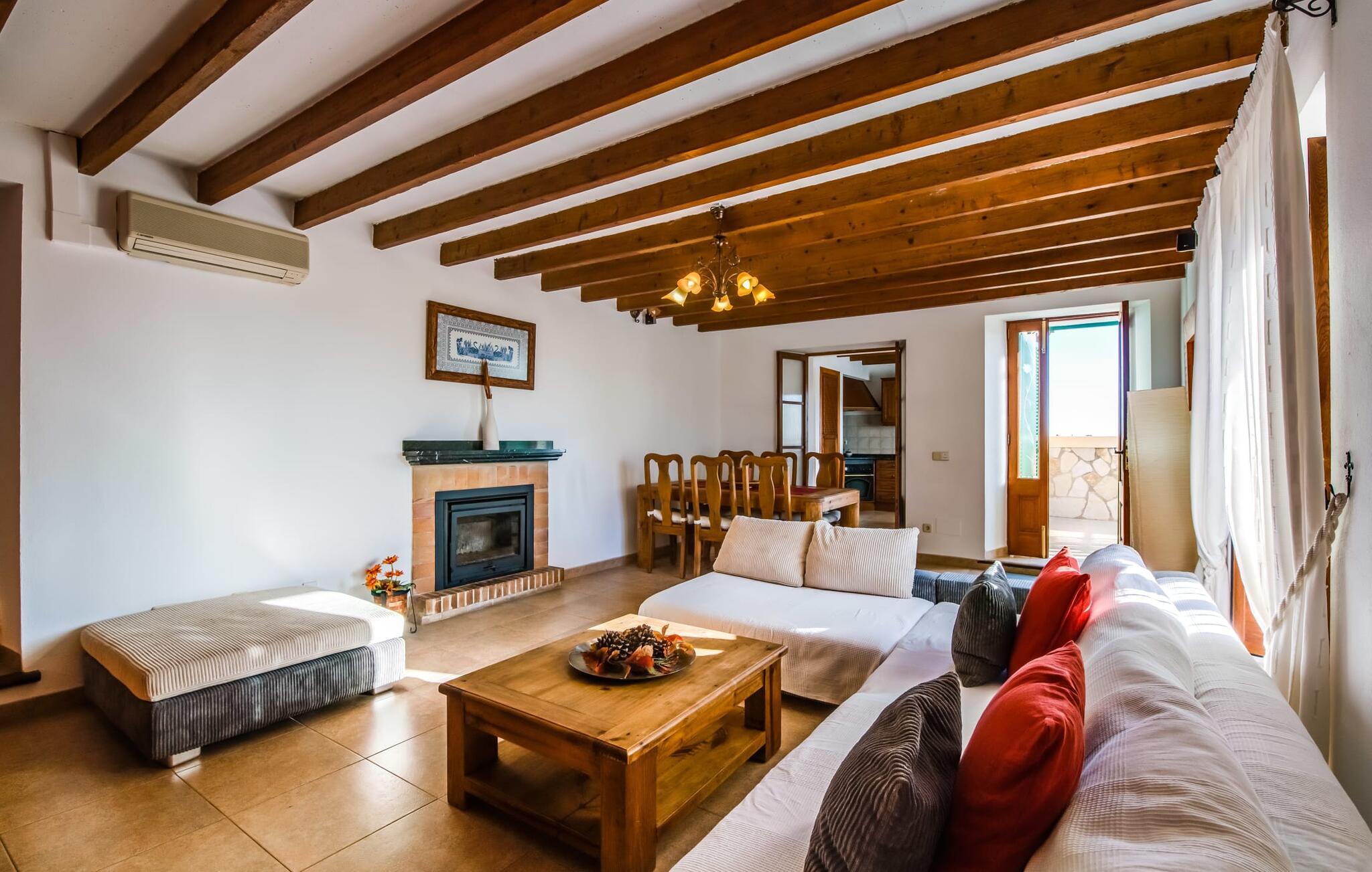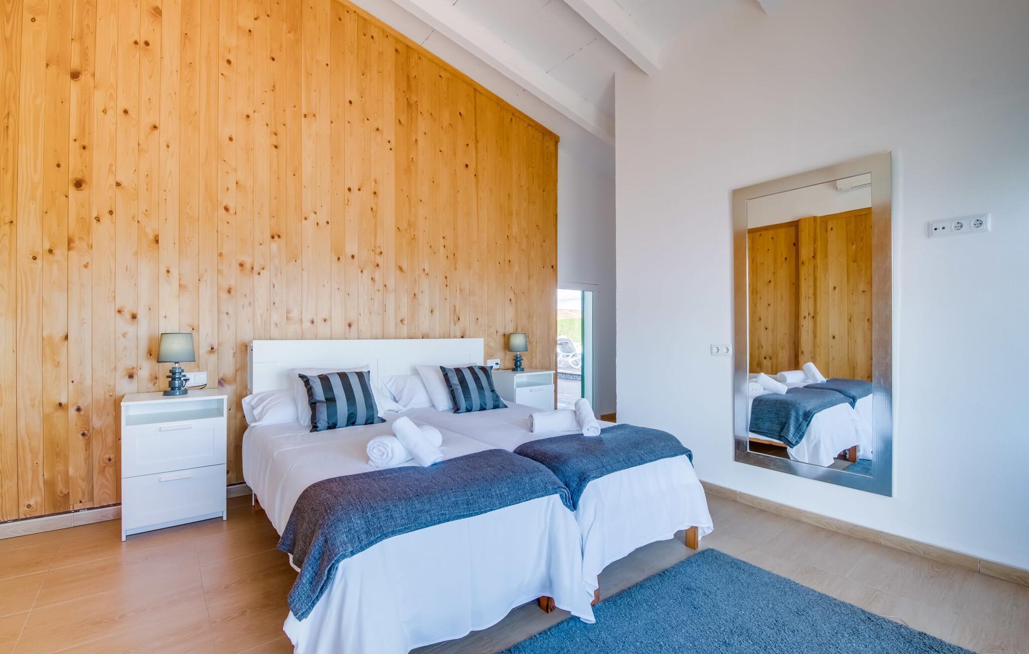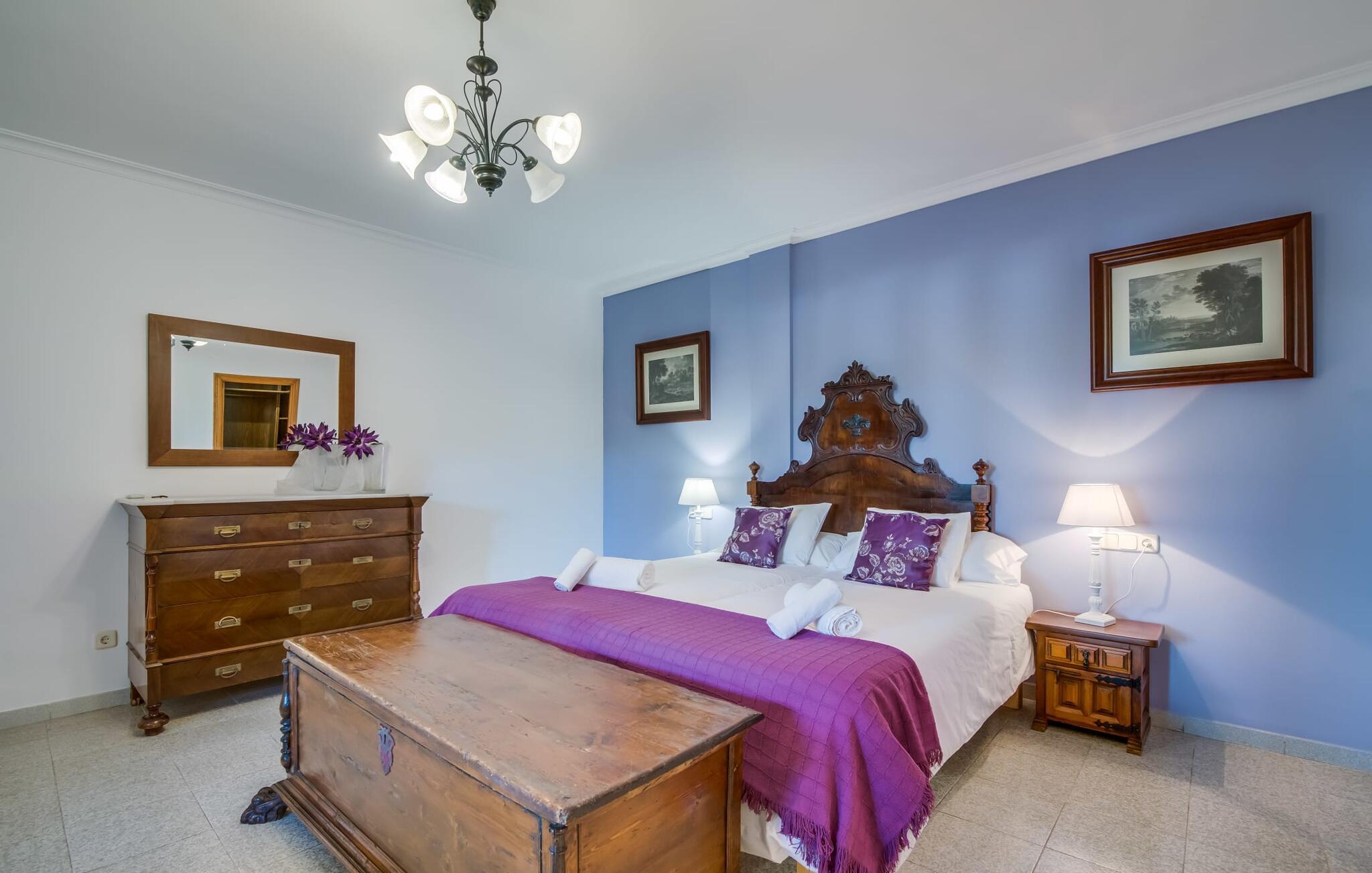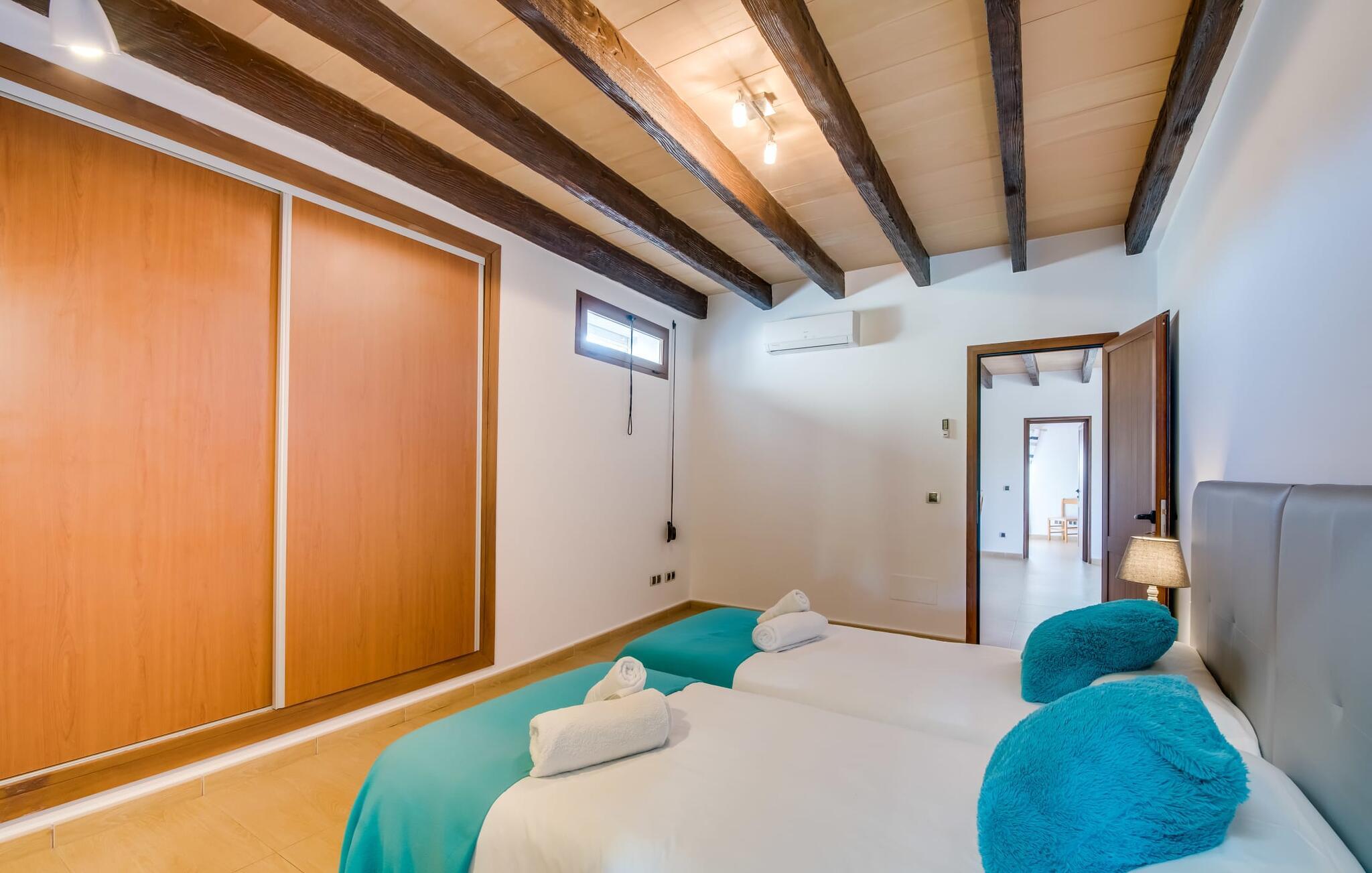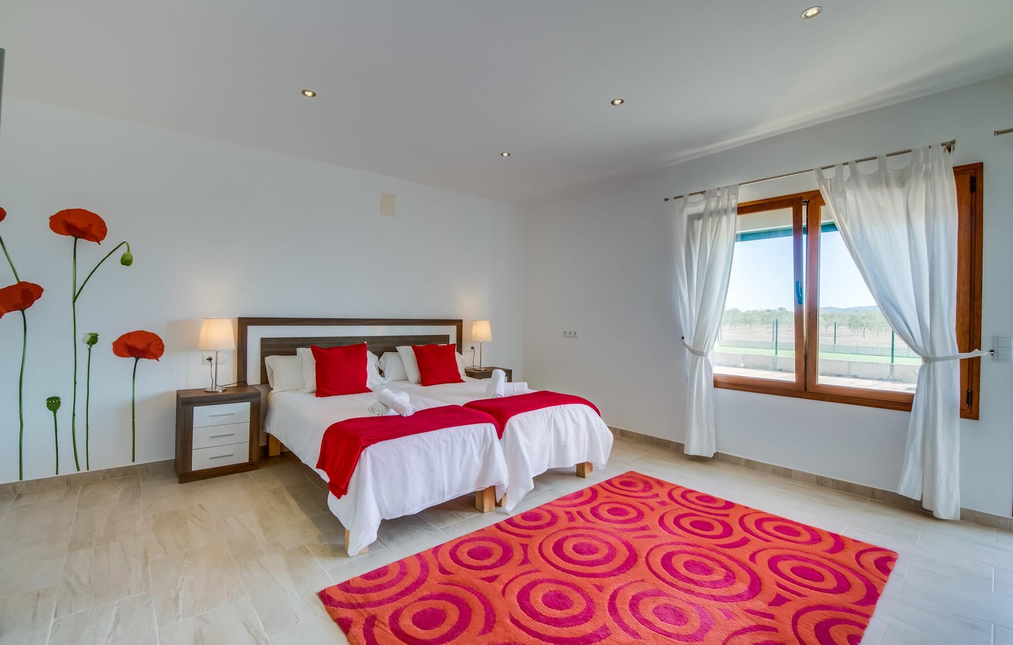 Villaen "Can Grau" er med sine 600 kvadratmeter boligareal en af de største og mest imponerende ejendomme i vores tilbud. På grund af sin størrelse og indretning med 16 dobbeltværelser og 15 badeværelser er villaen ideel til en stor familie eller store rejsegrupper. På grund af faciliteterne på anlægget kan enhver medrejsende altid nyde deres private rum fuldt ud. Når I booker for 24 personer (eller færre), får I en rabat. Rummelige terrasser, balkon og gårdhaver omgiver villaen "Can Grau", så I kan nyde den mallorcanske sol på ethvert tidspunkt af dagen og på en række yndlingssteder. I centrum af udendørsområdet ligger den skønne pool med nem trinadgang og en tilstødende skøn solterrasse. Lige ved siden af er der en særlig børnepool for små vandelskere. I denne del af ejendommen giver en kant af tætte planter følelsen af fuldstændig privatliv og afsondrethed. I kan slappe af af hjertens lyst på de komfortable liggestole og nyde udsigten til den dybblå himmel. I tilfælde af at solen skinner for kraftigt, er der i alt ti parasoller til jeres rådighed. Vil I forfriske jer endnu mere, kan I bruge udendørsbruseren. Forskellige siddegrupper inviterer jer til at blive hængende i den luftige skygge på den overdækkede terrasse. Enhver, der går til den øverste altan, kan nyde en vidunderlig udsigt over det omkringliggende landskab derfra. Der er siddepladser til mindst ti personer omkring den enorme balkon med udsigt til poolområdet, som også kan nås via en udvendig trappe. Dette er et vidunderligt sted at sidde sammen i en hyggelig atmosfære og måske nyde et middelhavsmåltid sammen eller fejre afslutningen på en vidunderlig feriedag i en festlig atmosfære. Hvis I har lyst til at være vært for et kulinarisk grillarrangement, kan I bruge den indbyggede grill, der er installeret nær den nederste terrasse. Når man træder ind i villaens indre, som også har ikke kun smukke, men også meget originale naturstensfacader, støder man på den nederste stue med en ekstremt stor komfortabel sofa og et rustikt spisebord til seks personer. Fjernsynet og pejsen er bekvemt installeret i dette rum. Det klassisk indrettede køkken er nemt at vedligeholde og er fuldt udstyret, herunder en kedel og en kaffemaskine. Et meget lignende layout kan findes på øverste etage (inklusive et andet køkken), i et praktisk og attraktivt design, med plads nok til at føle sig godt tilpas. Der er også en pejs på denne første sal, som giver jer mulighed for at hygge jer i en hjemlig atmosfære på køligere aftener. En kæmpe stue/spisestue giver alle gæster i huset mulighed for at spise sammen og nyde deres fritid indendørs. Seks af de ni individuelt designede og for det meste airconditionerede soveværelser (hvoraf det ene er et gennemgående soveværelse, der fører til et andet soveværelse) har deres eget badeværelse. Alle 11 badeværelser har et behageligt, lyst design, moderne indretning og nogle er udstyret med smukke, typiske mallorcanske grænser. En original og unik bonus er de to ekstra selvforplejningsrum i nabobygningerne, som blev nybygget i 2017. Den ene tilbyder overnatning for op til seks personer, med tre soveværelser med dobbeltsenge, to badeværelser med bruser, et køkken og en spisestue og stue. Den tredje stue har fire soveværelser med dobbeltsenge, to bruserum, et køkken, en spisestue og en stue. Det første og andet rum er til rådighed for grupper på op til 24 personer; Grupper på 32 personer eller mere kan bruge hele ejendommen. Vil I en tur ind til byen for at shoppe, kan I hurtigt nå en storby som Inca. Dette er et fantastisk sted at købe sko, da denne by har en lang tradition inden for alt hvad angår læderprodukter og sko. I vil måske besøge det ugentlige marked i Sineu, som finder sted hver onsdag. For en afslappende dag på stranden, prøv den smukke bugt Alcúdia eller Playa del Muro. Golfelskere vil få noget for pengene: Puntiro golfbane er omkring 25 minutter væk i bil. Den storslåede, kæmpe villa “Can Grau” ligger mellem Inca og Sencelles, midt på Mallorca. Herfra har I en fantastisk udsigt over det smukke omkringliggende landskab. I Sencelles og Inca kan I gøre jeres daglige indkøb perfekt. Ejendommens bekvemme beliggenhed giver mulighed for ture til mange af øens strande, herunder Es Trenc, Son Serra de Marina og Arenal.