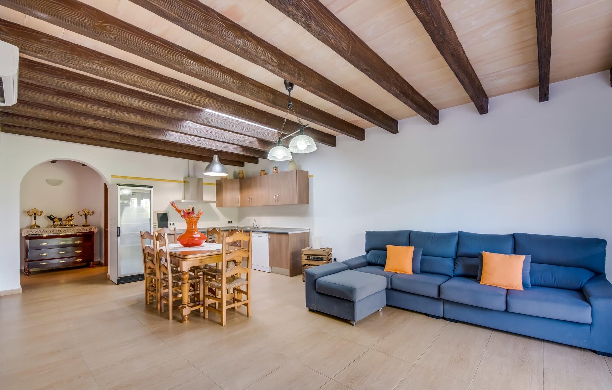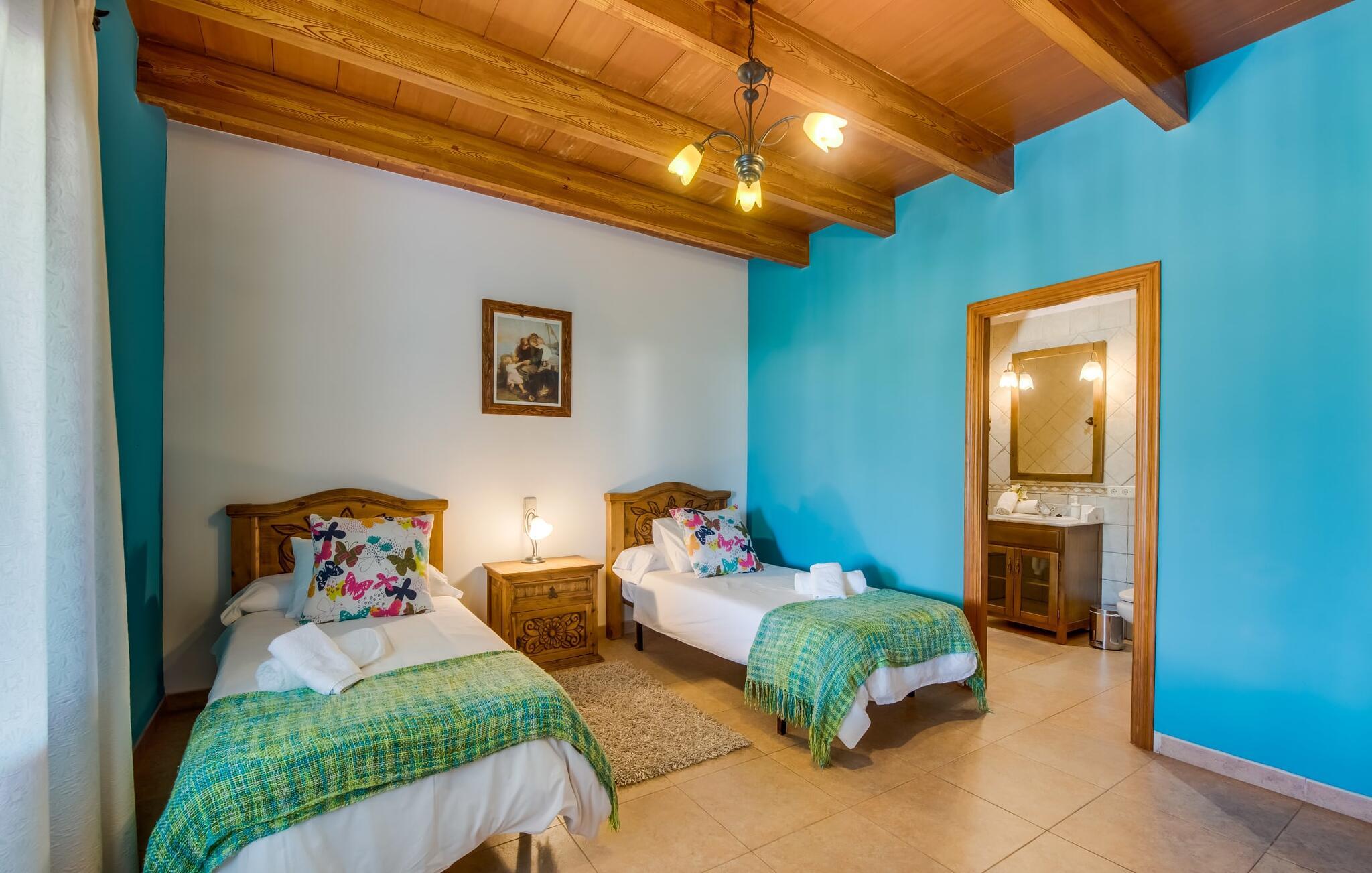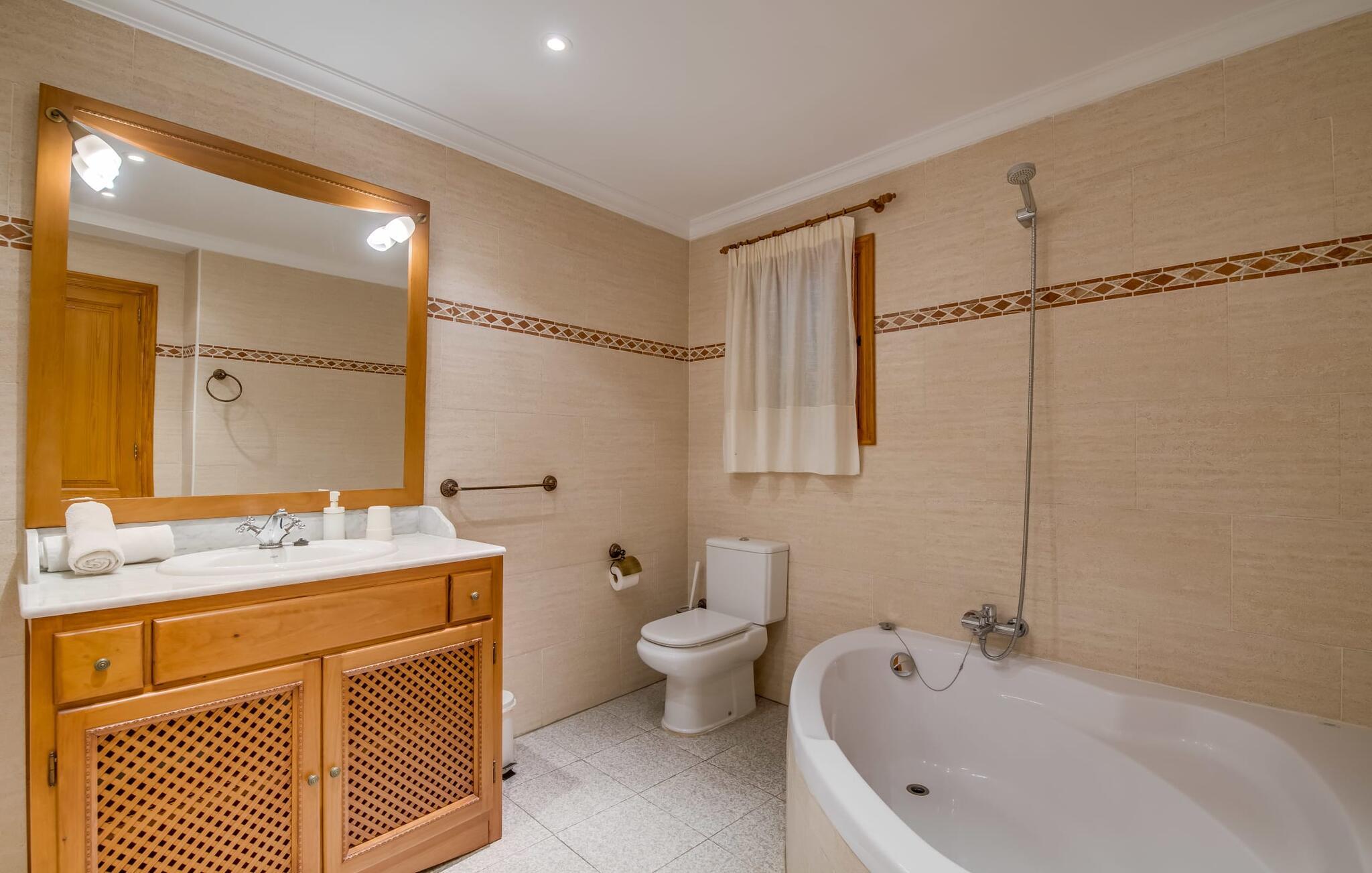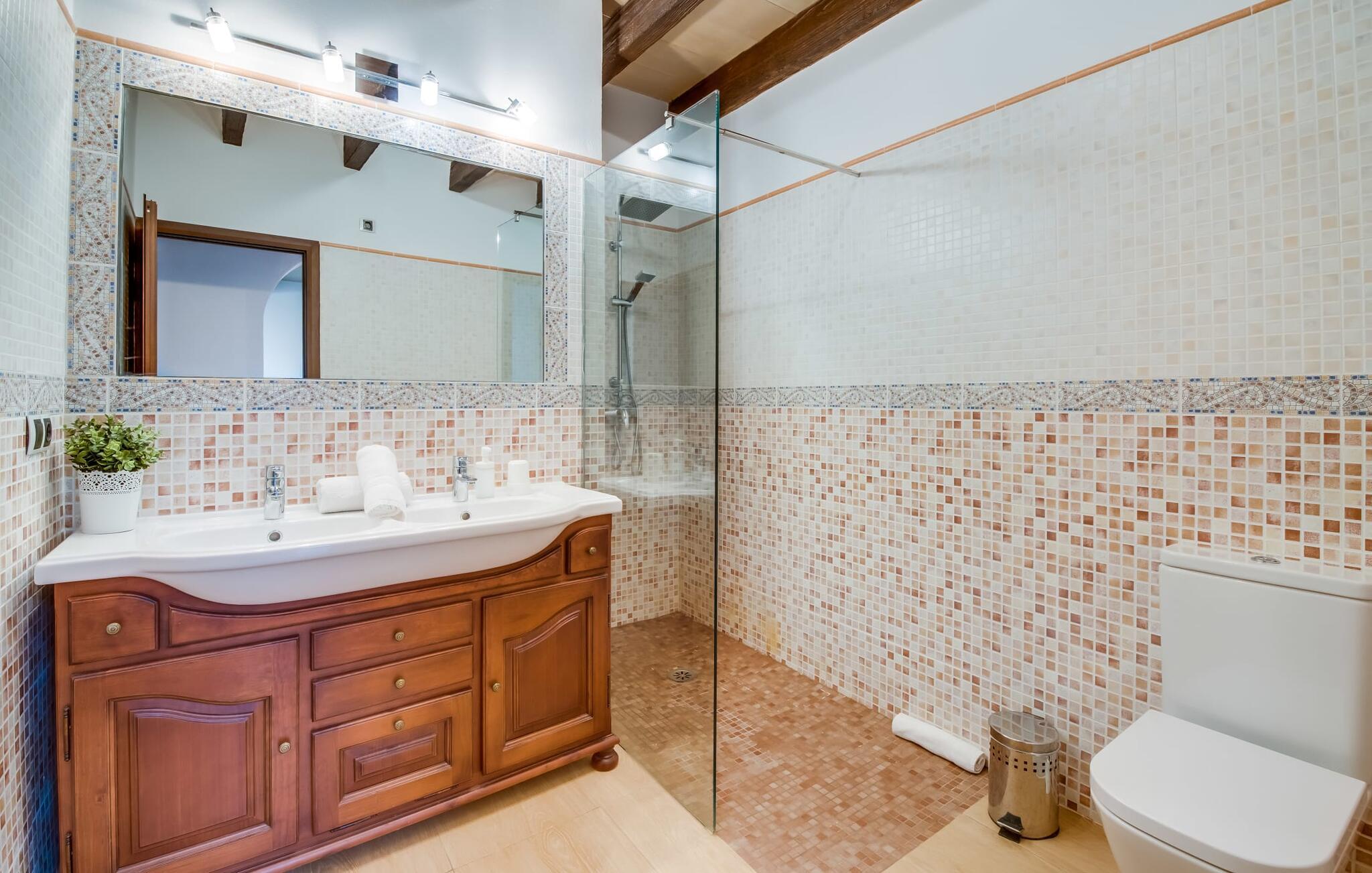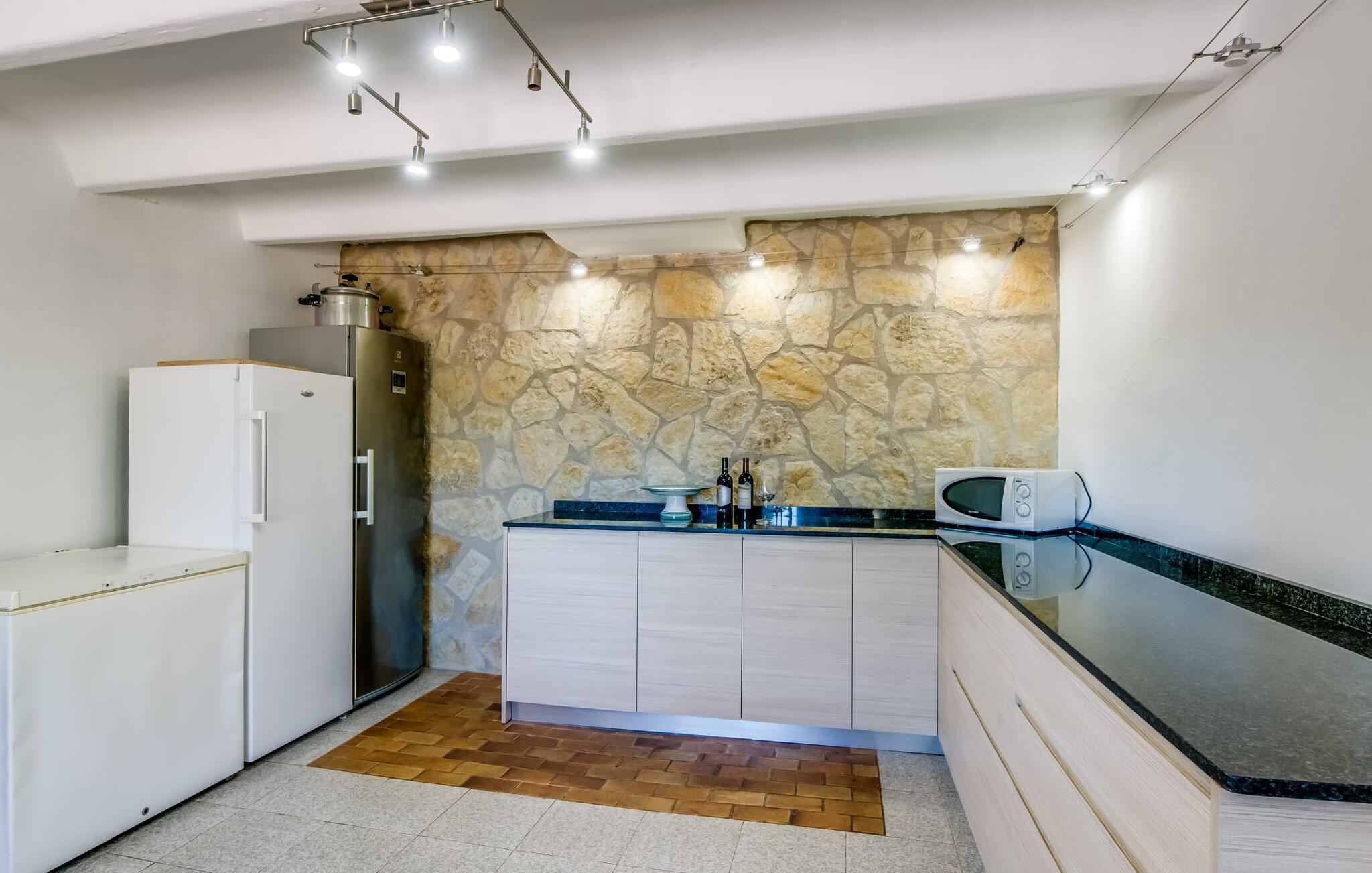 Villaen "Can Grau" er med sine 600 kvadratmeter boligareal en af de største og mest imponerende ejendomme i vores tilbud. På grund af sin størrelse og indretning med 16 dobbeltværelser og 15 badeværelser er villaen ideel til en stor familie eller store rejsegrupper. På grund af faciliteterne på anlægget kan enhver medrejsende altid nyde deres private rum fuldt ud. Når I booker for 24 personer (eller færre), får I en rabat. Rummelige terrasser, balkon og gårdhaver omgiver villaen "Can Grau", så I kan nyde den mallorcanske sol på ethvert tidspunkt af dagen og på en række yndlingssteder. I centrum af udendørsområdet ligger den skønne pool med nem trinadgang og en tilstødende skøn solterrasse. Lige ved siden af er der en særlig børnepool for små vandelskere. I denne del af ejendommen giver en kant af tætte planter følelsen af fuldstændig privatliv og afsondrethed. I kan slappe af af hjertens lyst på de komfortable liggestole og nyde udsigten til den dybblå himmel. I tilfælde af at solen skinner for kraftigt, er der i alt ti parasoller til jeres rådighed. Vil I forfriske jer endnu mere, kan I bruge udendørsbruseren. Forskellige siddegrupper inviterer jer til at blive hængende i den luftige skygge på den overdækkede terrasse. Enhver, der går til den øverste altan, kan nyde en vidunderlig udsigt over det omkringliggende landskab derfra. Der er siddepladser til mindst ti personer omkring den enorme balkon med udsigt til poolområdet, som også kan nås via en udvendig trappe. Dette er et vidunderligt sted at sidde sammen i en hyggelig atmosfære og måske nyde et middelhavsmåltid sammen eller fejre afslutningen på en vidunderlig feriedag i en festlig atmosfære. Hvis I har lyst til at være vært for et kulinarisk grillarrangement, kan I bruge den indbyggede grill, der er installeret nær den nederste terrasse. Når man træder ind i villaens indre, som også har ikke kun smukke, men også meget originale naturstensfacader, støder man på den nederste stue med en ekstremt stor komfortabel sofa og et rustikt spisebord til seks personer. Fjernsynet og pejsen er bekvemt installeret i dette rum. Det klassisk indrettede køkken er nemt at vedligeholde og er fuldt udstyret, herunder en kedel og en kaffemaskine. Et meget lignende layout kan findes på øverste etage (inklusive et andet køkken), i et praktisk og attraktivt design, med plads nok til at føle sig godt tilpas. Der er også en pejs på denne første sal, som giver jer mulighed for at hygge jer i en hjemlig atmosfære på køligere aftener. En kæmpe stue/spisestue giver alle gæster i huset mulighed for at spise sammen og nyde deres fritid indendørs. Seks af de ni individuelt designede og for det meste airconditionerede soveværelser (hvoraf det ene er et gennemgående soveværelse, der fører til et andet soveværelse) har deres eget badeværelse. Alle 11 badeværelser har et behageligt, lyst design, moderne indretning og nogle er udstyret med smukke, typiske mallorcanske grænser. En original og unik bonus er de to ekstra selvforplejningsrum i nabobygningerne, som blev nybygget i 2017. Den ene tilbyder overnatning for op til seks personer, med tre soveværelser med dobbeltsenge, to badeværelser med bruser, et køkken og en spisestue og stue. Den tredje stue har fire soveværelser med dobbeltsenge, to bruserum, et køkken, en spisestue og en stue. Det første og andet rum er til rådighed for grupper på op til 24 personer; Grupper på 32 personer eller mere kan bruge hele ejendommen. Vil I en tur ind til byen for at shoppe, kan I hurtigt nå en storby som Inca. Dette er et fantastisk sted at købe sko, da denne by har en lang tradition inden for alt hvad angår læderprodukter og sko. I vil måske besøge det ugentlige marked i Sineu, som finder sted hver onsdag. For en afslappende dag på stranden, prøv den smukke bugt Alcúdia eller Playa del Muro. Golfelskere vil få noget for pengene: Puntiro golfbane er omkring 25 minutter væk i bil. Den storslåede, kæmpe villa “Can Grau” ligger mellem Inca og Sencelles, midt på Mallorca. Herfra har I en fantastisk udsigt over det smukke omkringliggende landskab. I Sencelles og Inca kan I gøre jeres daglige indkøb perfekt. Ejendommens bekvemme beliggenhed giver mulighed for ture til mange af øens strande, herunder Es Trenc, Son Serra de Marina og Arenal.