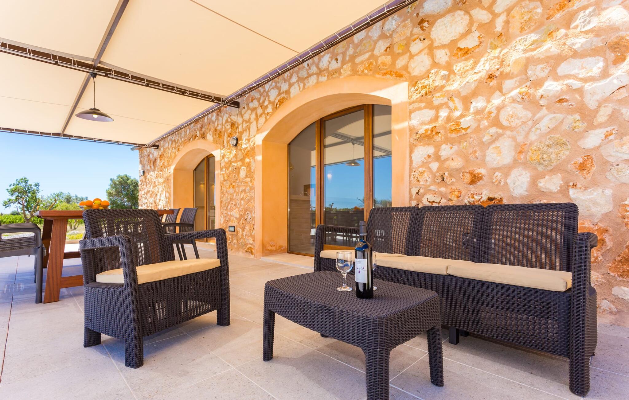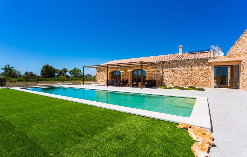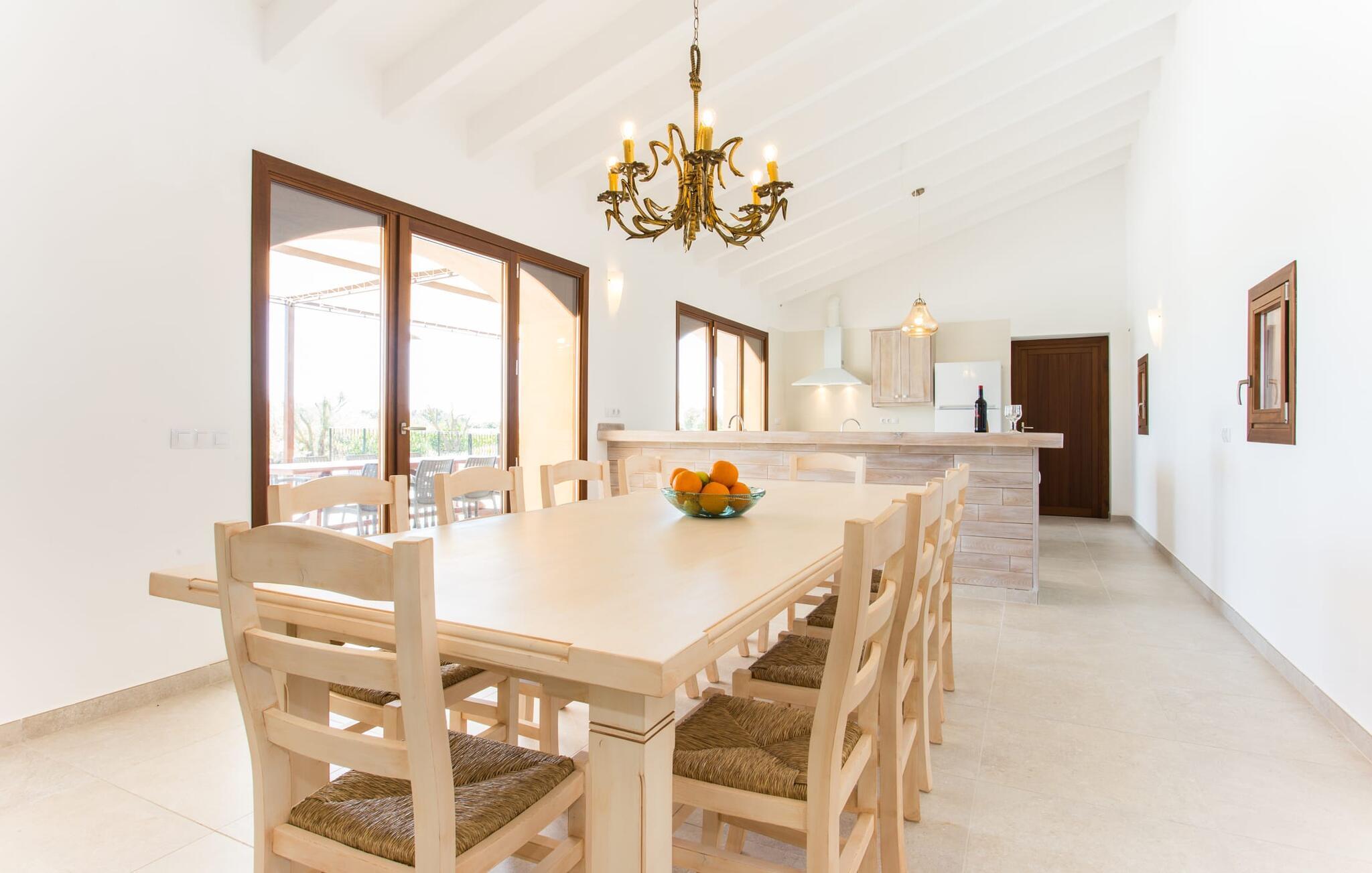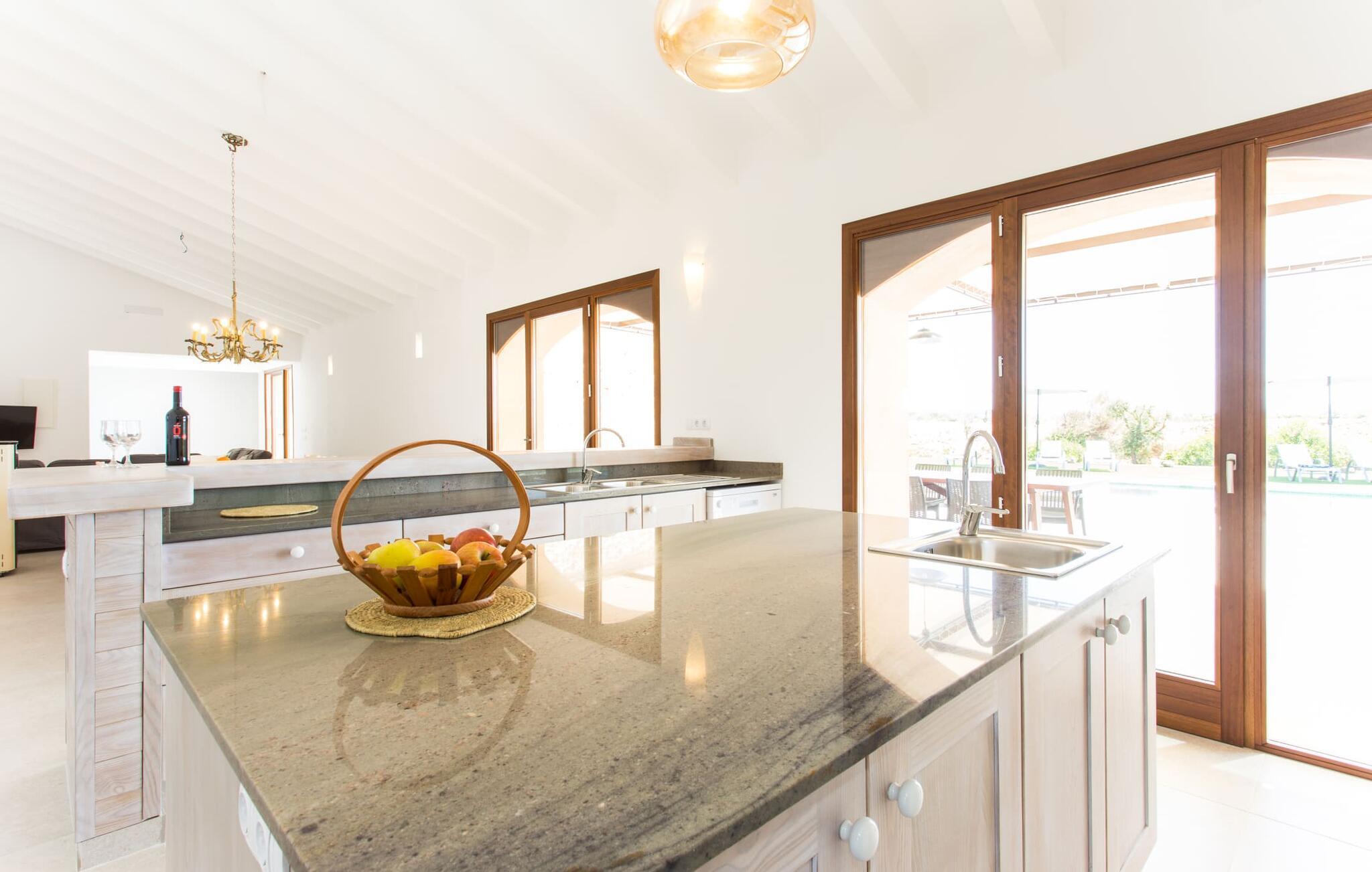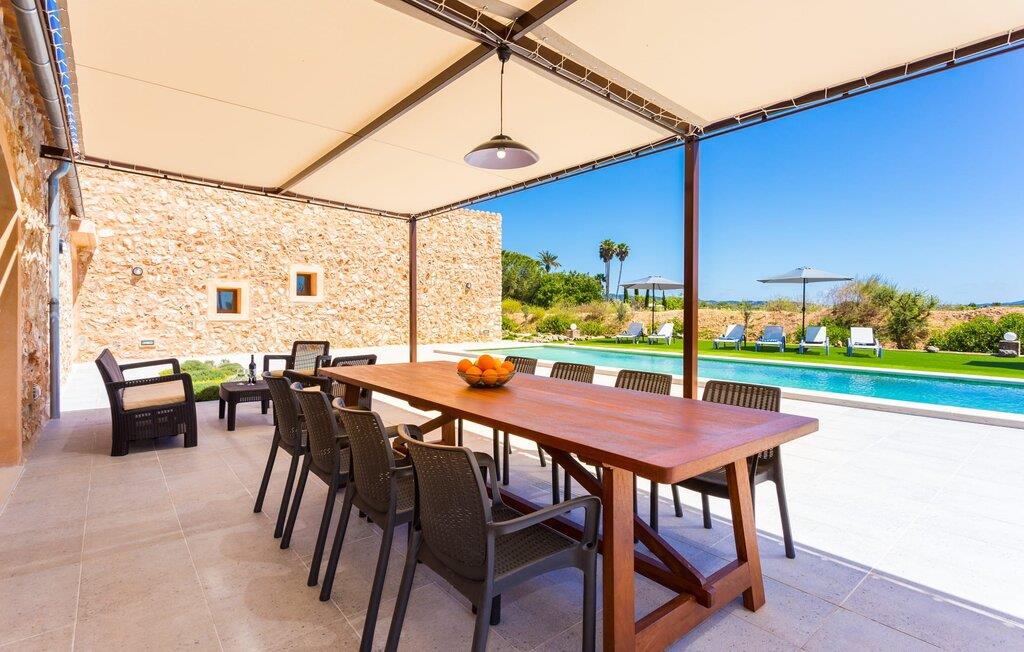 "Can Gusti" er bygget til jer. Til jeres behov, til jeres krav, til jeres afslapning. Den L-formede bygning opfylder perfekt kravene til et indbydende nyt hus og afspejler med sin stenfacade også den mallorcanske landstedstradition. Samme indtryk opstår på den rummelige ejendom med talrige træer - gamle og nyplantede - og et landligt miljø præget af landbrugsaktivitet. Hegn i nærheden af haven, pool og terrasseområder er ikke påkrævet, da der ikke er nogen naboer i syne. Afslappende liggestole venter på jer på det frodige grønne kunstgræs. Parasoller, som af og til er nødvendige for beskyttelse, når solen er for stærk, er også tilgængelige. Den turkise, mosaikbelagte pool med en let trappet indgang er ret smal, men samtidig lang nok til komfortabelt at svømme i længder. Svømmehallen er på den ene side omkranset af græsplænen og på den anden side af terrassen, der strækker sig til bygningen og er delvist overdækket af en markise. Herunder finder I ikke kun et langt træbord med smarte stole i rattanlook, men også et hyggeligt loungehjørne. Med en mobil gasgrill er der intet i vejen for en skøn grillaften. Indretningen er en fuldstændig afvigelse fra den klassiske mallorcanske stil, men det er på ingen måde skuffende. Det er indbydende lyst, ikke kun på grund af de store terrassedøre i glas, der fører ud til terrassen. Strålende vægge, hvide loftsbjælker og matte sandstensgulvfliser står kun i kontrast til det naturlige træ i de mørke vindues- og dørkarme. Den sarte farvepalet går igen i den åbne stue med et væghængt tv og er desuden udstyret med elegante antracitfarvede hyggesofaer. Det lange spisebord i lyst vintage-look skaber forbindelse til køkkenet, som kun er adskilt af en elegant disk. Bagved er et fuldt udstyret landstedskøkken med et hvidkalket look, som har alle de tekniske faciliteter, I har brug for til en afslappet ferie med selvforplejning. Alle fire soveværelser er på samme etage. Disse er også lyse, venlige og attraktive og giver plads nok til at opbevare jeres feriegarderobe. Det store soveværelse har eget badeværelse, de to andre badeværelser er frit tilgængelige fra gangen. Badeværelset har et trendy og moderne design: brusekabiner i gulvniveau med regnbruser samt eksklusive fliser i trælook, sten eller grå mosaik - hver individuelt designet. Ferie på højt niveau – denne smukke nye villa hører uden tvivl til i denne kategori. Villaen er desuden drevet af klimavenlig solenergi, hvorfor installation af poolbelysning, aircondition og andre enheder, der forbruger meget energi, ikke er mulig. Beliggenheden spiller naturligvis også en vigtig rolle for at sikre en behagelig ferie, og også på dette punkt modtager villaen "Can Gusti" vores særlige anbefaling. Som I kan se på vores luftfotos, er det vidunderligt landligt og roligt og har ingen direkte naboer. Men det ville være en skam, hvis I ikke udforskede i det mindste noget af det skønne, som Mallorca har at byde på. Dette inkluderer at besøge byer som Felanitx eller Manacor og slentre gennem markederne der. Til sightseeing kan I også besøge øens vartegn, herunder klostret Sant Salvador, der ligger på et bjerg nær Felanitx, og også de talrige strande i øst, især den næsten uberørte badebugt Cala Varques og mange, mange, flere. Sportsentusiaster bør bestemt besøge Rafa Nadal Tennis Academy, som ligger kun omkring 8 km væk. Hvis I ikke kan passe alt ind i Villa Can Gusti ved jeres første besøg, skal I bare bestille igen næste år. En storslået villa venter på jer, selvom I er der for første gang. Det attraktive poolområde og de omfattende kunstgræsarealer er et sandt højdepunkt i den nye villa "Can Gusti". Ejendommen er beliggende i en vidunderlig rolig, landlig beliggenhed lige nord for Felanitx. I kan enten tage til Felanitx for at shoppe dagligvarer og andre fornødenheder, eller endda til Manacor for mere omfattende shoppingture. Der er kun 20 km til "Calas de Mallorca", de smukke sandstrande på østkysten - en behagelig afstand til en eftermiddagstur.