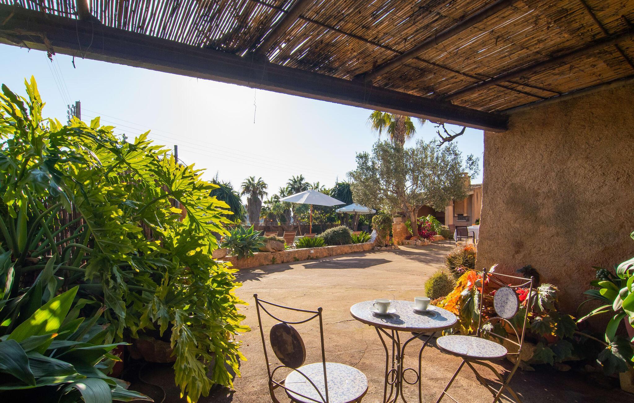 En oase på landet: Flankeret af to høje palmer, et knudret gammelt oliventræ og alverdens anden middelhavsvegetation, ligger bondehuset "Can Joan Roca" i den smukke sydlige del af øen og ved, hvordan man bringer en bred vifte af ferieønsker i harmoni. Det skyldes på den ene side det smukke, typisk mallorcanske hus og på den anden side de alsidige terrasseområder: varmt og solrigt eller behageligt skyggefuldt, overalt med en smuk udsigt over haven og poolen - hvor er din yndlingssted? Ganske vist er du forkælet med valg her. Måske holder du særligt af at slappe af på en af liggestolene lige ved poolen eller besøge det indbydende overdækkede udekøkken med spisebord? Man kan sidde helt udendørs direkte ved huset, som også byder på en hyggelig, luftig overdækket niche på siden. Udover poolen med nem trappeadgang er der også en praktisk udendørs bruser til en hurtig nedkøling. Interiøret er værdigt: Klassiske møbler, hist og her med antikke accenter, skaber en hyggelig atmosfære, hvor man kan ankomme og slappe af. Store terracotta fliser og synlige bjælker på lofterne skaber en hyggelig atmosfære. En kombineret stue-spisestue med brændeovn og TV byder på en række muligheder for at tilbringe selskabelige timer indendørs. Det fuldt udstyrede køkken er bekvemt placeret lige ved siden af. To charmerende soveværelser med dobbeltsenge, et med en-suite badeværelse og et andet badeværelse, er også placeret i stueetagen. På øverste etage er der yderligere to soveværelser med dobbeltsenge og eget badeværelse. Vinduerne på 1. sal giver en smuk udsigt over det omkringliggende område. Mallorcas typiske charme byder dig velkommen til denne bondegård, kun 5 minutters kørsel fra landsbyen S'Horta. Beliggende i det bakkede grønne landskab kan du nyde en afslappende og rolig ferie her. De nærmeste strande er omkring 6 km væk, og den smukke havn Portocolom er også omkring 6 km væk. Hvis du kan lide at spille golf, er det ikke langt fra "Can Joan Roca": Vall d'Or golfklubben er mindre end 4 km væk. Dette er et Fincallorca feriehus.
