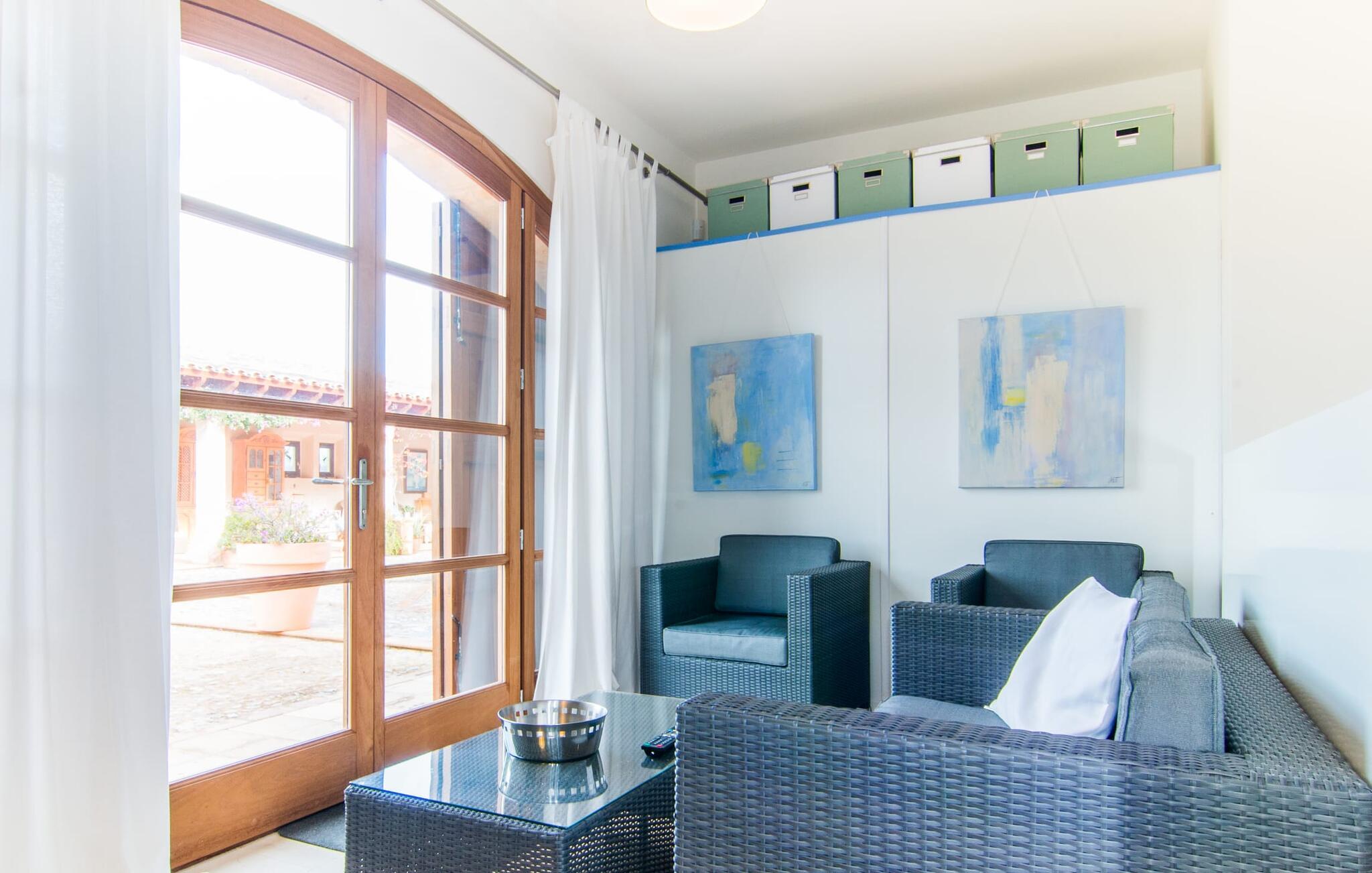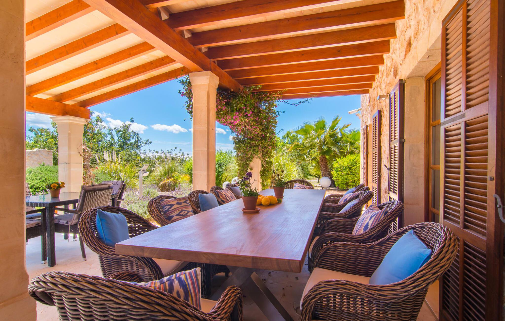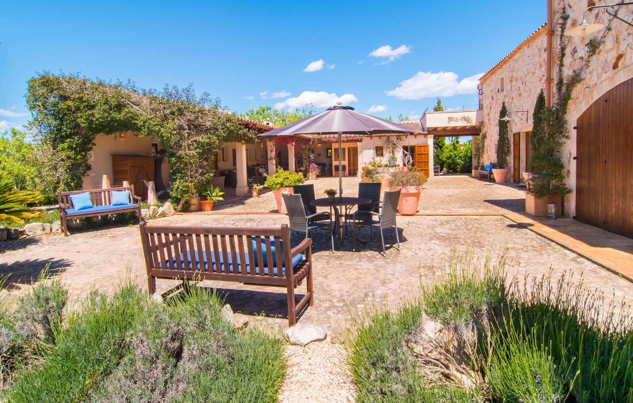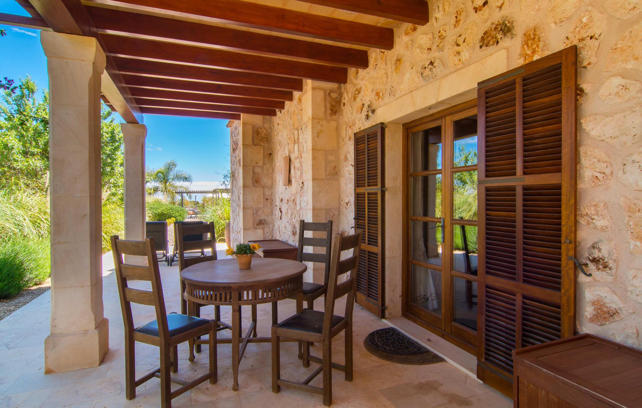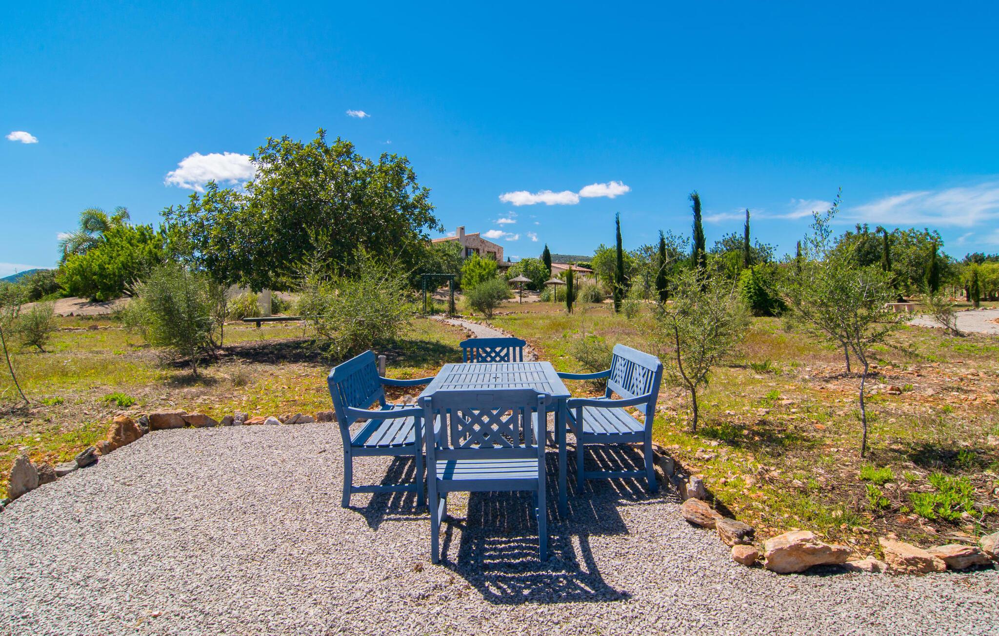 Du tager gerne imod den lidt ujævne tur over en grusvej, når sådan en juvel venter på jer – bliver de smukkeste skatte ikke nogle gange bevogtet af en drage? I “Can Joaquin” vil I føle, som om I har vundet hovedgevinsten i Fincallorca-lotteriet - I er sikret en plads på livets solside, hvad enten det er i det overdådige hovedhus, i det hyggelige gæstehjem eller i haven! Den rummelige ejendom, i typisk mallorcansk stil med to vindmøller, ligner et privat fritidsområde med korte gåture, swimmingpool, badmintonbane (hvor I endda kan spille volleyball), udendørs skakbræt, overdækket bordtennisbord og udstyret træningssti og en runde. pavillon med hængekøje til jeres konstante brugsaktivitet. Vi garanterer, at I ikke behøver at bekymre jer et øjeblik om, hvordan I eller jeres børn vil beskæftige sig under jeres ferie; Denne villa sikrer en chill faktor for unge og gamle og med en kærligt designet legeplads med sand, legeredskaber og et legehus, kommer børn med garanti ikke til at kede sig. Læg hertil det luksuriøse udekøkken i den enorme gårdhave og den store murstensgrill ved siden af poolterrassen, og I har alt hvad I behøver for at fejre udelivet og naturligt forlænge jeres dage ind i de lune sommernætter. Det ville dog være en skam ikke at kunne nyde ejendommens skønhed og privatliv og dens udsigt i fred; Der er et fantastisk udvalg af siddepladser, liggestole, bænke, stole, borde og terrasser bag halvkugleformede hække eller under træer og bougainvillea, enten med udsigt eller gemt væk. Brug først fitnessstien, og bliv derefter siestaens herre... Plantager som appelsiner, citroner, kiwier, æbler, vin, granatæbler, bananer, ferskner og avocadoer, som konstant tilføjes af ejerne, supplerer den frodige vegetation, gamle figentræer, som bærer den bedste frugt. I er selvfølgelig også velkommen til at prøve alt på det rigtige tidspunkt af året. Men lad os ikke glemme indersiden af villaen! En lur i huset kan være direkte fristende, når soveværelserne har aircondition og udgang til altanterrasse (det store soveværelse har to altaner med vidunderlig udsigt!) og er så luksuriøst indrettet med tv og chill-out område, at man kun kan tænk på jer selv alt for glad for at trække jer tilbage i jeres eget rum for et stykke tid. Metalseng, træseng, kurveseng – hvad foretrækker du? Hvis I kan lide cool interiør, der minder om nordlige breddegrader, vil I kunne lide den blå "dormitorio" med et integreret strandhus-stil badeværelse og skab. Med andre ord: Mallorca møder Afrika! Varme, lyse farver, luftigt fletværk, højkvalitetssten og smagfuldt tilbehør forvandler to solbeskinnede folkeslags kulturer til en indretning, der stadig giver plads til moderne elementer. Designerpejsen og fladskærms-tv'et sidder næsten side om side som tvillinger i lodgens luksuriøse stue, og i det halvcirkelformede, fuldt udstyrede køkken i træ og rustfrit stål er det lige så nemt at tilberede en brændende tanzanisk fiskeret som en spansk paella. Tilbered en kreativ crossover-ret, og alle jeres ledsagere vil hurtigt strømme til jeres bord fra alle hjørner af ejendommen. Selv køkkenet i “Canito Joaquin”, som er indrettet i samme stil som hovedhuset, forbliver koldt. Der er plads til alle på livets solside! Cales de Mallorca-regionen er oversået med huler (Cova des Pirata, Cova des Pont eller Coves dels Hams, for at nævne nogle få), og mange af de klippe- og sandede bugter, der er så rost i hver guidebog, er også hjemsted for bevogtede drager - hvis I ønsker at få adgang, skal I bevise jeres udholdenhed, men I vil også blive rigt belønnet af havets guder. Men hvis I foretrækker at blive i siesta-tilstand, inviterer den rolige havneby Portocolom med sine smalle gader, caféer, fiskerestauranter og en bred allé af platantræer jer til formålsløst stress og jag, mens udsigten fra det nærliggende kloster San Salvador venter på jer Den venlige by Felanitx i det indre af øen vil forbløffe jer. I "Vall D'Dor" golfklubben kan I ikke bare svinge en kølle; I kan også besøge en rigtig god restaurant, tage naturskønne gåture og spille kamptennis. Det sidste er også muligt på Rafael Nadals enorme tennisakademi, som kun ligger omkring 12 minutters kørsel væk i Manacor. Den sydlige del af Mallorca har så meget i vente for jer... I en landlig beliggenhed, mellem Porto Colom og Porto Cristo, med panoramaudsigt over havet og bjergene, på en dyrket grund på næsten to hektar, strækker Can Joaquin sig ud i sol, med udsigt over havet i det fjerne, prydet med en bjergkæde i baggrunden. Portocolom, en af de mest charmerende byer på sydøstkysten, ligger kun få minutters kørsel væk. Nærheden til vandet og den såkaldte kystvej, som fører til S'Alqueria Blanca, gør det nemt at opdage nye bugter eller promenader uden for den slagne vej som i Cala d'Or. Golfentusiaster vil også få noget for pengene. Den storslåede "Vall D'Dor" golfklub, kun få minutter væk, vil overgå jeres forventninger.
