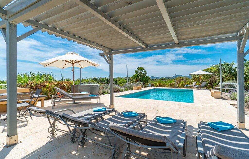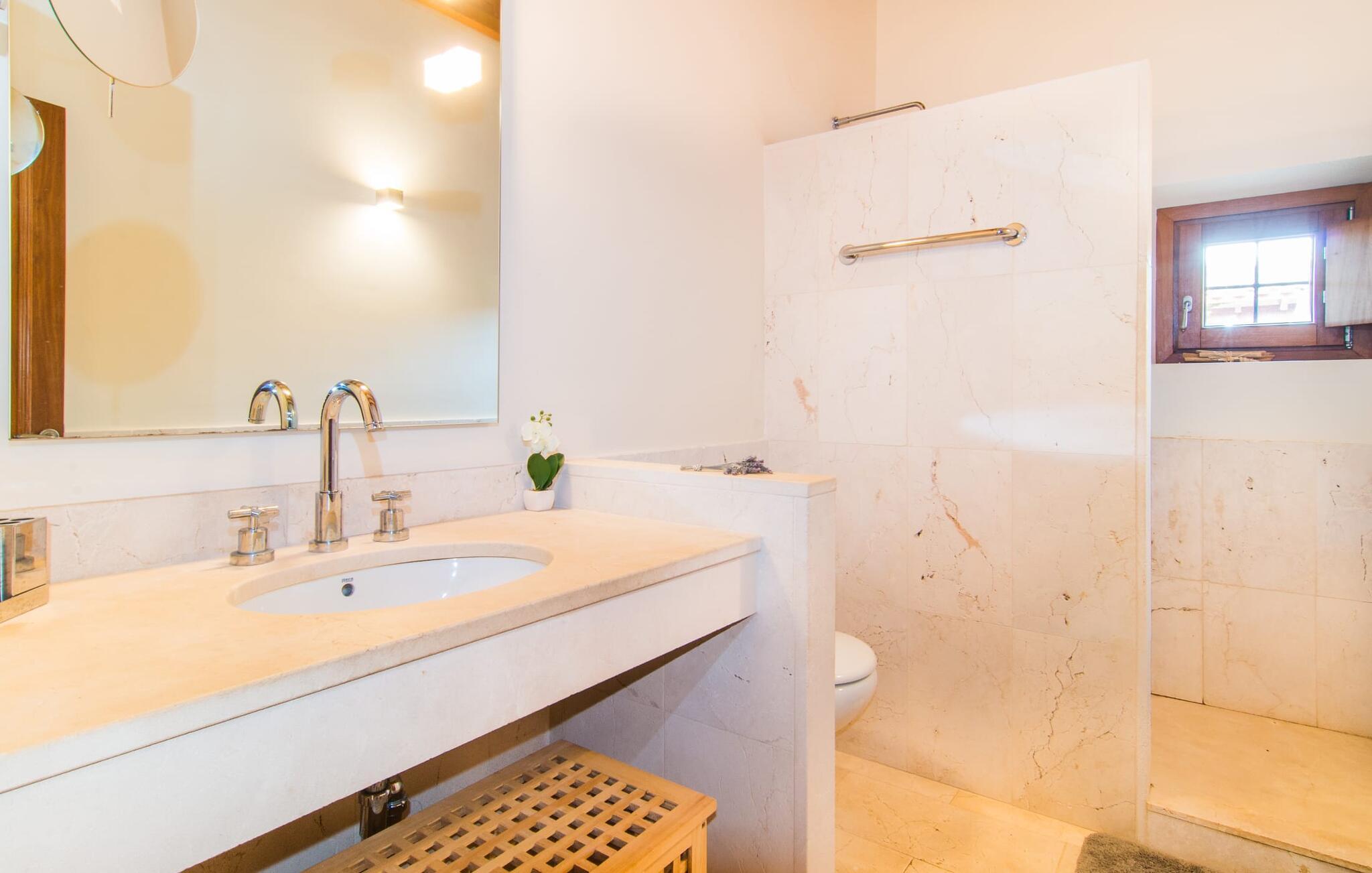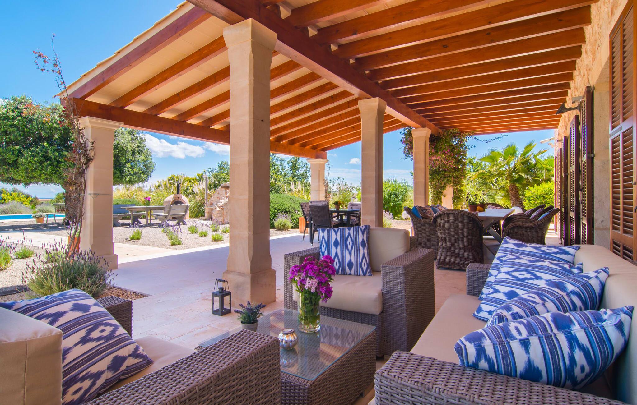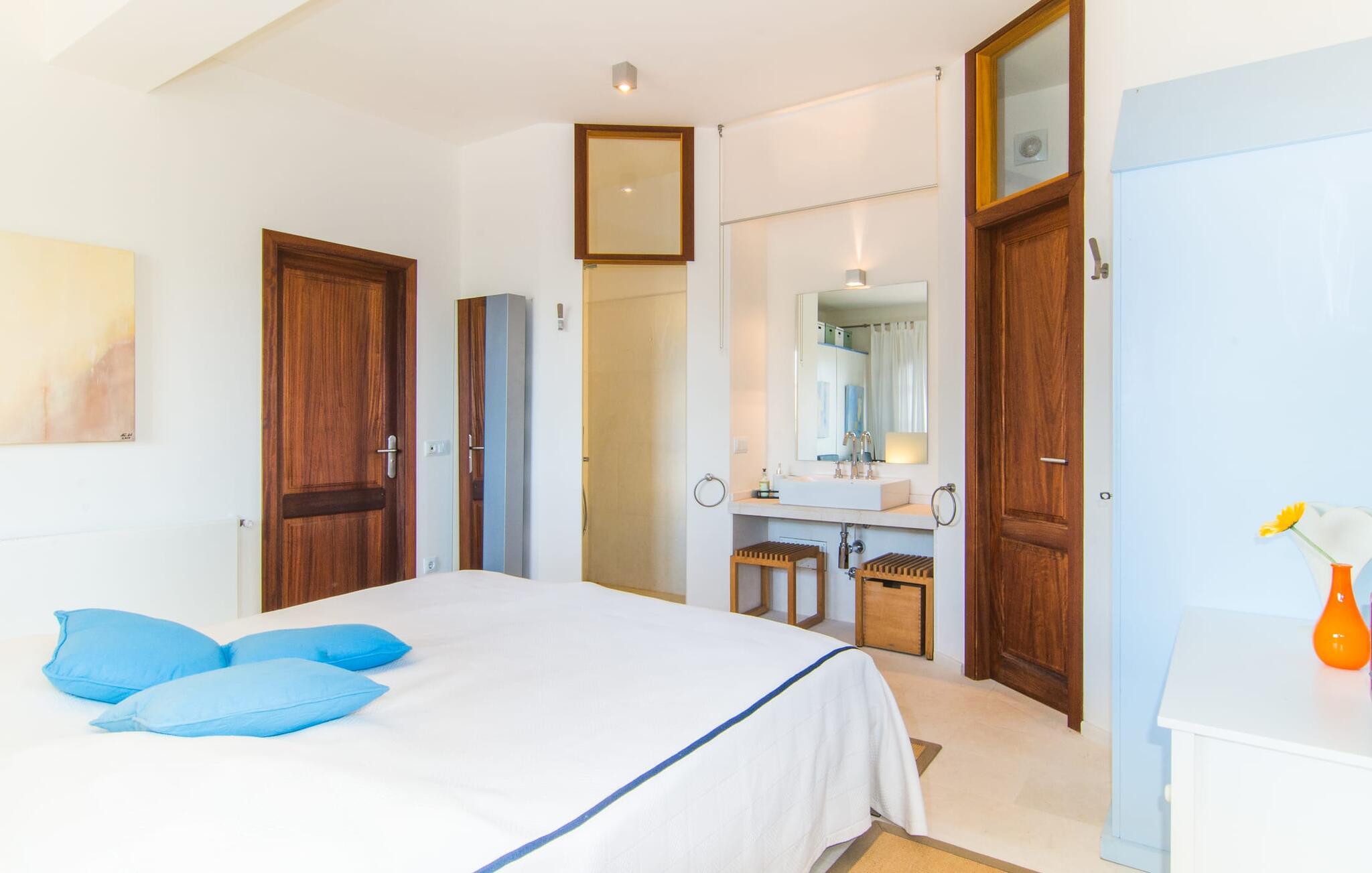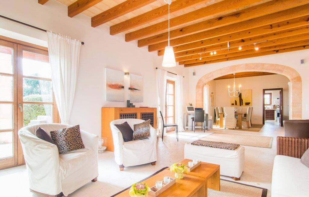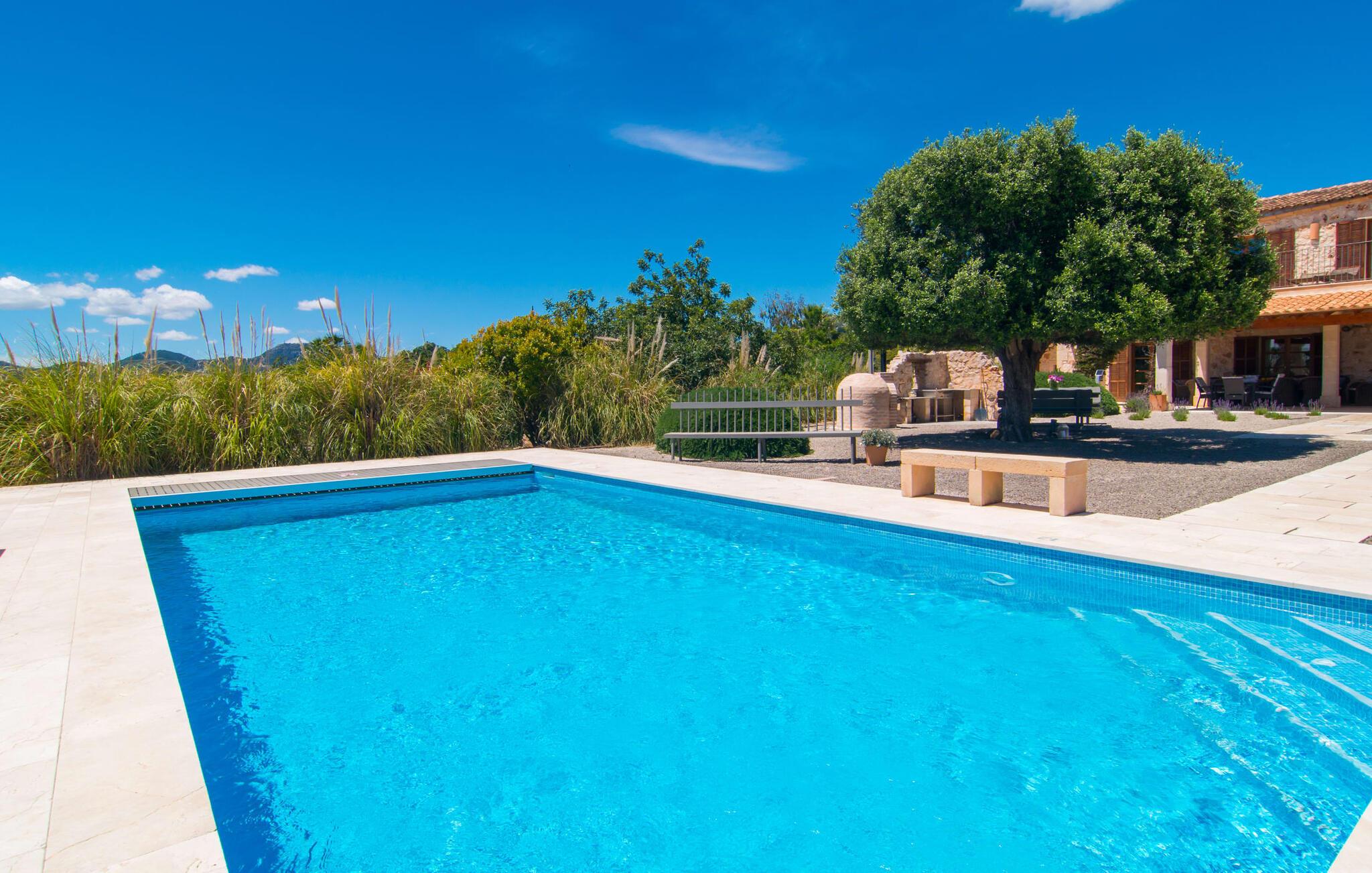 Du tager gerne imod den lidt ujævne tur over en grusvej, når sådan en juvel venter på jer – bliver de smukkeste skatte ikke nogle gange bevogtet af en drage? I “Can Joaquin” vil I føle, som om I har vundet hovedgevinsten i Fincallorca-lotteriet - I er sikret en plads på livets solside, hvad enten det er i det overdådige hovedhus, i det hyggelige gæstehjem eller i haven! Den rummelige ejendom, i typisk mallorcansk stil med to vindmøller, ligner et privat fritidsområde med korte gåture, swimmingpool, badmintonbane (hvor I endda kan spille volleyball), udendørs skakbræt, overdækket bordtennisbord og udstyret træningssti og en runde. pavillon med hængekøje til jeres konstante brugsaktivitet. Vi garanterer, at I ikke behøver at bekymre jer et øjeblik om, hvordan I eller jeres børn vil beskæftige sig under jeres ferie; Denne villa sikrer en chill faktor for unge og gamle og med en kærligt designet legeplads med sand, legeredskaber og et legehus, kommer børn med garanti ikke til at kede sig. Læg hertil det luksuriøse udekøkken i den enorme gårdhave og den store murstensgrill ved siden af poolterrassen, og I har alt hvad I behøver for at fejre udelivet og naturligt forlænge jeres dage ind i de lune sommernætter. Det ville dog være en skam ikke at kunne nyde ejendommens skønhed og privatliv og dens udsigt i fred; Der er et fantastisk udvalg af siddepladser, liggestole, bænke, stole, borde og terrasser bag halvkugleformede hække eller under træer og bougainvillea, enten med udsigt eller gemt væk. Brug først fitnessstien, og bliv derefter siestaens herre... Plantager som appelsiner, citroner, kiwier, æbler, vin, granatæbler, bananer, ferskner og avocadoer, som konstant tilføjes af ejerne, supplerer den frodige vegetation, gamle figentræer, som bærer den bedste frugt. I er selvfølgelig også velkommen til at prøve alt på det rigtige tidspunkt af året. Men lad os ikke glemme indersiden af villaen! En lur i huset kan være direkte fristende, når soveværelserne har aircondition og udgang til altanterrasse (det store soveværelse har to altaner med vidunderlig udsigt!) og er så luksuriøst indrettet med tv og chill-out område, at man kun kan tænk på jer selv alt for glad for at trække jer tilbage i jeres eget rum for et stykke tid. Metalseng, træseng, kurveseng – hvad foretrækker du? Hvis I kan lide cool interiør, der minder om nordlige breddegrader, vil I kunne lide den blå "dormitorio" med et integreret strandhus-stil badeværelse og skab. Med andre ord: Mallorca møder Afrika! Varme, lyse farver, luftigt fletværk, højkvalitetssten og smagfuldt tilbehør forvandler to solbeskinnede folkeslags kulturer til en indretning, der stadig giver plads til moderne elementer. Designerpejsen og fladskærms-tv'et sidder næsten side om side som tvillinger i lodgens luksuriøse stue, og i det halvcirkelformede, fuldt udstyrede køkken i træ og rustfrit stål er det lige så nemt at tilberede en brændende tanzanisk fiskeret som en spansk paella. Tilbered en kreativ crossover-ret, og alle jeres ledsagere vil hurtigt strømme til jeres bord fra alle hjørner af ejendommen. Selv køkkenet i “Canito Joaquin”, som er indrettet i samme stil som hovedhuset, forbliver koldt. Der er plads til alle på livets solside! Cales de Mallorca-regionen er oversået med huler (Cova des Pirata, Cova des Pont eller Coves dels Hams, for at nævne nogle få), og mange af de klippe- og sandede bugter, der er så rost i hver guidebog, er også hjemsted for bevogtede drager - hvis I ønsker at få adgang, skal I bevise jeres udholdenhed, men I vil også blive rigt belønnet af havets guder. Men hvis I foretrækker at blive i siesta-tilstand, inviterer den rolige havneby Portocolom med sine smalle gader, caféer, fiskerestauranter og en bred allé af platantræer jer til formålsløst stress og jag, mens udsigten fra det nærliggende kloster San Salvador venter på jer Den venlige by Felanitx i det indre af øen vil forbløffe jer. I "Vall D'Dor" golfklubben kan I ikke bare svinge en kølle; I kan også besøge en rigtig god restaurant, tage naturskønne gåture og spille kamptennis. Det sidste er også muligt på Rafael Nadals enorme tennisakademi, som kun ligger omkring 12 minutters kørsel væk i Manacor. Den sydlige del af Mallorca har så meget i vente for jer... I en landlig beliggenhed, mellem Porto Colom og Porto Cristo, med panoramaudsigt over havet og bjergene, på en dyrket grund på næsten to hektar, strækker Can Joaquin sig ud i sol, med udsigt over havet i det fjerne, prydet med en bjergkæde i baggrunden. Portocolom, en af de mest charmerende byer på sydøstkysten, ligger kun få minutters kørsel væk. Nærheden til vandet og den såkaldte kystvej, som fører til S'Alqueria Blanca, gør det nemt at opdage nye bugter eller promenader uden for den slagne vej som i Cala d'Or. Golfentusiaster vil også få noget for pengene. Den storslåede "Vall D'Dor" golfklub, kun få minutter væk, vil overgå jeres forventninger.
