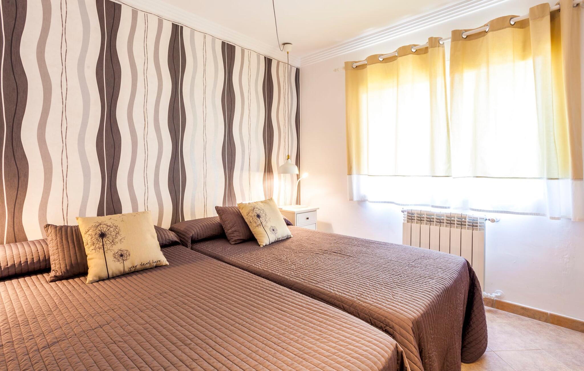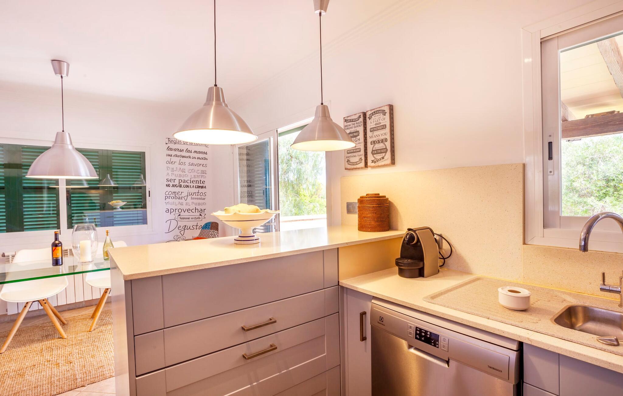 Stille, men ikke for langt væk fra den slagne vej; oliven- og palmetræer; en pool mousserende i solen; Alle de moderne bekvemmeligheder I kan ønske jer i et feriehus - velkommen til Villa “Can Jordi” på det sydlige Mallorca, den perfekte ferieresidens til et utroligt ophold på øen. Den overdækkede naturstensterrasse med en imponerende trappe ind til haven er et sandt blikfang i denne villa med fortryllende grønne skodder. For nemheds skyld kan terrassen låses af hensyn til små børns sikkerhed. Poolen er børnevenlig takket være den store, blide hældning af trinindgangen. Vandet indbyder til at køle af, slappe af og flyde på en af køjerne eller svømme et par længder. Så forkæl jer selv med en lang siesta på en af de komfortable liggestole på den vidunderlige rustikke naturstensterrasse omkring poolen. Foretrækker I skyggen, er den overdækkede terrasse det perfekte sted for jer, hvor I enten kan nyde et solidt festmåltid ved det store spisebord eller synke ned i de komfortable hynder i rattansofaerne. Interiøret i "Can Jordi" er også stilfuldt: alt er lyst og venligt; væggene spreder en hjemlig varme med deres middelhavsfarver; og lysene installeret i lofterne bader alt i et behageligt lys. Stenbuer mellem de åbne rum og en elegant søjle i stuen skaber sammen med de højkvalitets og elegante møbler en særlig statelig stemning, hvor I straks vil føle jer hjemme. De komfortable lædersofaer og to indbydende fløjstole omkring pejsen i stuen er virkelig fristende, mens I i spisestuen kan nyde kulinariske lækkerier i en skøn mørk træsofa. Disse delikatesser kan nemt tilberedes i køkkenet, som er udstyret med moderne udstyr og endnu et rundt spisebord med tilhørende stole, så I kan spise morgenmad uanset vejret i regnvejr. De fem lyse dobbeltværelser garanterer jer en velfortjent nattesøvn - enten komfortable dobbeltsenge eller enkeltsenge inviterer jer til søde drømme. Takket være de store vinduespartier er alle rum lyse ned til mindste detalje – inklusive villaens fire badeværelser. En af dem har et privat badeværelse ovenpå, og alle er meget rene og har store spejle. Placeringen af jeres feriehus er ideel til en virkelig afvekslende ferie: i umiddelbar nærhed kan I nyde fred og ro midt i bjergskråninger, overvejende i form af cypresser. Hvis I så vil ind til byen, skal I kun køre i jeres lejebil cirka 3,3 km til den tidligere fiskerby Colònia Sant Jordi - i dag et populært feriested med et stort udvalg af gode restauranter, caféer og barer samt talrige vandsportsaktiviteter og indkøbsmuligheder. Derfra er der kun få kilometer via forskellige smukke naturstier til en af de smukkeste strande på Mallorca: Es Trenc. Det fine, hvide sand mellem uberørt natur og beskyttede klitter, saltmarker og en fyrreskov skråner blidt ned i det klare vand og er ideelt for børn at lege. Den smukke finca "Can Jordi" ligger roligt på en gammel, tilgroet grund med oliventræer og imponerende palmer i det sydlige Mallorca. Fra den store overdækkede terrasse med sine smukke søjler kan I nyde udsigten over det glitrende hav i det fjerne - der er nogle smukke strande inden for en radius af kun omkring 3 km. Næsten lige så let at komme til er den charmerende lille kystby Colònia de Sant Jordi, hvor I kan slentre langs den livlige havnepromenade, prøve de forskellige restauranter og shoppe til jeres daglige behov.