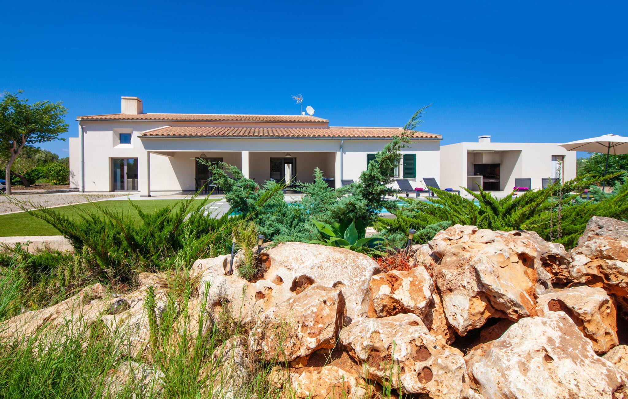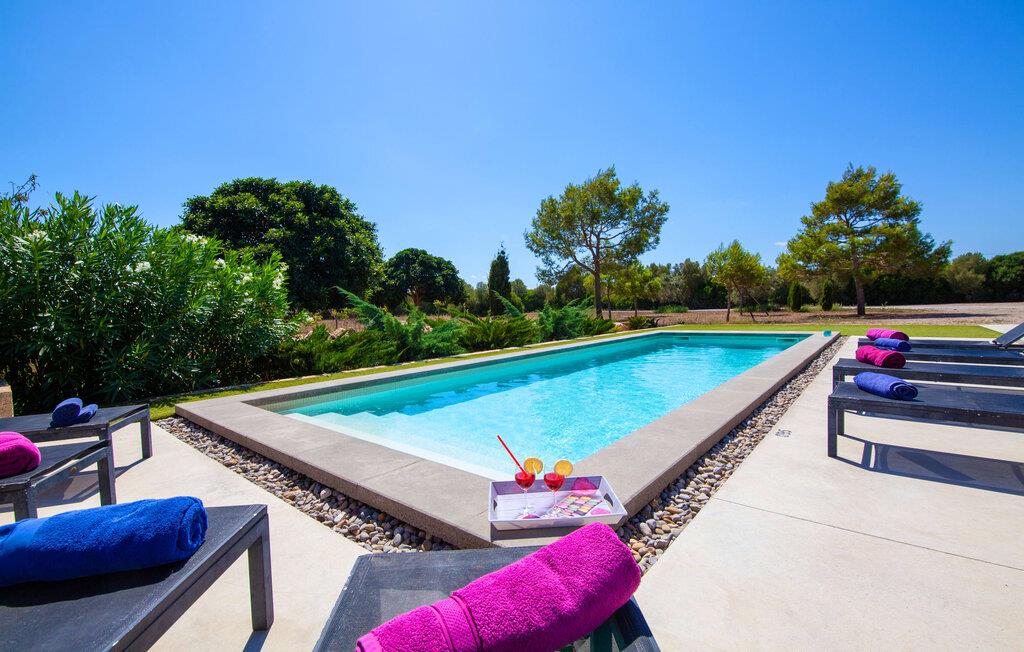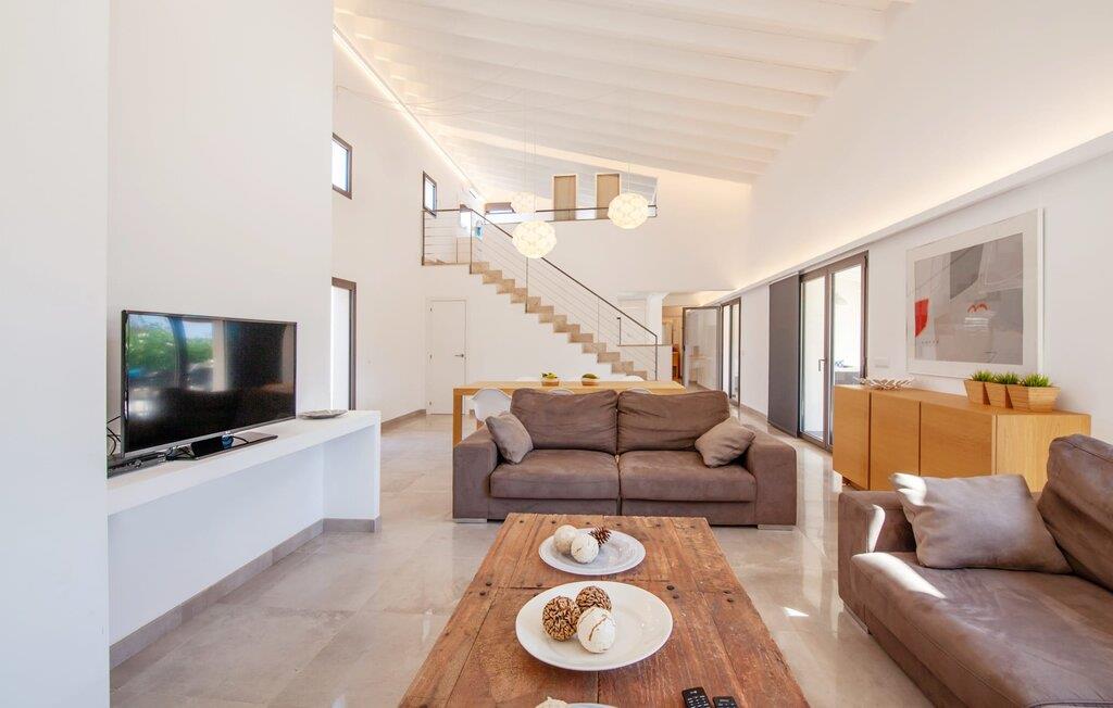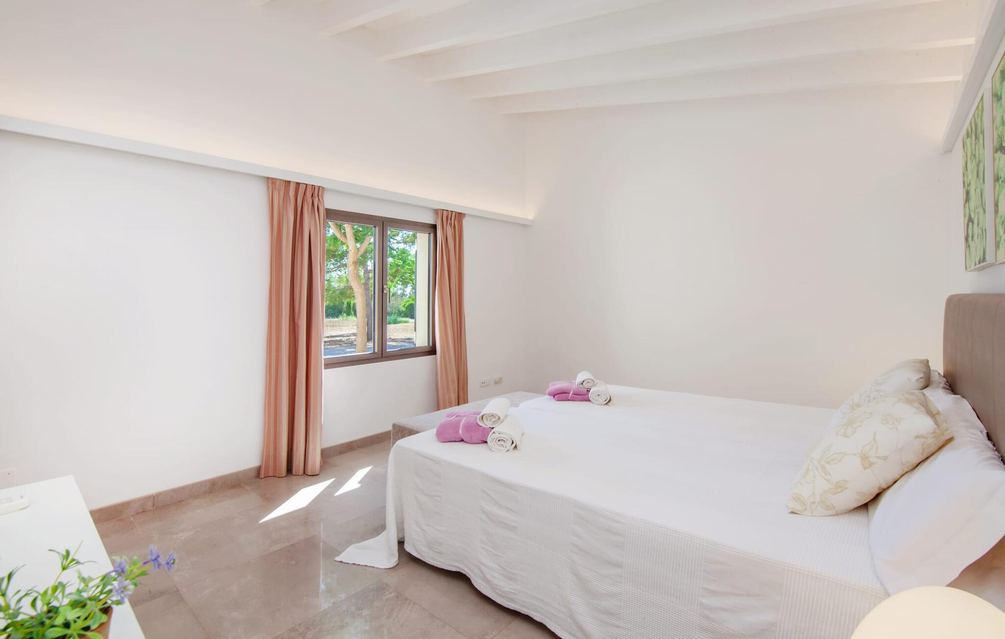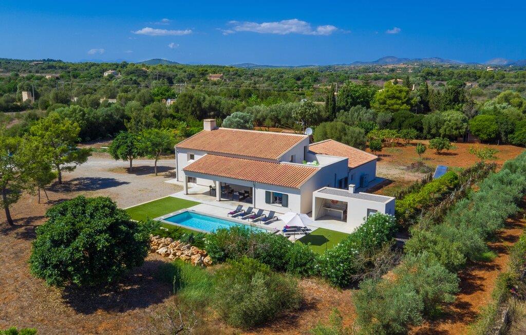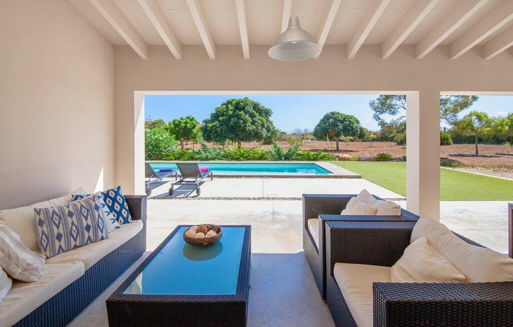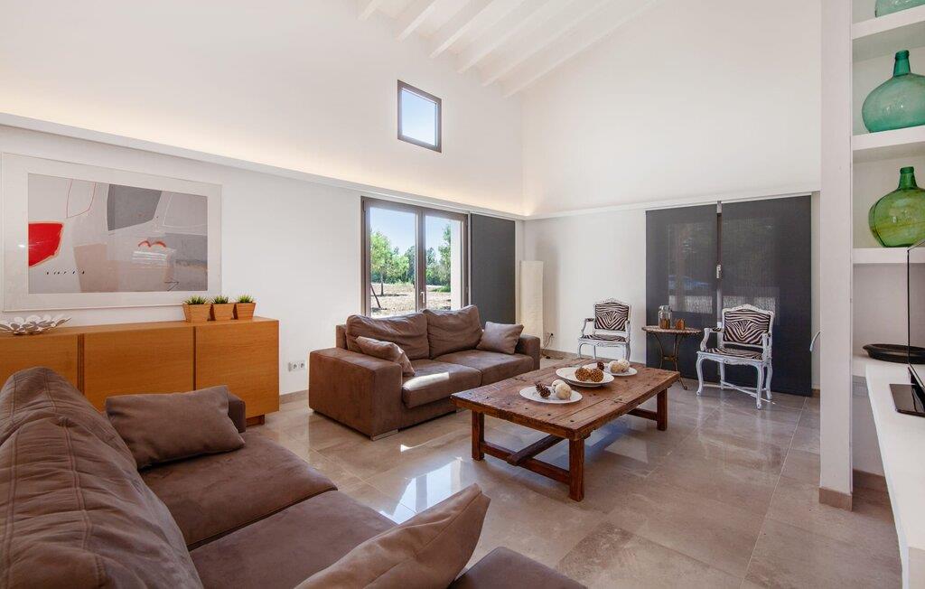Leder I efter et rummeligt, moderne feriehus på det sydlige Mallorca, så er fincaen "Can Llorenc Jove" det perfekte valg. Det er beliggende på en stor grund uden direkte naboer og tilbyder fuldstændig privatliv. Der er tilstrækkelige parkeringspladser til rådighed ved fincaen. Det kan dog være svært at forlade, da ejendommen har så meget at byde på: en stor pool med stilfulde liggestole, forskellige overdækkede og solrige terrasseområder (herunder en tagterrasse), et internt bordtennisbord til venskabskampe og en praktisk udekøkken i nærheden af poolen. "Can Llorenc Jove" er stilfuldt designet med friske hvide og naturlige toner, suppleret med nøje udvalgt kunst. Store vinduer og smart, indirekte belysning skaber en lys og luftig atmosfære. Værelserne er generøst proportionerede. I stueetagen fører den åbne spise- og opholdsstue til et moderne køkken med højkvalitets hvidevarer og tre smarte soveværelser med tre badeværelser, hvoraf to er en suite. En luftig trappe fører op til overetagen, hvor et galleri med ekstra soveplads giver adgang til tagterrassen. Den moderne finca "Can Llorenc Jove" er beliggende i en afsondret landlig beliggenhed på en kæmpe grund. Ikke desto mindre kører I mindre end 5 km til Cala Romantica for at shoppe, og den smukke sandstrand Cala Estany ligger kun omkring 5 km væk.