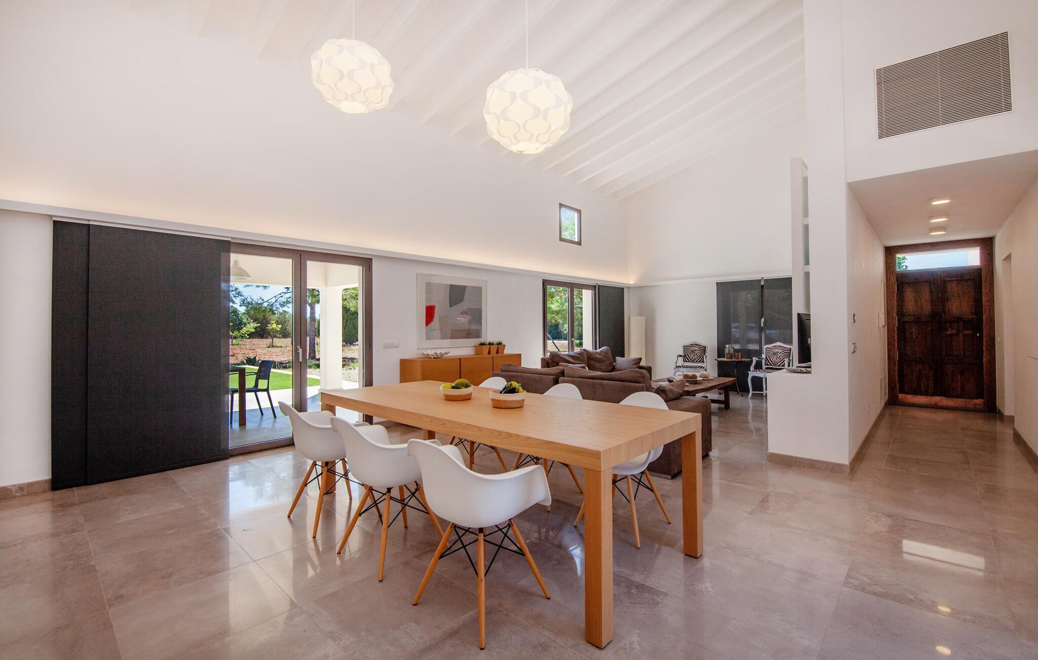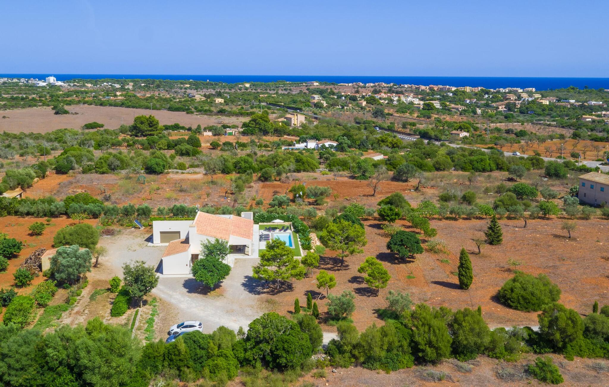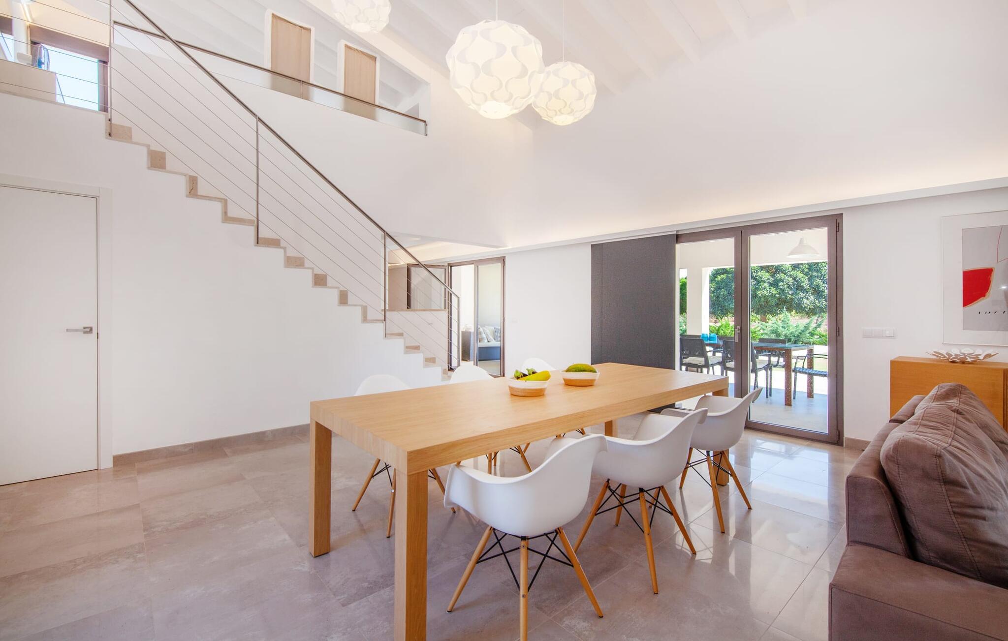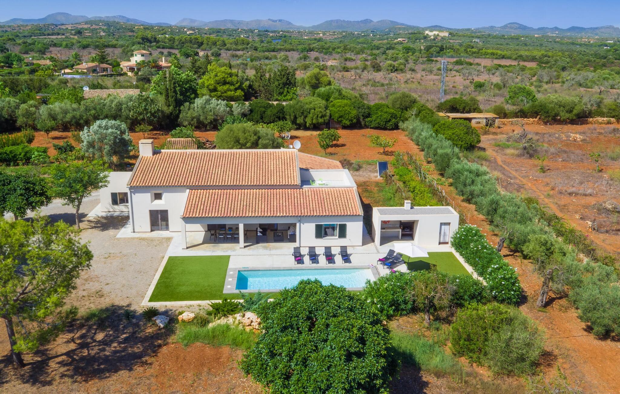 Leder I efter et rummeligt, moderne feriehus på det sydlige Mallorca, så er fincaen "Can Llorenc Jove" det perfekte valg. Det er beliggende på en stor grund uden direkte naboer og tilbyder fuldstændig privatliv. Der er tilstrækkelige parkeringspladser til rådighed ved fincaen. Det kan dog være svært at forlade, da ejendommen har så meget at byde på: en stor pool med stilfulde liggestole, forskellige overdækkede og solrige terrasseområder (herunder en tagterrasse), et internt bordtennisbord til venskabskampe og en praktisk udekøkken i nærheden af poolen. "Can Llorenc Jove" er stilfuldt designet med friske hvide og naturlige toner, suppleret med nøje udvalgt kunst. Store vinduer og smart, indirekte belysning skaber en lys og luftig atmosfære. Værelserne er generøst proportionerede. I stueetagen fører den åbne spise- og opholdsstue til et moderne køkken med højkvalitets hvidevarer og tre smarte soveværelser med tre badeværelser, hvoraf to er en suite. En luftig trappe fører op til overetagen, hvor et galleri med ekstra soveplads giver adgang til tagterrassen. Den moderne finca "Can Llorenc Jove" er beliggende i en afsondret landlig beliggenhed på en kæmpe grund. Ikke desto mindre kører I mindre end 5 km til Cala Romantica for at shoppe, og den smukke sandstrand Cala Estany ligger kun omkring 5 km væk.