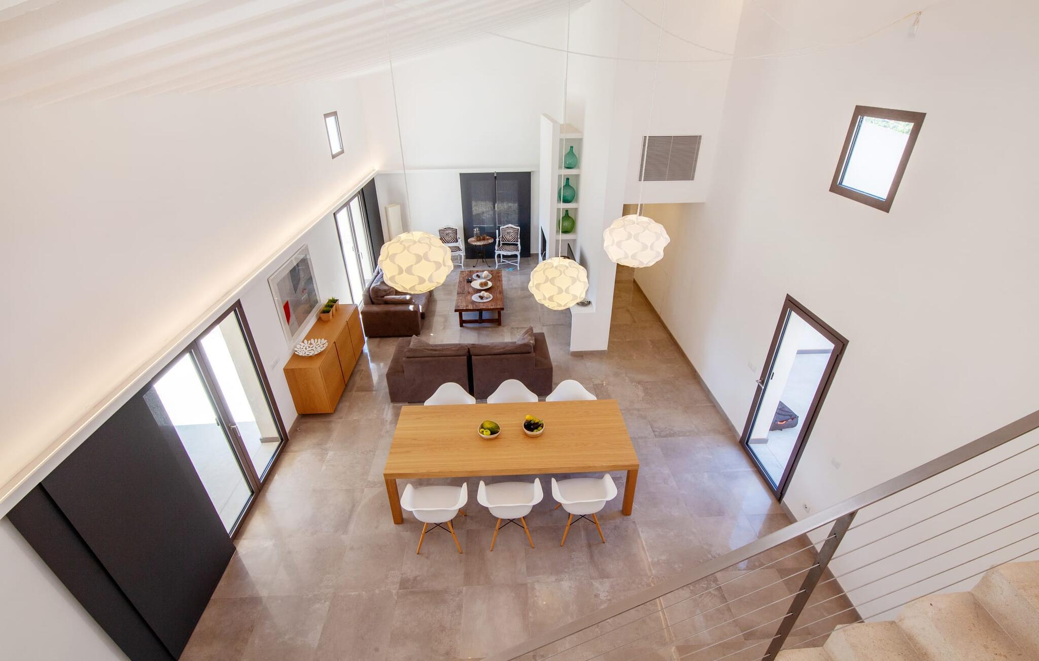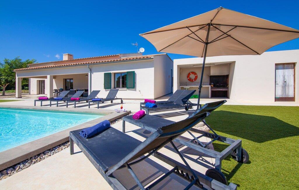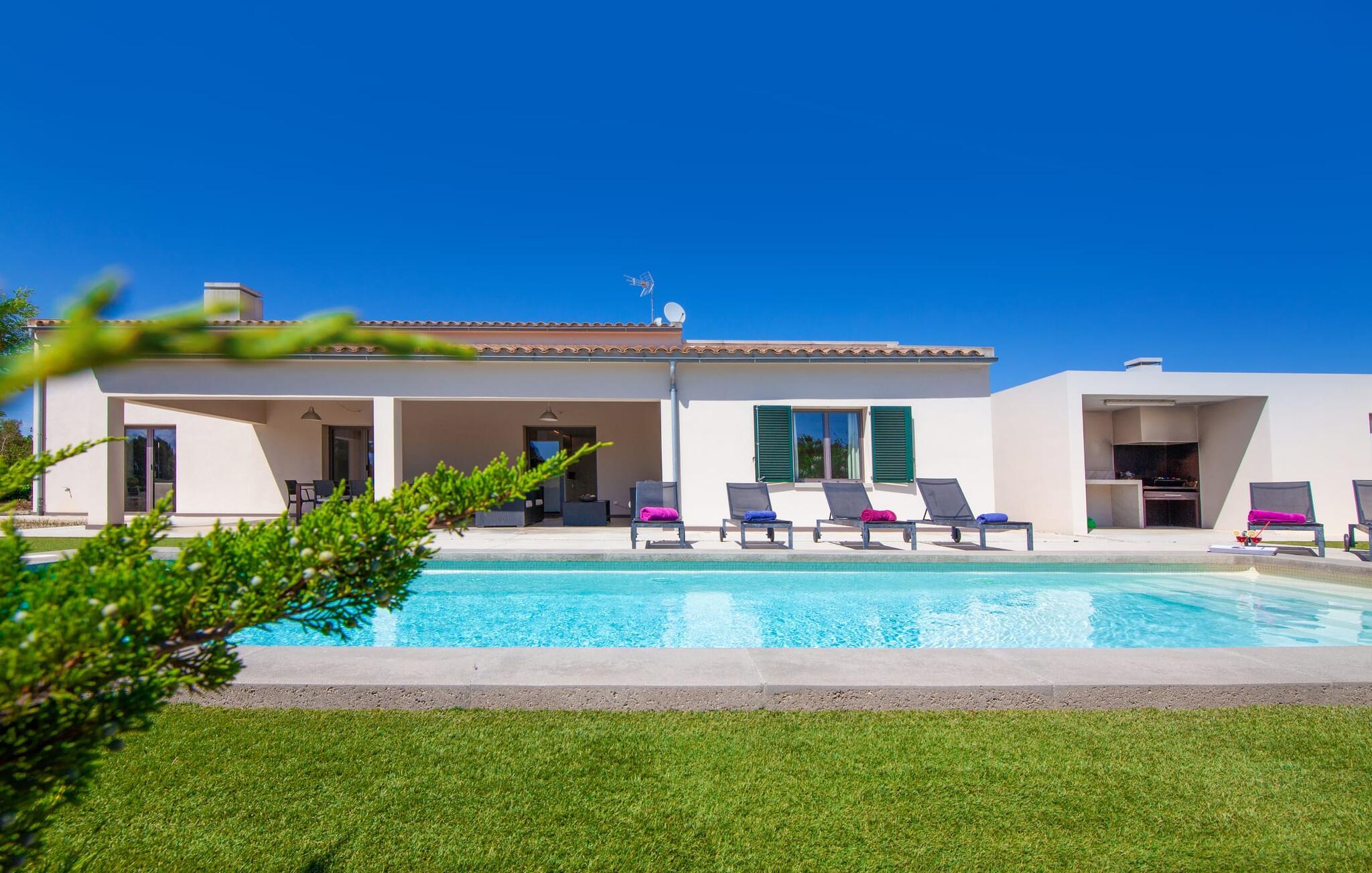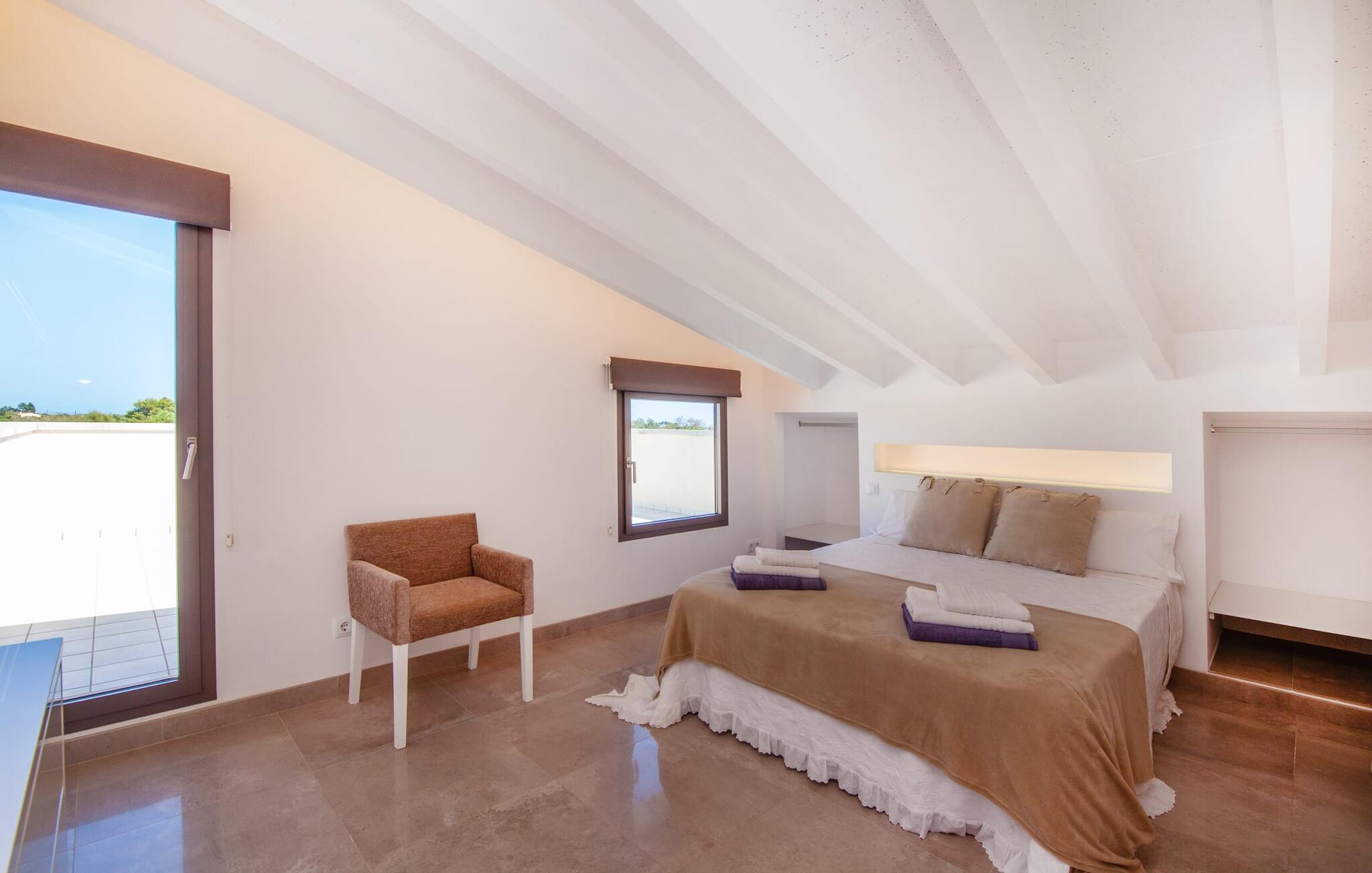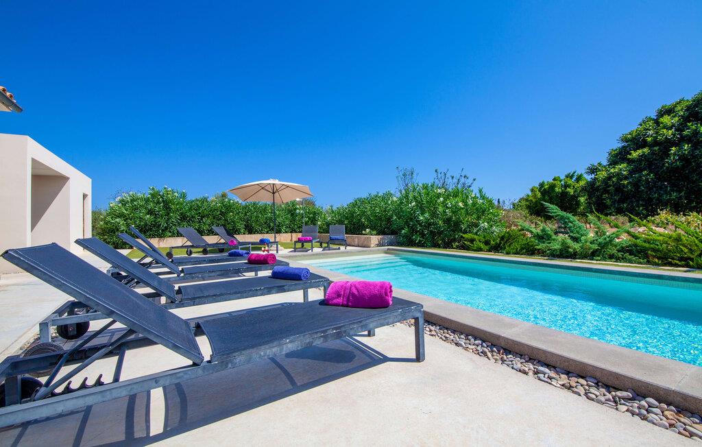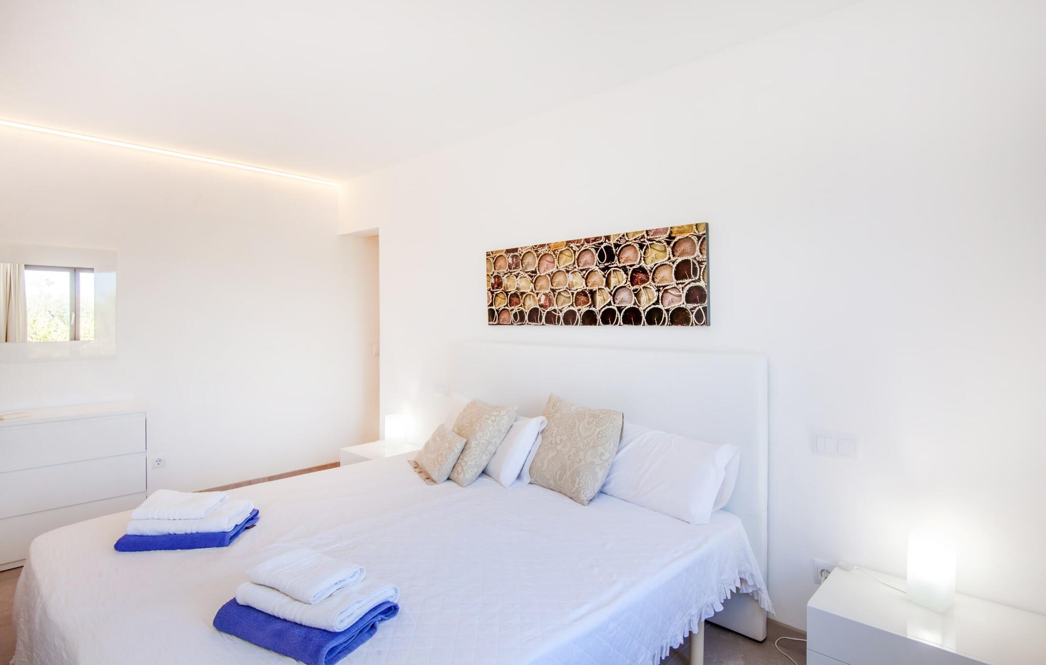 Leder I efter et rummeligt, moderne feriehus på det sydlige Mallorca, så er fincaen "Can Llorenc Jove" det perfekte valg. Det er beliggende på en stor grund uden direkte naboer og tilbyder fuldstændig privatliv. Der er tilstrækkelige parkeringspladser til rådighed ved fincaen. Det kan dog være svært at forlade, da ejendommen har så meget at byde på: en stor pool med stilfulde liggestole, forskellige overdækkede og solrige terrasseområder (herunder en tagterrasse), et internt bordtennisbord til venskabskampe og en praktisk udekøkken i nærheden af poolen. "Can Llorenc Jove" er stilfuldt designet med friske hvide og naturlige toner, suppleret med nøje udvalgt kunst. Store vinduer og smart, indirekte belysning skaber en lys og luftig atmosfære. Værelserne er generøst proportionerede. I stueetagen fører den åbne spise- og opholdsstue til et moderne køkken med højkvalitets hvidevarer og tre smarte soveværelser med tre badeværelser, hvoraf to er en suite. En luftig trappe fører op til overetagen, hvor et galleri med ekstra soveplads giver adgang til tagterrassen. Den moderne finca "Can Llorenc Jove" er beliggende i en afsondret landlig beliggenhed på en kæmpe grund. Ikke desto mindre kører I mindre end 5 km til Cala Romantica for at shoppe, og den smukke sandstrand Cala Estany ligger kun omkring 5 km væk.