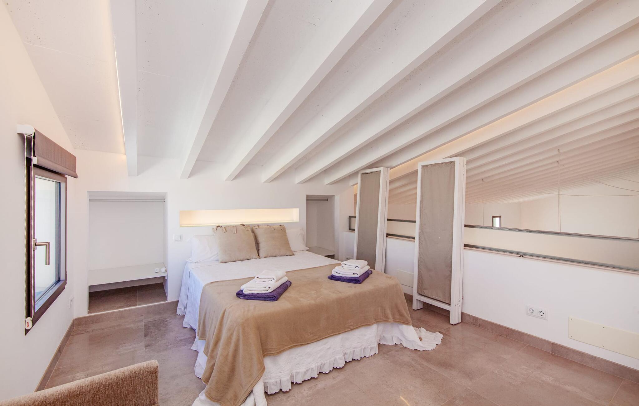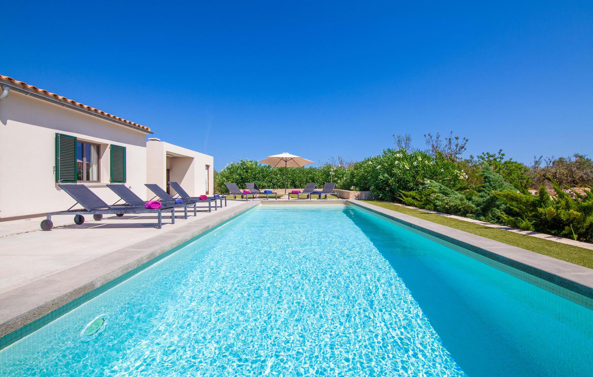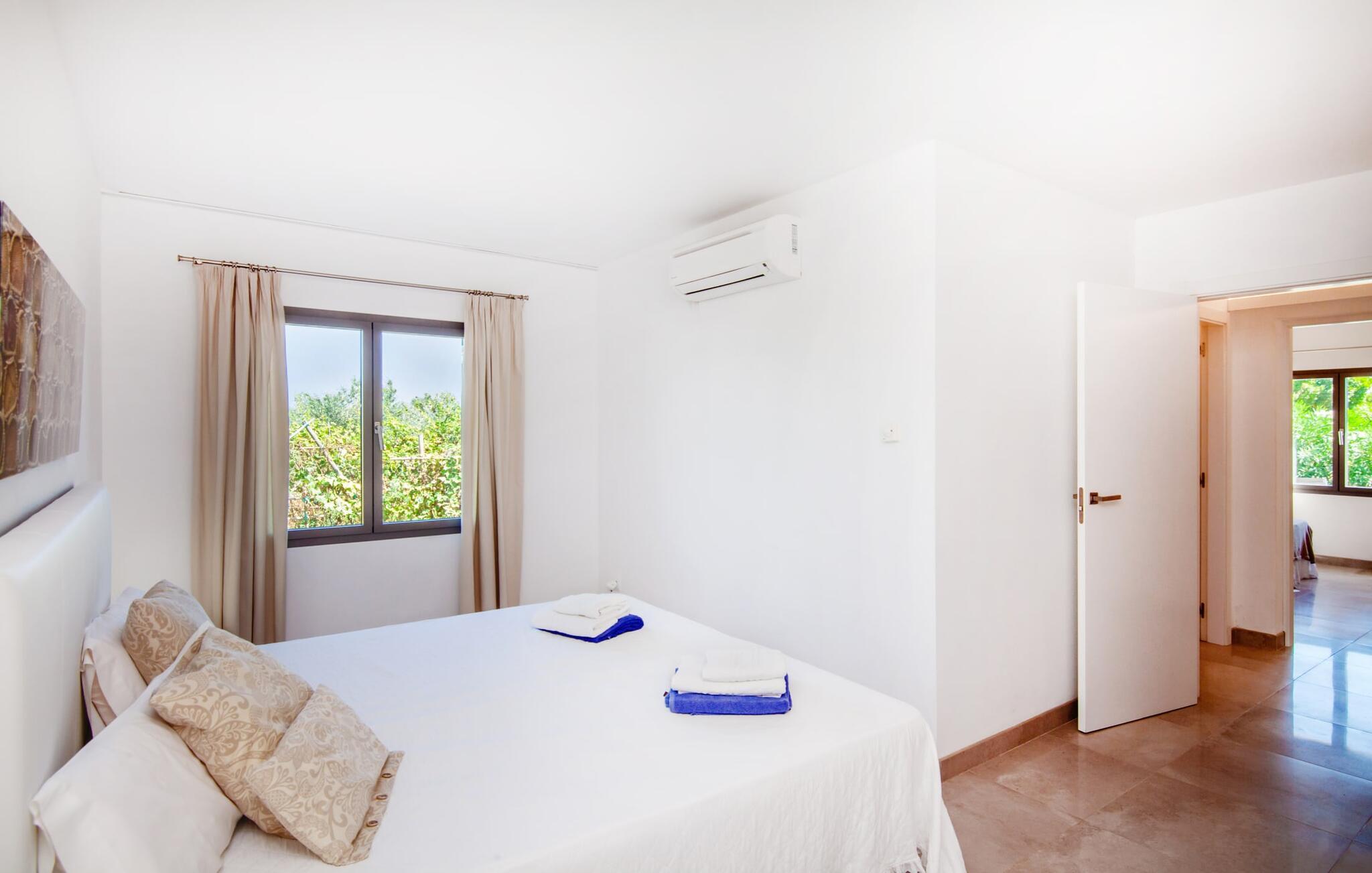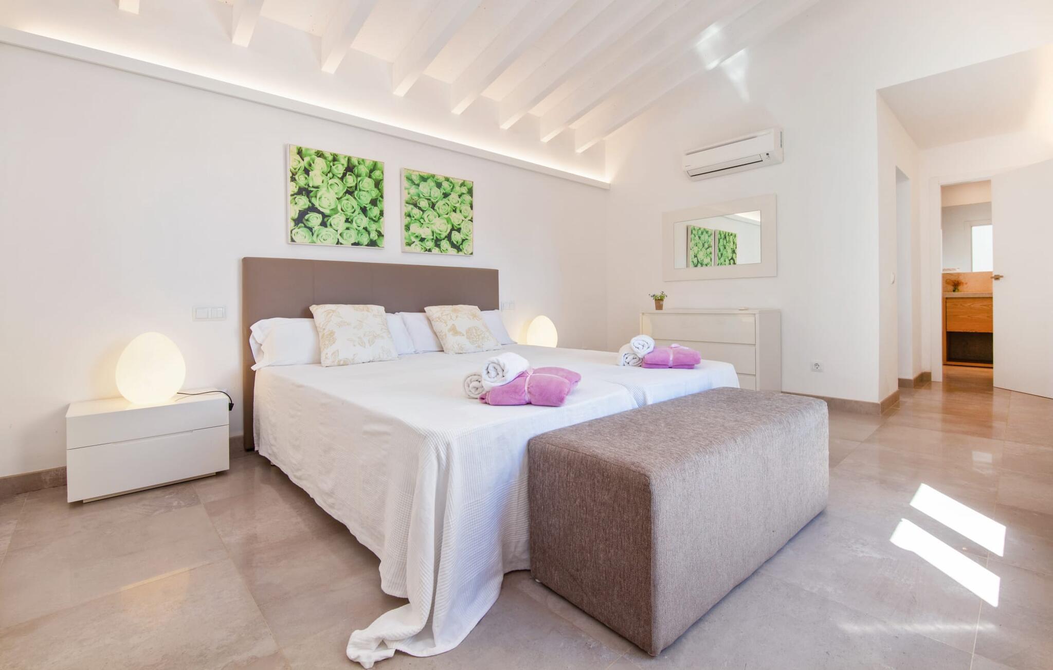 Leder I efter et rummeligt, moderne feriehus på det sydlige Mallorca, så er fincaen "Can Llorenc Jove" det perfekte valg. Det er beliggende på en stor grund uden direkte naboer og tilbyder fuldstændig privatliv. Der er tilstrækkelige parkeringspladser til rådighed ved fincaen. Det kan dog være svært at forlade, da ejendommen har så meget at byde på: en stor pool med stilfulde liggestole, forskellige overdækkede og solrige terrasseområder (herunder en tagterrasse), et internt bordtennisbord til venskabskampe og en praktisk udekøkken i nærheden af poolen. "Can Llorenc Jove" er stilfuldt designet med friske hvide og naturlige toner, suppleret med nøje udvalgt kunst. Store vinduer og smart, indirekte belysning skaber en lys og luftig atmosfære. Værelserne er generøst proportionerede. I stueetagen fører den åbne spise- og opholdsstue til et moderne køkken med højkvalitets hvidevarer og tre smarte soveværelser med tre badeværelser, hvoraf to er en suite. En luftig trappe fører op til overetagen, hvor et galleri med ekstra soveplads giver adgang til tagterrassen. Den moderne finca "Can Llorenc Jove" er beliggende i en afsondret landlig beliggenhed på en kæmpe grund. Ikke desto mindre kører I mindre end 5 km til Cala Romantica for at shoppe, og den smukke sandstrand Cala Estany ligger kun omkring 5 km væk.