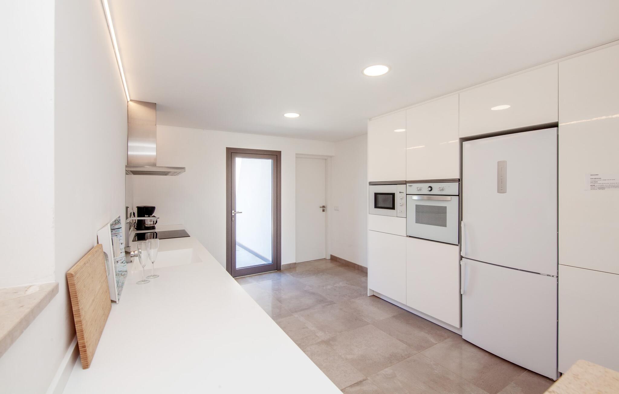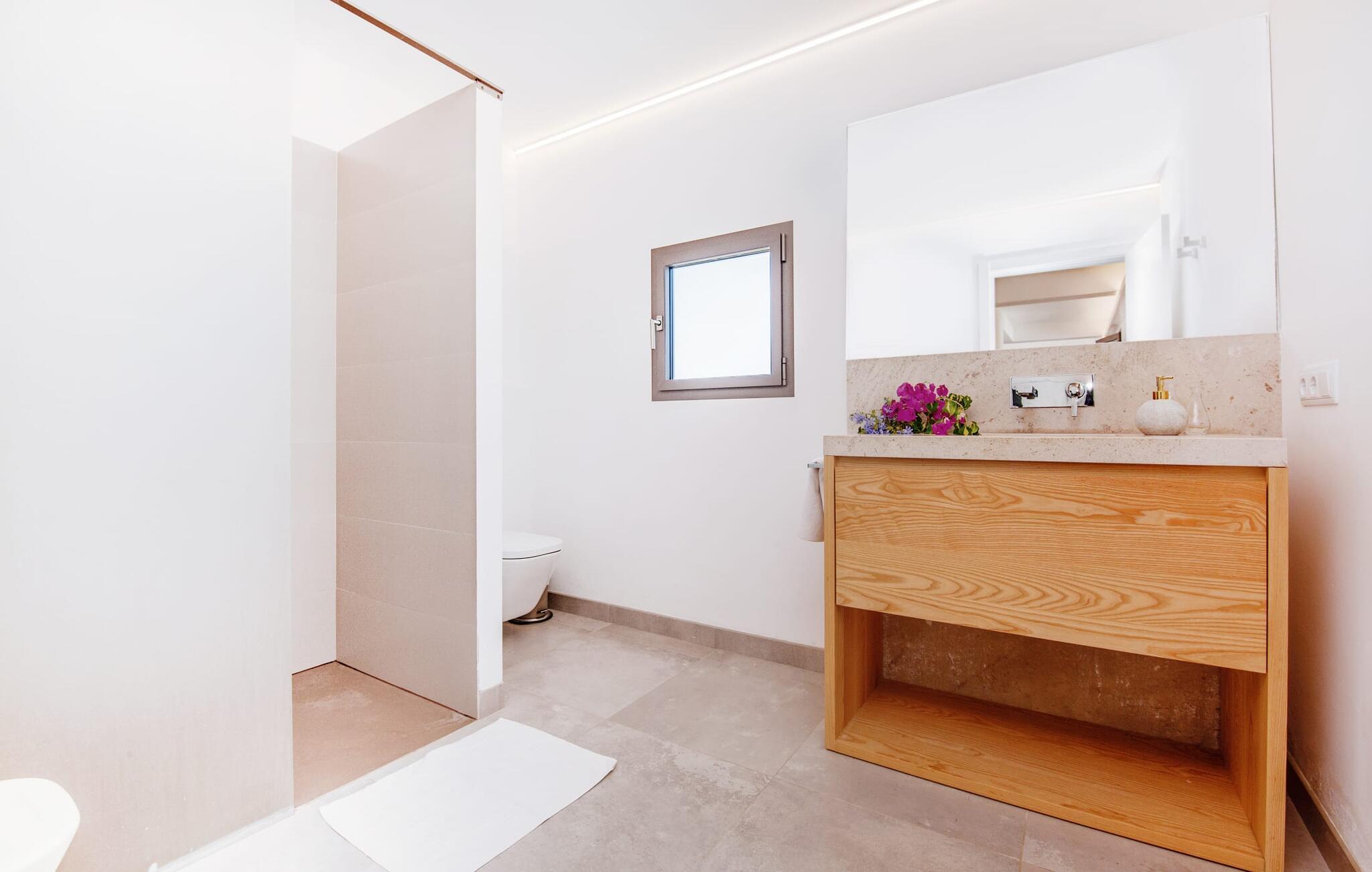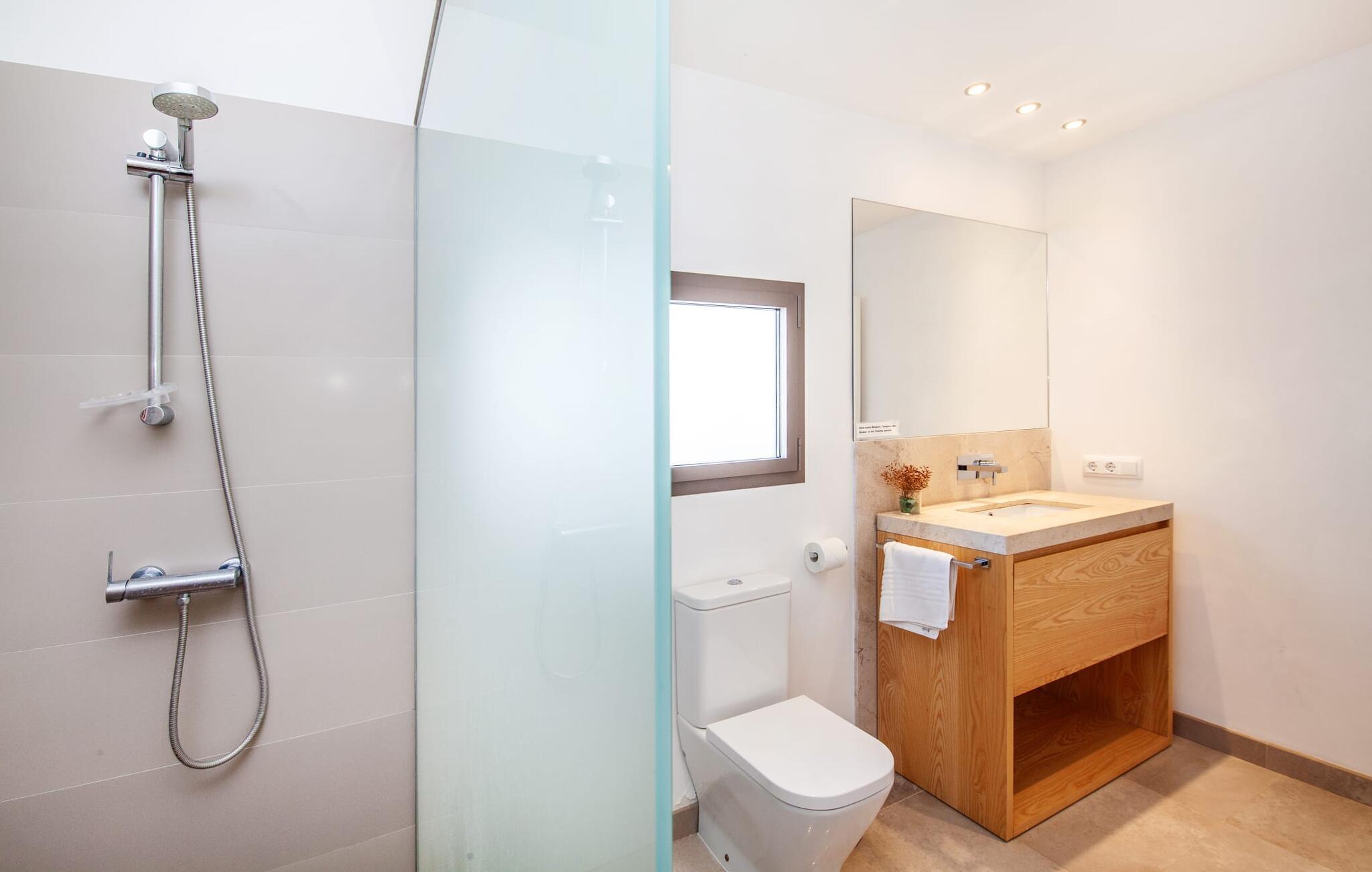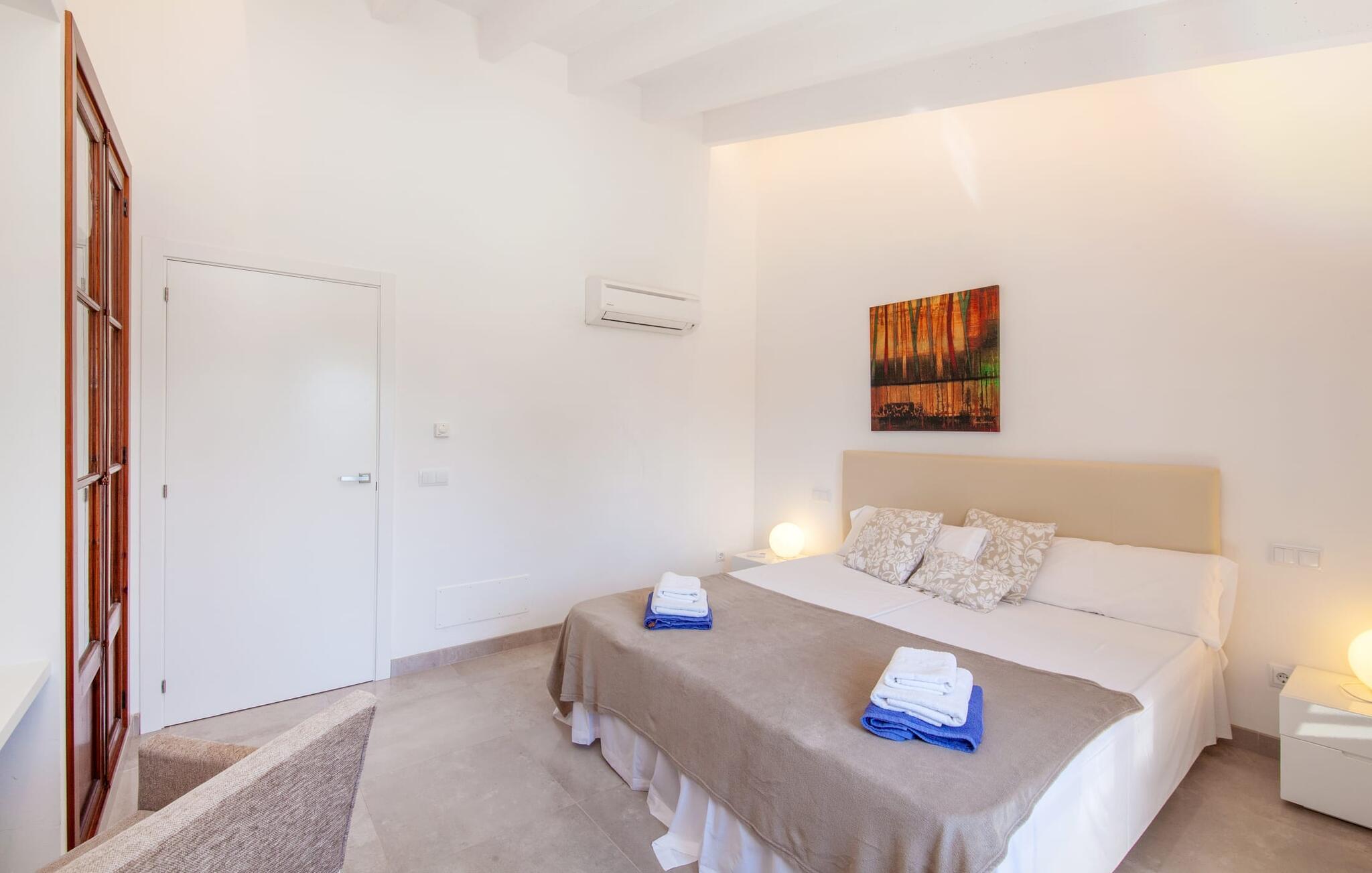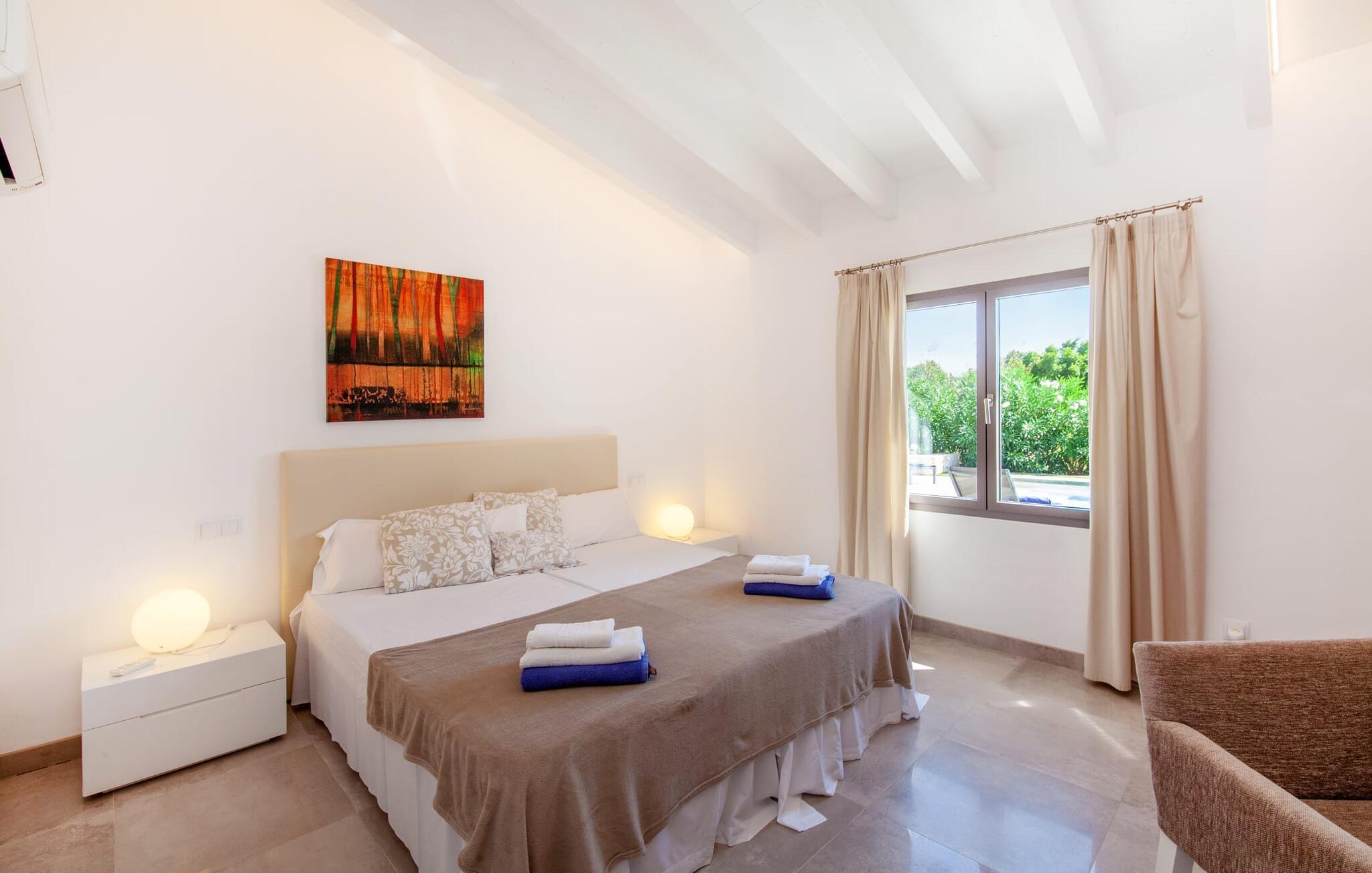 Leder I efter et rummeligt, moderne feriehus på det sydlige Mallorca, så er fincaen "Can Llorenc Jove" det perfekte valg. Det er beliggende på en stor grund uden direkte naboer og tilbyder fuldstændig privatliv. Der er tilstrækkelige parkeringspladser til rådighed ved fincaen. Det kan dog være svært at forlade, da ejendommen har så meget at byde på: en stor pool med stilfulde liggestole, forskellige overdækkede og solrige terrasseområder (herunder en tagterrasse), et internt bordtennisbord til venskabskampe og en praktisk udekøkken i nærheden af poolen. "Can Llorenc Jove" er stilfuldt designet med friske hvide og naturlige toner, suppleret med nøje udvalgt kunst. Store vinduer og smart, indirekte belysning skaber en lys og luftig atmosfære. Værelserne er generøst proportionerede. I stueetagen fører den åbne spise- og opholdsstue til et moderne køkken med højkvalitets hvidevarer og tre smarte soveværelser med tre badeværelser, hvoraf to er en suite. En luftig trappe fører op til overetagen, hvor et galleri med ekstra soveplads giver adgang til tagterrassen. Den moderne finca "Can Llorenc Jove" er beliggende i en afsondret landlig beliggenhed på en kæmpe grund. Ikke desto mindre kører I mindre end 5 km til Cala Romantica for at shoppe, og den smukke sandstrand Cala Estany ligger kun omkring 5 km væk.