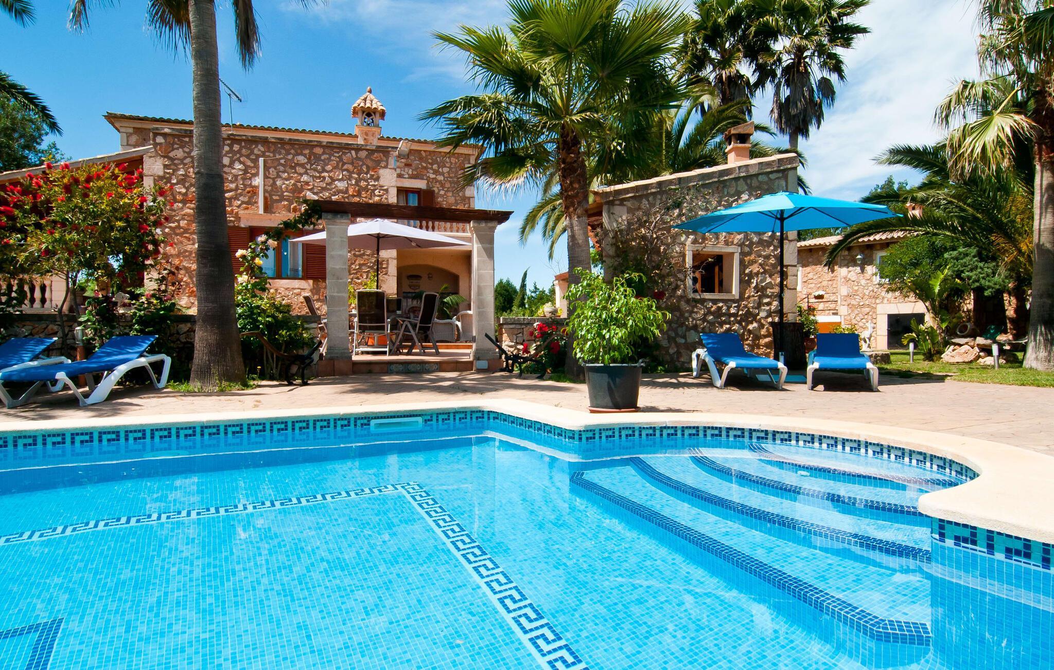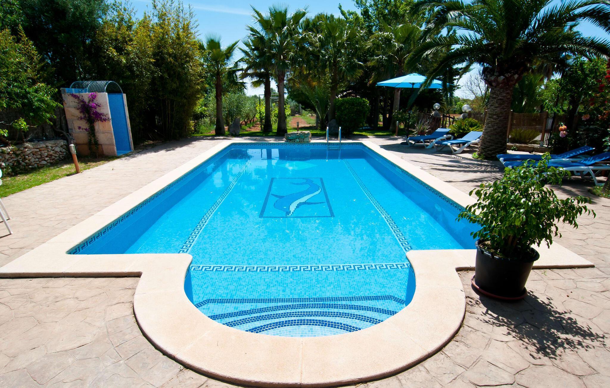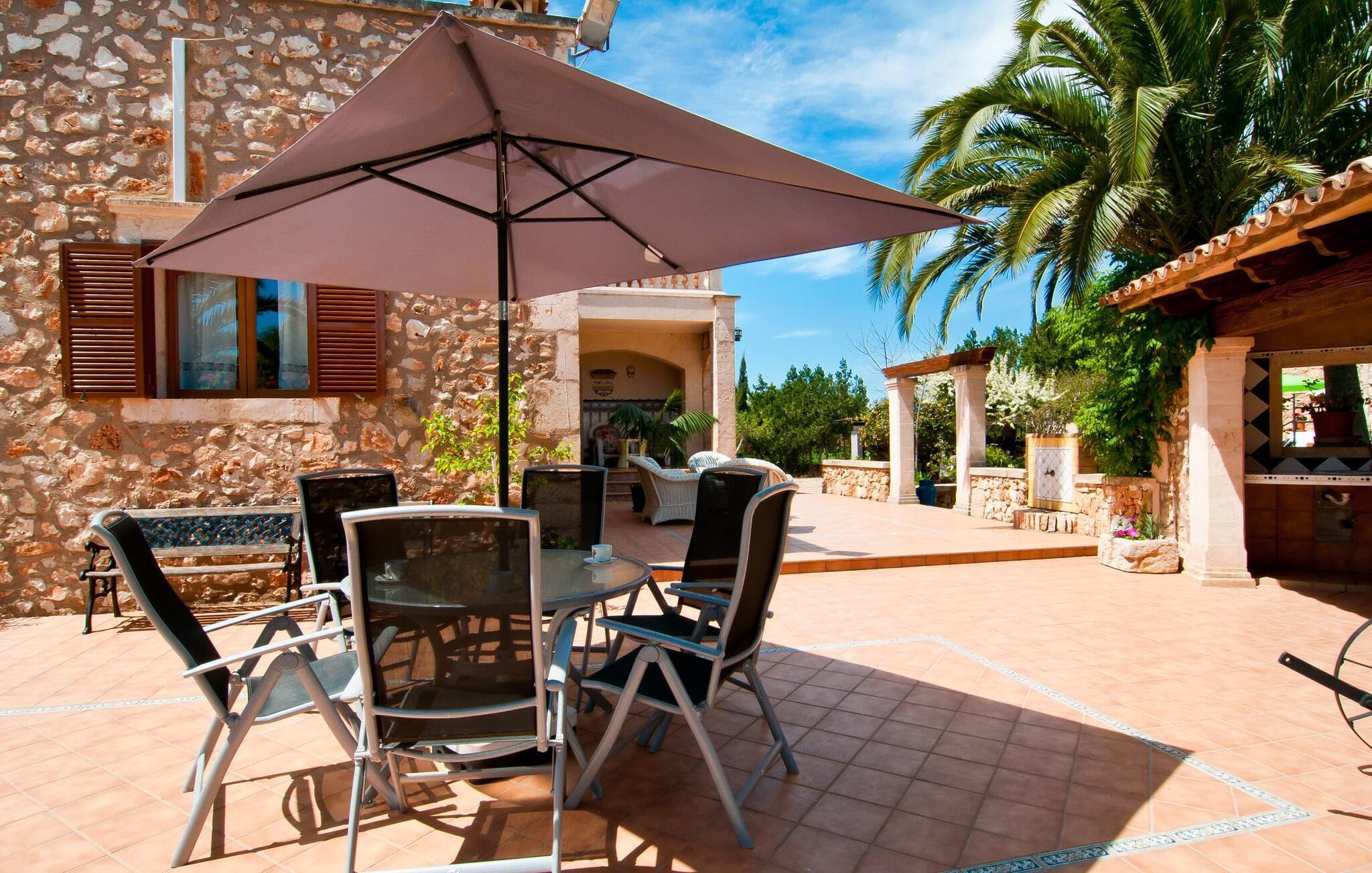 En frodig indkørsel beklædt med en naturstensmur og høje palmer fører os til huset og giver en første smagsprøve på denne ejendoms eksklusivitet. Det står hurtigt klart, at der i udearealet i denne villa er lagt vægt på at præsentere de enkelte elementer i et varieret og større format. Særligt imponerende er det ekstremt store antal træer på ejendommen. I poolområdet får du indtryk af at være midt i en palmehave. En række dekorative elementer og andre unikke stykker og installationer inviterer dig til at opdage og forundre ejendommen og give den en meget individuel flair. På de store terrassearealer kan du hver dag lede efter et nyt, eksklusivt yndlingssted og finde både solrige og luftige naturlige skyggeområder at slappe af. Frugttræer, grøntsager, høns og fugle er også en del af livet på landet her. Poolen, som ligger i læ foran huset, danner havens centrum. Der er adgang til poolen via en stige og har en smuk delfinmosaik på gulvet. Med en længde på 10 m er den en respektabel størrelse. Liggestole og parasoller harmonerer med poolens blå farve og fremtryller et malerisk billede. Du kan ligge under middelhavshimlen af hjertens lyst og nyde den mest vidunderlige tid på året. Det kan du lige så smagfuldt gøre i forskellige siddepladser spredt rundt i huset, som udover komfortable kurvestole også byder på spiseborde, stole og en bænk. Ejendommen tilbyder i alt 20 udendørs siddepladser. Et overdækket område er også en del af det rummelige udeareal. I nærheden af poolterrassen ligger grillpladsen, hvor du kan sidde dejligt på lune aftener og forkæle dig selv med friske, regionale delikatesser. Fincaen "Can Lopez Vara" består af et hovedhus og en lejlighed, som stod færdigt i foråret 2014. Når man træder ind i hovedhuset genkender man straks den karakteristiske overdådighed og kan derfor tilbringe tid indenfor i skønne omgivelser. Fritlagte bjælkelofter, mønstrede terracotta-fliser og lyse vægge indrammer dette interiør smukt. I stuen/alrummet, kun adskilt af en bred buet gang, kan du slappe af i sofahjørnet på den ene side og måske nyde en god bog eller en underholdende film, da fjernsynet er bekvemt placeret her. På køligere aftener kan pejsen fremtrylle hyggelig varme. Der er også en lille bar indrettet i hjørnet af lokalet. I kan spise sammen på en kultiveret måde i spisestuen og gøre alle forberedelser på forhånd i køkkenet lige ved siden af. Køkkenet er rummeligt og byder på alt hvad du behøver til daglig brug samt masser af opbevaringsplads. Hvidevarerne omfatter et komfur, en ovn, en køle/frysekombination, en brødrister og en opvaskemaskine samt en kedel og en filterkaffemaskine. Der er endda plads til endnu et lille spisebord, hvor du kan nyde en lille snack med en lille gruppe. I de fem kærligt og meget individuelt designede soveværelser vil alle med garanti finde deres ideelle sted for en afslappende søvn. Badeværelserne fremstår friske og lyse og er udstyret med møbler af høj kvalitet. Den smukke lejlighed har en dobbeltseng og en sovesofa til en ekstra person. Stuen er meget åben. To af soveværelserne har aircondition, de andre har loftsventilator. Derudover har annekset og spisestuen også aircondition. Det smukke havneområde i den tidligere fiskerby Colonia de Sant Jordi (16 km) er ideelt til en kort tur. Elskere af badeferie er kommet til det rigtige sted med villaen "Can Lopez Vara". De indbydende strande på sydøstkysten, især den familievenlige Es Trenc strand, kan hurtigt nås med lejebil. Hvis du ønsker det, kan du udforske en anden af de mange bugter hver dag. Om aftenen på en fantastisk feriedag, kan du vende tilbage til din ferievilla og skabe din egen personlige afslutning på dagen. Villaen "Can Lopez Vara" er beliggende i en afsondret landlig beliggenhed, mindre end 5 minutter i bil nord for byen Campos i den sydlige del af øen. Campos har barer og restauranter samt butikker til daglige behov. Køreturen til Mallorcas sydlige strande er ikke langt fra dette feriehus. Dette er et Fincallorca feriehus.