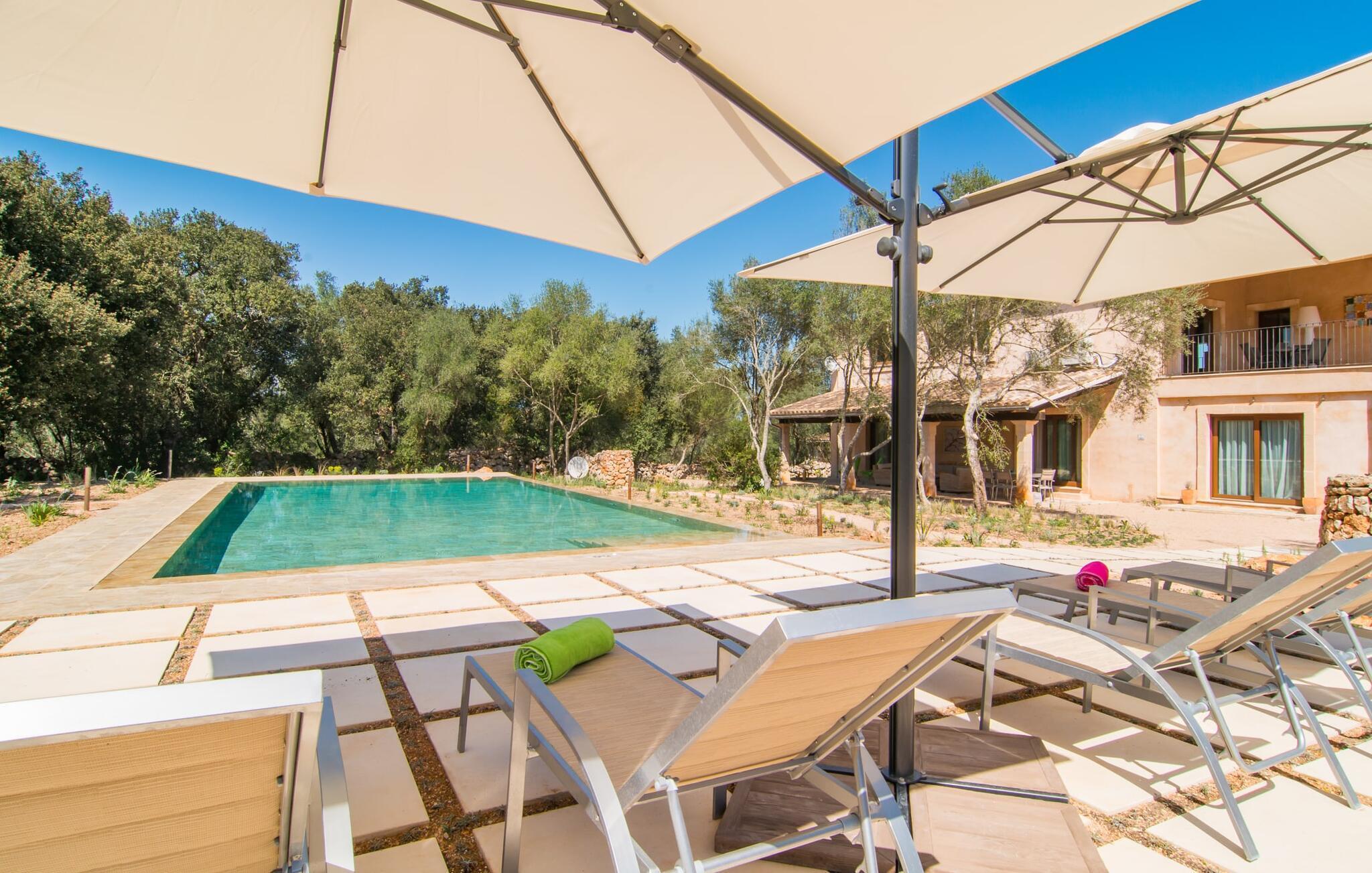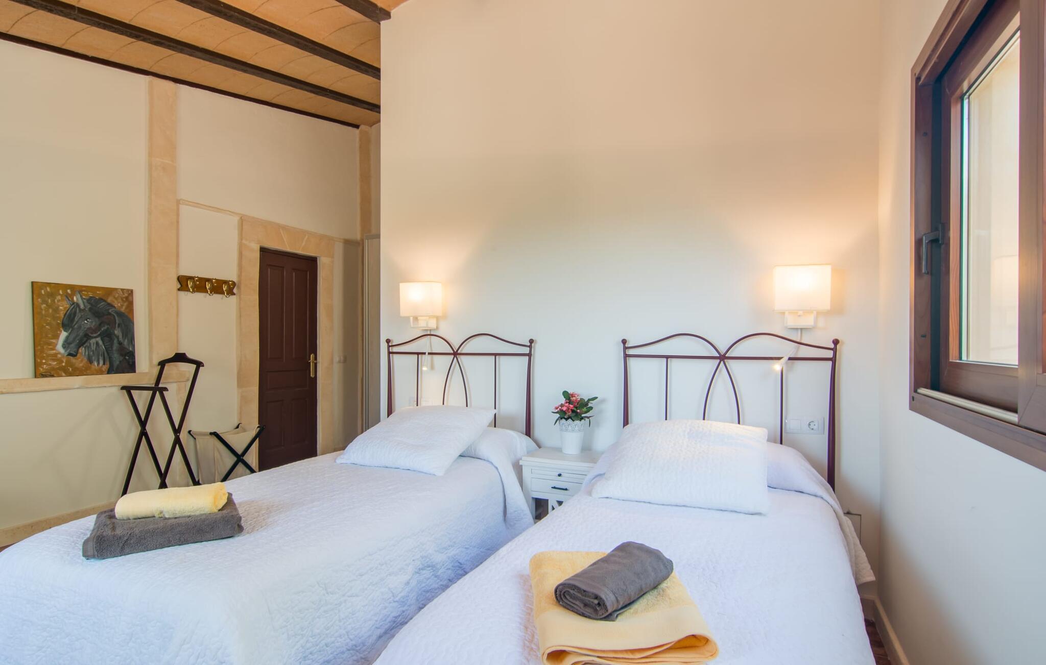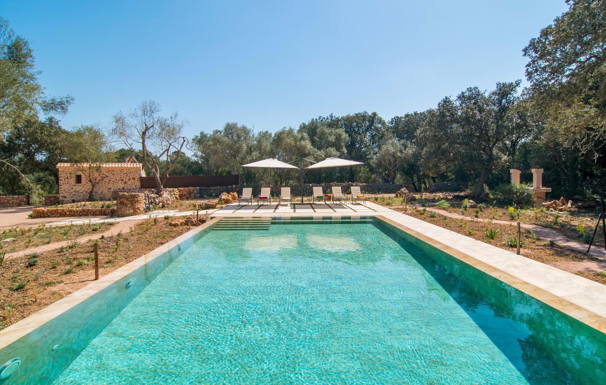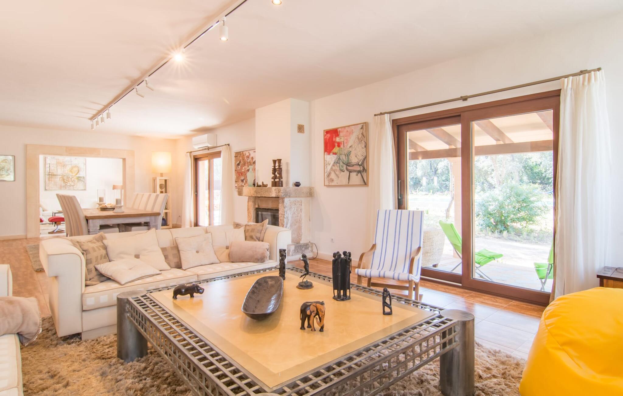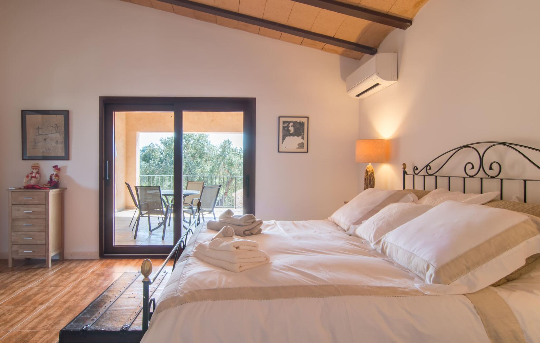 Farverne på "Can Madis" fanger straks øjet - de udtrykker livlighed, frihed, nærhed til naturen og på samme tid en følelse af ædel skønhed og luksus. Noget vi sjældent forkæler os selv med, måske alt for sjældent. Derfor bør du forkæle din familie og venner med et besøg på "Can Madis", en smuk ejendom i hjertet af vores ø. Figen- og oliventræer, cypresser og udsigt over Tramuntana-bjergene karakteriserer middelhavsejendommen. Den nybyggede sandstensbygning, der skinner gyldent i solen, afspejler tradition og modernitet. Det er afrundet af den enorme pool med komfortabel indgang. Efter lange dage med udflugter eller vandreture kan du slappe af i spabadet. Bagefter kan du tage en siesta på en af de komfortable liggestole under den dobbelte parasol eller blot slappe af i en af hængekøjerne i haven. Den indbyggede hjørnegrill fungerer også som bålplads efter et lækkert festmåltid - du kan sidde på de indbydende kurvemøbler ved et langt træbord under markiserne. Du kan også finde mere komfortable møbler på den overdækkede del af terrassen med spiseplads, en afslappet lounge og farverige liggestole. Dette er et Fincallorca feriehus. Afslapning er hovedaktiviteten på programmet, så det usædvanligt smarte interiør og udvendige design vil altid passe til dine behov. Midtpunktet er det kombinerede opholdsrum. Denne lyse stue med gulv til loft vinduer er opdelt i en hyggelig stue med sofagruppe og tv-hjørne, en stilfuld spiseplads foran en hyggelig pejs og et rustikt bibliotek, ligeledes med smart-tv. Så mange yndlingssteder at vælge imellem! Terracotta, trægulve, buede lofter og "hopper" understreger den naturlige atmosfære i interiøret. Du vil også opdage denne kvalitet i det fuldt udstyrede køkken med træmøbler af høj kvalitet. Samtidig minder det om et gammelt stuehus med det andet ildsted: I tidligere tider var dette socialcenter, da det ofte var det eneste opvarmede lokale. Efter lange, frie dage vil du til sidst føle dig træt - du kan derefter trække dig tilbage til et af de fire airconditionerede soveværelser, hvoraf de fleste er placeret på øverste etage (et soveværelse med badeværelse er i stueetagen). På første sal har hvert af de smarte soveværelser med fantastisk udsigt også et badeværelse med brusekabine eller badekar. Den rummelige balkon med tag, hvorfra du kan overskue haven og poolen, er et ideelt sted at trække sig tilbage for at læse en god bog. Lad os være ærlige – kan du komme i tanke om noget, du skal gå på kompromis med? Vi er helt vilde med "Can Madis". Det gælder også den smukke beliggenhed af denne premium villa, selvom øens centrum ofte får mindre opmærksomhed. Det er også tilfældet med Costitx, den dejlige lille by, der hurtigt kan nås. Det tilbyder alt, hvad du behøver til hverdagen, såvel som de typiske ø-faciliteter: et landsbytorv i centrum og et ugentligt marked om lørdagen. Caféer, restauranter, en bank, et apotek, et supermarked – hvad mere kan dit hjerte ønske sig? Og i denne lille by er der af alle steder et planetarium – men måske er udsigten til stjernerne midt på øen simpelthen den smukkeste. Du bør bestemt også besøge Santuari Ferrer de Son Ferrer-attraktionen, som du endda kan kombinere med en kort gåtur. Simpelthen spredt ud - takket være den centrale beliggenhed kan du hurtigt nå alle regioner. God fornøjelse med at udforske hele Mallorca! Den moderne naturstensvilla "Can Madis" byder på et unikt smukt feriehus med en stor pool og et omfattende havelandskab. Ejendommen har en utrolig rolig beliggenhed i centrum af øen mellem Sencelles og Costitx, hvor du også kan shoppe eller besøge det ugentlige marked. Fra den centrale del af øen kan du tage på fantastiske ture til alle kystregioner og deres lokale strande - fra Cuidad Jardin i syd til Alcúdia-bugten i nord.