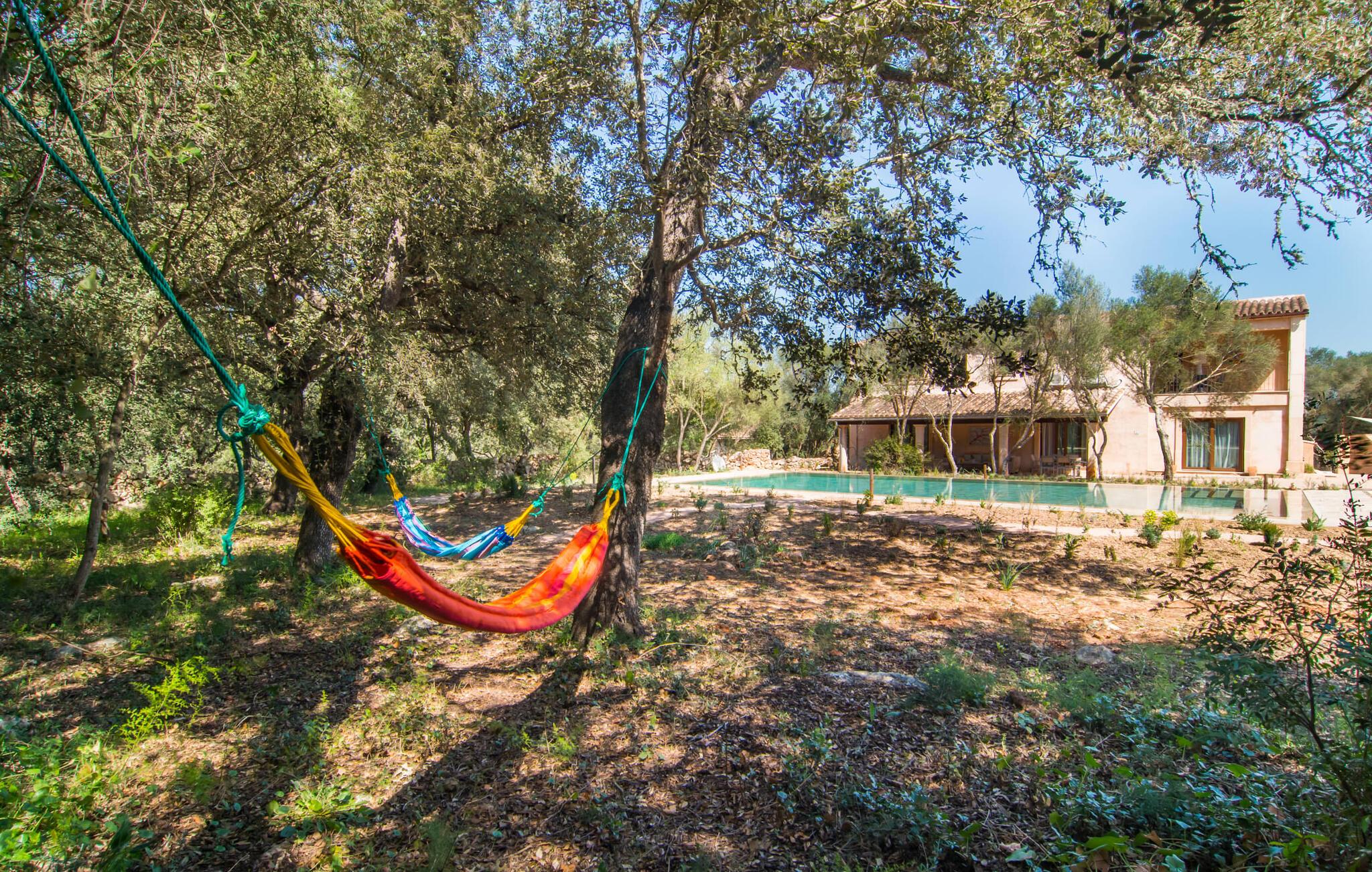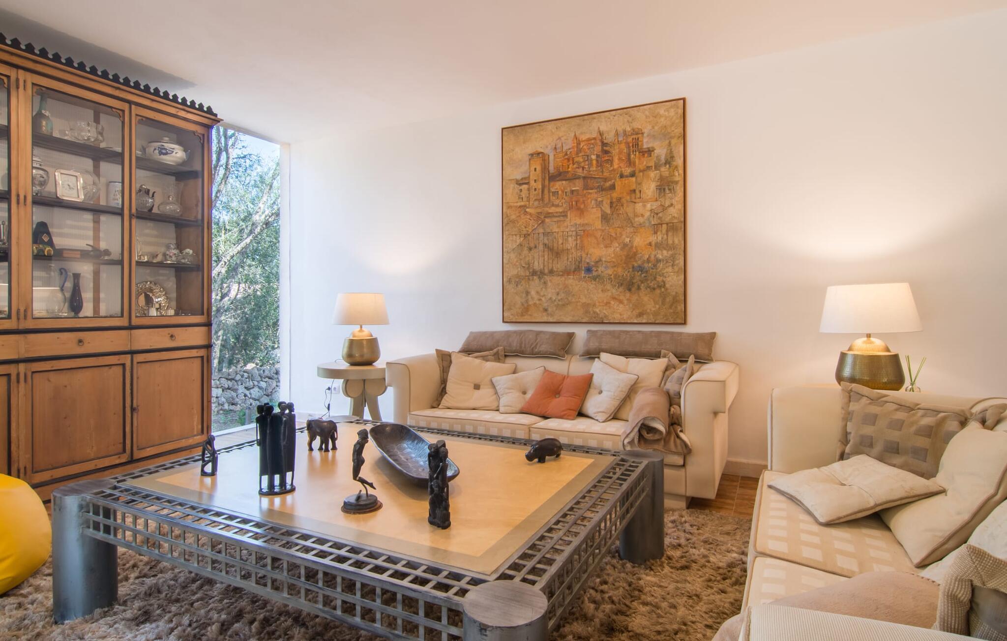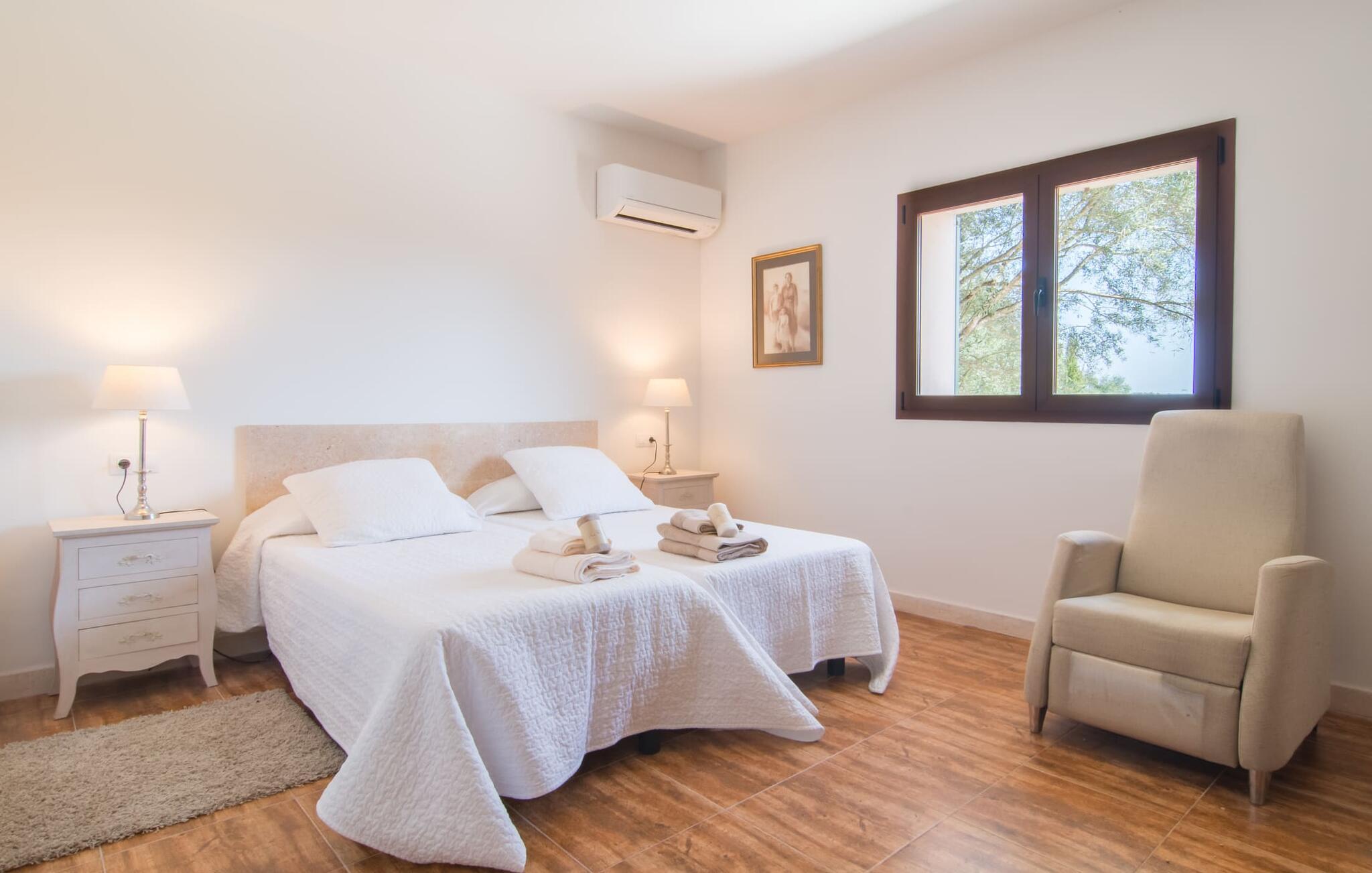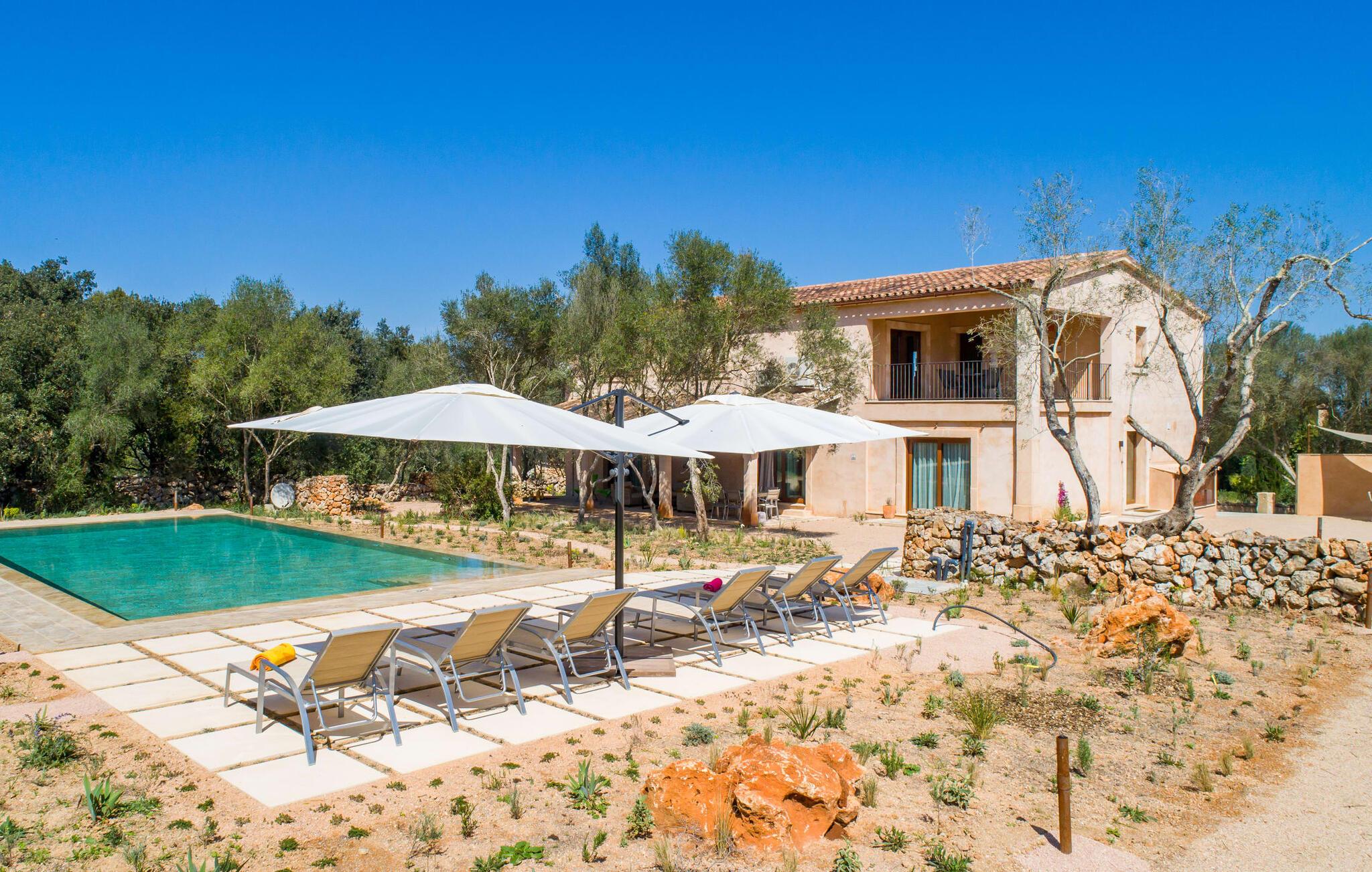 Farverne på "Can Madis" fanger straks øjet - de udtrykker livlighed, frihed, nærhed til naturen og på samme tid en følelse af ædel skønhed og luksus. Noget vi sjældent forkæler os selv med, måske alt for sjældent. Derfor bør I forkæle jeres familie og venner med et besøg på "Can Madis", en smuk ejendom i hjertet af vores ø. Figen- og oliventræer, cypresser og udsigt over Tramuntana-bjergene karakteriserer middelhavsejendommen. Den nybyggede sandstensbygning, der skinner gyldent i solen, afspejler tradition og modernitet. Det er afrundet af den enorme pool med komfortabel indgang. Efter lange dage med udflugter eller vandreture kan I slappe af i spabadet. Bagefter kan I tage en siesta på en af de komfortable liggestole under den dobbelte parasol eller blot slappe af i en af hængekøjerne i haven. Den indbyggede hjørnegrill fungerer også som bålplads efter et lækkert festmåltid - I kan sidde på de indbydende kurvemøbler ved et langt træbord under markiserne. I kan også finde mere komfortable møbler på den overdækkede del af terrassen med spiseplads, en afslappet lounge og farverige liggestole. Afslapning er hovedaktiviteten på programmet, så det usædvanligt smarte interiør og udvendige design vil altid passe til jeres behov. Midtpunktet er det kombinerede opholdsrum. Denne lyse stue med gulv til loft vinduer er opdelt i en hyggelig stue med sofagruppe og tv-hjørne, en stilfuld spiseplads foran en hyggelig pejs og et rustikt bibliotek, ligeledes med smart-tv. Så mange yndlingssteder at vælge imellem! Terracotta, trægulve, buede lofter og "hopper" understreger den naturlige atmosfære i interiøret. I vil også opdage denne kvalitet i det fuldt udstyrede køkken med træmøbler af høj kvalitet. Samtidig minder det om et gammelt stuehus med det andet ildsted: I tidligere tider var dette socialcenter, da det ofte var det eneste opvarmede lokale. Efter lange, frie dage vil I til sidst føle jer træt - I kan derefter trække jer tilbage til et af de fire airconditionerede soveværelser, hvoraf de fleste er placeret på øverste etage (et soveværelse med badeværelse er i stueetagen). På første sal har hvert af de smarte soveværelser med fantastisk udsigt også et badeværelse med brusekabine eller badekar. Den rummelige balkon med tag, hvorfra I kan overskue haven og poolen, er et ideelt sted at trække sig tilbage for at læse en god bog. Lad os være ærlige – kan I komme i tanke om noget, I skal gå på kompromis med? Vi er helt vilde med "Can Madis". Det gælder også den smukke beliggenhed af denne premium villa, selvom øens centrum ofte får mindre opmærksomhed. Det er også tilfældet med Costitx, den dejlige lille by, der hurtigt kan nås. Det tilbyder alt, hvad I behøver til hverdagen, såvel som de typiske ø-faciliteter: et landsbytorv i centrum og et ugentligt marked om lørdagen. Caféer, restauranter, en bank, et apotek, et supermarked – hvad mere kan jeres hjerte ønske sig? Og i denne lille by er der af alle steder et planetarium – men måske er udsigten til stjernerne midt på øen simpelthen den smukkeste. I bør bestemt også besøge Santuari Ferrer de Son Ferrer-attraktionen, som I endda kan kombinere med en kort gåtur. Simpelthen spredt ud - takket være den centrale beliggenhed kan I hurtigt nå alle regioner. God fornøjelse med at udforske hele Mallorca! Den moderne naturstensvilla "Can Madis" byder på et unikt smukt feriehus med en stor pool og et omfattende havelandskab. Ejendommen har en utrolig rolig beliggenhed i centrum af øen mellem Sencelles og Costitx, hvor I også kan shoppe eller besøge det ugentlige marked. Fra den centrale del af øen kan I tage på fantastiske ture til alle kystregioner og deres lokale strande - fra Cuidad Jardin i syd til Alcúdia-bugten i nord.