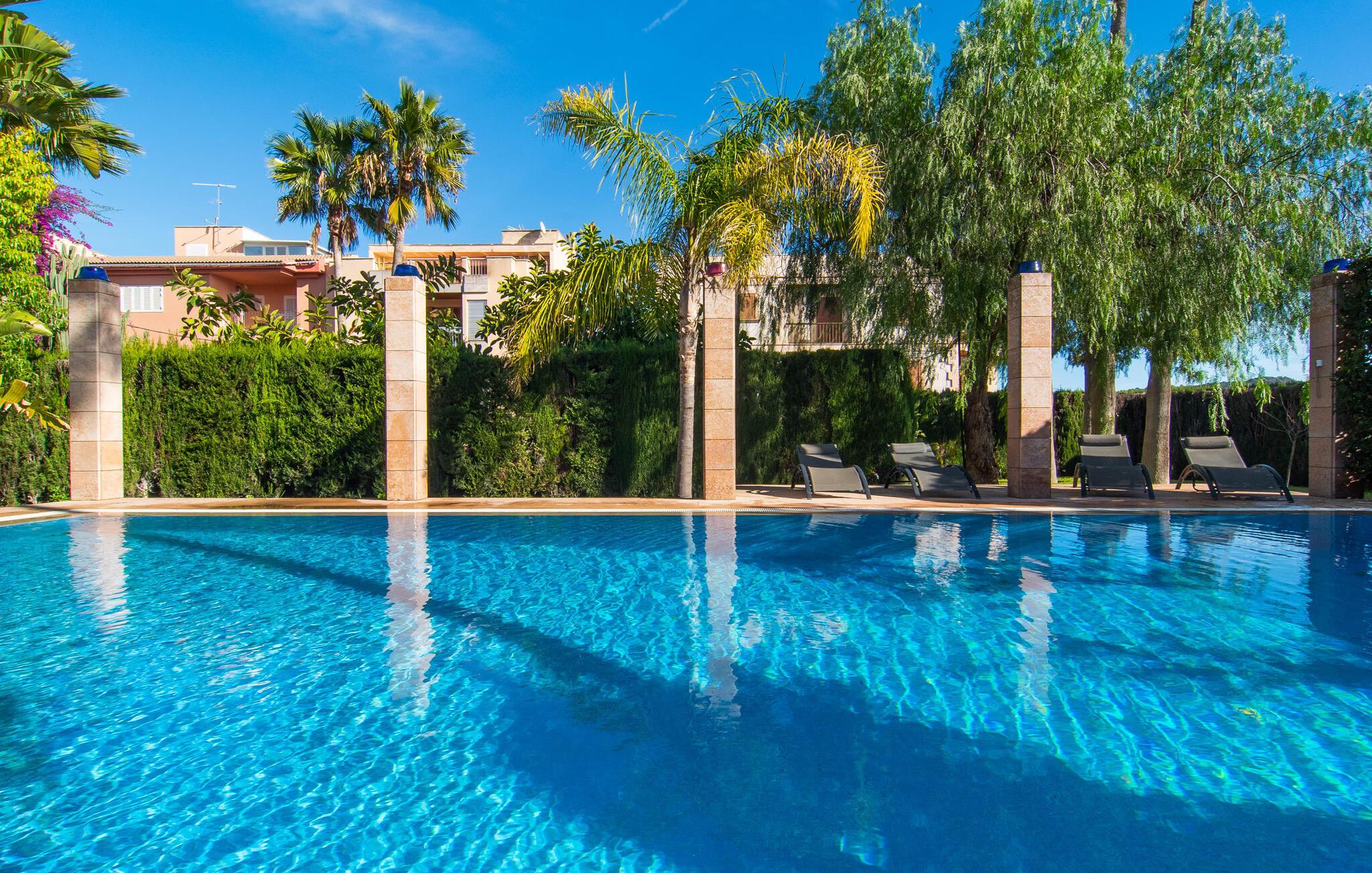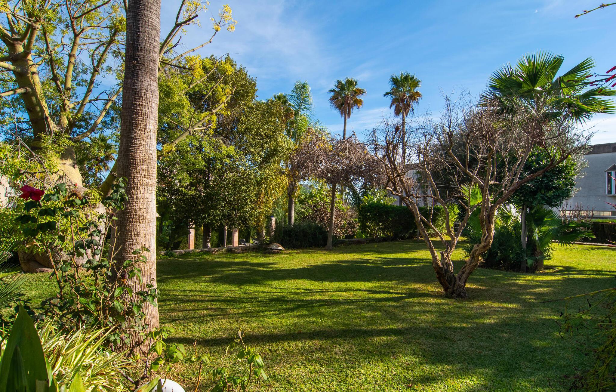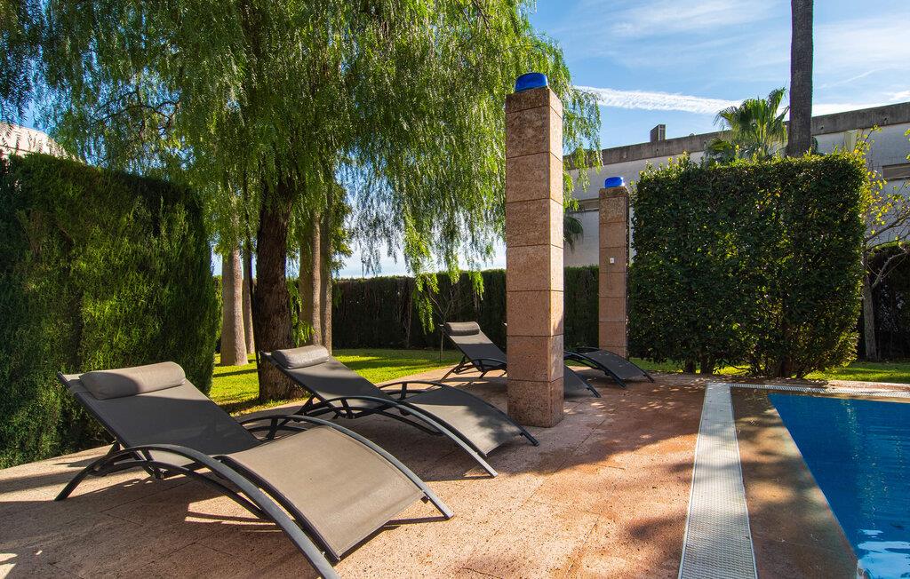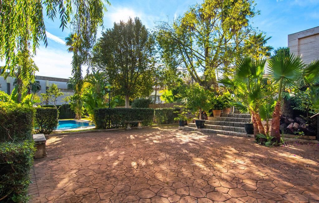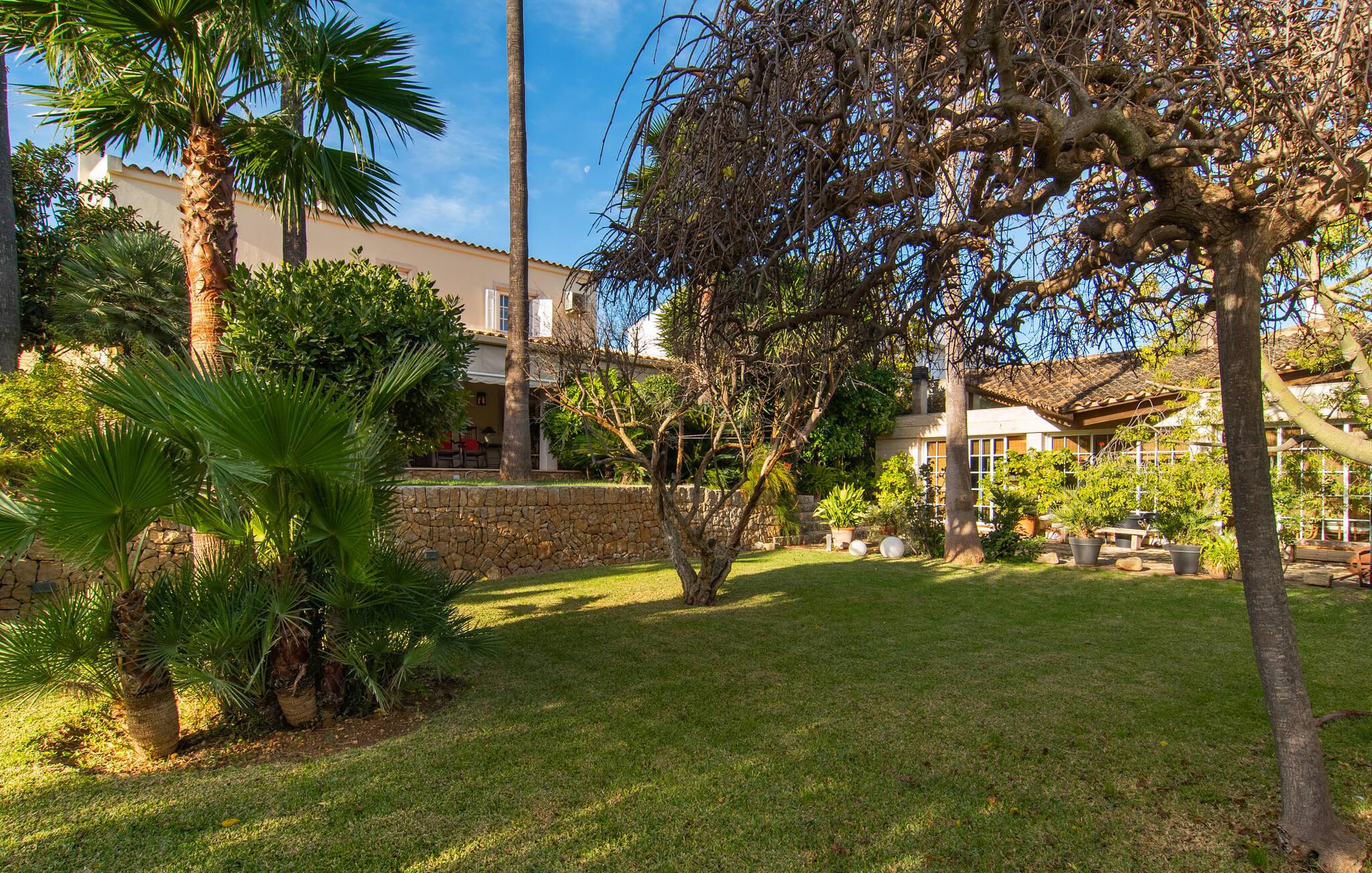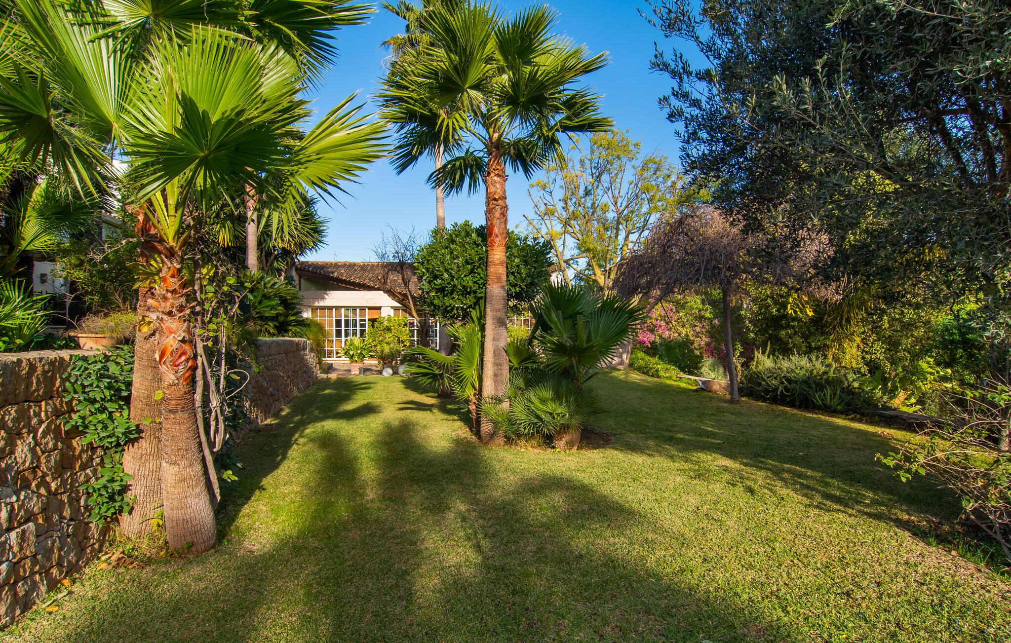Rækkehuset "Can Mandol" er et elegant, meget rummeligt feriehus på Mallorca. Denne ejendom omdefinerer konceptet for et rækkehus, der tilbyder et byparadis på en stor grund med en række indbydende udendørs muligheder. Den frodige, parklignende vegetation skaber en fantastisk baggrund for udendørs afslapning. I vil finde velplejede græsplæner og forskellige overdækkede terrasseområder, perfekt til at nyde tid med venner eller slappe af i fred. Poolen er let tilgængelig via romerske trin og inviterer jer til at tage en forfriskende svømmetur. En enestående funktion er det fremragende udstyrede sommerkøkken, som inklusiv en grill byder på en vidunderlig beskyttet atmosfære til kulinariske eventyr. Indenfor fortsætter den luksuriøse indretning med at imponere. De rummelige værelser udstråler klassisk elegance og kan komfortabelt rumme op til otte gæster. Rigelig naturligt lys beriger opholdsrummene, hvoraf nogle er indrettet med lyse farver og gennemtænkt tilbehør. I stueetagen er der opholds- og spisestue og to soveværelser med hvert sit badeværelse og et påklædningsværelse. På øverste etage er der yderligere to soveværelser, også med private badeværelser og et med påklædningsværelse. Alle værelser er udstyret med aircondition, hvilket sikrer afslappende nætter selv i de varmere måneder. Rækkehuset "Can Mandol" præsenterer sig som et elegant, meget rummeligt feriehus på Mallorca. På grund af den urbane beliggenhed og fremragende infrastruktur kan I endda gøre jeres dagligvarer til fods, for eksempel på det ugentlige marked om torsdagen. De smukke strande, for eksempel i den lange bugt Alcúdia, ligger omkring 24 km væk.