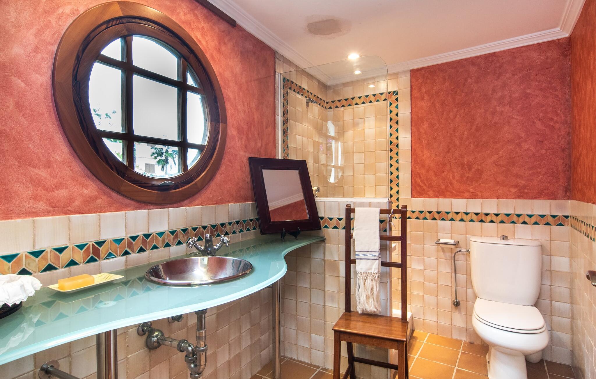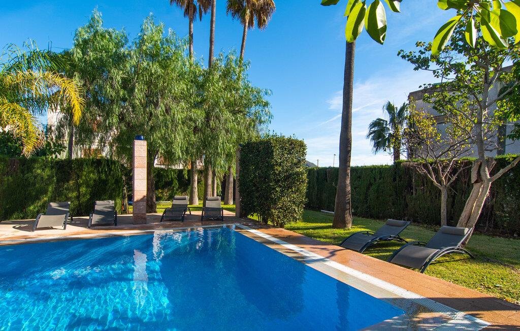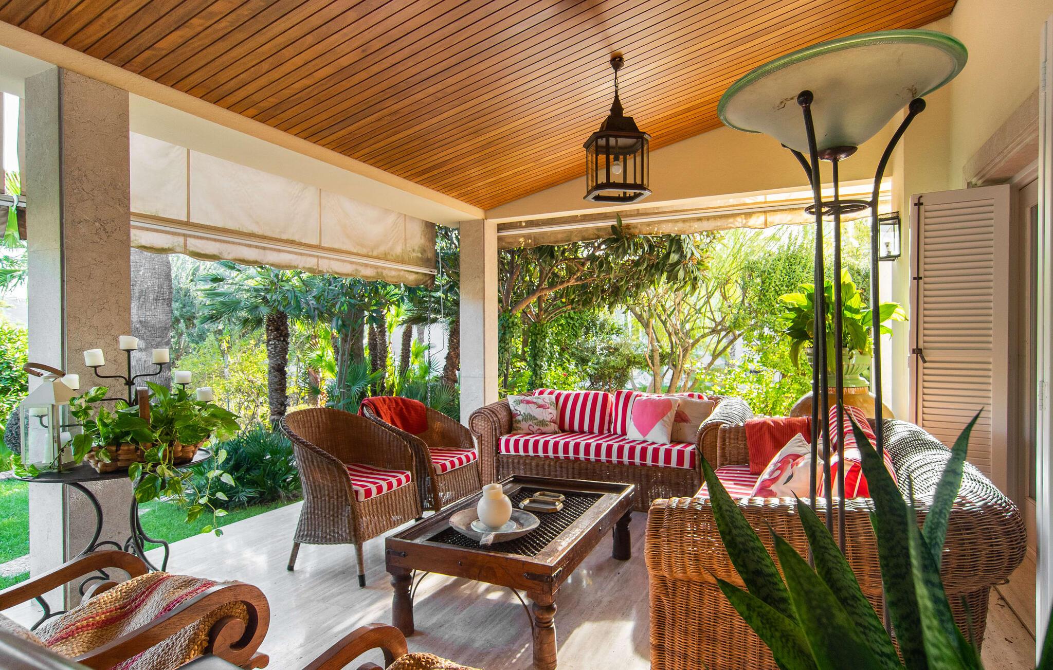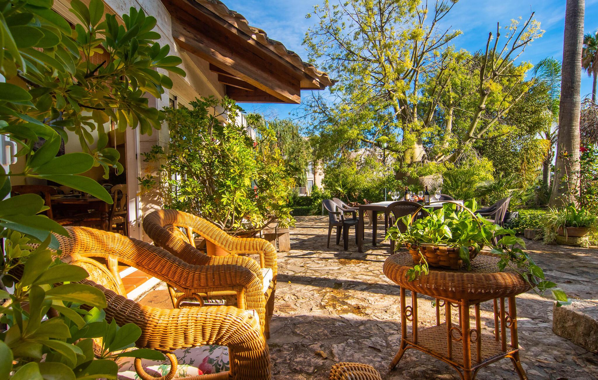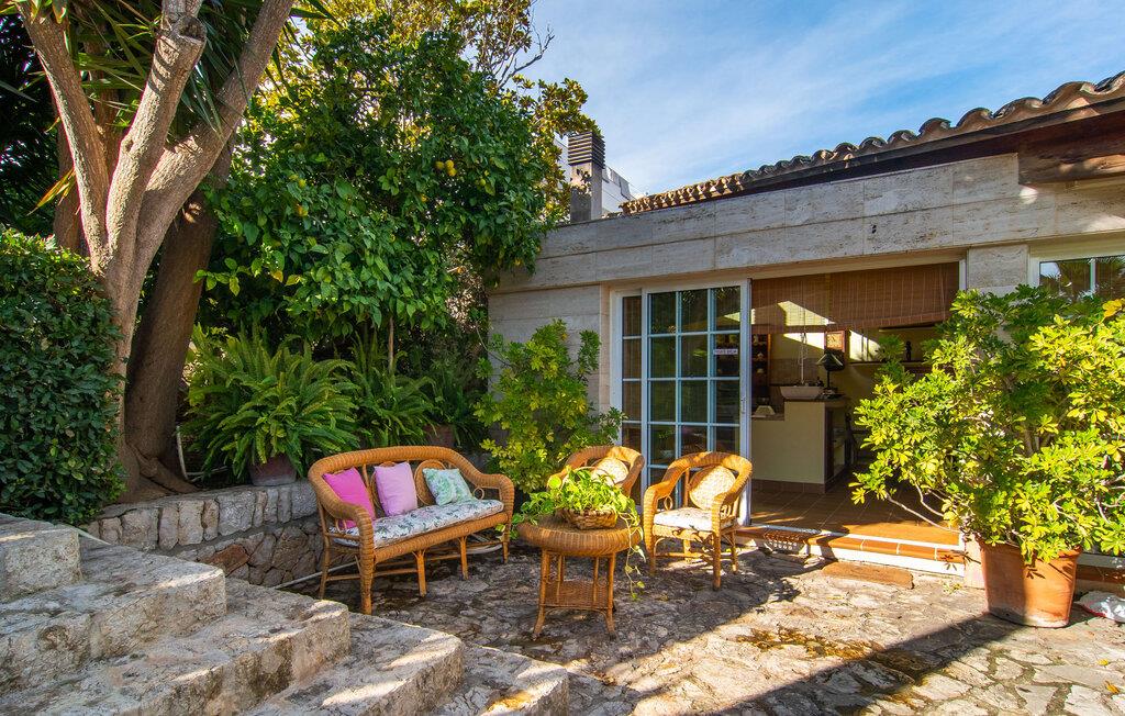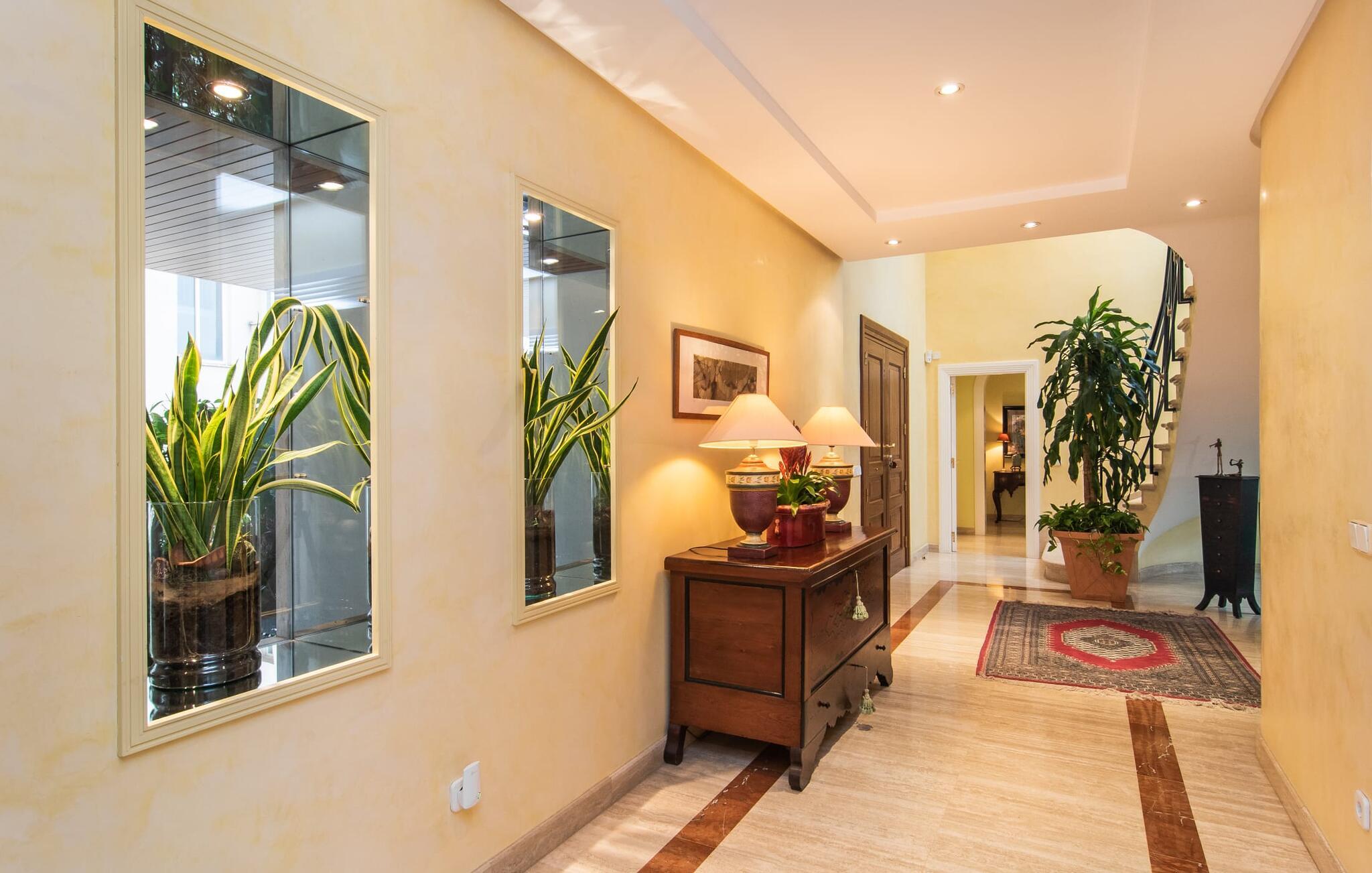Rækkehuset "Can Mandol" er et elegant, meget rummeligt feriehus på Mallorca. Denne ejendom omdefinerer konceptet for et rækkehus, der tilbyder et byparadis på en stor grund med en række indbydende udendørs muligheder. Den frodige, parklignende vegetation skaber en fantastisk baggrund for udendørs afslapning. I vil finde velplejede græsplæner og forskellige overdækkede terrasseområder, perfekt til at nyde tid med venner eller slappe af i fred. Poolen er let tilgængelig via romerske trin og inviterer jer til at tage en forfriskende svømmetur. En enestående funktion er det fremragende udstyrede sommerkøkken, som inklusiv en grill byder på en vidunderlig beskyttet atmosfære til kulinariske eventyr. Indenfor fortsætter den luksuriøse indretning med at imponere. De rummelige værelser udstråler klassisk elegance og kan komfortabelt rumme op til otte gæster. Rigelig naturligt lys beriger opholdsrummene, hvoraf nogle er indrettet med lyse farver og gennemtænkt tilbehør. I stueetagen er der opholds- og spisestue og to soveværelser med hvert sit badeværelse og et påklædningsværelse. På øverste etage er der yderligere to soveværelser, også med private badeværelser og et med påklædningsværelse. Alle værelser er udstyret med aircondition, hvilket sikrer afslappende nætter selv i de varmere måneder. Rækkehuset "Can Mandol" præsenterer sig som et elegant, meget rummeligt feriehus på Mallorca. På grund af den urbane beliggenhed og fremragende infrastruktur kan I endda gøre jeres dagligvarer til fods, for eksempel på det ugentlige marked om torsdagen. De smukke strande, for eksempel i den lange bugt Alcúdia, ligger omkring 24 km væk.