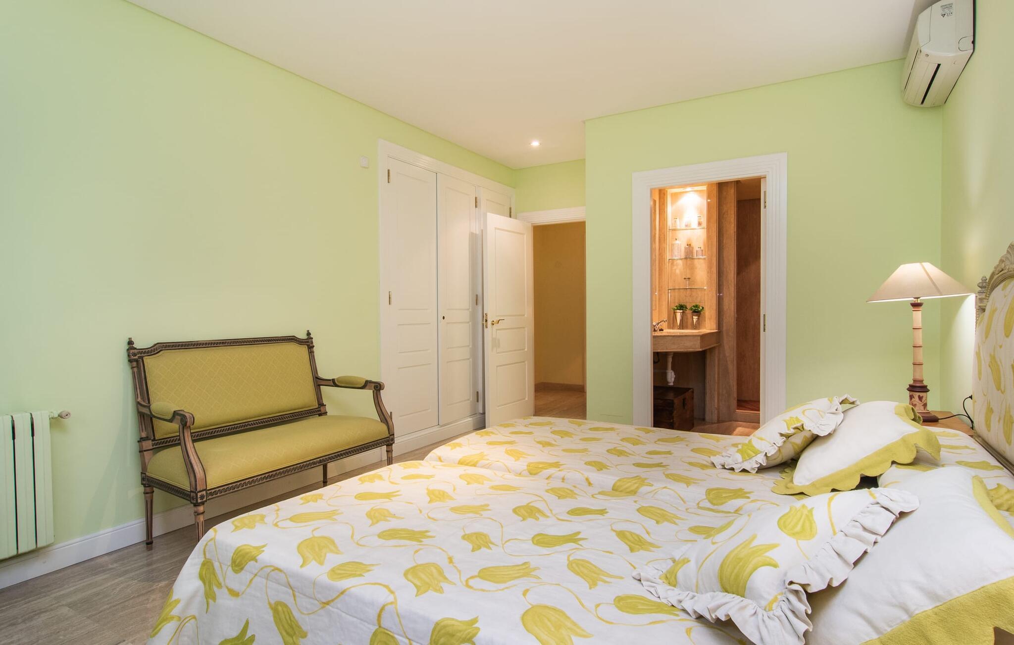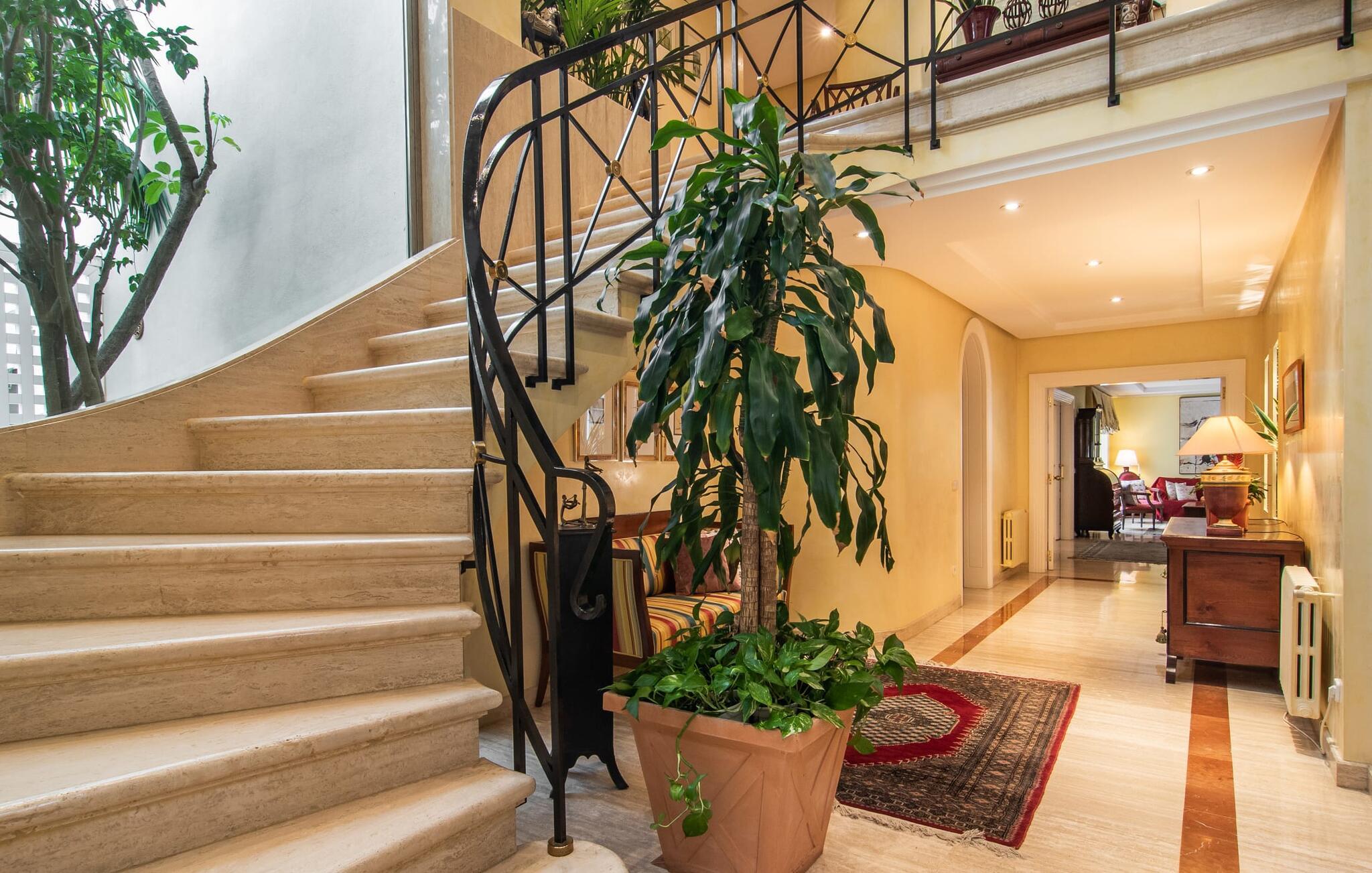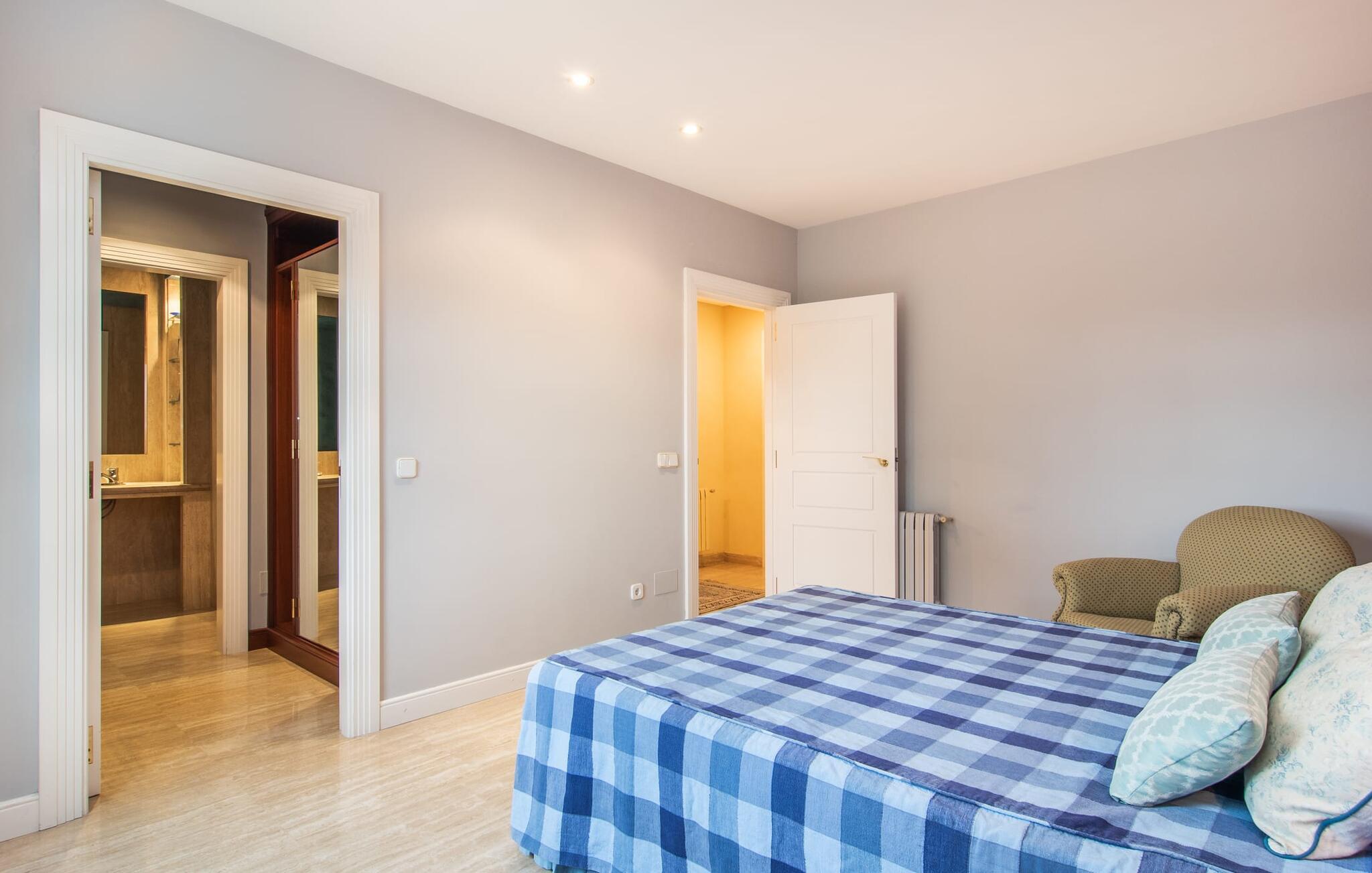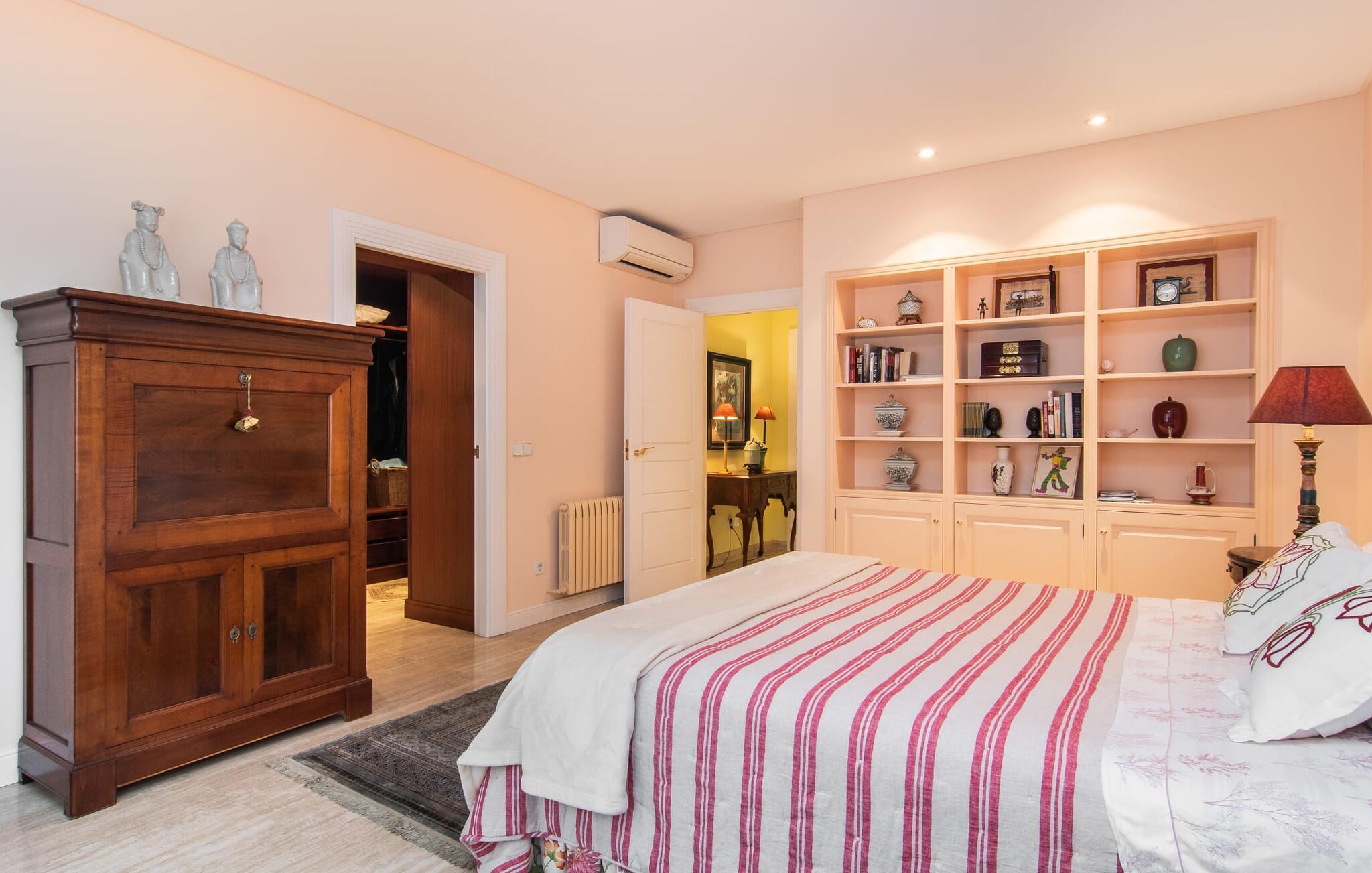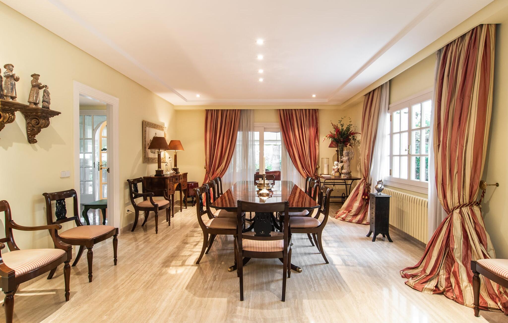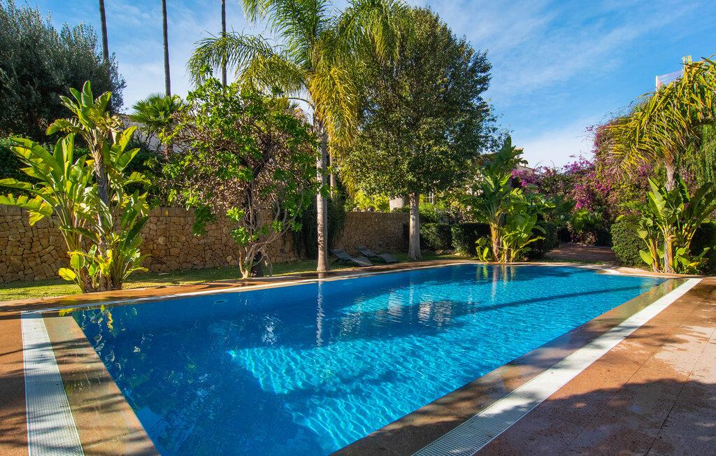 Rækkehuset "Can Mandol" er et elegant, meget rummeligt feriehus på Mallorca. Denne ejendom omdefinerer konceptet for et rækkehus, der tilbyder et byparadis på en stor grund med en række indbydende udendørs muligheder. Den frodige, parklignende vegetation skaber en fantastisk baggrund for udendørs afslapning. I vil finde velplejede græsplæner og forskellige overdækkede terrasseområder, perfekt til at nyde tid med venner eller slappe af i fred. Poolen er let tilgængelig via romerske trin og inviterer jer til at tage en forfriskende svømmetur. En enestående funktion er det fremragende udstyrede sommerkøkken, som inklusiv en grill byder på en vidunderlig beskyttet atmosfære til kulinariske eventyr. Indenfor fortsætter den luksuriøse indretning med at imponere. De rummelige værelser udstråler klassisk elegance og kan komfortabelt rumme op til otte gæster. Rigelig naturligt lys beriger opholdsrummene, hvoraf nogle er indrettet med lyse farver og gennemtænkt tilbehør. I stueetagen er der opholds- og spisestue og to soveværelser med hvert sit badeværelse og et påklædningsværelse. På øverste etage er der yderligere to soveværelser, også med private badeværelser og et med påklædningsværelse. Alle værelser er udstyret med aircondition, hvilket sikrer afslappende nætter selv i de varmere måneder. Rækkehuset "Can Mandol" præsenterer sig som et elegant, meget rummeligt feriehus på Mallorca. På grund af den urbane beliggenhed og fremragende infrastruktur kan I endda gøre jeres dagligvarer til fods, for eksempel på det ugentlige marked om torsdagen. De smukke strande, for eksempel i den lange bugt Alcúdia, ligger omkring 24 km væk.