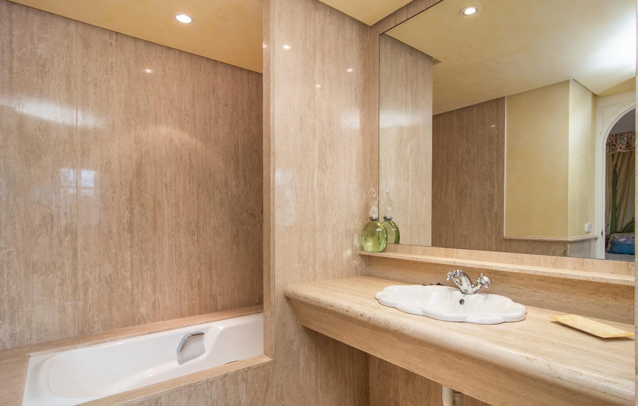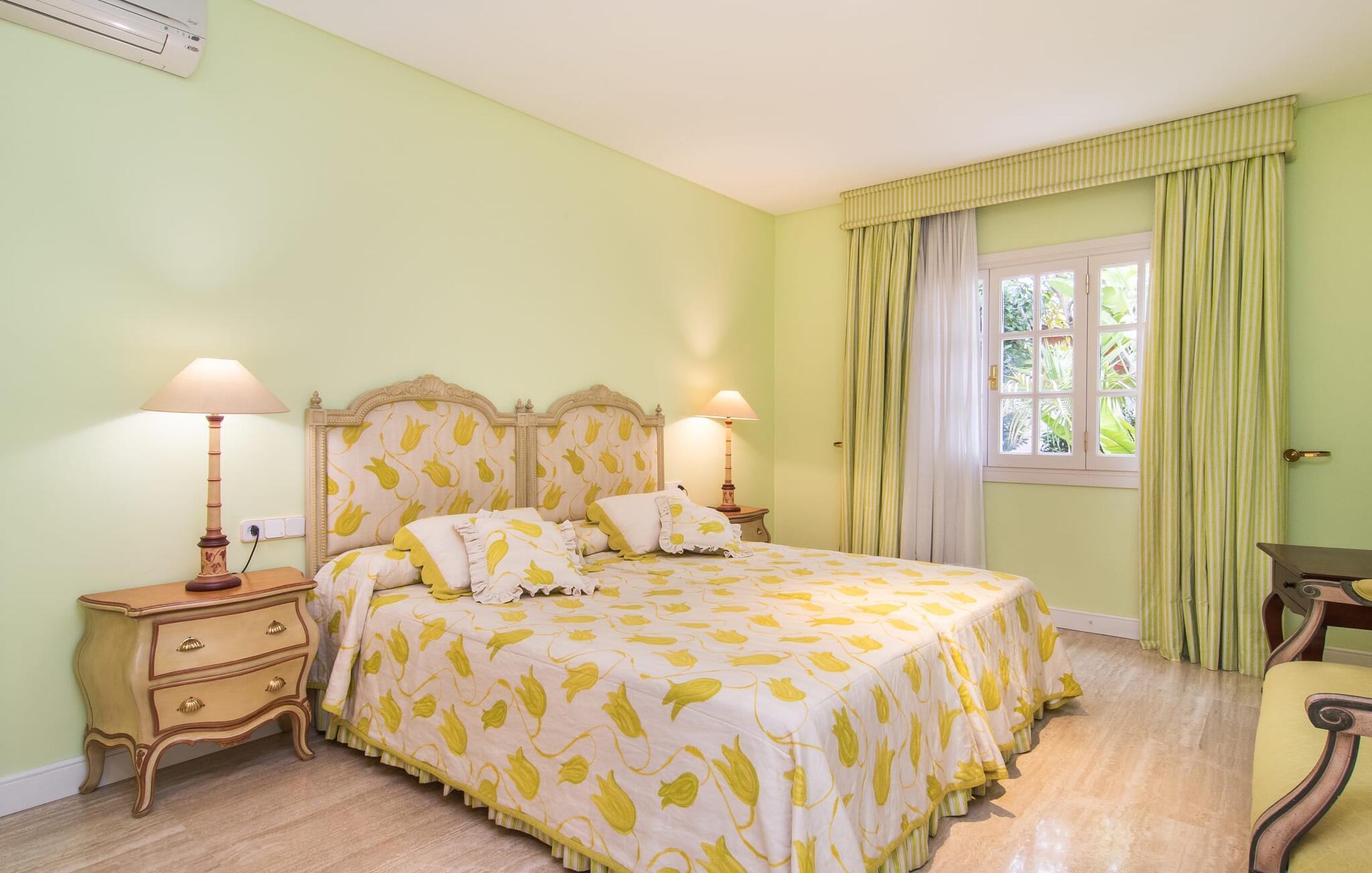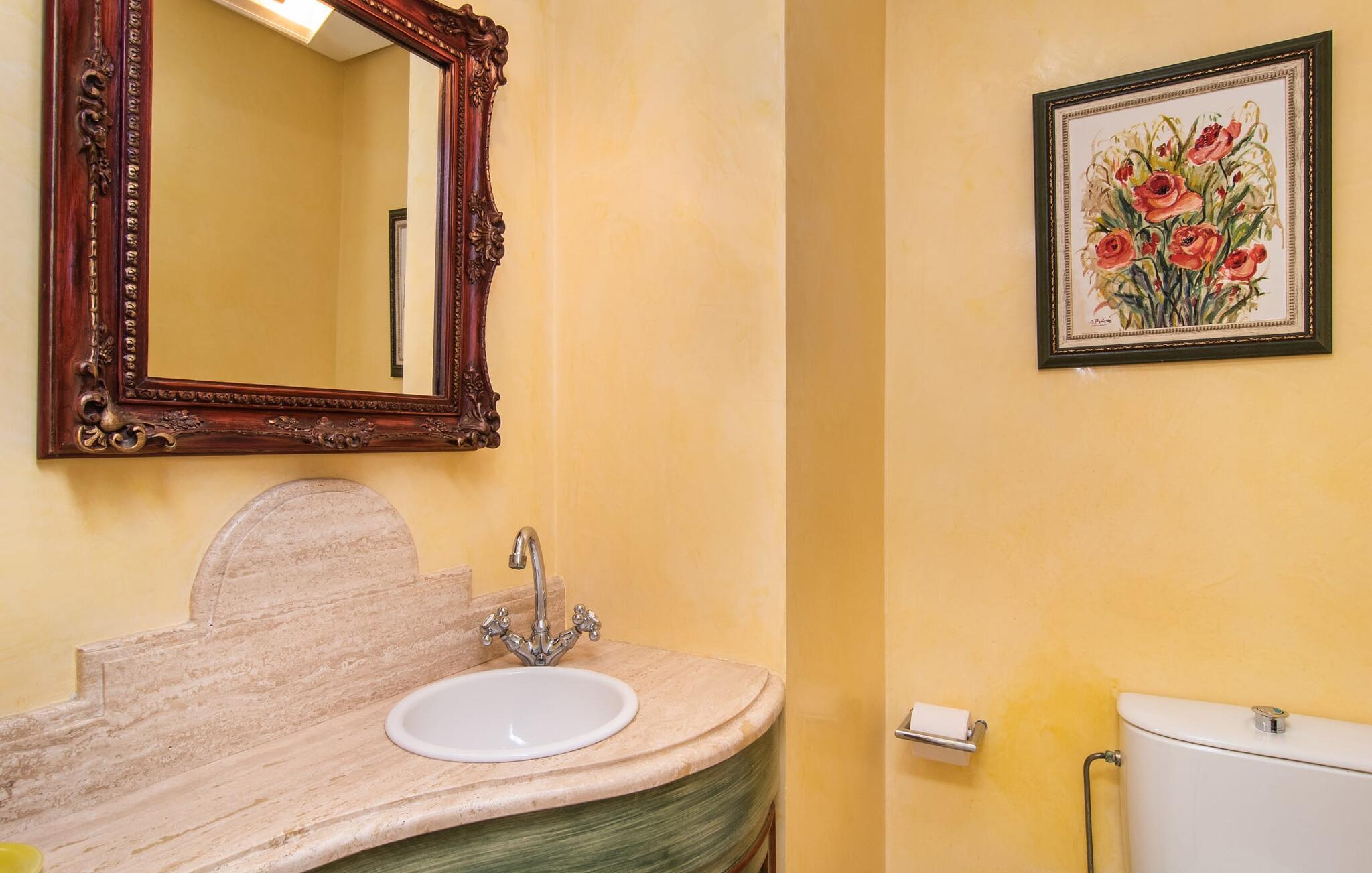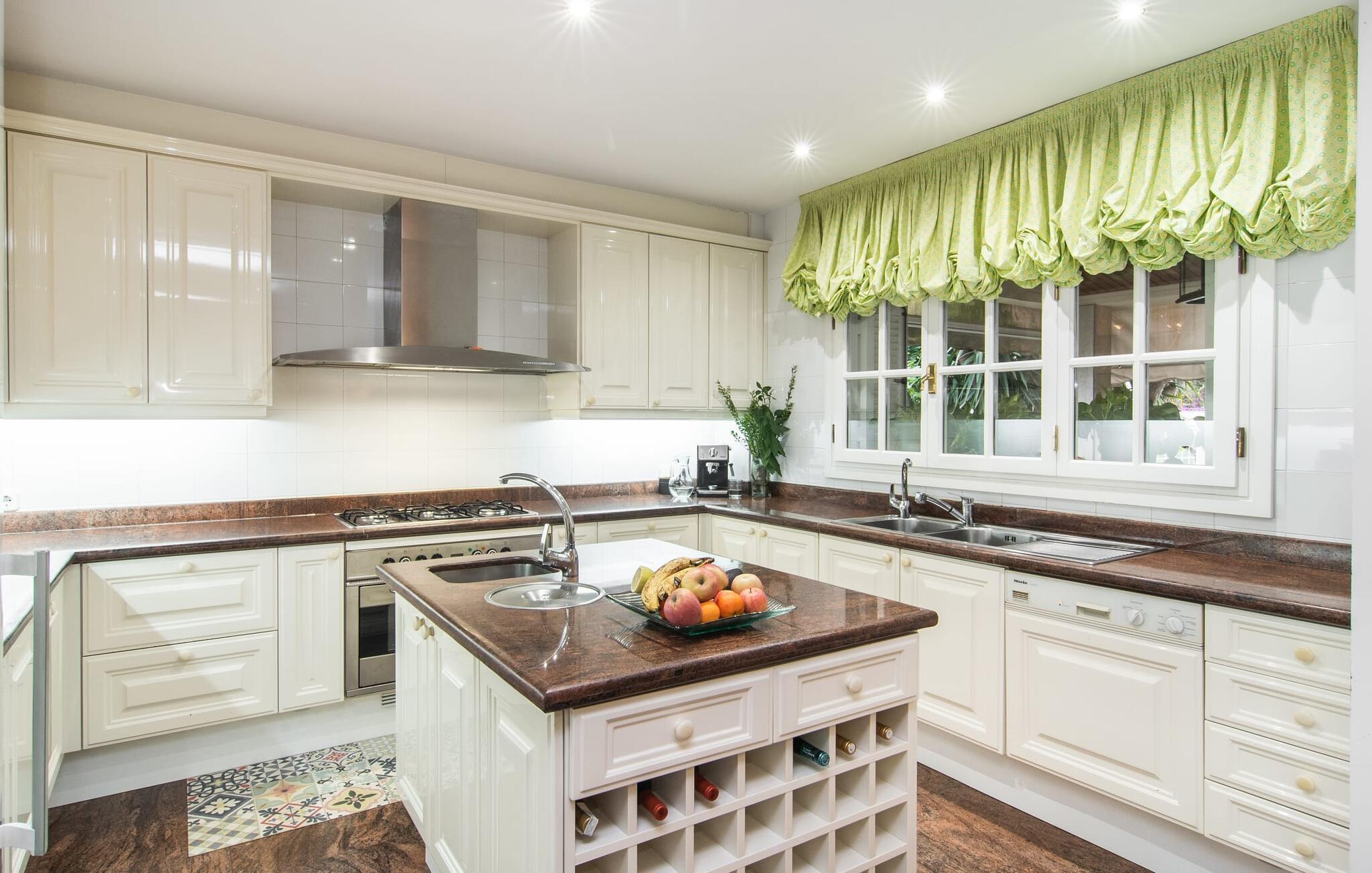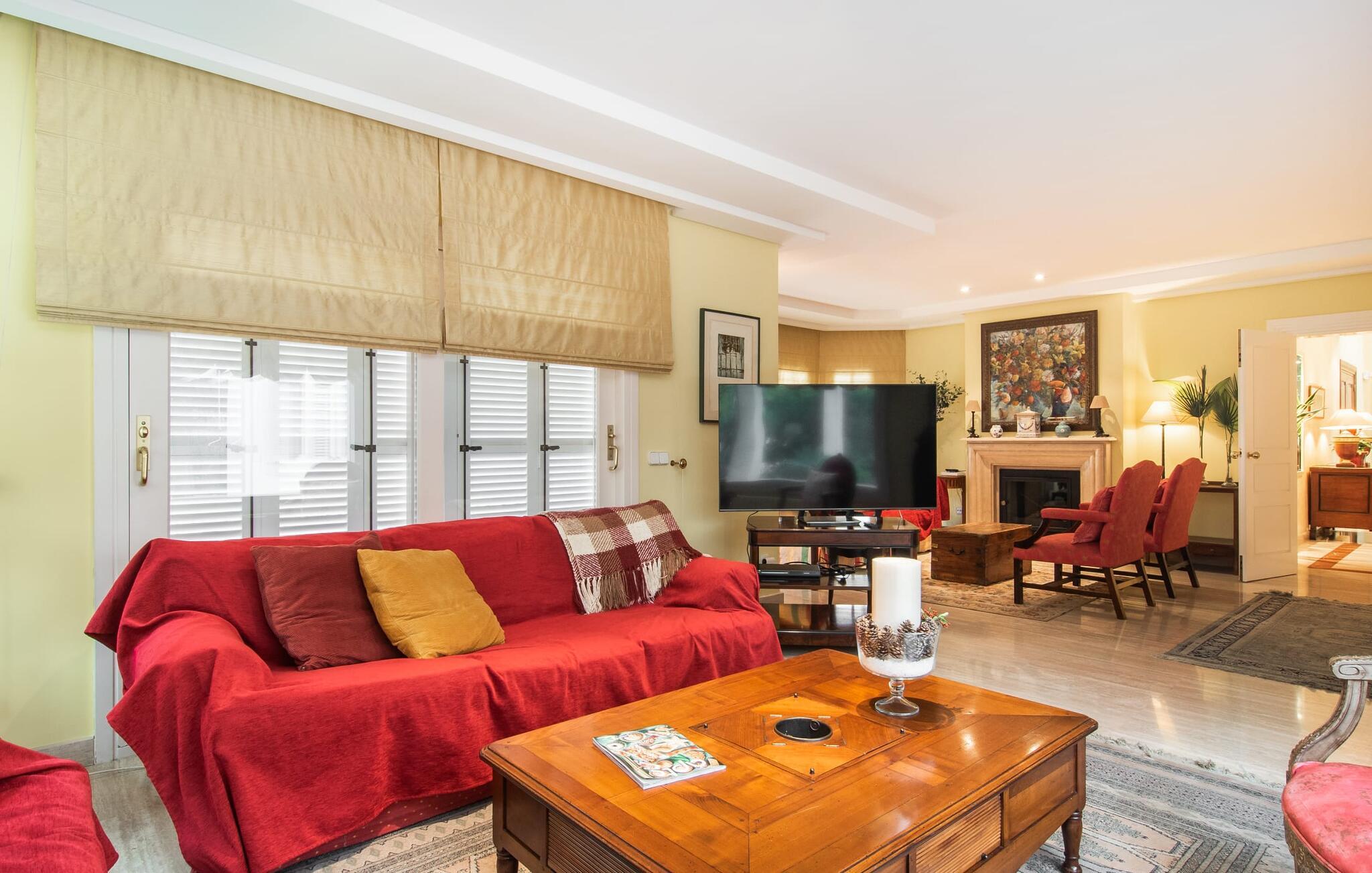 Rækkehuset "Can Mandol" er et elegant, meget rummeligt feriehus på Mallorca. Denne ejendom omdefinerer konceptet for et rækkehus, der tilbyder et byparadis på en stor grund med en række indbydende udendørs muligheder. Den frodige, parklignende vegetation skaber en fantastisk baggrund for udendørs afslapning. I vil finde velplejede græsplæner og forskellige overdækkede terrasseområder, perfekt til at nyde tid med venner eller slappe af i fred. Poolen er let tilgængelig via romerske trin og inviterer jer til at tage en forfriskende svømmetur. En enestående funktion er det fremragende udstyrede sommerkøkken, som inklusiv en grill byder på en vidunderlig beskyttet atmosfære til kulinariske eventyr. Indenfor fortsætter den luksuriøse indretning med at imponere. De rummelige værelser udstråler klassisk elegance og kan komfortabelt rumme op til otte gæster. Rigelig naturligt lys beriger opholdsrummene, hvoraf nogle er indrettet med lyse farver og gennemtænkt tilbehør. I stueetagen er der opholds- og spisestue og to soveværelser med hvert sit badeværelse og et påklædningsværelse. På øverste etage er der yderligere to soveværelser, også med private badeværelser og et med påklædningsværelse. Alle værelser er udstyret med aircondition, hvilket sikrer afslappende nætter selv i de varmere måneder. Rækkehuset "Can Mandol" præsenterer sig som et elegant, meget rummeligt feriehus på Mallorca. På grund af den urbane beliggenhed og fremragende infrastruktur kan I endda gøre jeres dagligvarer til fods, for eksempel på det ugentlige marked om torsdagen. De smukke strande, for eksempel i den lange bugt Alcúdia, ligger omkring 24 km væk.