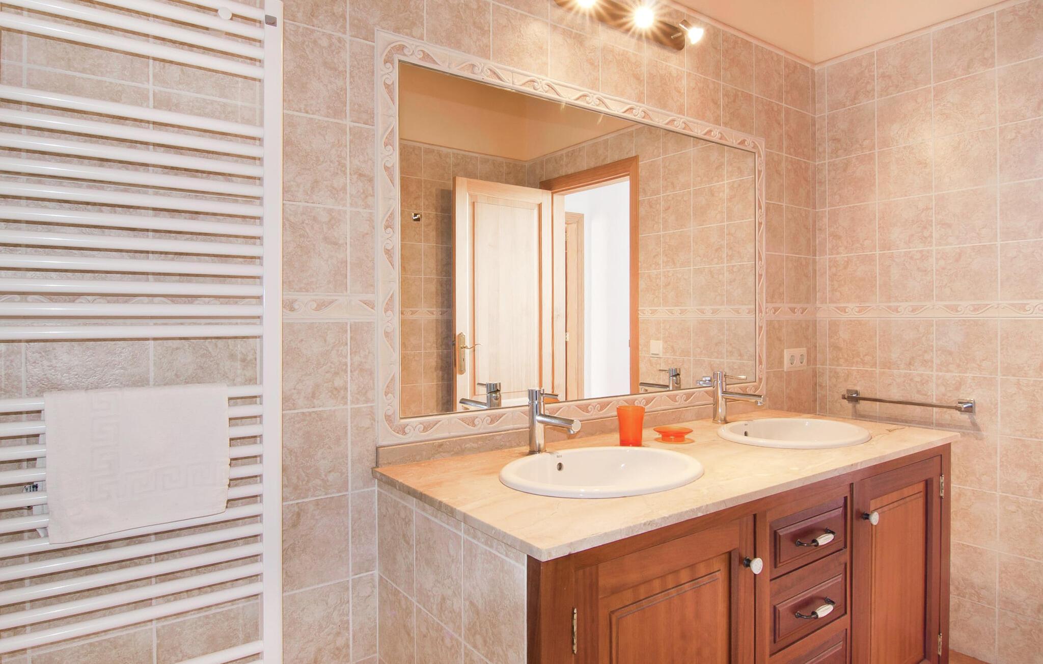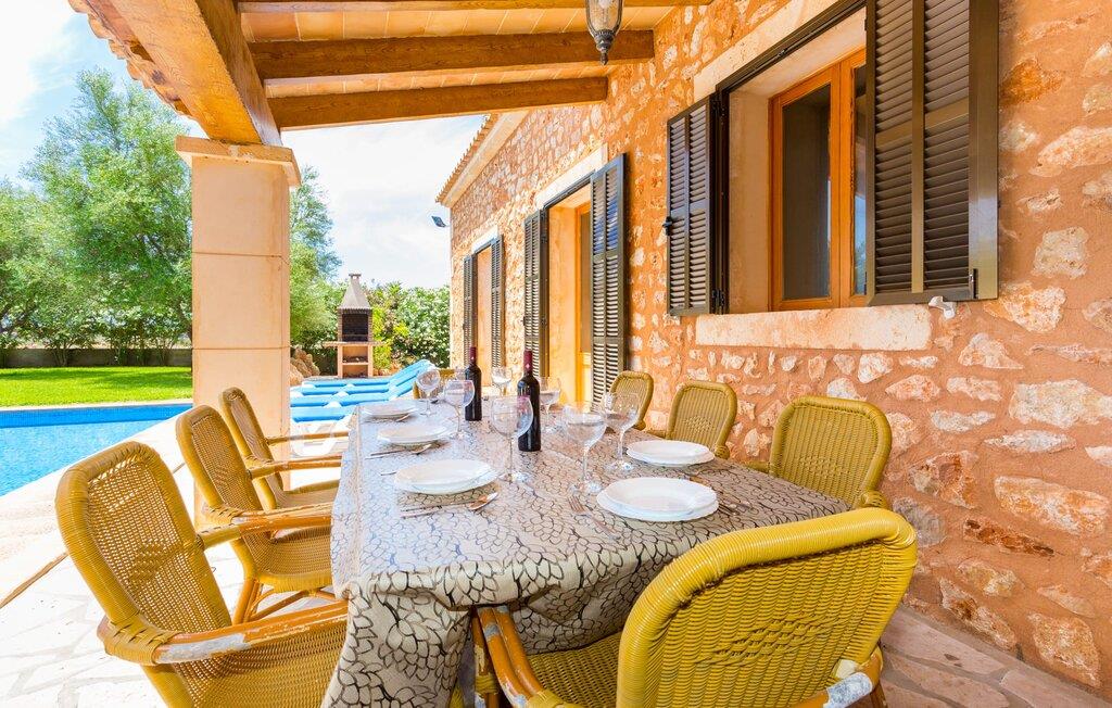 Villaen "Can Mates Nou" er omgivet af en luftig bushhæk og byder sine gæster velkommen i en idyllisk, landlig atmosfære. Store grusarealer omkranser husets forside, den nænsomt anlagte have krydses af indbydende terrasser beklædt med dekorative naturstensplader. Poolen, som ligger i husets umiddelbare nærhed, skaber en særlig maritim flair, som understreges og pyntes af de to høje palmer. Poolen er flisebelagt med smukke blå mosaikfliser og har praktisk trappeadgang. Der er også en praktisk udendørs bruser. Talrige komfortable liggestole giver jer mulighed for at slappe grundigt af mellem forfriskende dyk i poolen, måske med en kølig, lækker drink. Afhængigt af tidspunktet på dagen byder haven på lidt kølende skygge for at undslippe varmen. Børn vil elske at lege og løbe rundt på den smukke græsplæne. Den overdækkede del af terrassen, der støder op til ejendommen, byder på et vidunderligt, massivt spisebord, hvor I kan nyde jeres hyggelige middag udendørs. Uanset om det er til morgenmad eller en kulinarisk grillaften - denne smukke ejendom med en vidunderlig udsigt over den grønne have og middelhavshimlen vil glæde sine gæster på ethvert tidspunkt af dagen. I kan nemt få adgang til huset direkte fra terrassen, hvis enestående design afspejler udendørsområdets klare og sofistikerede linjer. Harmoniske farver på lofter og gulve, lyse vægge og træmøbler smelter sammen for at skabe en behagelig, hjemlig atmosfære. Samtidig vil I nyde stedets rummelige atmosfære. Selvom I er mæt i denne villa, vil I altid have mulighed for at finde et roligt og ugeneret privat område. Den rummelige stue/alrum giver jer mulighed for at slappe af på to komfortable sofaer, måske med et magasin, en god bog eller endda en underholdende film på satellit-tv. I kan nyde jeres middag sammen ved det store spisebord. Det moderne tekøkken af høj kvalitet byder på alt hvad I behøver til daglig brug. Der er også en filterkaffemaskine og en kedel. Rummelige og meget smagfuldt renoverede værelser inviterer til en afslappende nat. To senge på 1,50 x 1,90 m og fire 0,90 x 1,90 m er tilgængelige for en dyb søvn, indtil I vågner mere afslappet end nogensinde før. Tre naturligt oplyste og selektivt udstyrede moderne badeværelser tilbyder komfort og plads. Værelserne har strygejern og hårtørrer, så I behøver ikke at tage dem med. For korte udflugter bør I helt sikkert besøge den spændende og smukke havn i den tidligere fiskerlandsby Colonia de Sant Jordi (19 km). Hvis I kan lide at besøge stranden på ferie, er villaen "Can Mates Nou" perfekt for jer. De smukkeste strande på sydøstkysten, herunder den familievenlige Es Trenc strand, ligger i umiddelbar nærhed og kan nemt nås med en lejebil. Hvis I ønsker det, kan I også udforske en anderledes, unik bugt hver dag. Efter en begivenhedsrig dag fuld af udflugter kan I vende tilbage til jeres ferievilla og afslutte dagen, som I ønsker det. Den rummelige og generøst proportionerede villa "Can Mates Nou" er smukt beliggende i landlige omgivelser, kun ti minutter i bil sydøst for Campos, på en smuk lukket ejendom. I Campos finder I barer, restauranter og butikker til jeres daglige behov. Køreturen til Mallorcas sydlige strande er ikke langt fra dette feriehus. Lufthavnen ligger lidt over en halv times kørsel væk.
