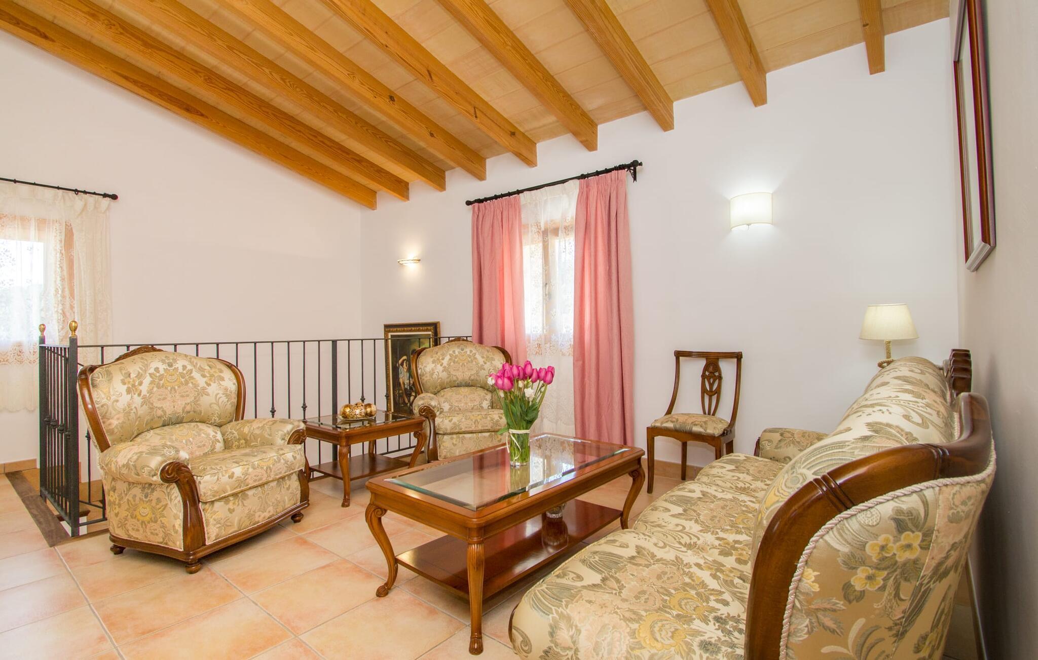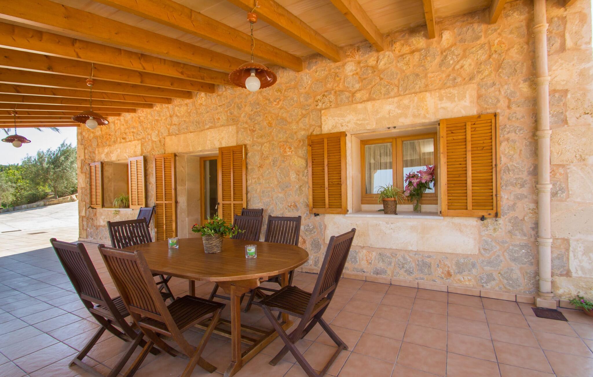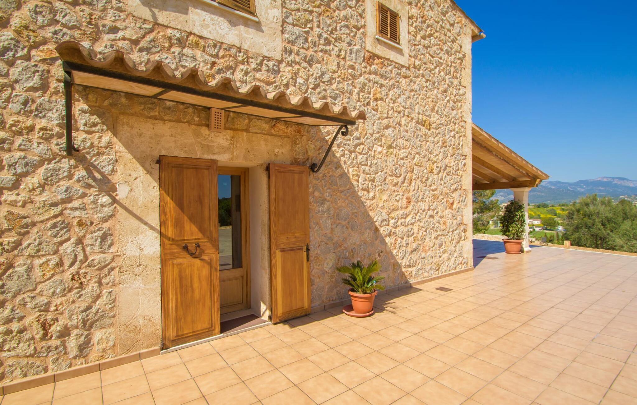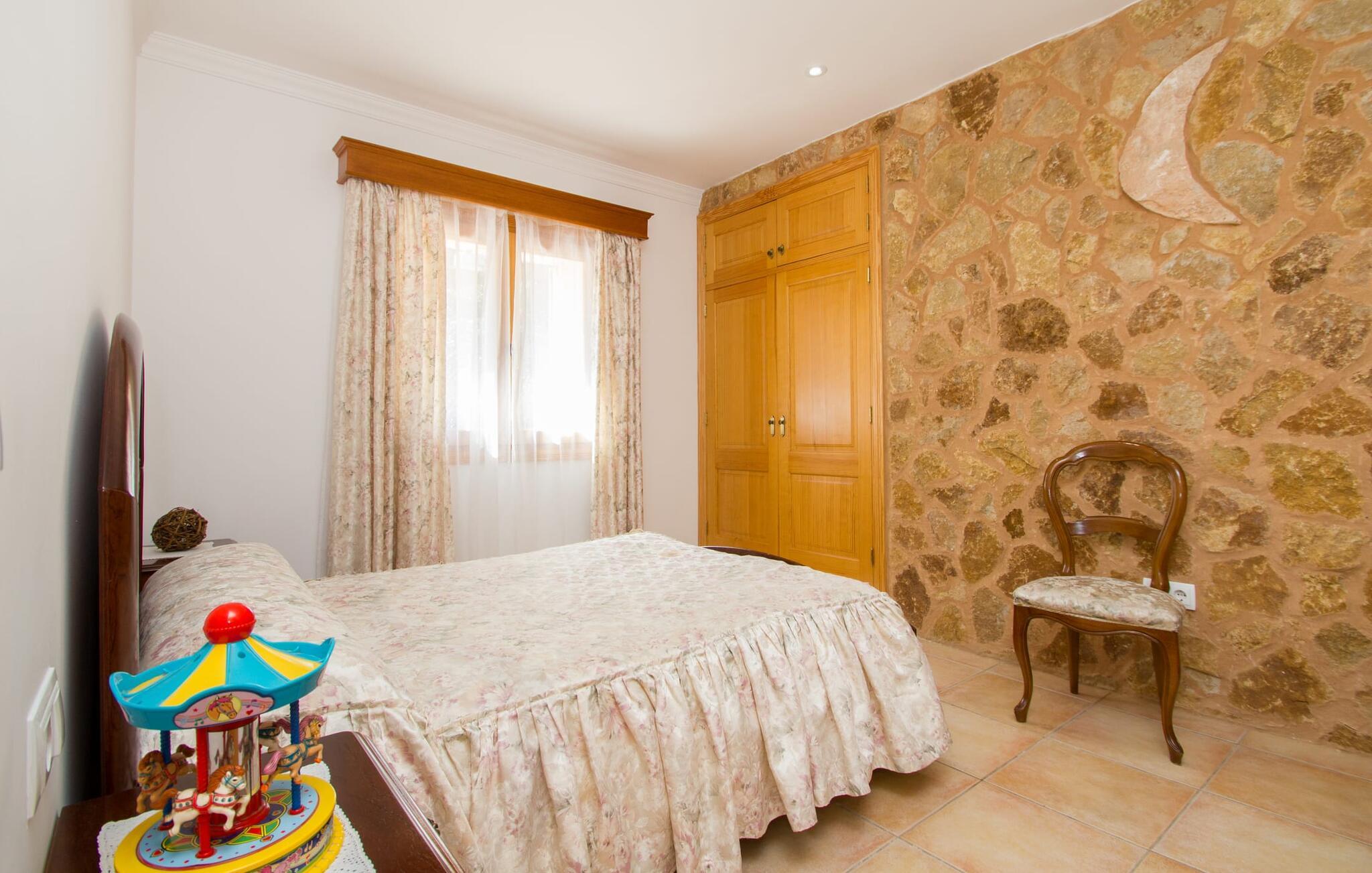 Rejsearrangører annoncerer ofte med billedet af en funklende blå pool omgivet af liggestole. Normalt skal I dele dette idylliske feriested med andre rejsende på udkig efter afslapning, hvilket i værste fald kan være forbundet med meget larm. I Villa "Can Mirlo" vil jeres dage være anderledes. I vil være omgivet af førsteklasses stil, og hvis I ønsker det, kan I nyde den flotte udsigt over det indre af Mallorca til bjergene mod nord. Poolterrassen ligger lige under huset. Et par stentrappe fører jer til vandet og den direkte tilstødende have. En bred vifte af træarter viser vejen her: Lad bare solen skinne og ellers nyd den rene tilværelse. Der er en overdækket veranda i direkte tilknytning til huset, hvor I kan afslutte dagen om aftenen med en flaske vin. Takket være et udendørs badeværelse kan I fuldt ud nyde den milde ø-luft fra morgen til aften. Husets indretning undgår trendy hype. Ejerne har valgt en rustik, klar linje uden at ofre komforten. Om aftenen kan I se tv fra sofaen eller blot kigge ind i den knitrende pejs. Dette værelse kombinerer ophold, madlavning og spisning. Derfor er det det rigtige sted for et afslappet samvær i en venlig atmosfære. Med sin arbejdsflade, der rager ud i rummet, byder køkkenet på plads nok til at tilberede selv komplicerede retter sammen. I stueetagen er der et dobbeltværelse med en dobbeltseng. Rummets naturstensvæg med en indlejret halvmåne sikrer et særligt niveau af komfort. De to andre soveværelser, det ene også med en dobbeltseng og det andet med to enkeltsenge, er på øverste etage. På denne etage kan I også være vært for socialt samvær i en åben lounge lige ved siden af trappeopgangen. Beboerne på øverste etage har også adgang til et badekar på badeværelset - et perfekt sted at afslutte dagen i en afslappet atmosfære og derefter nyde en afslappende søvn. Den statelige stenbrudsvilla "Can Mirlo" er beliggende i en vidunderlig, rustik, afsondret beliggenhed 2,5 km vest for den maleriske by Santa Maria. I bor i det indre af øen omgivet af natur. Dette giver jer adskillige udflugtsmuligheder: enten gå på shopping i det glitrende Palma, omkring 20 km væk, eller nyd de idylliske strande på sydkysten, herunder Passeig de Molinar (17 km) eller Cuidad Jardin (18 km). Bemærk venligst, at denne ejendom ikke accepterer ungdomsgrupper eller polterabender. En ungdomsgruppe på denne ejendom består af personer på 27 år eller derunder. Book ikke denne ejendom, hvis I er en ungdomsgruppe eller polterabend, da jeres reservation vil blive afvist, når den er booket, hvilket også kan være tilfældet ved ankomst til ejendommen eller under jeres ophold, og I vil ikke modtage en refusion