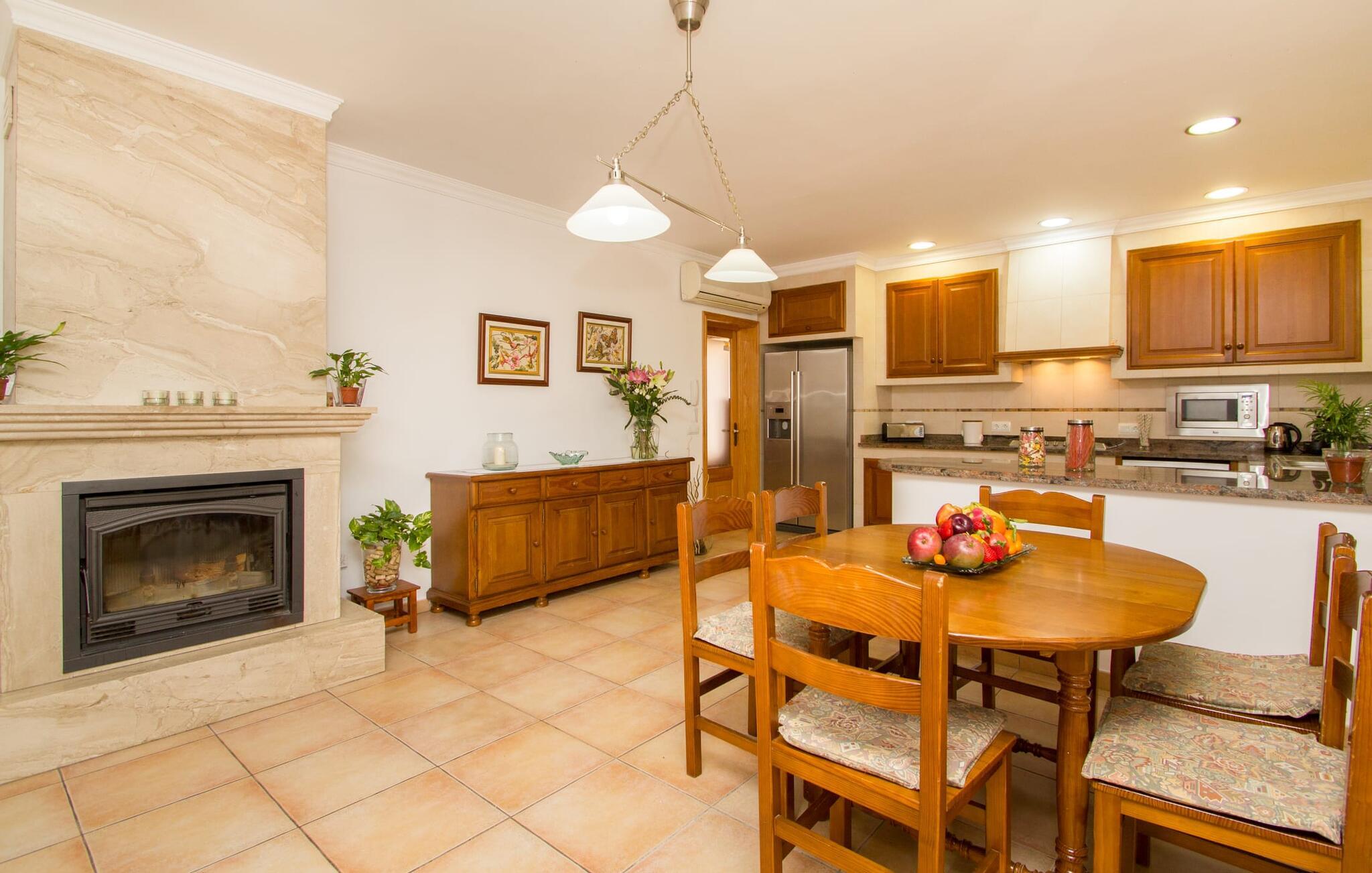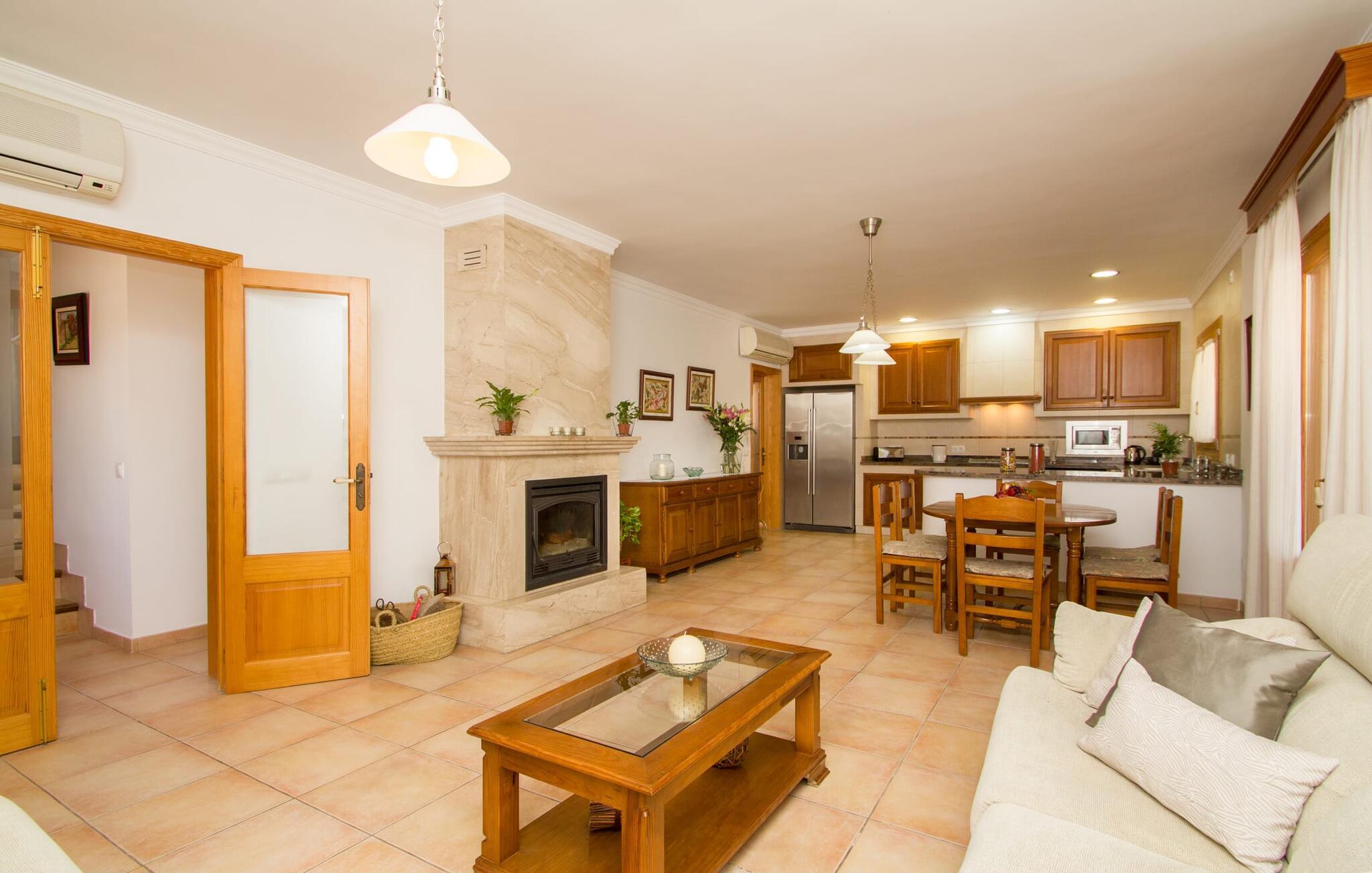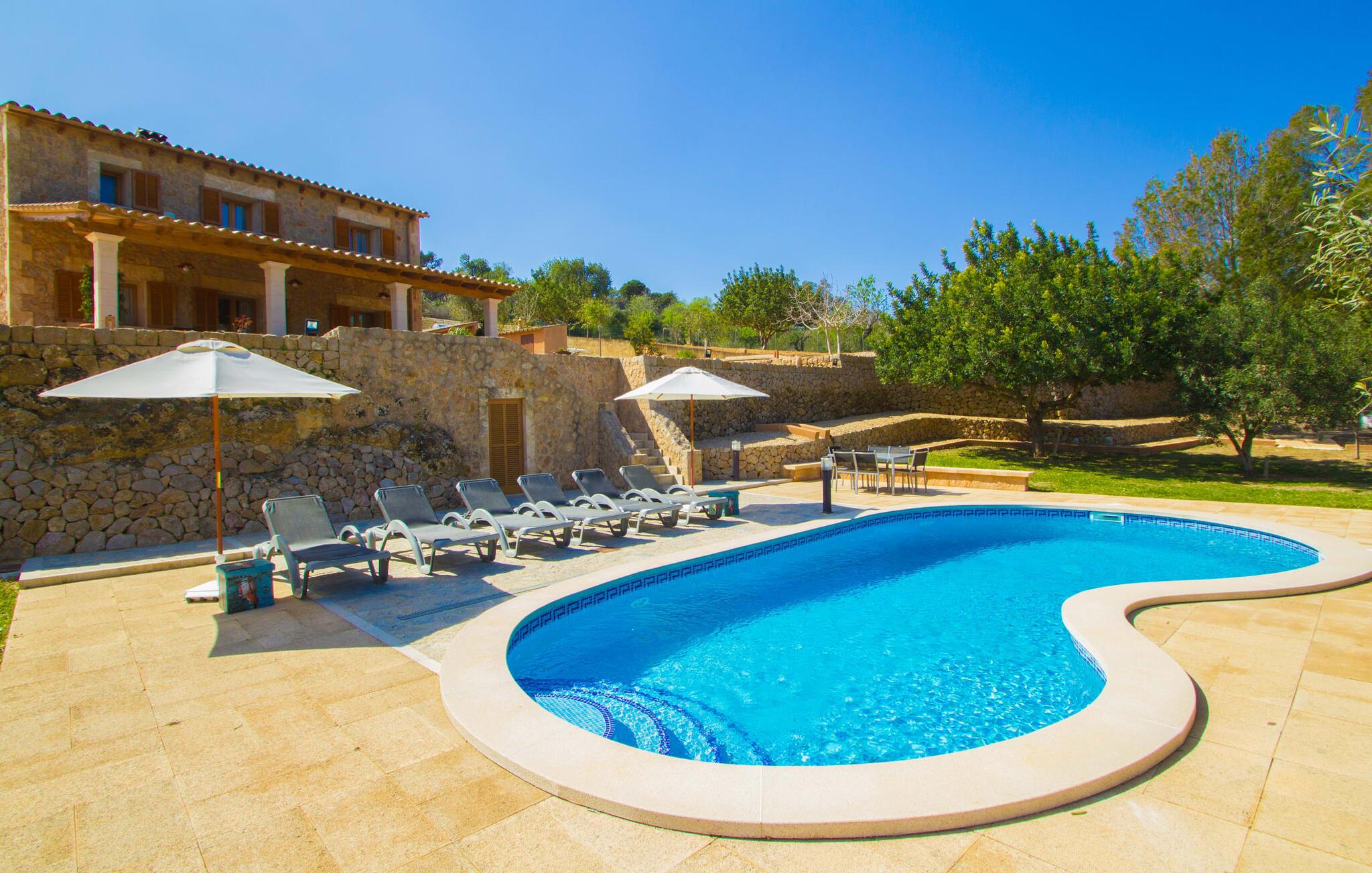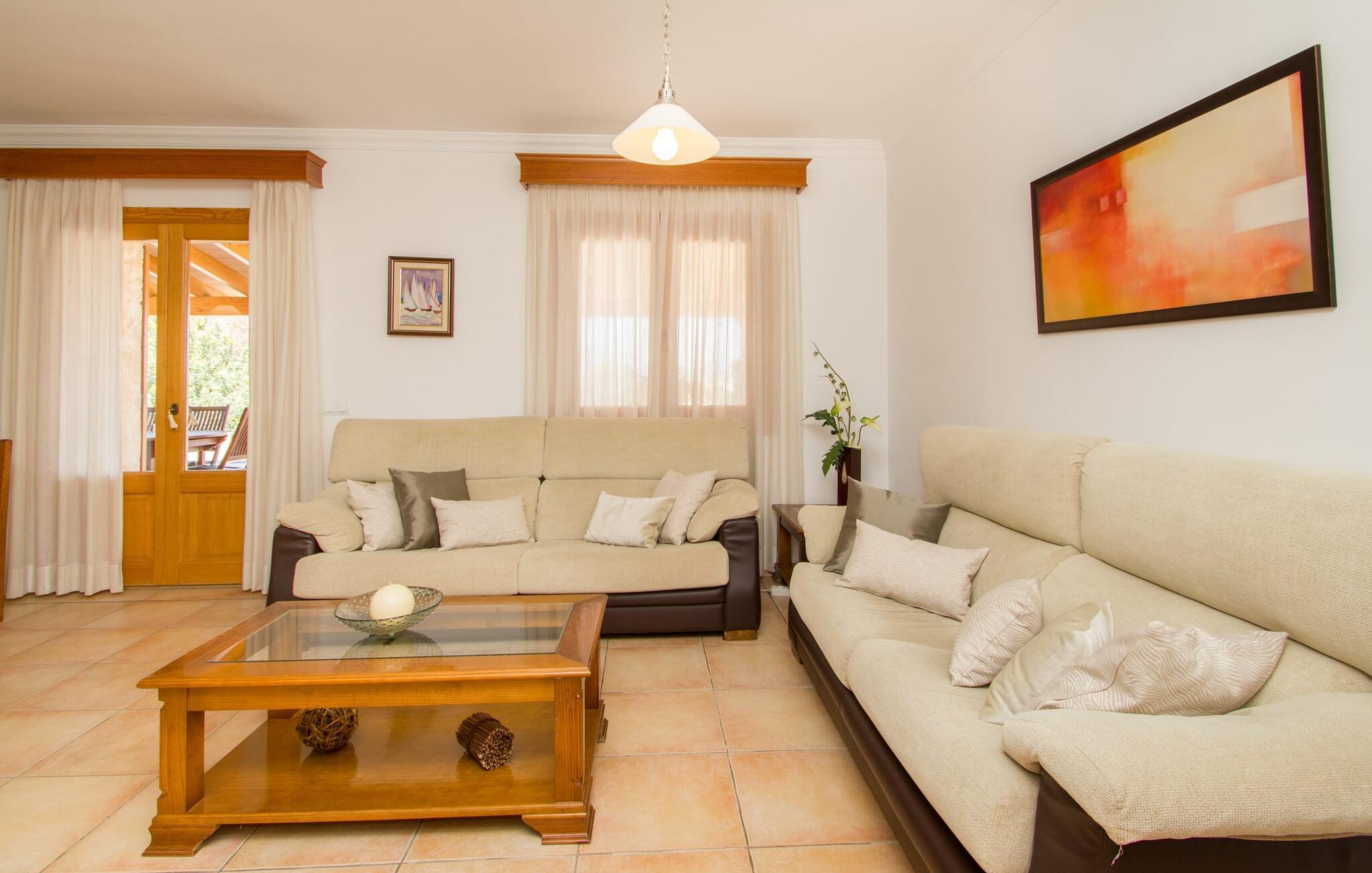 Rejsearrangører annoncerer ofte med billedet af en funklende blå pool omgivet af liggestole. Normalt skal I dele dette idylliske feriested med andre rejsende på udkig efter afslapning, hvilket i værste fald kan være forbundet med meget larm. I Villa "Can Mirlo" vil jeres dage være anderledes. I vil være omgivet af førsteklasses stil, og hvis I ønsker det, kan I nyde den flotte udsigt over det indre af Mallorca til bjergene mod nord. Poolterrassen ligger lige under huset. Et par stentrappe fører jer til vandet og den direkte tilstødende have. En bred vifte af træarter viser vejen her: Lad bare solen skinne og ellers nyd den rene tilværelse. Der er en overdækket veranda i direkte tilknytning til huset, hvor I kan afslutte dagen om aftenen med en flaske vin. Takket være et udendørs badeværelse kan I fuldt ud nyde den milde ø-luft fra morgen til aften. Husets indretning undgår trendy hype. Ejerne har valgt en rustik, klar linje uden at ofre komforten. Om aftenen kan I se tv fra sofaen eller blot kigge ind i den knitrende pejs. Dette værelse kombinerer ophold, madlavning og spisning. Derfor er det det rigtige sted for et afslappet samvær i en venlig atmosfære. Med sin arbejdsflade, der rager ud i rummet, byder køkkenet på plads nok til at tilberede selv komplicerede retter sammen. I stueetagen er der et dobbeltværelse med en dobbeltseng. Rummets naturstensvæg med en indlejret halvmåne sikrer et særligt niveau af komfort. De to andre soveværelser, det ene også med en dobbeltseng og det andet med to enkeltsenge, er på øverste etage. På denne etage kan I også være vært for socialt samvær i en åben lounge lige ved siden af trappeopgangen. Beboerne på øverste etage har også adgang til et badekar på badeværelset - et perfekt sted at afslutte dagen i en afslappet atmosfære og derefter nyde en afslappende søvn. Den statelige stenbrudsvilla "Can Mirlo" er beliggende i en vidunderlig, rustik, afsondret beliggenhed 2,5 km vest for den maleriske by Santa Maria. I bor i det indre af øen omgivet af natur. Dette giver jer adskillige udflugtsmuligheder: enten gå på shopping i det glitrende Palma, omkring 20 km væk, eller nyd de idylliske strande på sydkysten, herunder Passeig de Molinar (17 km) eller Cuidad Jardin (18 km). Bemærk venligst, at denne ejendom ikke accepterer ungdomsgrupper eller polterabender. En ungdomsgruppe på denne ejendom består af personer på 27 år eller derunder. Book ikke denne ejendom, hvis I er en ungdomsgruppe eller polterabend, da jeres reservation vil blive afvist, når den er booket, hvilket også kan være tilfældet ved ankomst til ejendommen eller under jeres ophold, og I vil ikke modtage en refusion