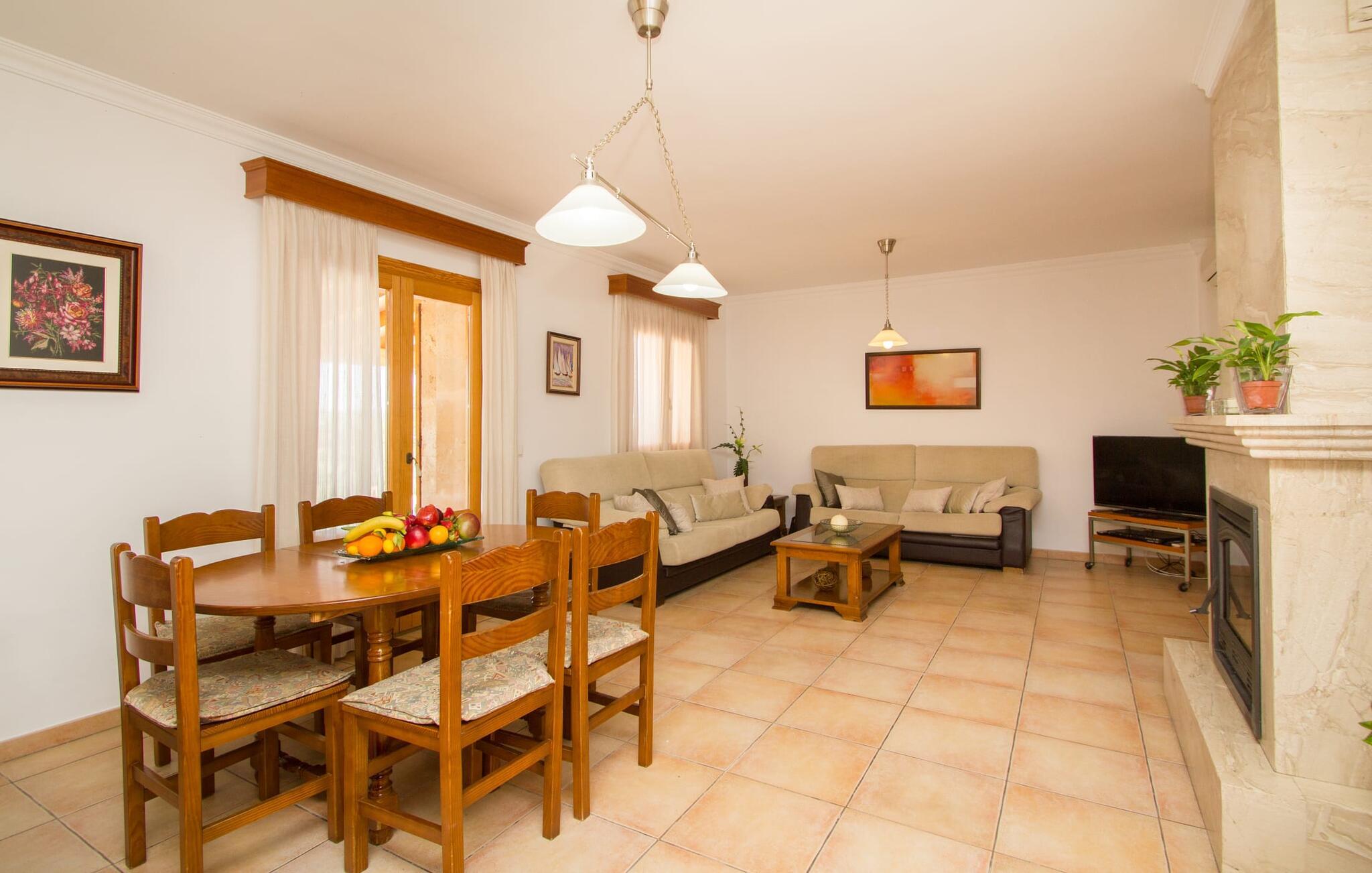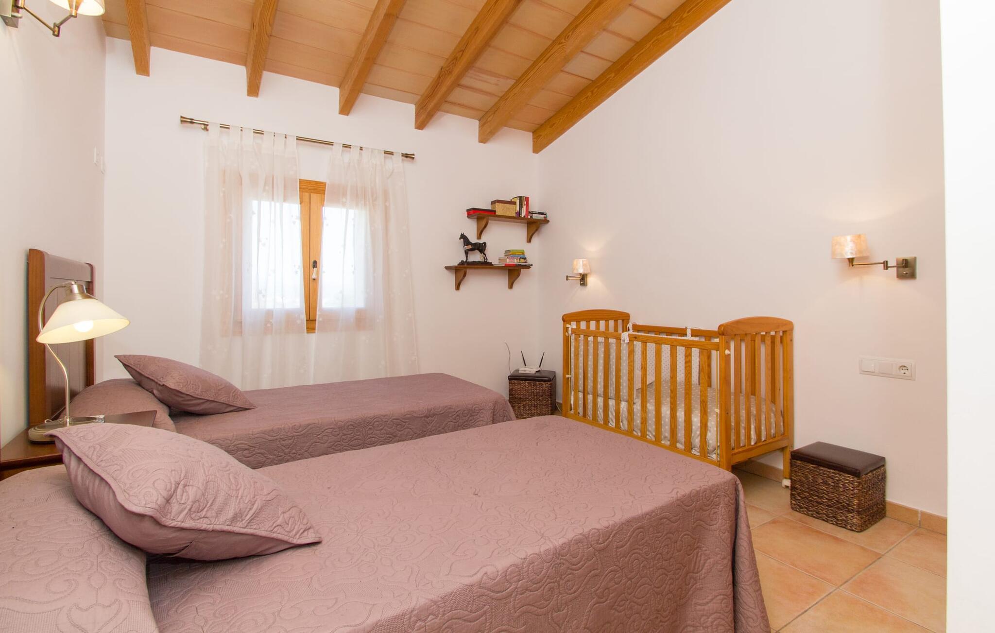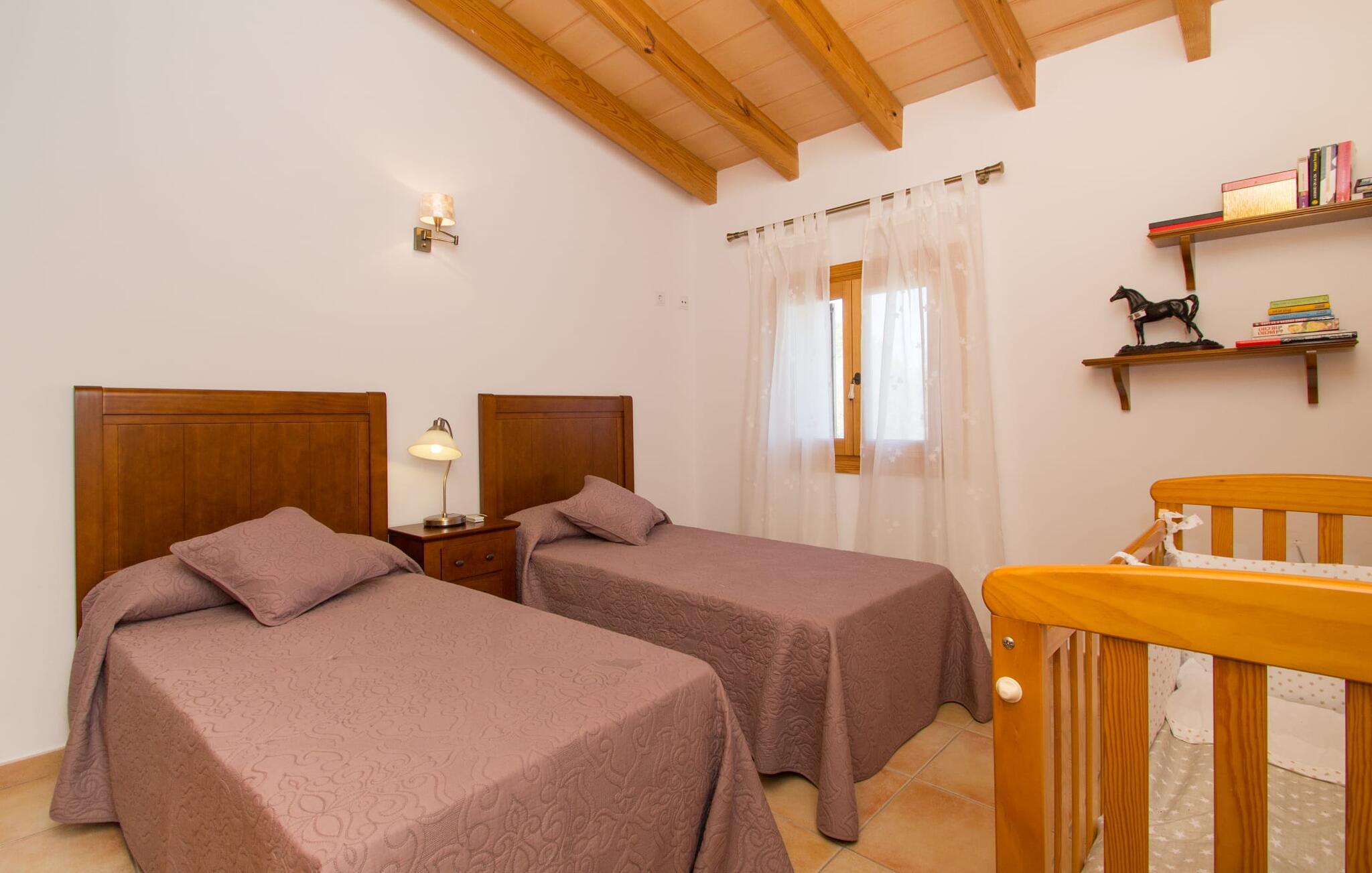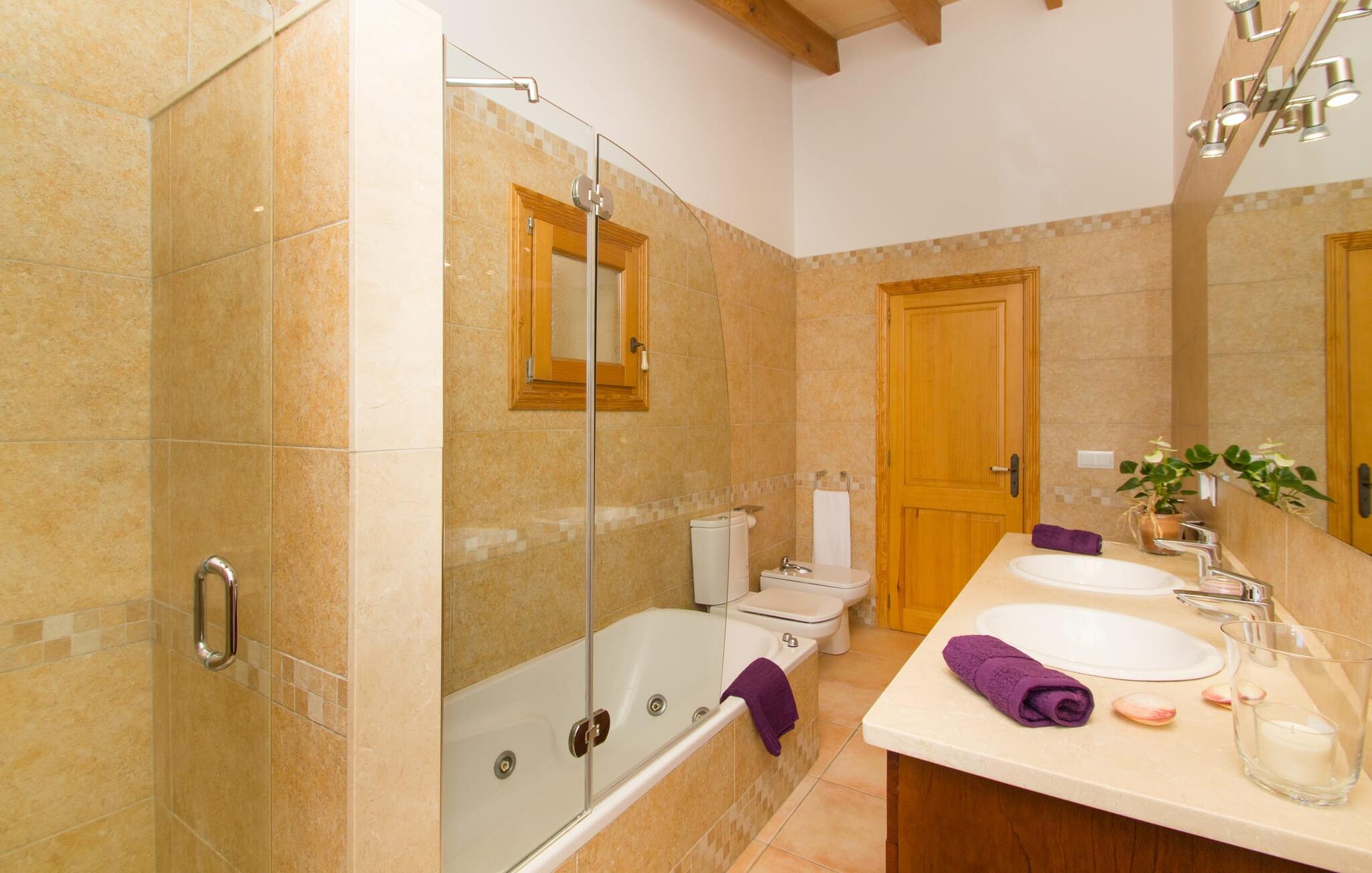 Rejsearrangører annoncerer ofte med billedet af en funklende blå pool omgivet af liggestole. Normalt skal I dele dette idylliske feriested med andre rejsende på udkig efter afslapning, hvilket i værste fald kan være forbundet med meget larm. I Villa "Can Mirlo" vil jeres dage være anderledes. I vil være omgivet af førsteklasses stil, og hvis I ønsker det, kan I nyde den flotte udsigt over det indre af Mallorca til bjergene mod nord. Poolterrassen ligger lige under huset. Et par stentrappe fører jer til vandet og den direkte tilstødende have. En bred vifte af træarter viser vejen her: Lad bare solen skinne og ellers nyd den rene tilværelse. Der er en overdækket veranda i direkte tilknytning til huset, hvor I kan afslutte dagen om aftenen med en flaske vin. Takket være et udendørs badeværelse kan I fuldt ud nyde den milde ø-luft fra morgen til aften. Husets indretning undgår trendy hype. Ejerne har valgt en rustik, klar linje uden at ofre komforten. Om aftenen kan I se tv fra sofaen eller blot kigge ind i den knitrende pejs. Dette værelse kombinerer ophold, madlavning og spisning. Derfor er det det rigtige sted for et afslappet samvær i en venlig atmosfære. Med sin arbejdsflade, der rager ud i rummet, byder køkkenet på plads nok til at tilberede selv komplicerede retter sammen. I stueetagen er der et dobbeltværelse med en dobbeltseng. Rummets naturstensvæg med en indlejret halvmåne sikrer et særligt niveau af komfort. De to andre soveværelser, det ene også med en dobbeltseng og det andet med to enkeltsenge, er på øverste etage. På denne etage kan I også være vært for socialt samvær i en åben lounge lige ved siden af trappeopgangen. Beboerne på øverste etage har også adgang til et badekar på badeværelset - et perfekt sted at afslutte dagen i en afslappet atmosfære og derefter nyde en afslappende søvn. Den statelige stenbrudsvilla "Can Mirlo" er beliggende i en vidunderlig, rustik, afsondret beliggenhed 2,5 km vest for den maleriske by Santa Maria. I bor i det indre af øen omgivet af natur. Dette giver jer adskillige udflugtsmuligheder: enten gå på shopping i det glitrende Palma, omkring 20 km væk, eller nyd de idylliske strande på sydkysten, herunder Passeig de Molinar (17 km) eller Cuidad Jardin (18 km). Bemærk venligst, at denne ejendom ikke accepterer ungdomsgrupper eller polterabender. En ungdomsgruppe på denne ejendom består af personer på 27 år eller derunder. Book ikke denne ejendom, hvis I er en ungdomsgruppe eller polterabend, da jeres reservation vil blive afvist, når den er booket, hvilket også kan være tilfældet ved ankomst til ejendommen eller under jeres ophold, og I vil ikke modtage en refusion
